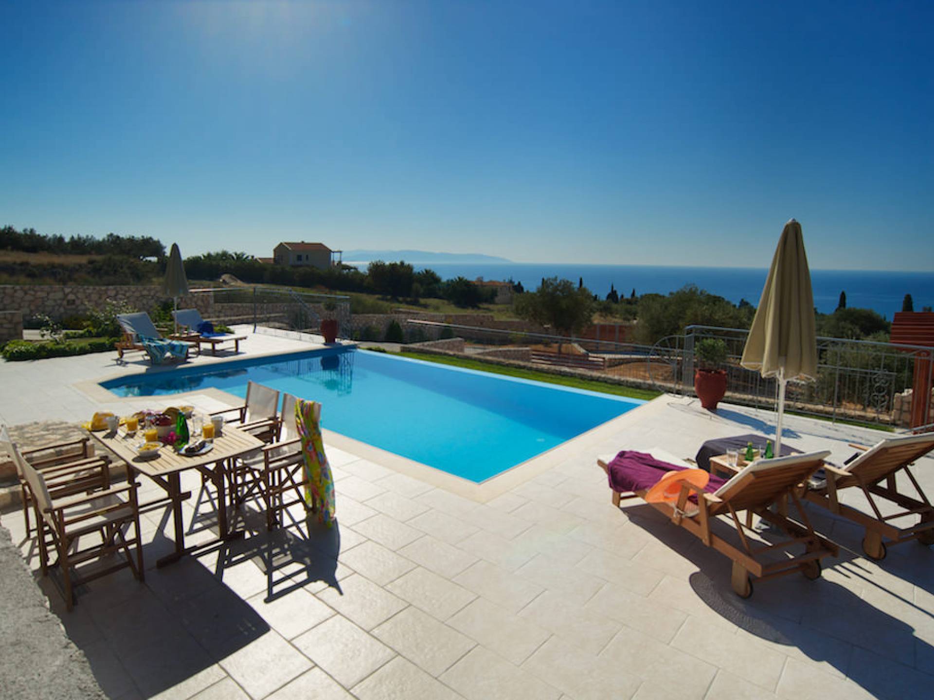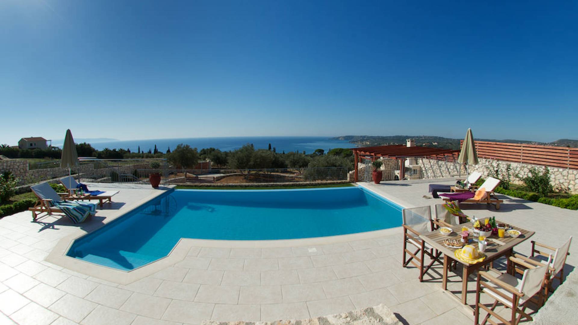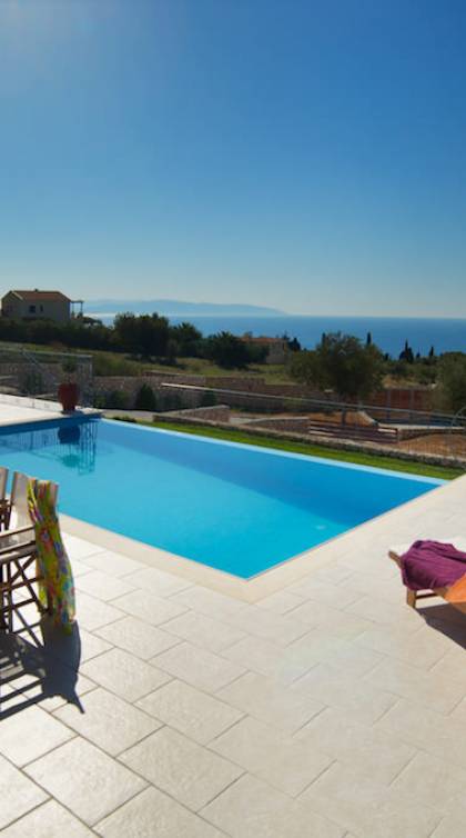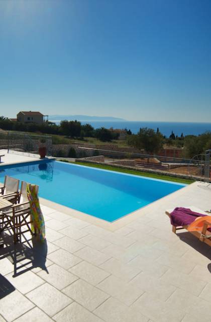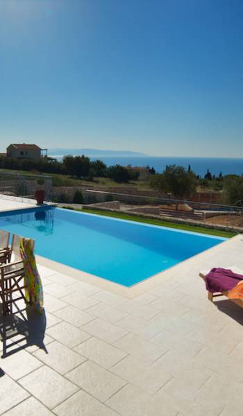 The glorious infinity-edged fully automated pool makes the most of the villa’s location and draws the eye to the distant horizon and the deep blue Ionian Sea. The fully-equipped swimming pool area, with wooden sunbeds, small coffee tables, and umbrellas. The pool is 4.50 meters by 7.00 meters in size and the depth varies from 1.00 meters to 1.70 meters, a feature that makes it suitable for children swimming or playing at the shallow end.