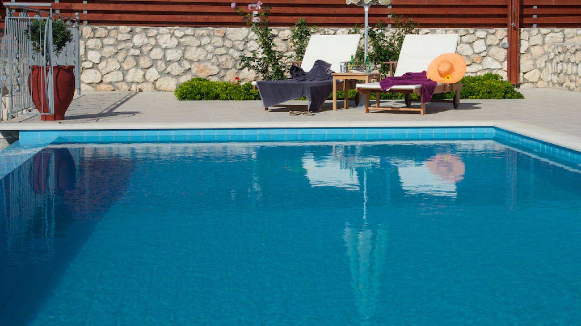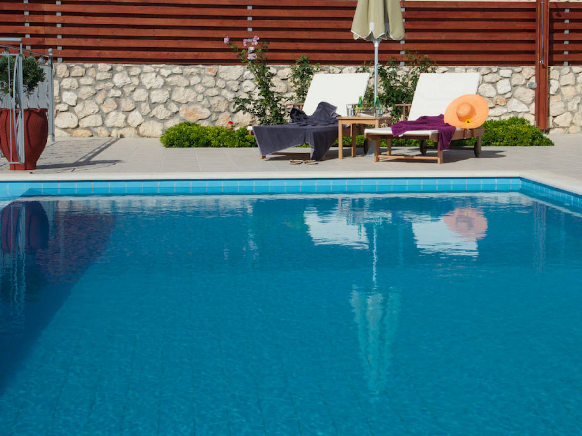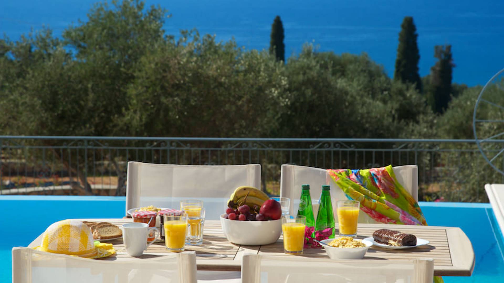 The glorious infinity-edged fully automated pool makes the most of the villa’s location and draws the eye to the distant horizon and the deep blue Ionian Sea. The fully-equipped swimming pool area, with wooden sunbeds, small coffee tables, and umbrellas. The pool is 4.50 meters by 7.00 meters in size and the depth varies from 1.00 meters to 1.70 meters, a feature that makes it suitable for children swimming or playing at the shallow end.