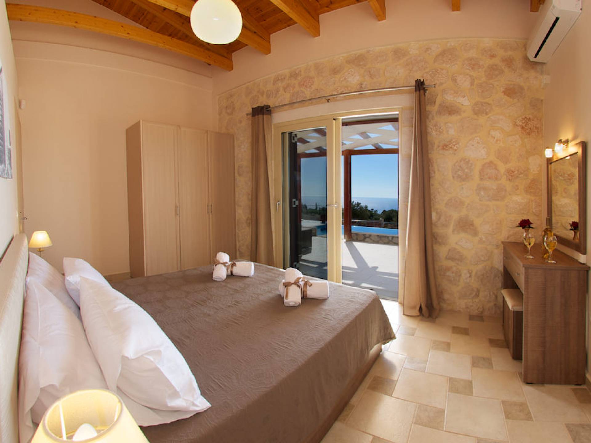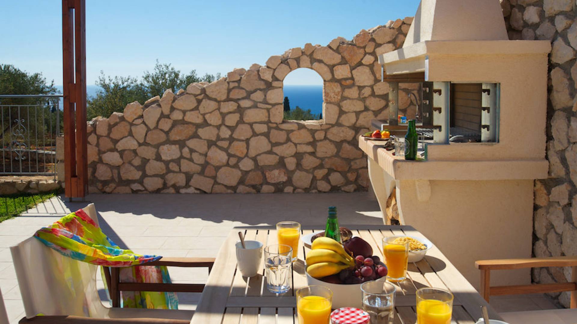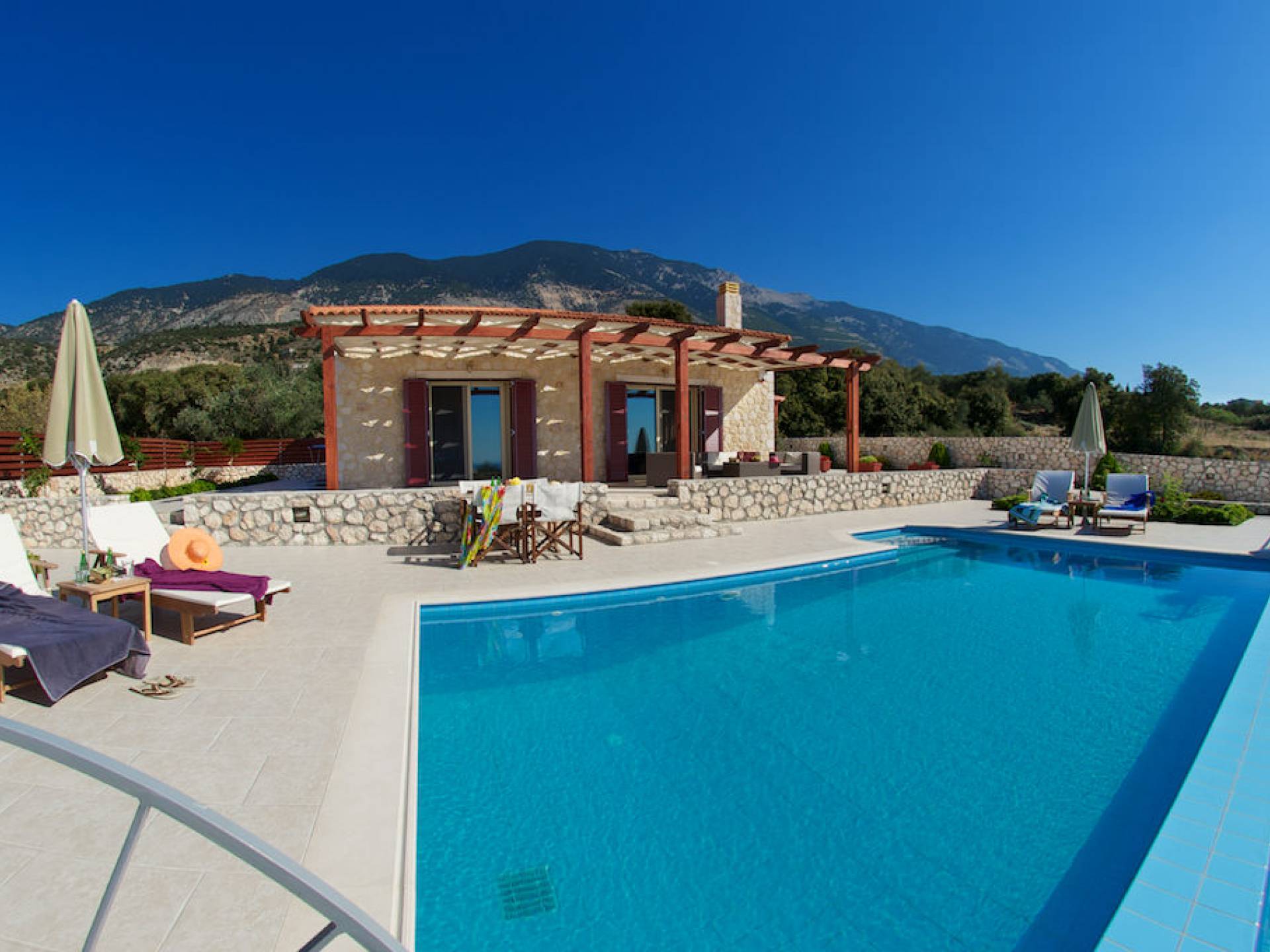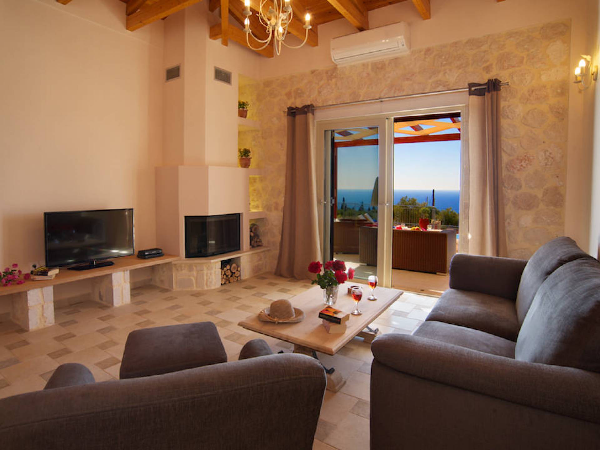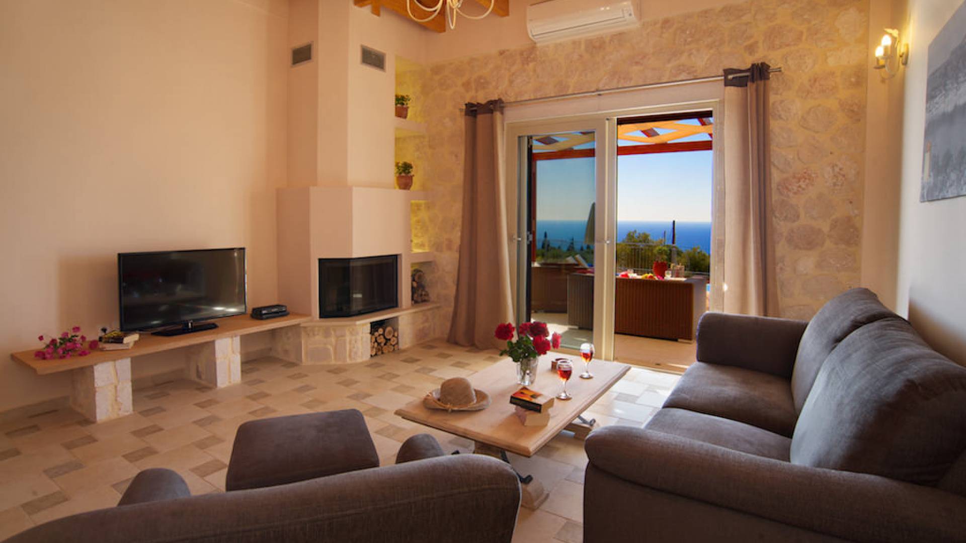Feature of Lithos Ainos Villa is the calm colors on the walls as well as the brown wooden roof, which gives a country style to the villa. All areas of the premises are fully air-conditioned. Ainos Villa is fenced by stonewalls high enough to provide the necessary privacy and not to obstruct the magnificent view. The garden is full of flowers, fruit trees, and olive trees, and it is all covered by green grass.