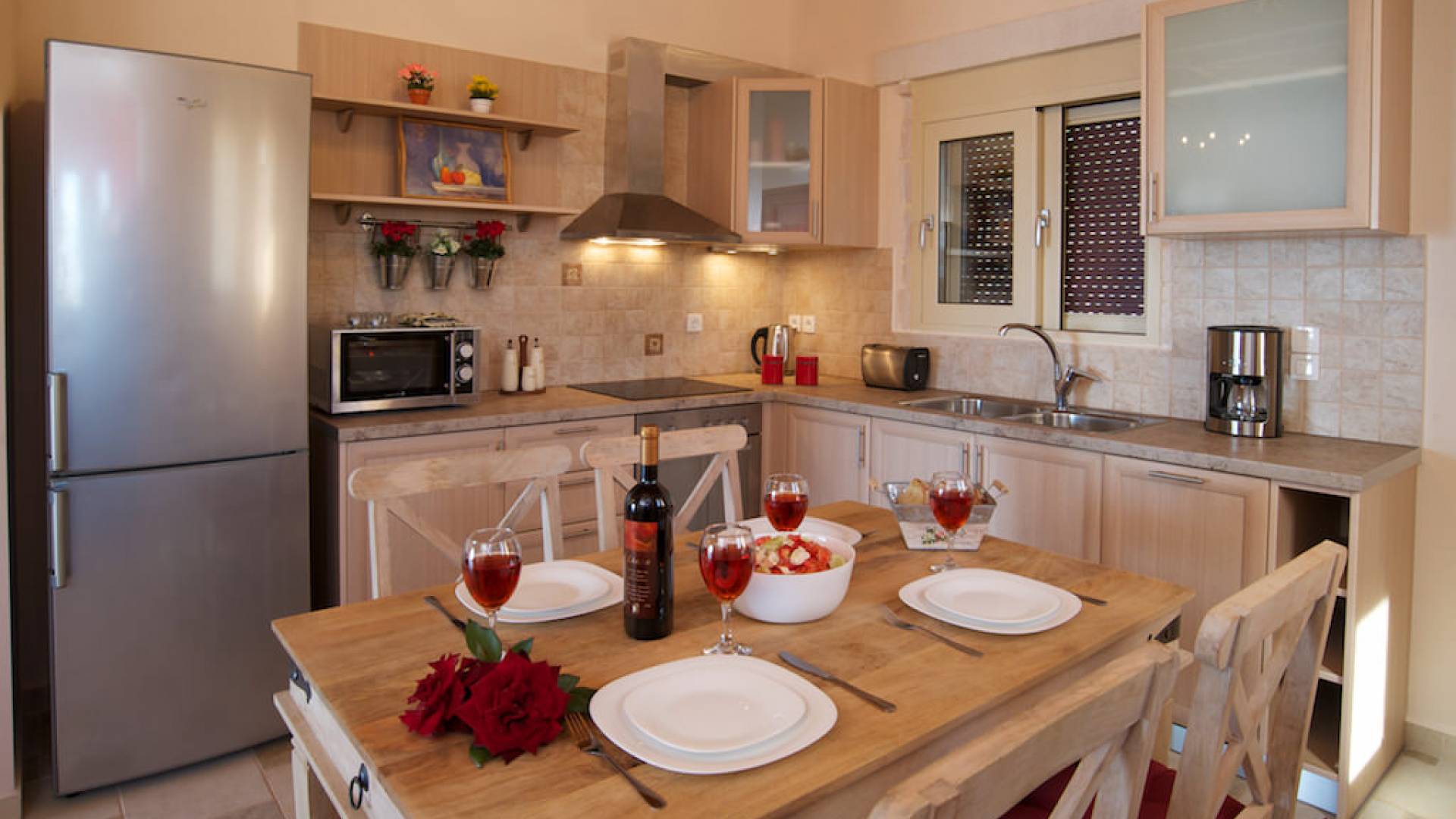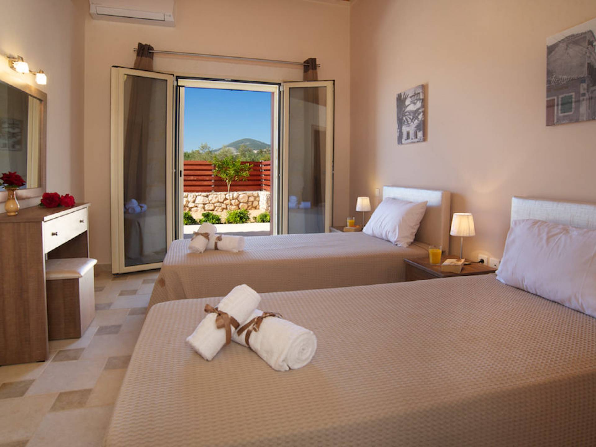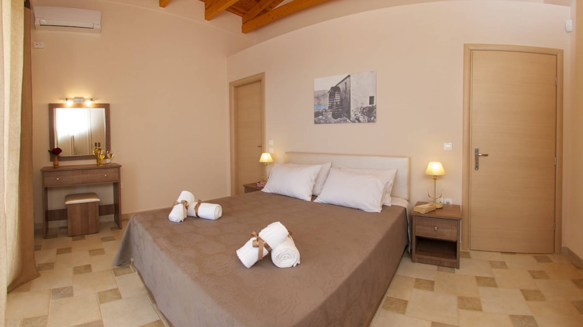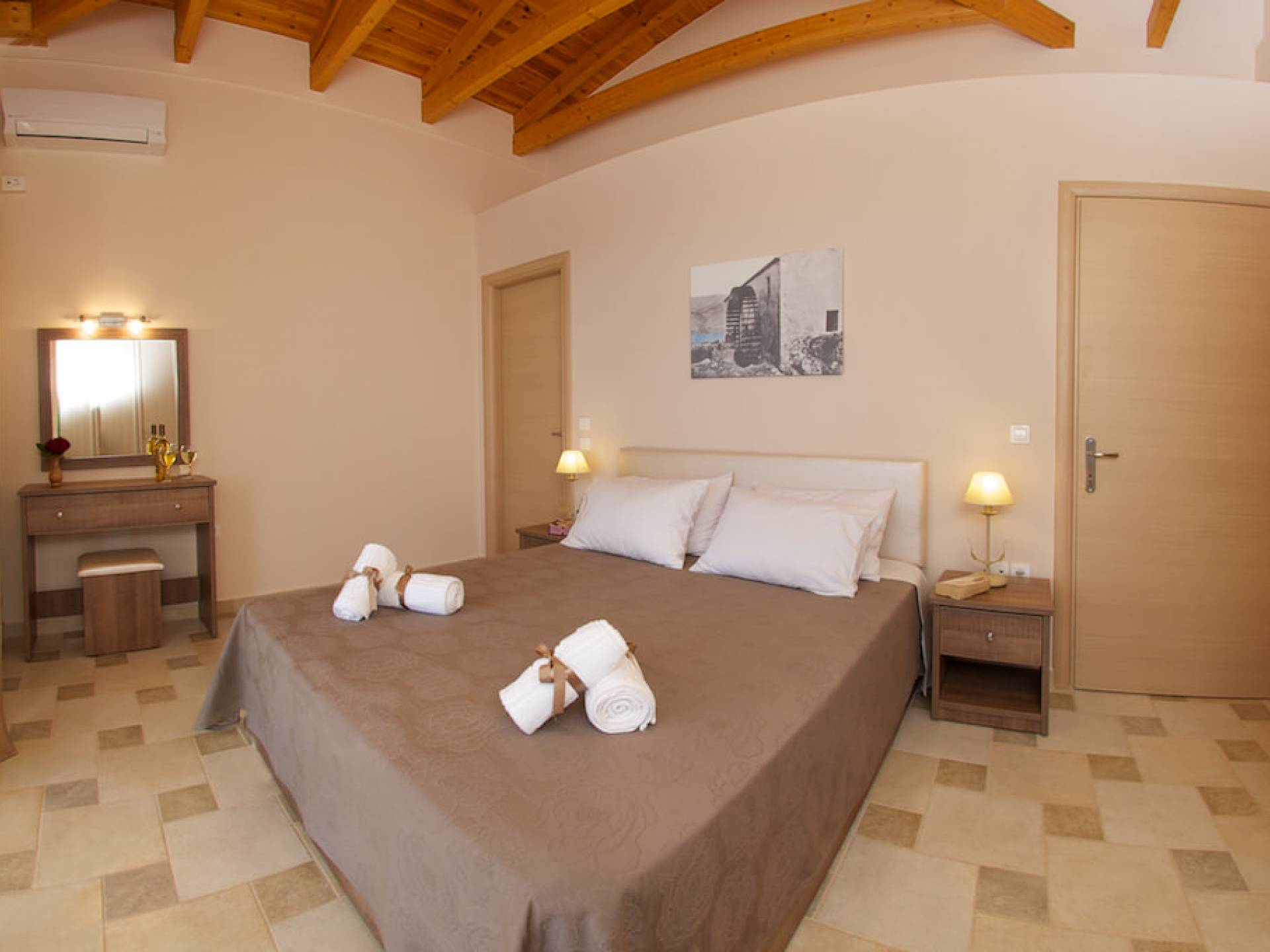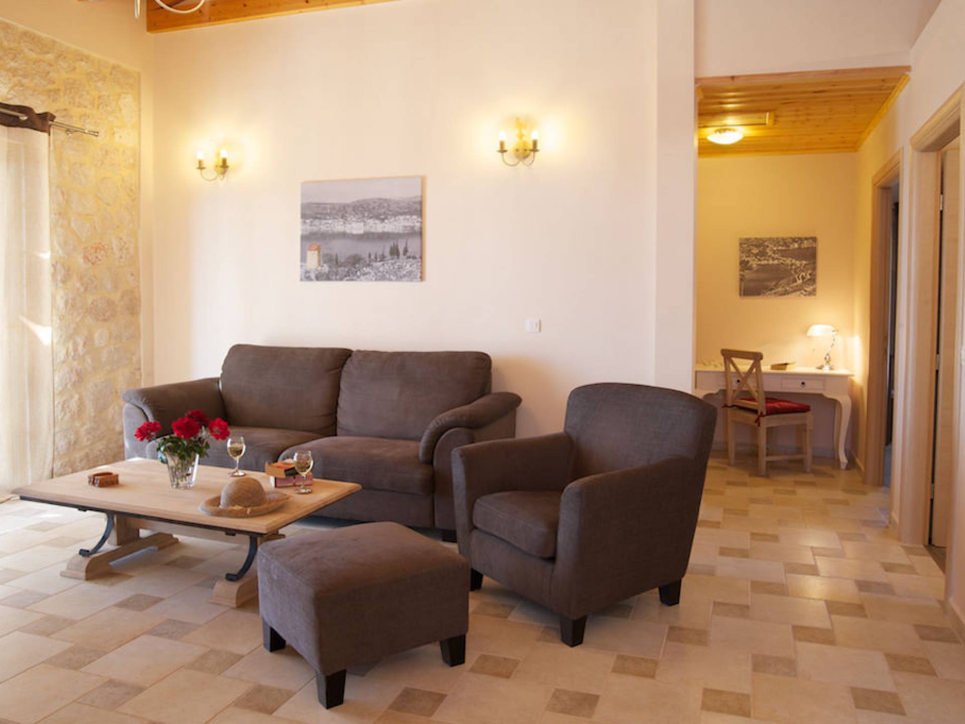 Feature of Lithos Ainos Villa is the calm colors on the walls as well as the brown wooden roof, which gives a country style to the villa. All areas of the premises are fully air-conditioned. Ainos Villa is fenced by stonewalls high enough to provide the necessary privacy and not to obstruct the magnificent view. The garden is full of flowers, fruit trees, and olive trees, and it is all covered by green grass.