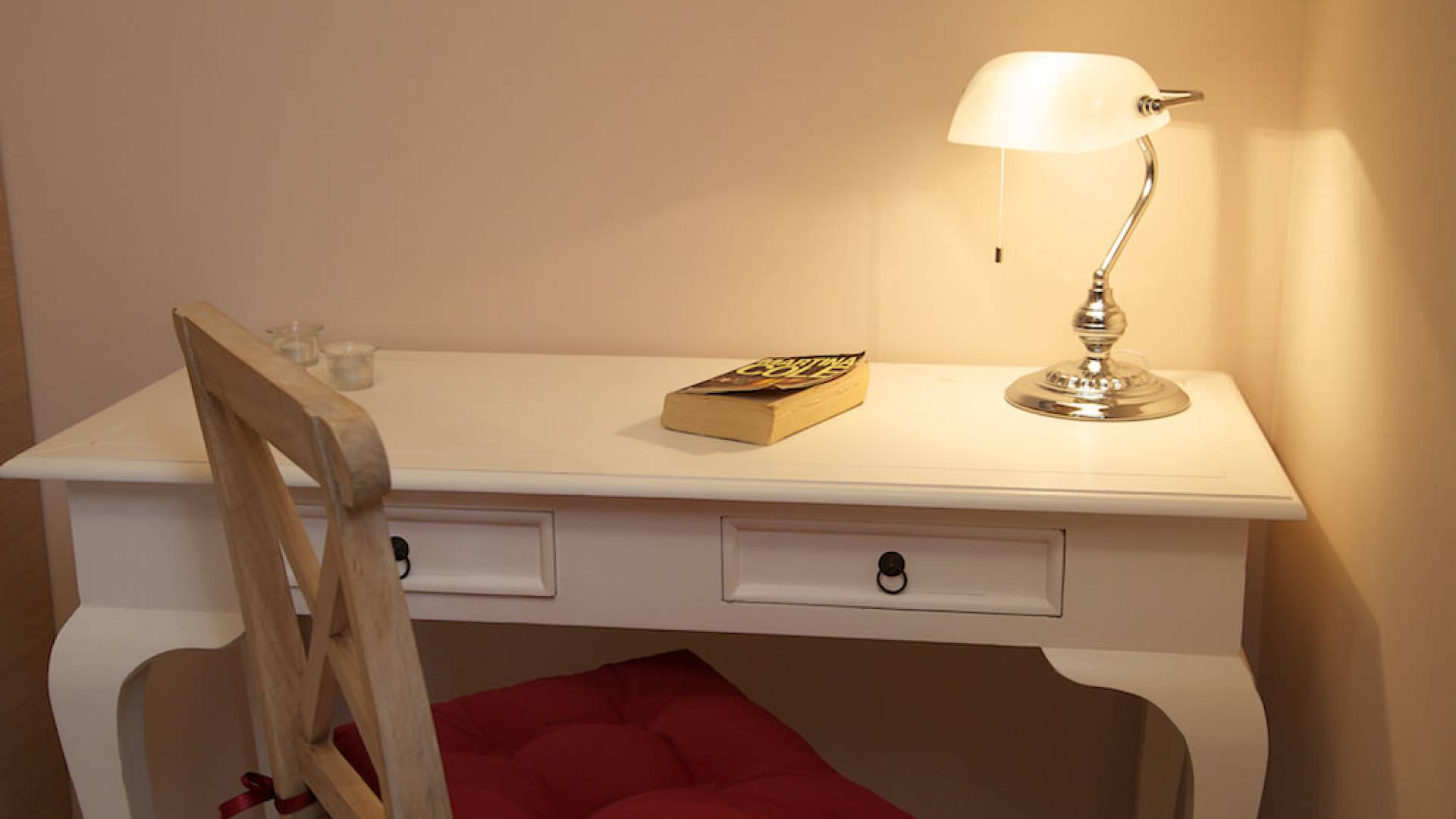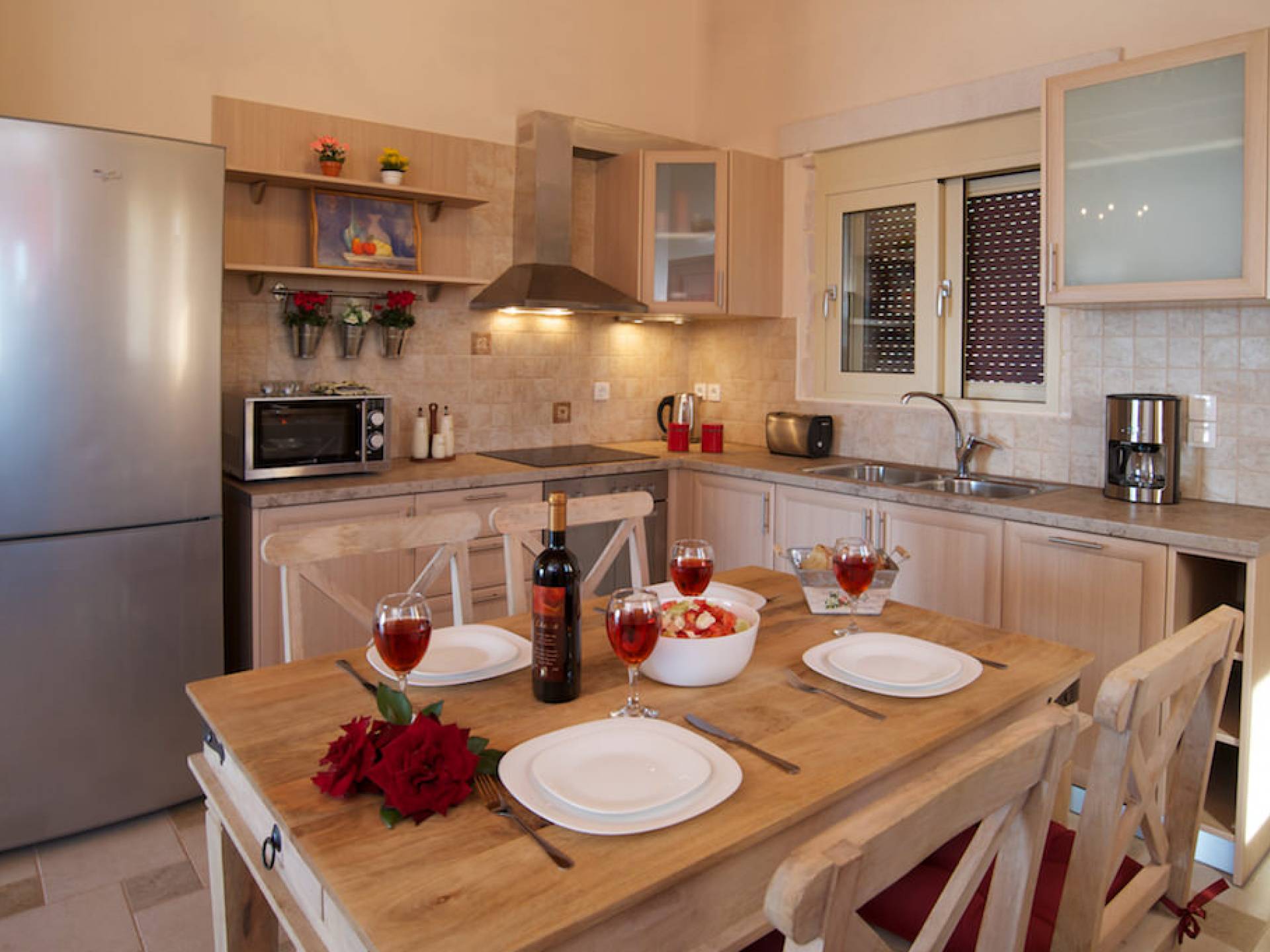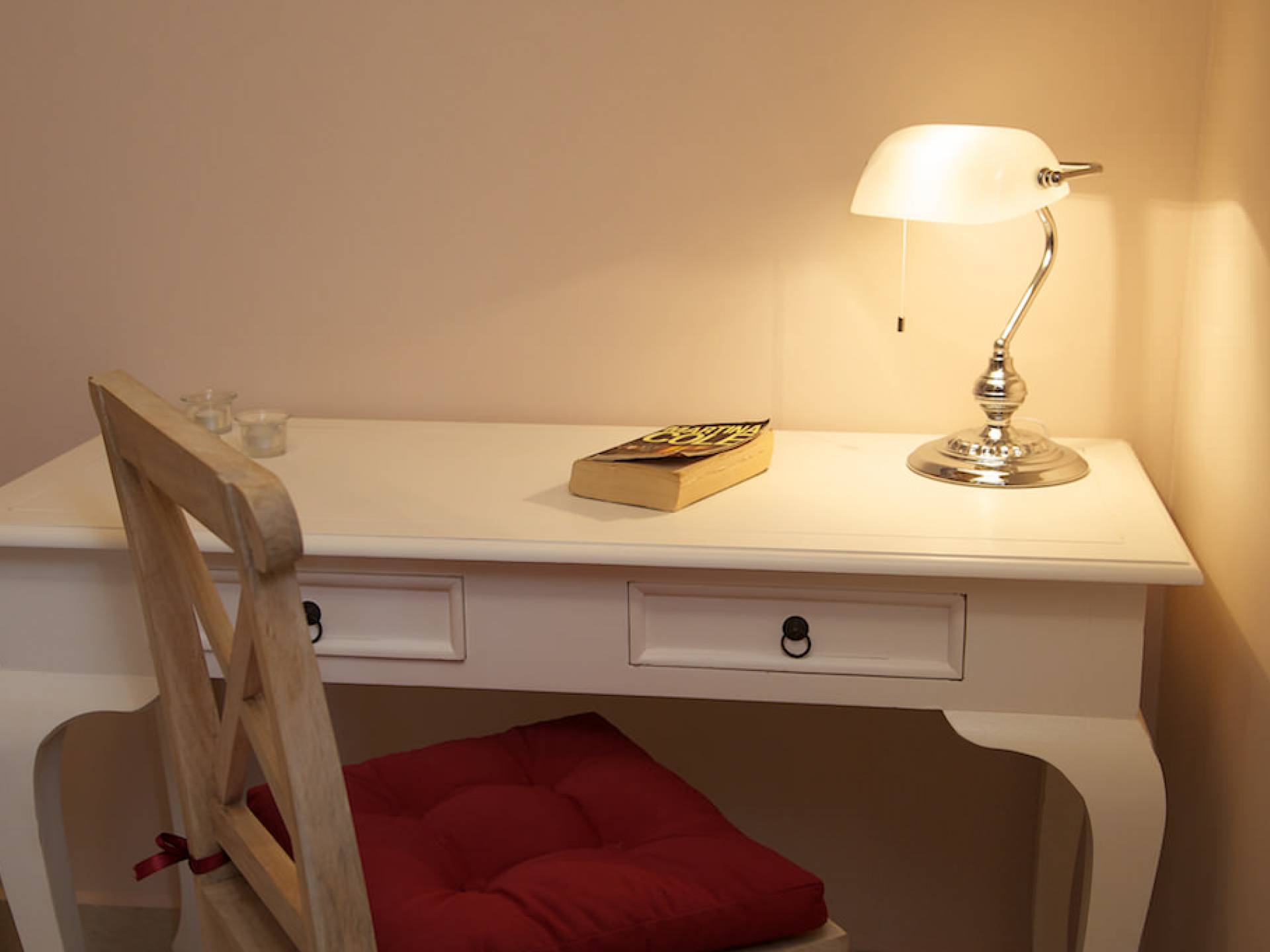 The main entrance leads to the open-plan kitchen, dining, and living room areas. The Living room consists of a comfortable three-seater sofa and a comfortable armchair, a fireplace for cold winter nights, a traditional coffee table, a built-in TV cabinet, a 42” LED TV with free satellite channels, Blue-Ray DVD/CD player for endless hours of entertainment, and relaxation. Adjacent to the living room, guests will find a desk with an elegant design for their daily brief jobs and navigating to the internet via the broadband wireless connection provided to you free of charge covering all indoor and outdoor areas.