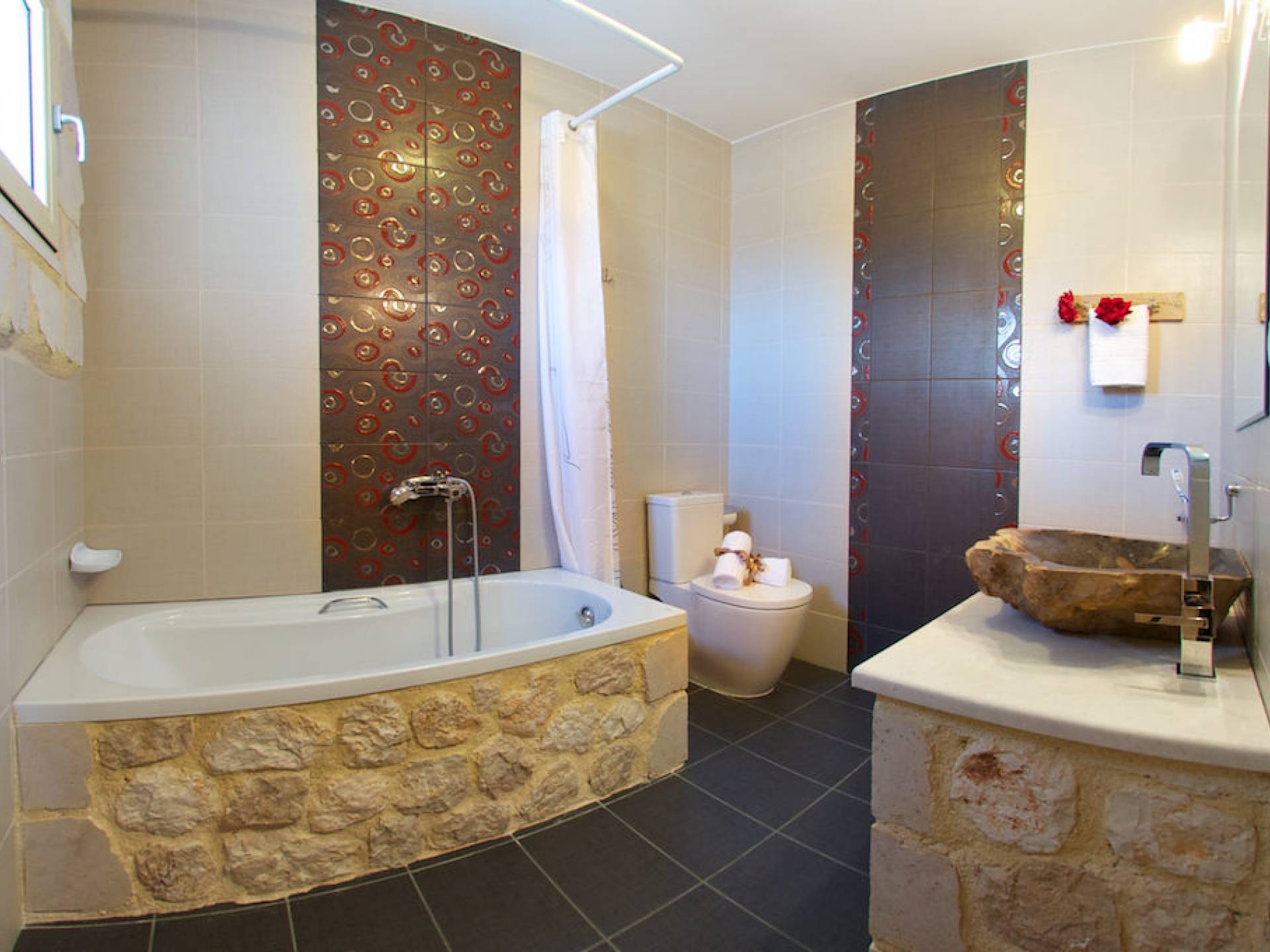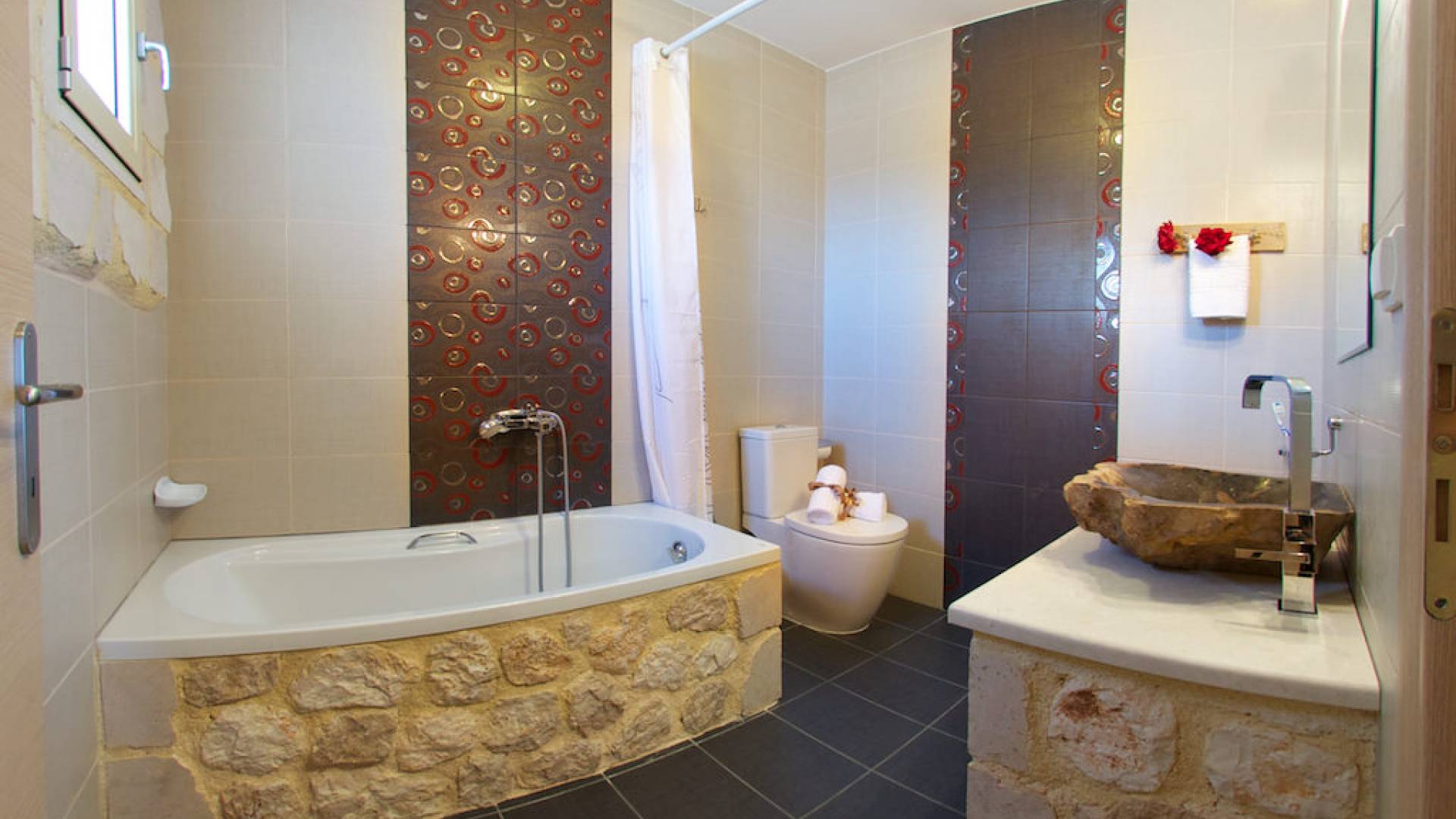 The open-plan kitchen is fully equipped with all necessary appliances and utensils, while the traditional dining area gives a special touch to the area. In the master bedroom, there is a king-size bed with anatomic mattress, en-suite bathroom with bathtub, spacious closet, and dressing table. The breathtaking view from the large sliding terrace door challenges you to visit the patio area and pool.