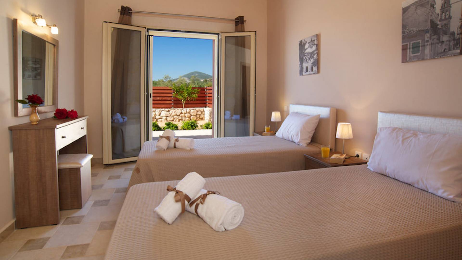 The second bedroom has two single beds with anatomic mattresses, a dressing table, and a closet. The large patio doors lead to the pool and garden area. The specially designed and spacious shared bathroom can serve guests with people with special mobility needs.