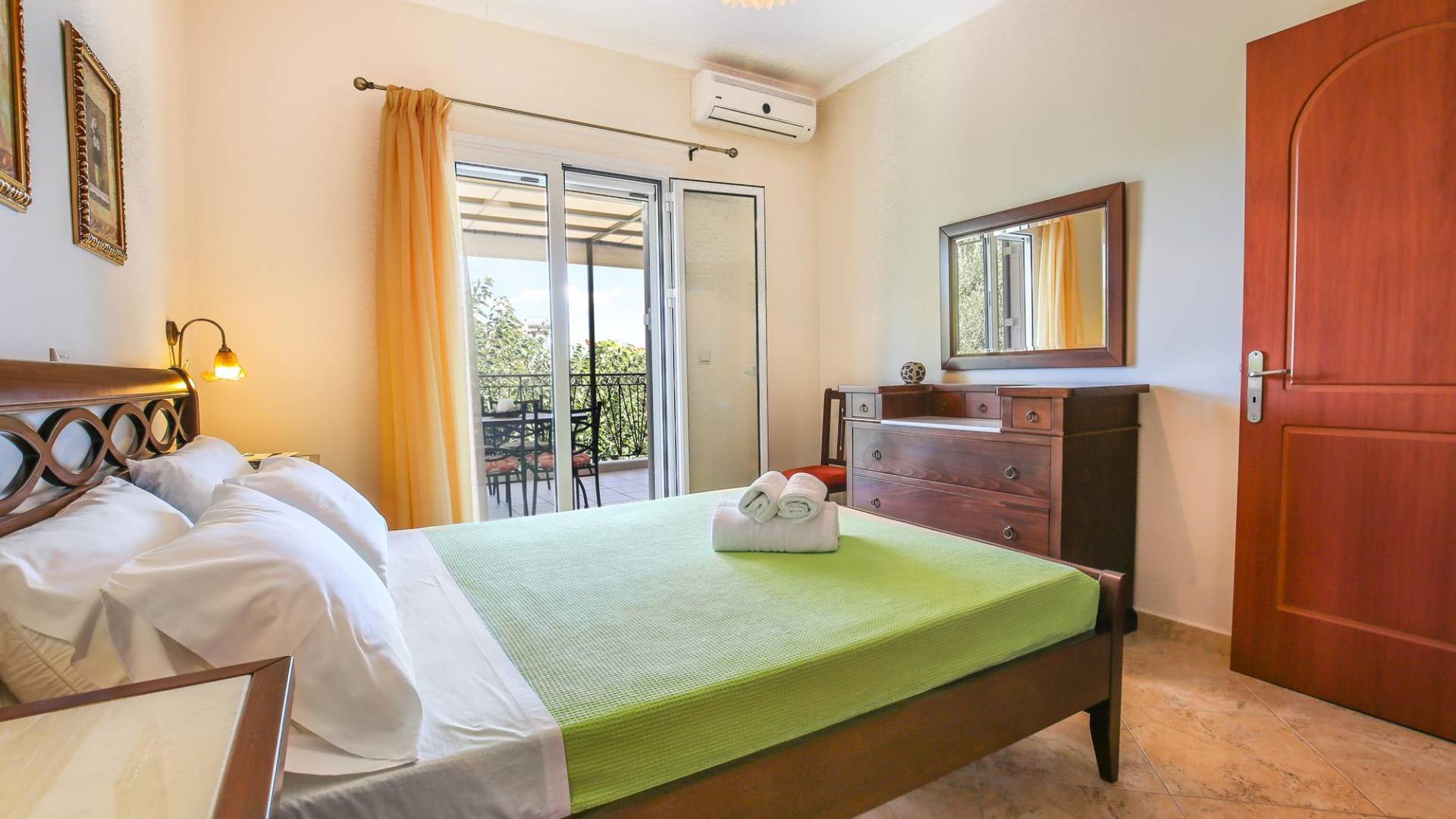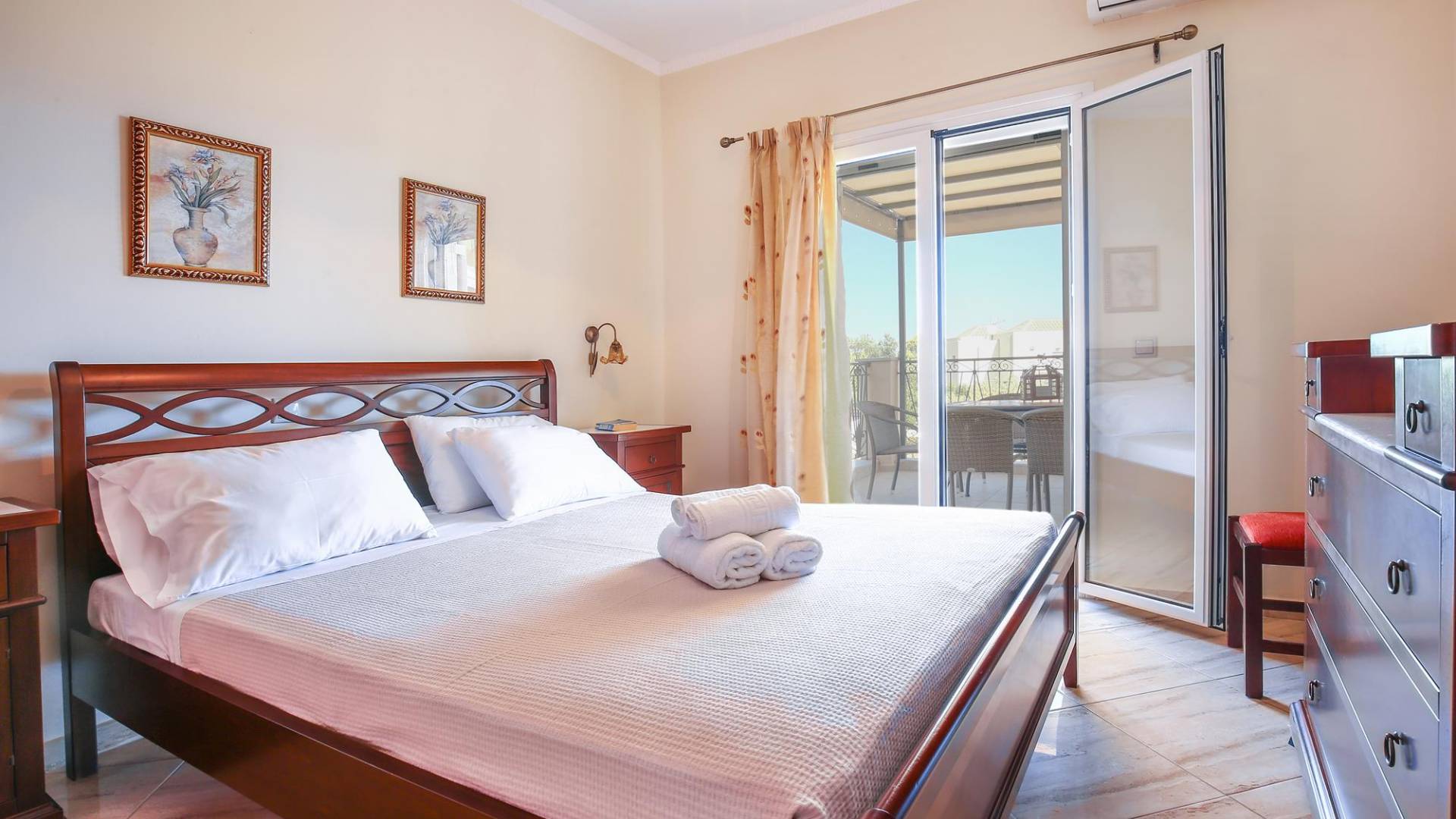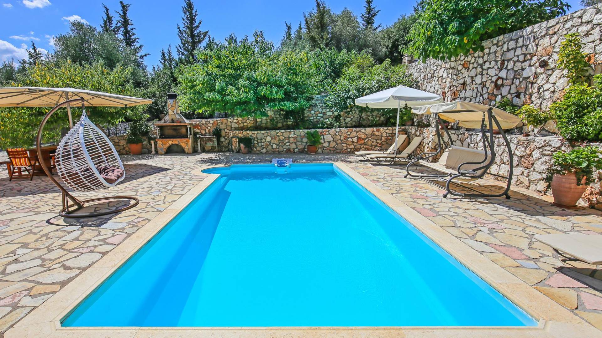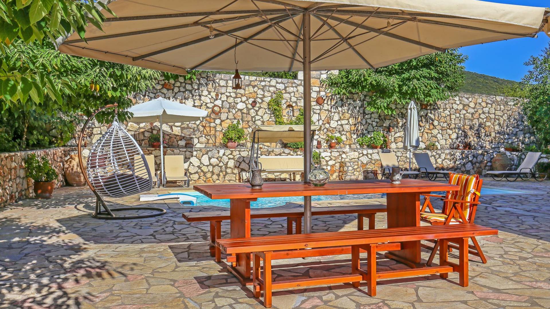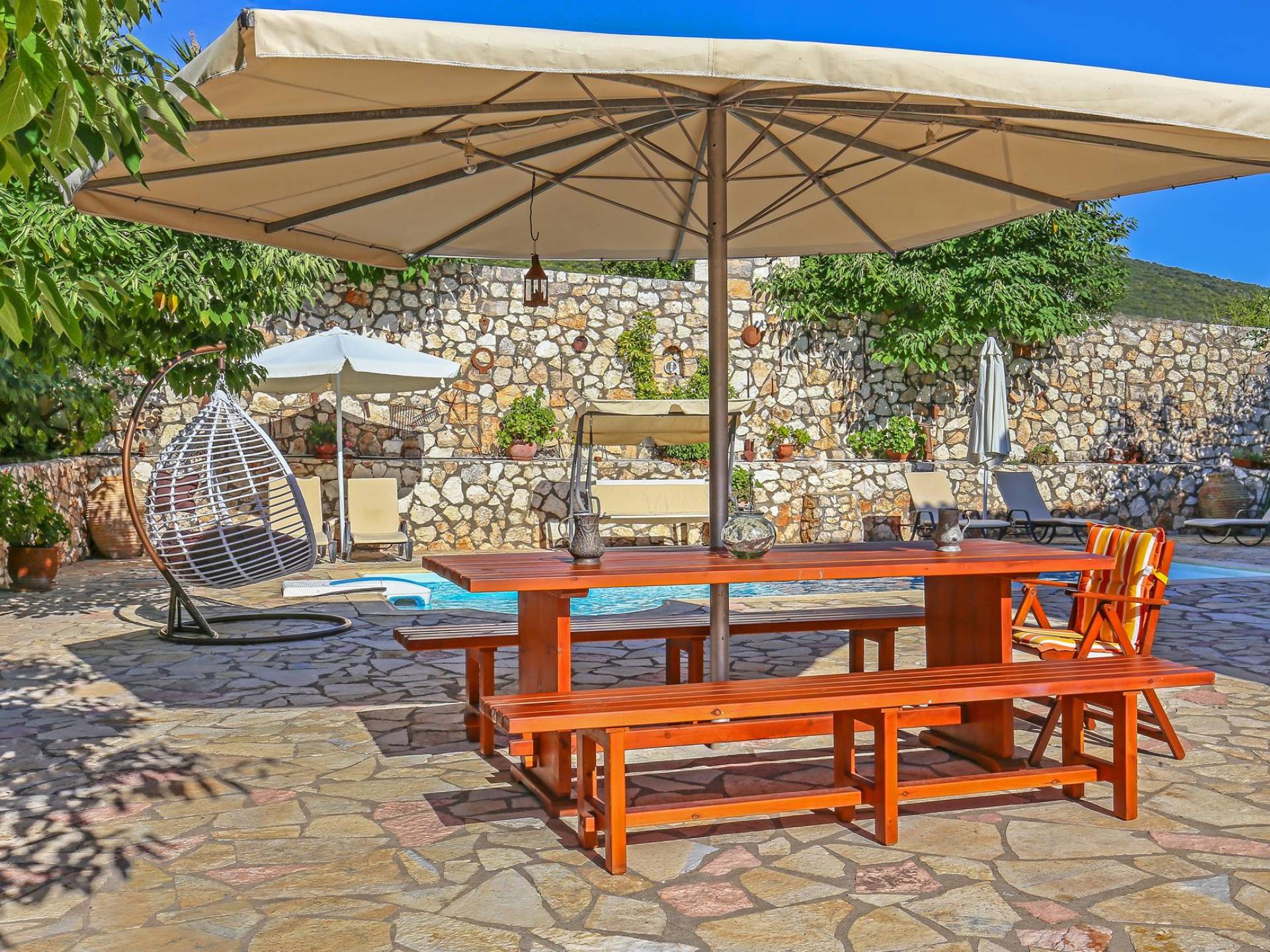 A large staircase from the main hall leads to the upstairs master bedrooms. All bedrooms are spaciously designed and fitted with the same standard of an airy atmosphere, beautiful large bathrooms, and a magnificent view of Karavomilos village and the long beach. A freshly renovated terrace offers sun bathing and plenty of recreational space next to the private pool.