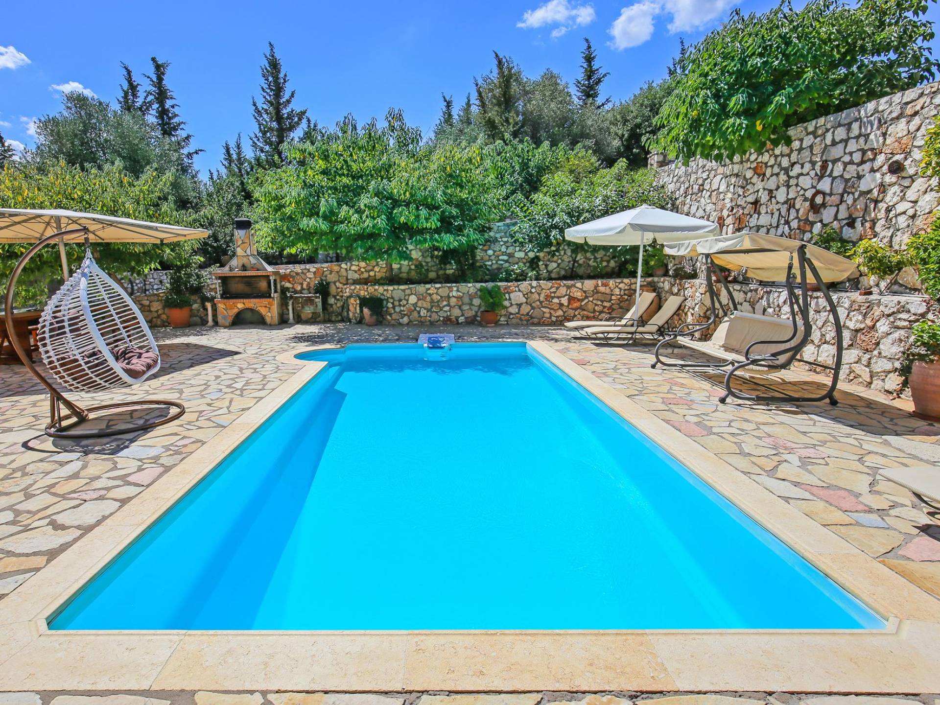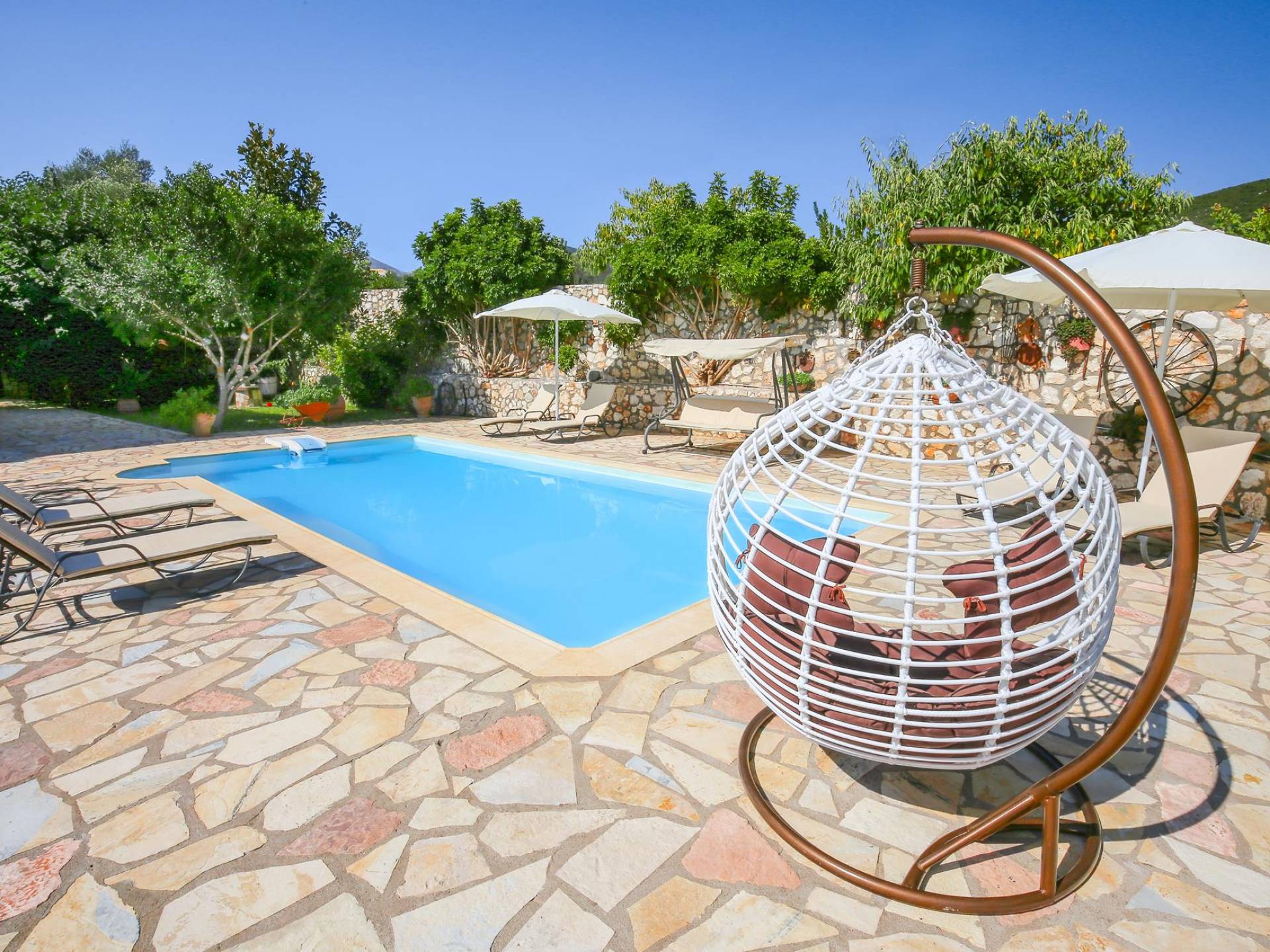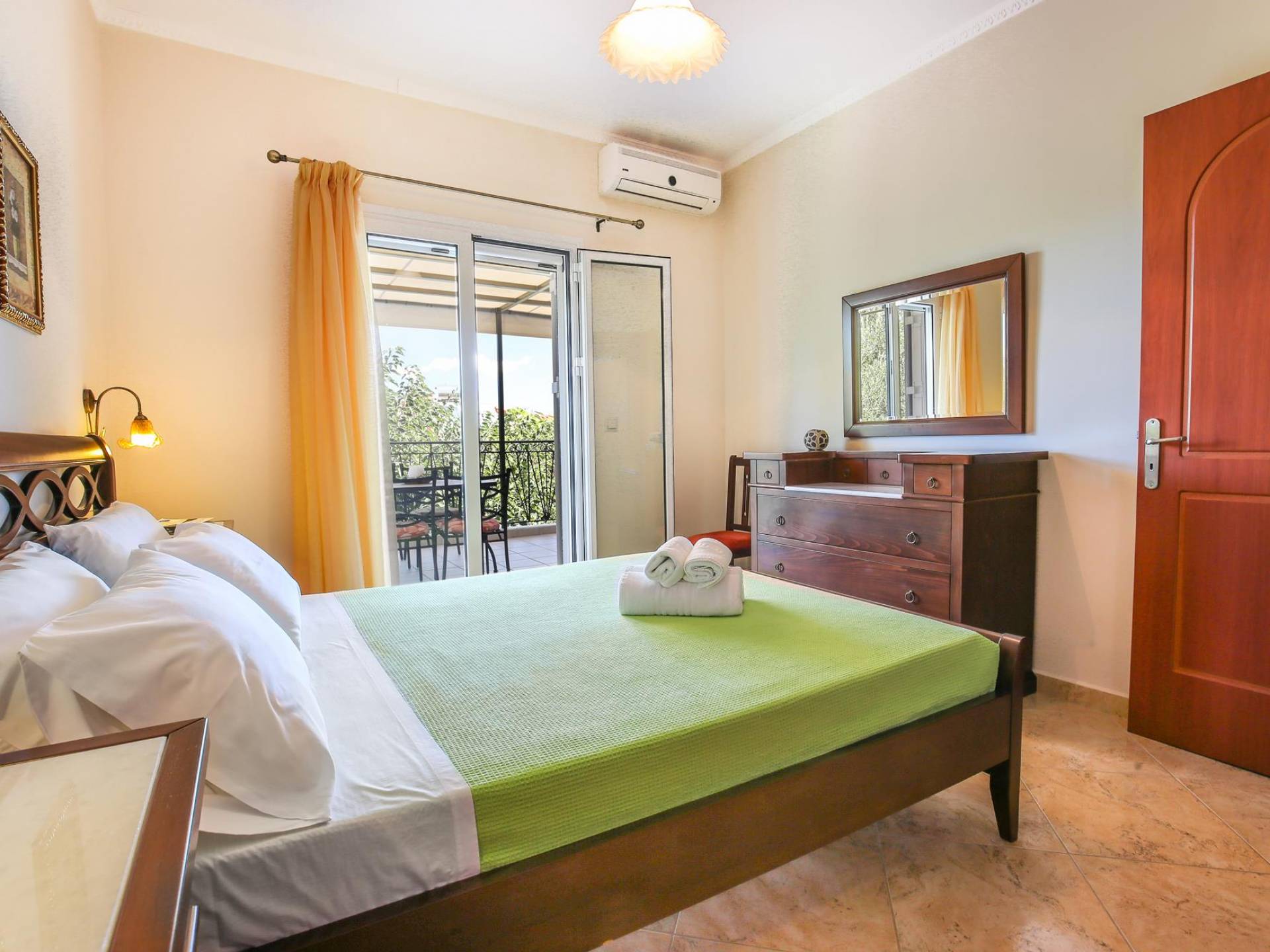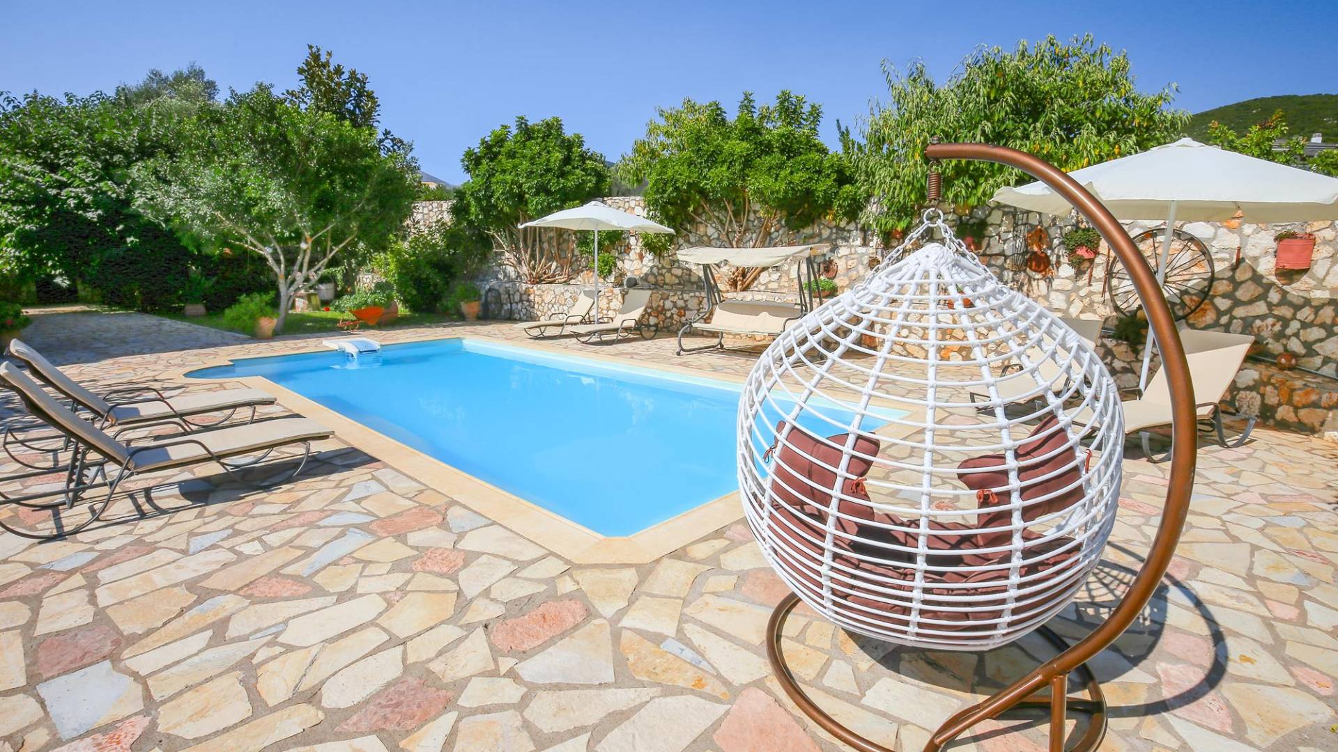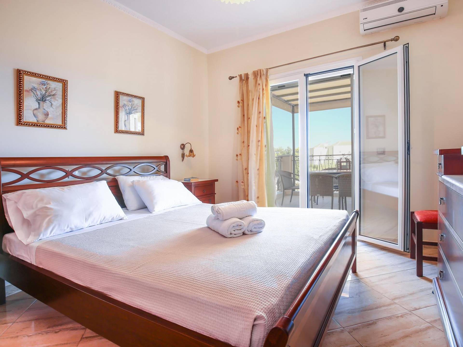 A large staircase from the main hall leads to the upstairs master bedrooms. All bedrooms are spaciously designed and fitted with the same standard of an airy atmosphere, beautiful large bathrooms, and a magnificent view of Karavomilos village and the long beach. A freshly renovated terrace offers sun bathing and plenty of recreational space next to the private pool.