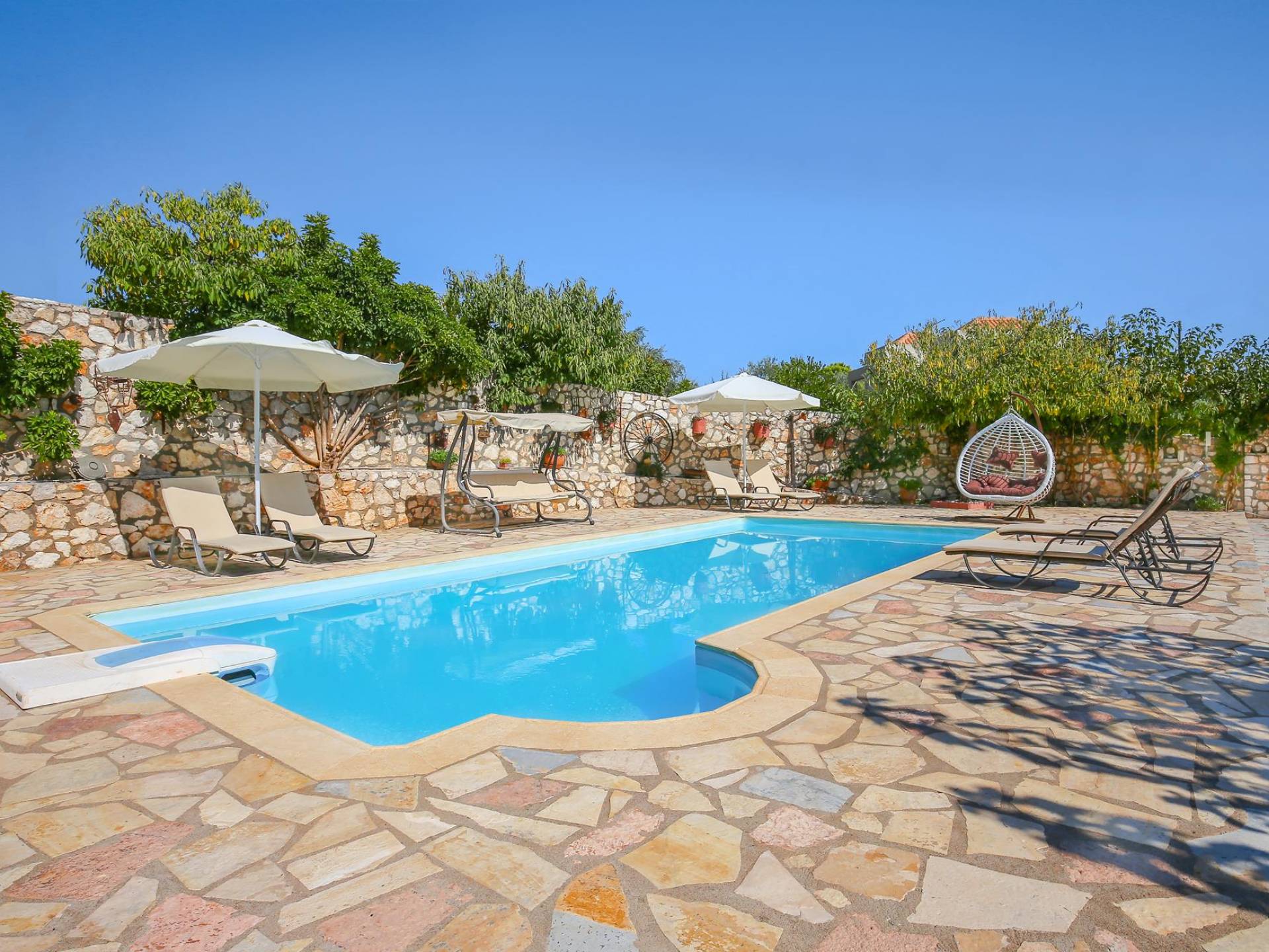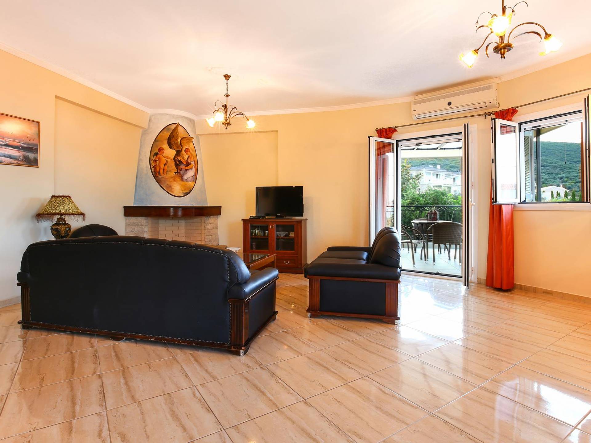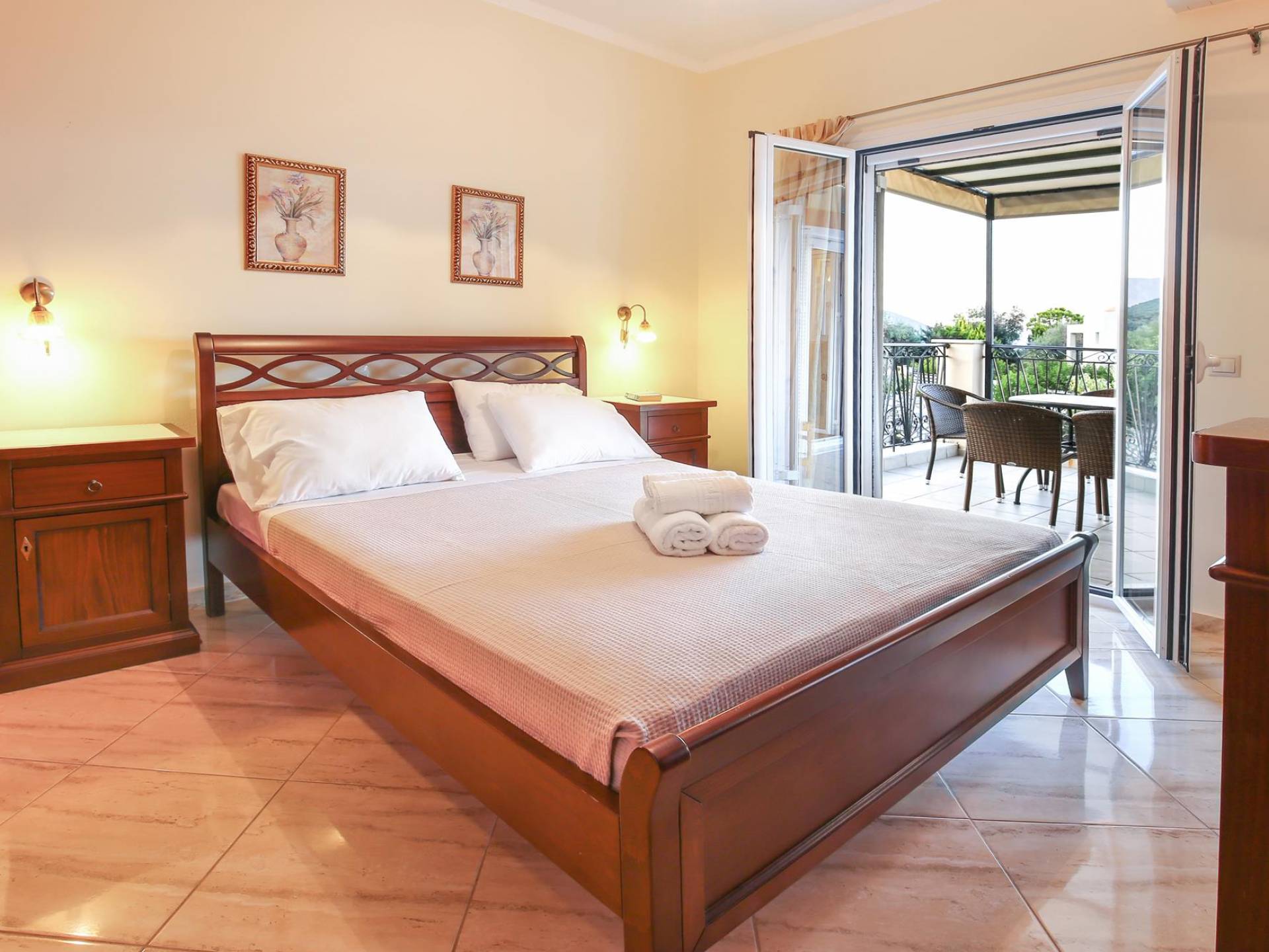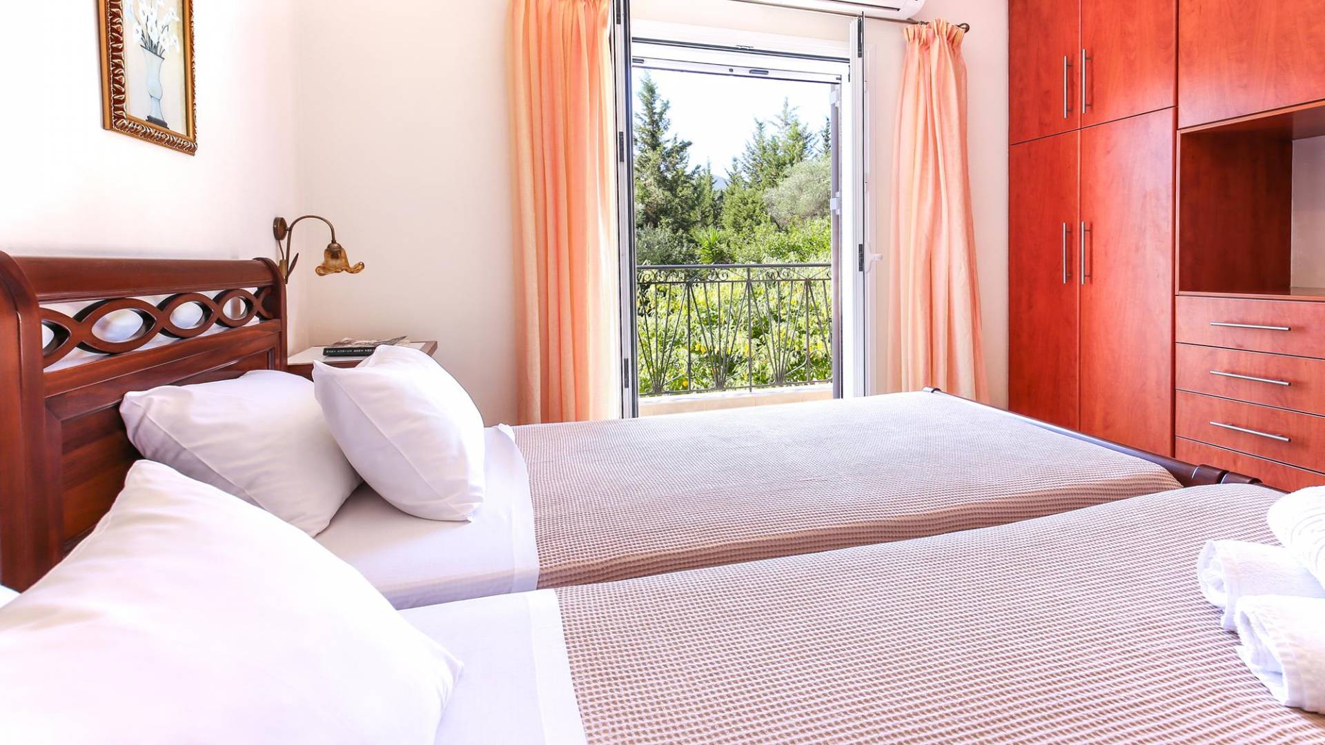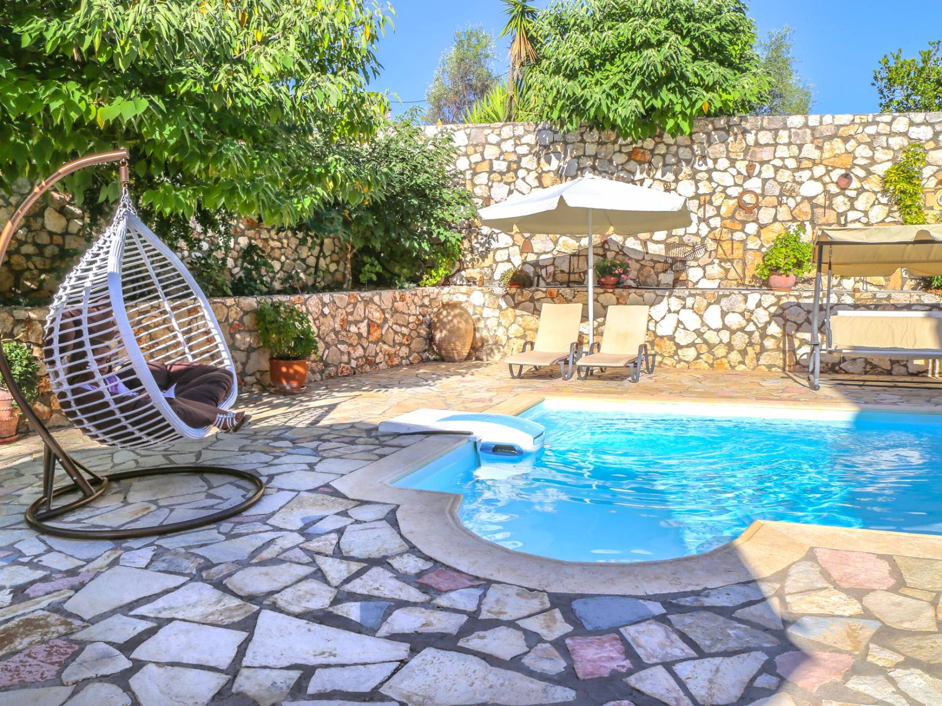 A large staircase from the main hall leads to the upstairs master bedrooms. All bedrooms are spaciously designed and fitted with the same standard of an airy atmosphere, beautiful large bathrooms, and a magnificent view of Karavomilos village and the long beach. A freshly renovated terrace offers sun bathing and plenty of recreational space next to the private pool.