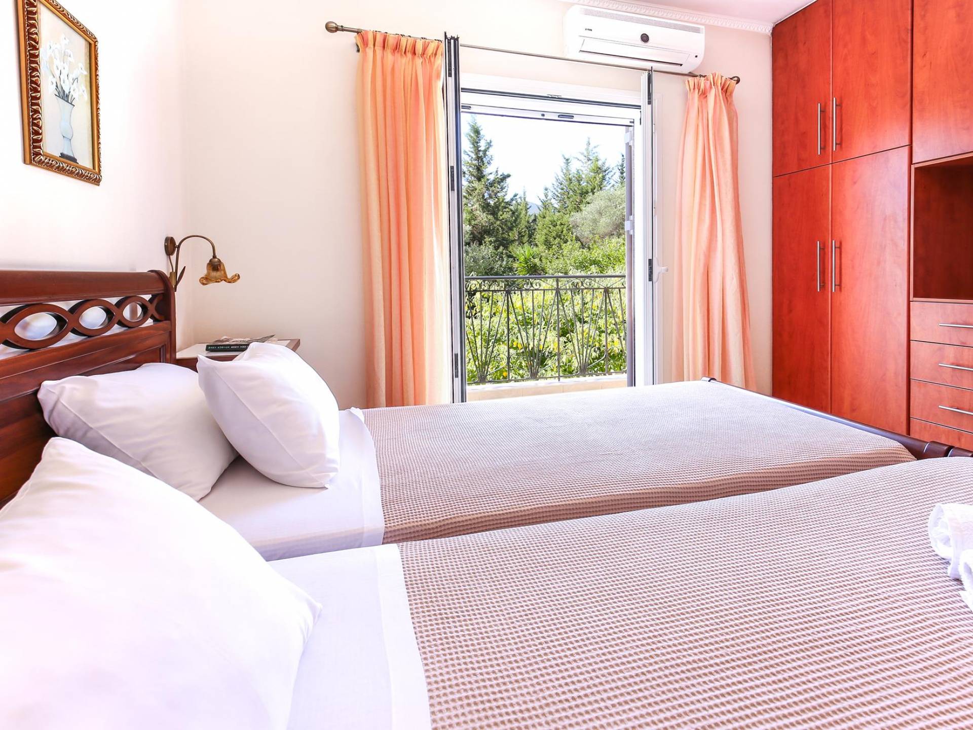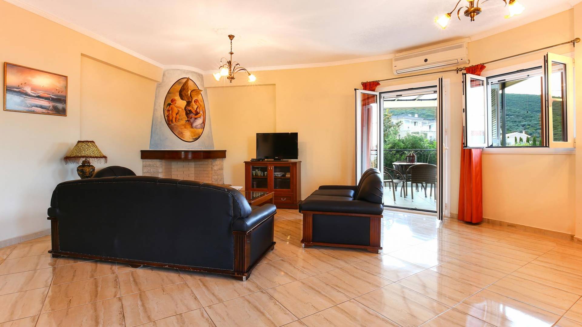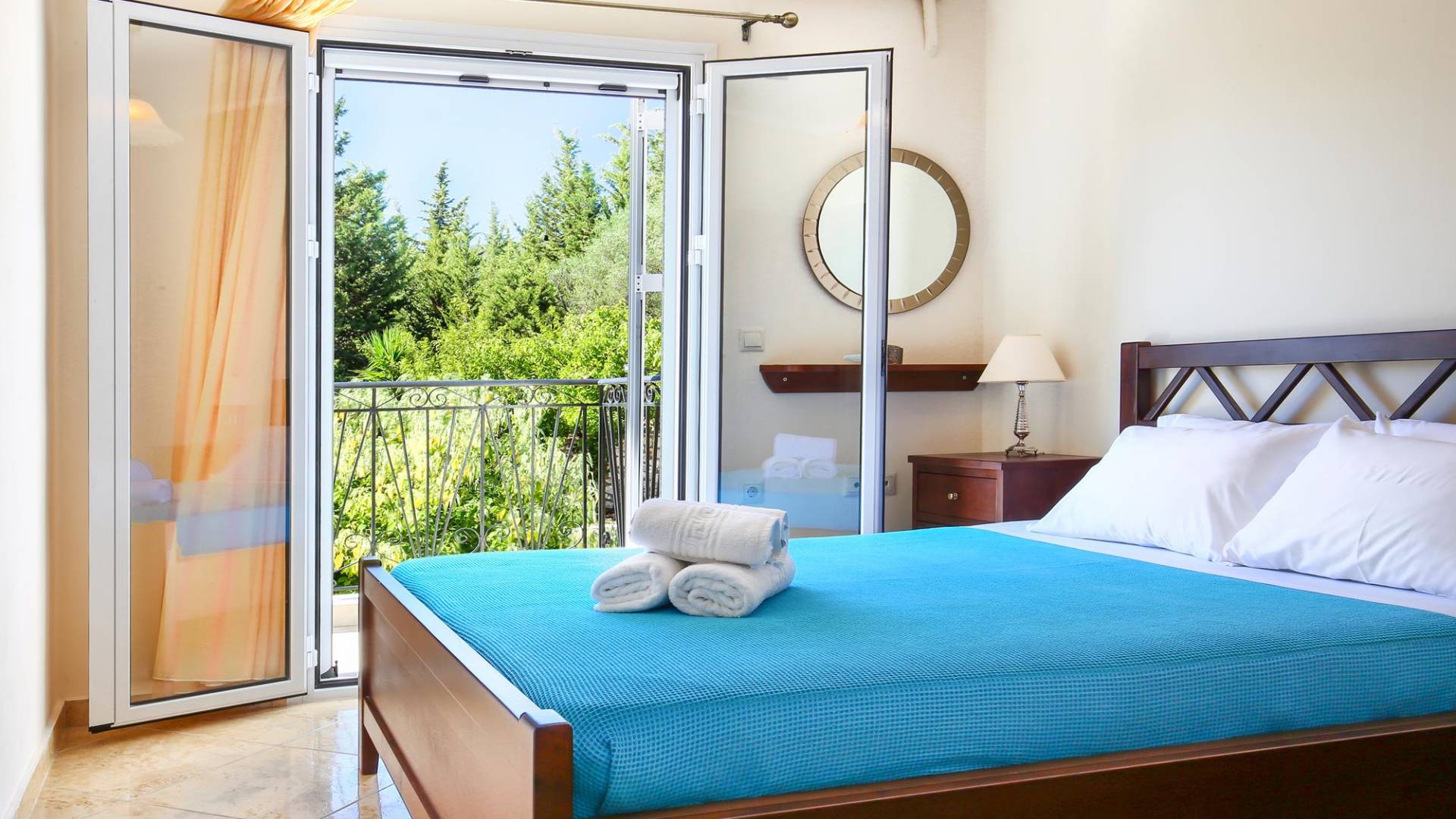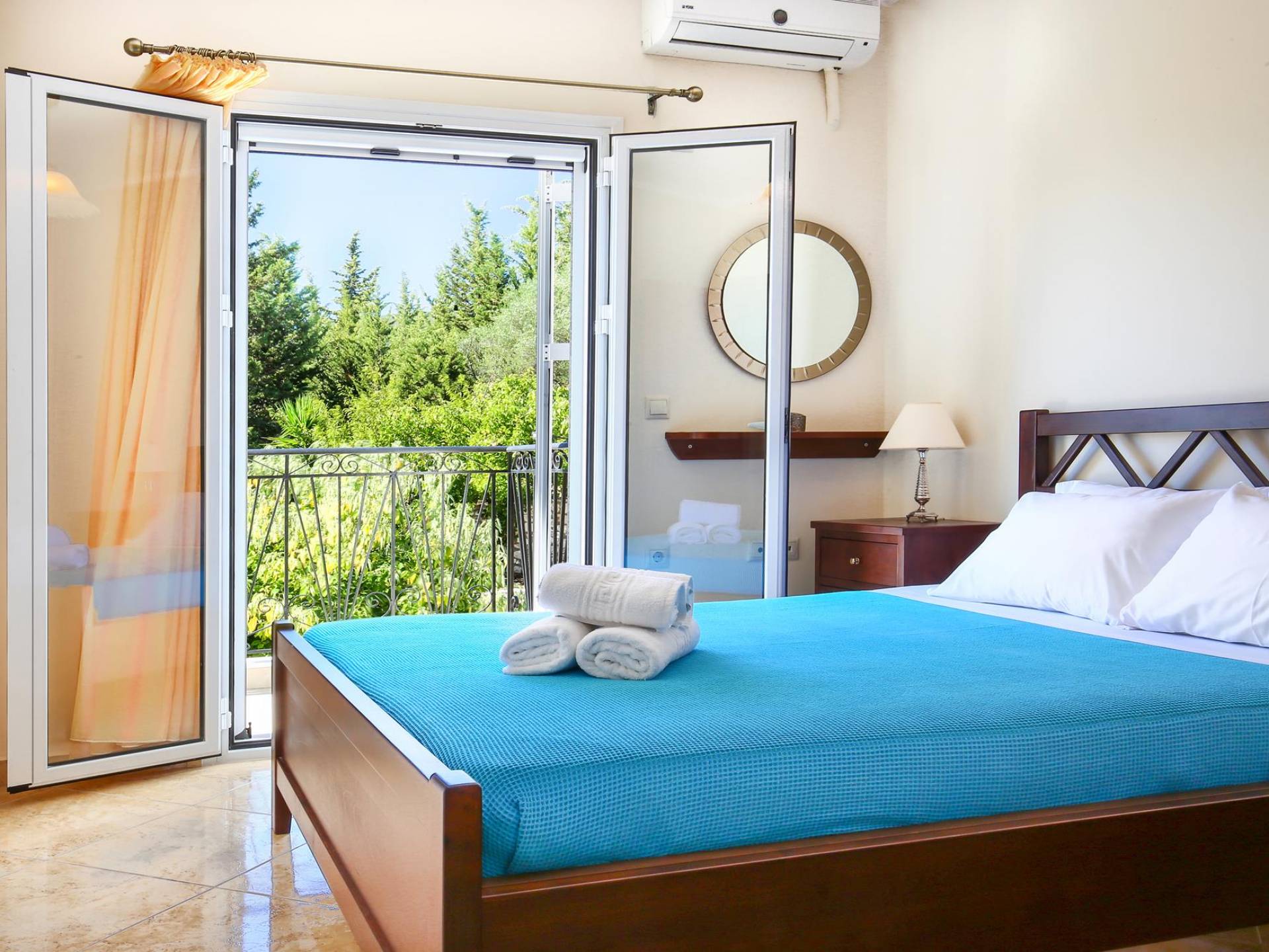 A large staircase from the main hall leads to the upstairs master bedrooms. All bedrooms are spaciously designed and fitted with the same standard of an airy atmosphere, beautiful large bathrooms, and a magnificent view of Karavomilos village and the long beach. A freshly renovated terrace offers sun bathing and plenty of recreational space next to the private pool.