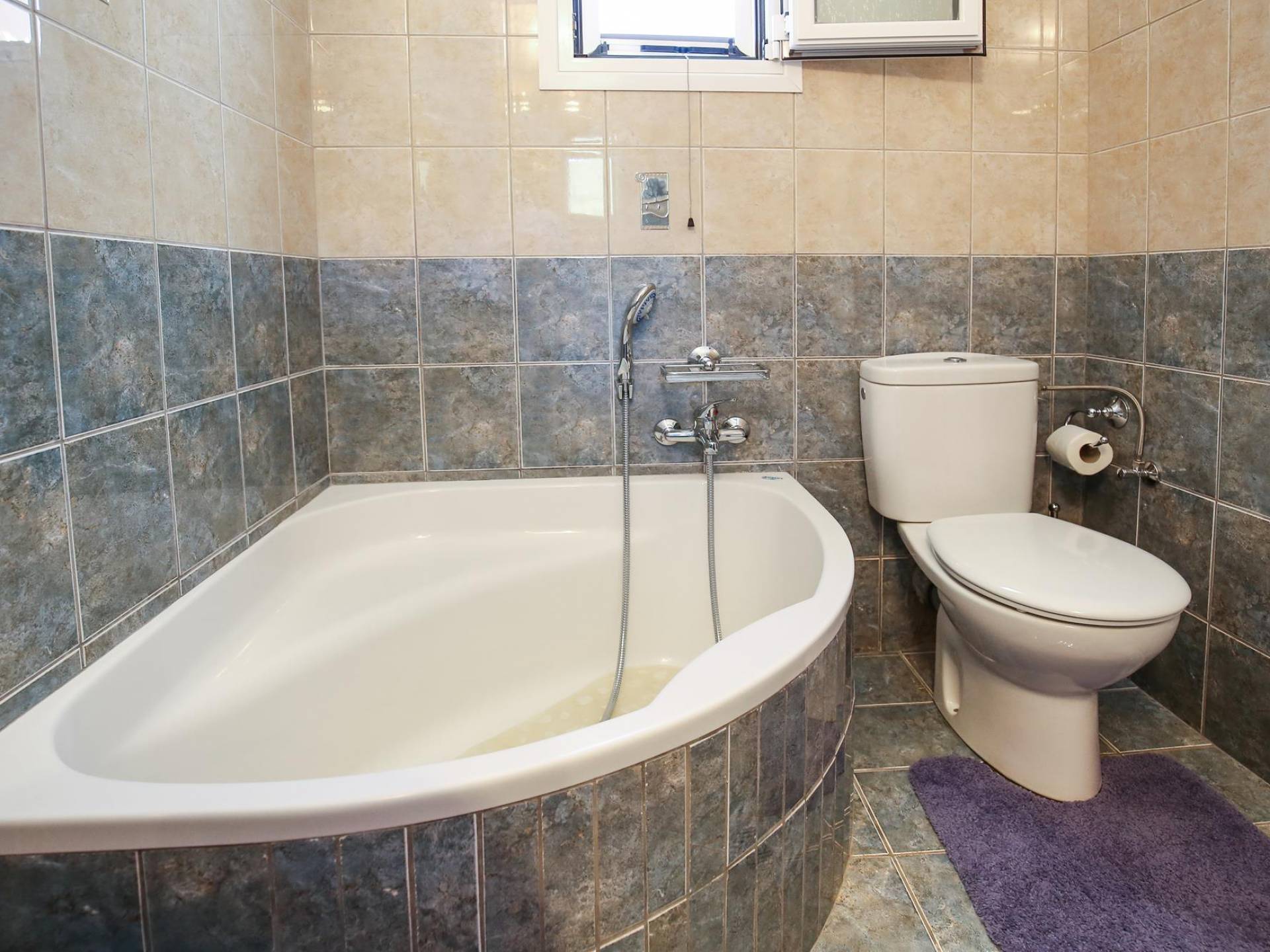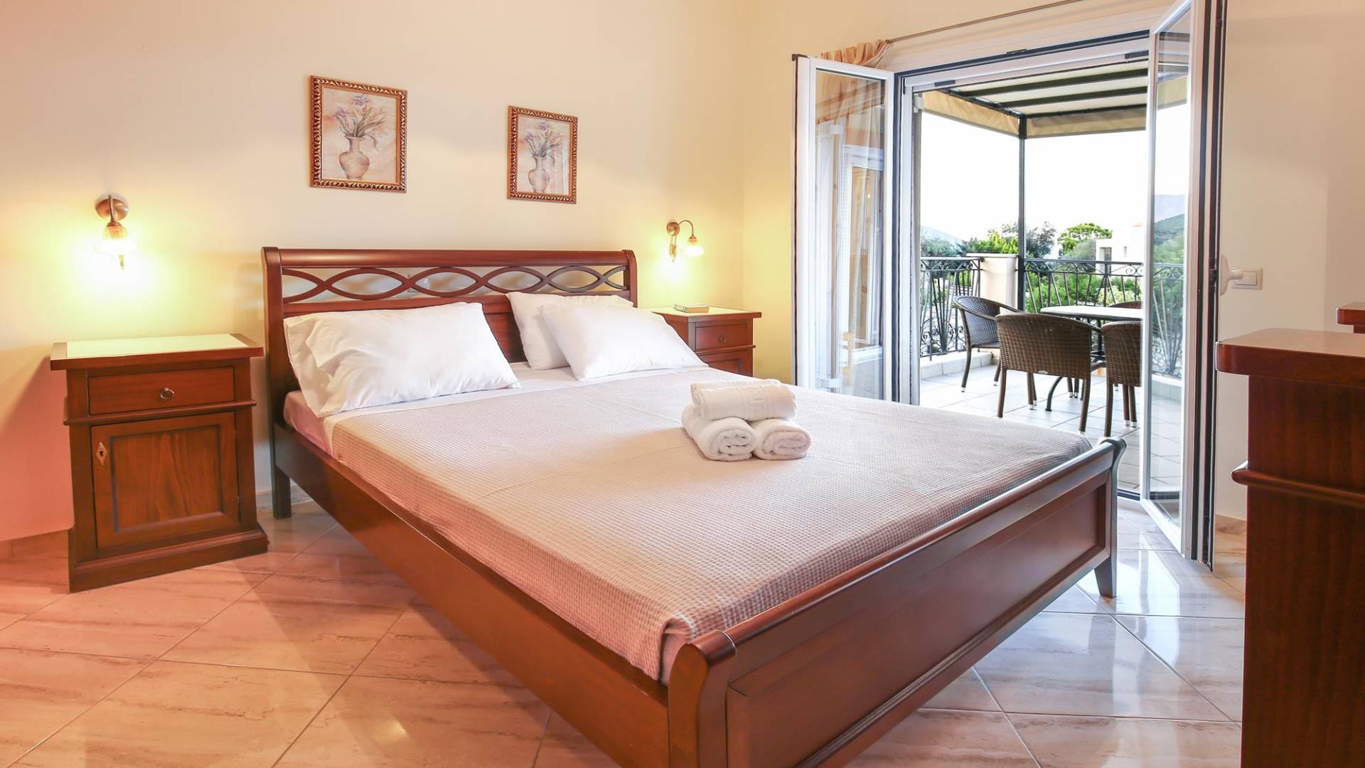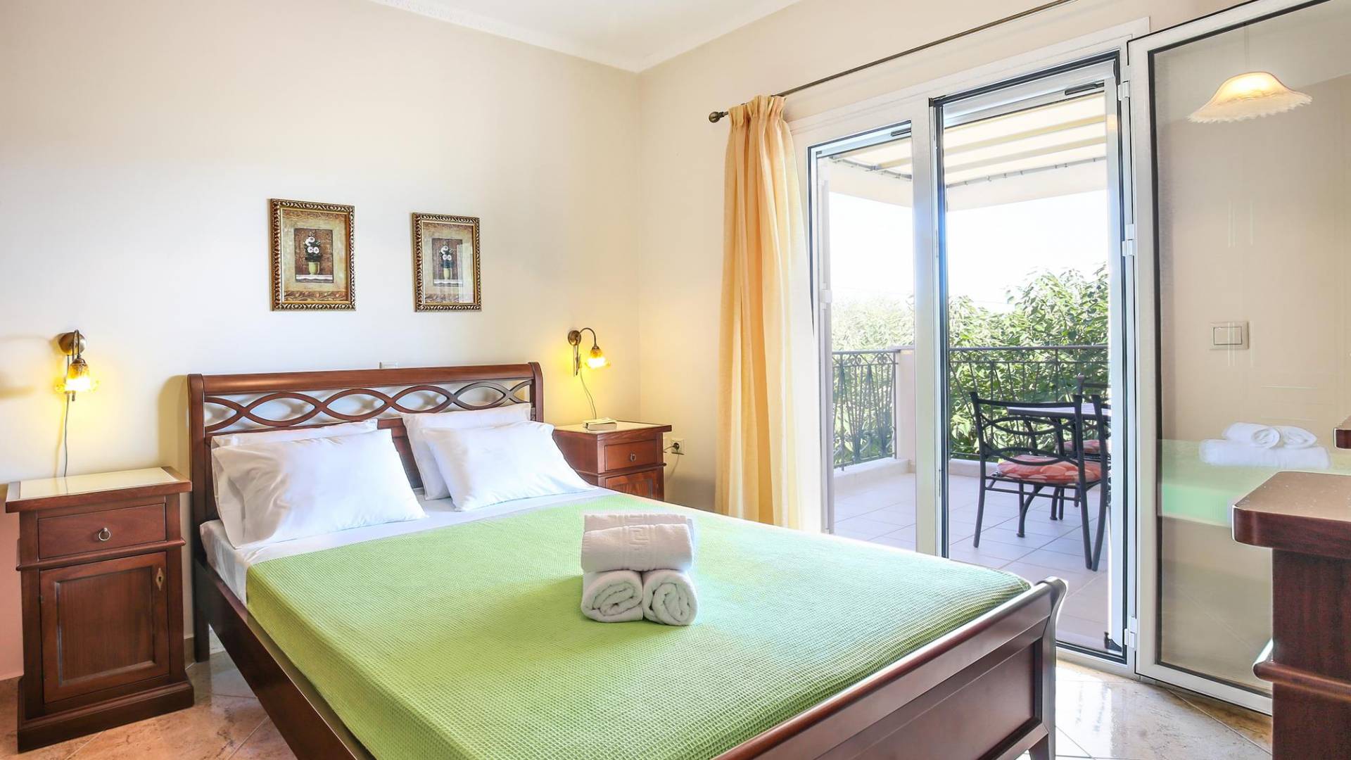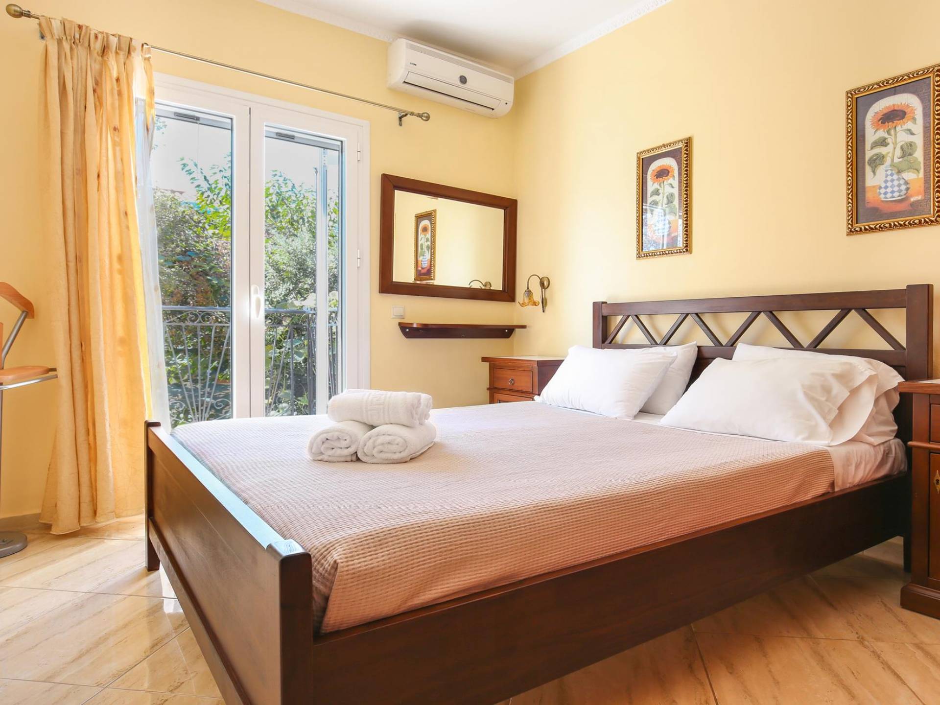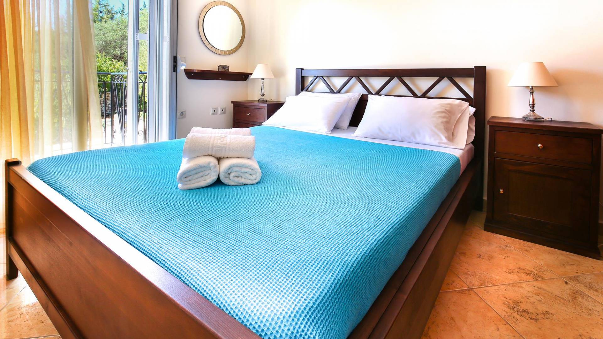 A large staircase from the main hall leads to the upstairs master bedrooms. All bedrooms are spaciously designed and fitted with the same standard of an airy atmosphere, beautiful large bathrooms, and a magnificent view of Karavomilos village and the long beach. A freshly renovated terrace offers sun bathing and plenty of recreational space next to the private pool.