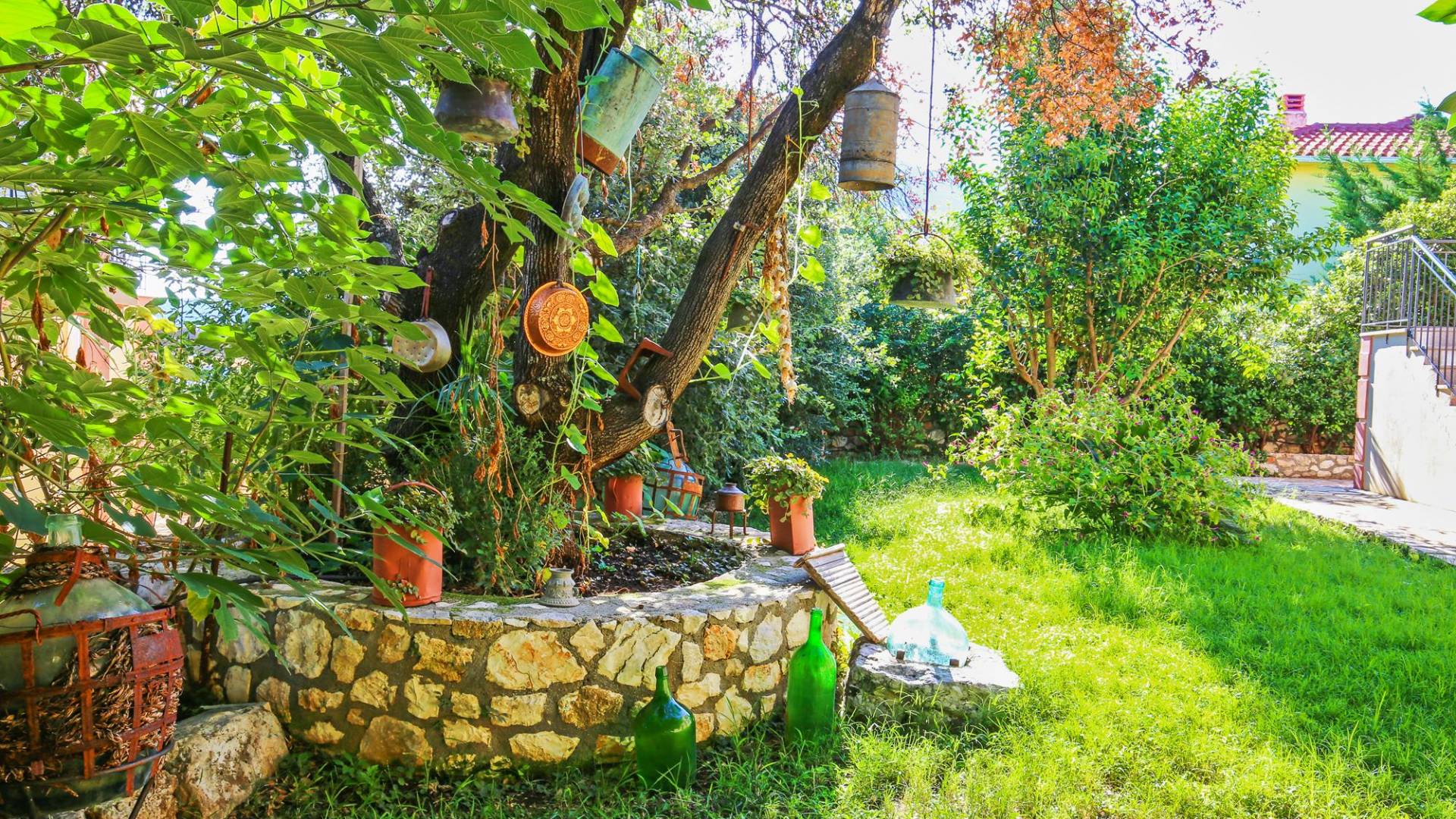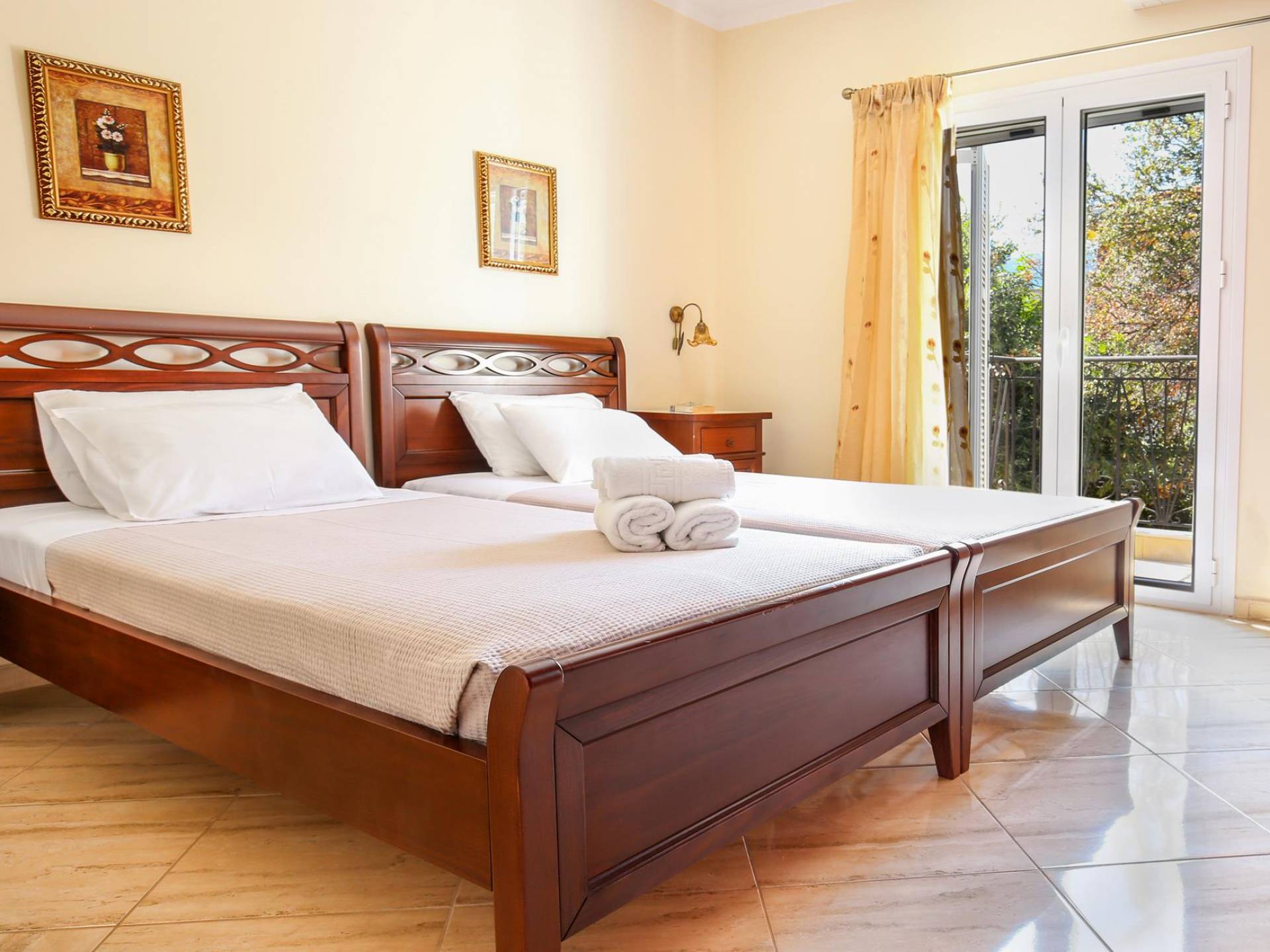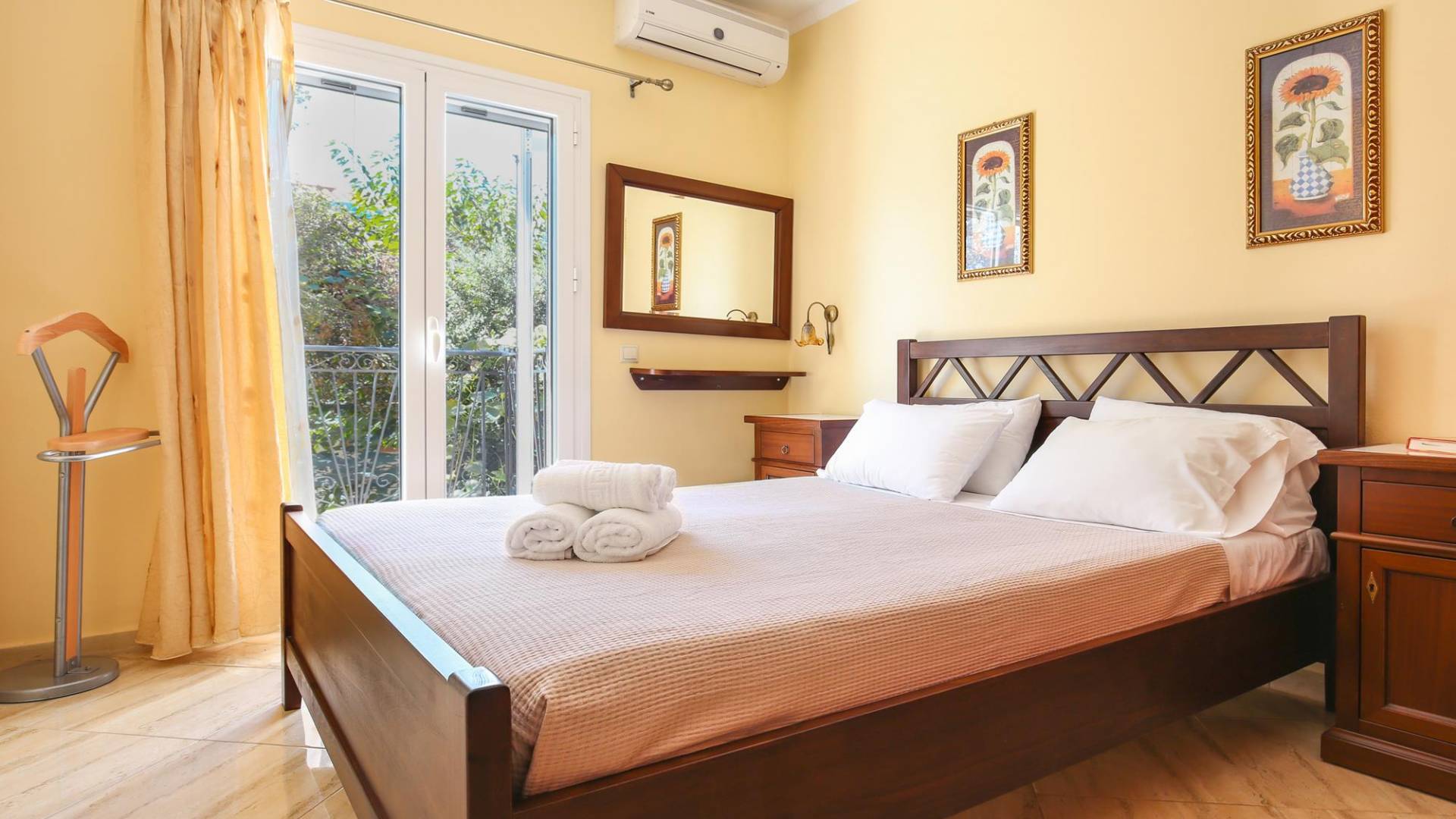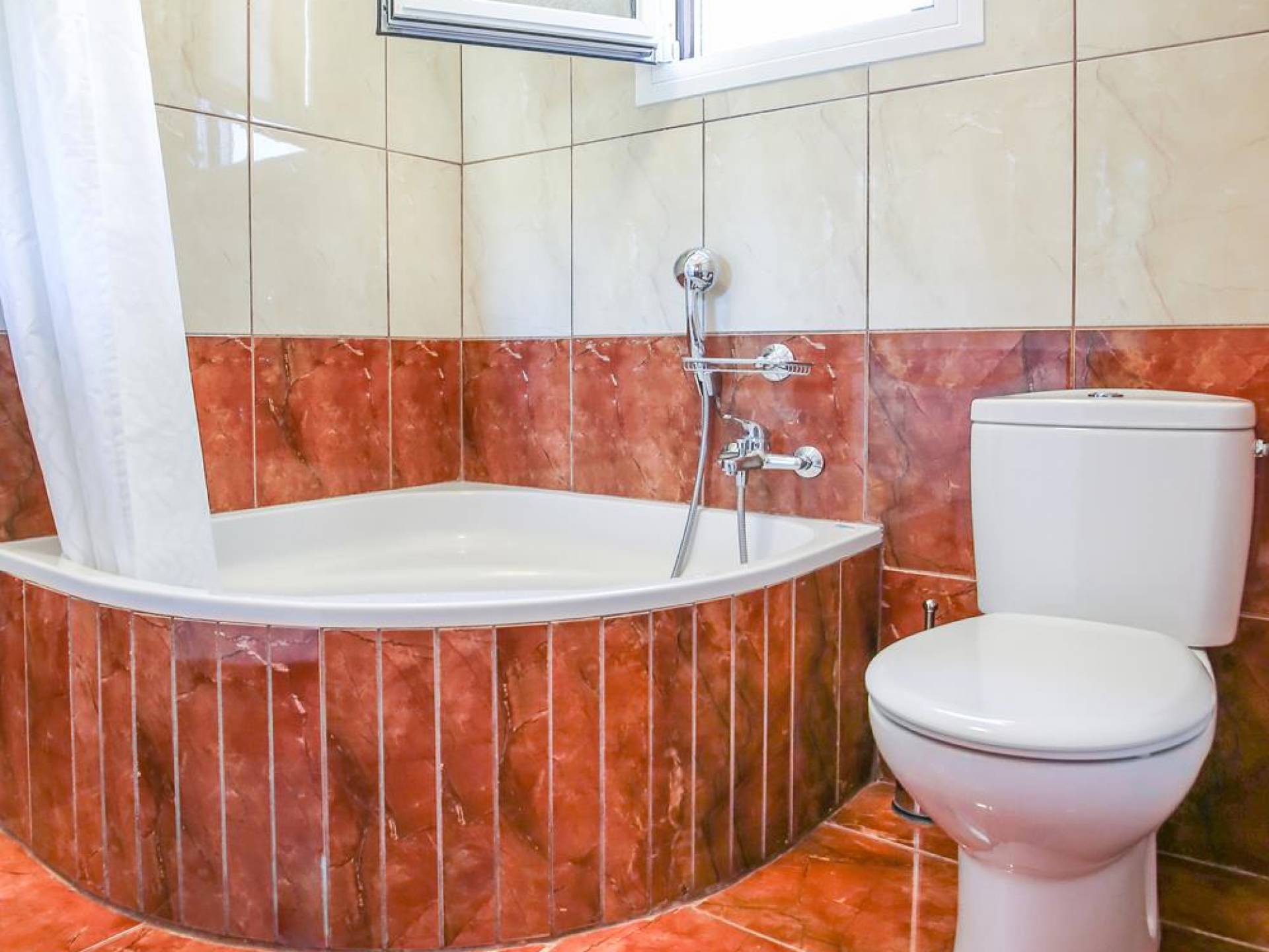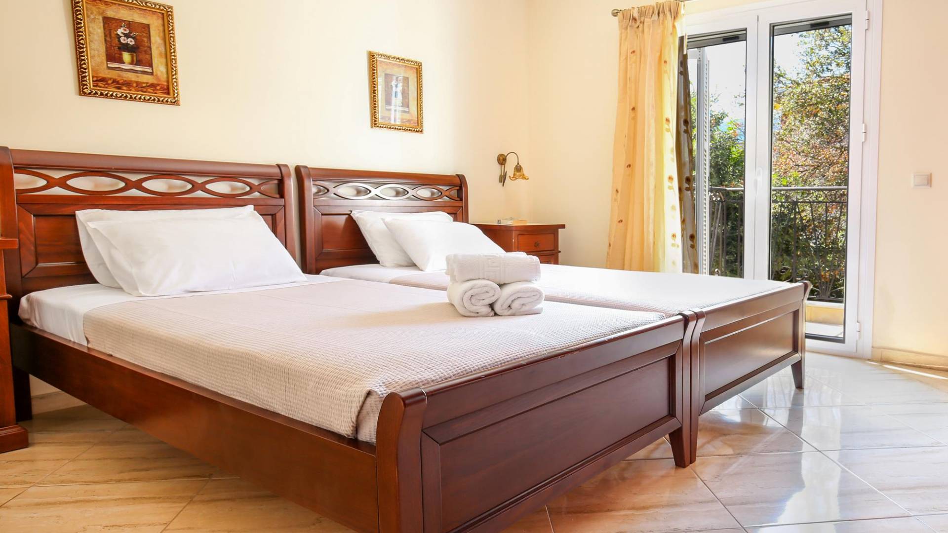 A large staircase from the main hall leads to the upstairs master bedrooms. All bedrooms are spaciously designed and fitted with the same standard of an airy atmosphere, beautiful large bathrooms, and a magnificent view of Karavomilos village and the long beach. A freshly renovated terrace offers sun bathing and plenty of recreational space next to the private pool.
