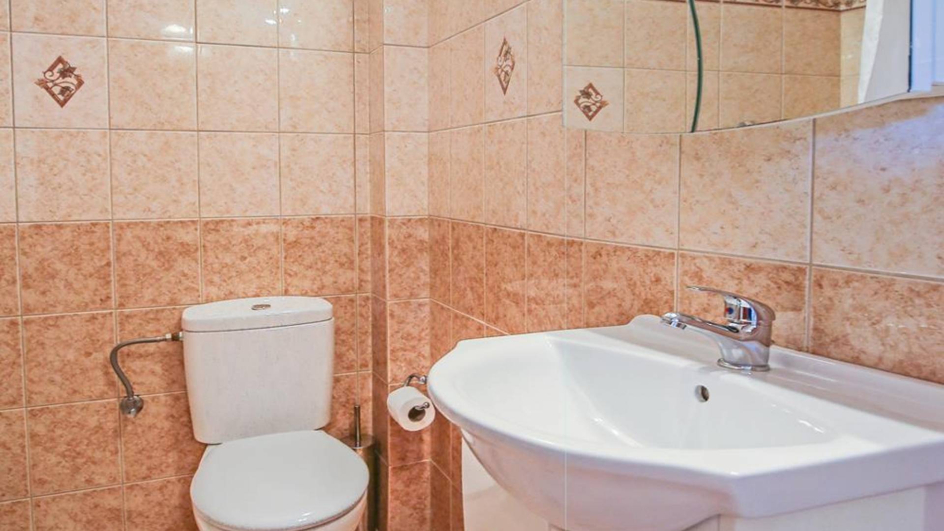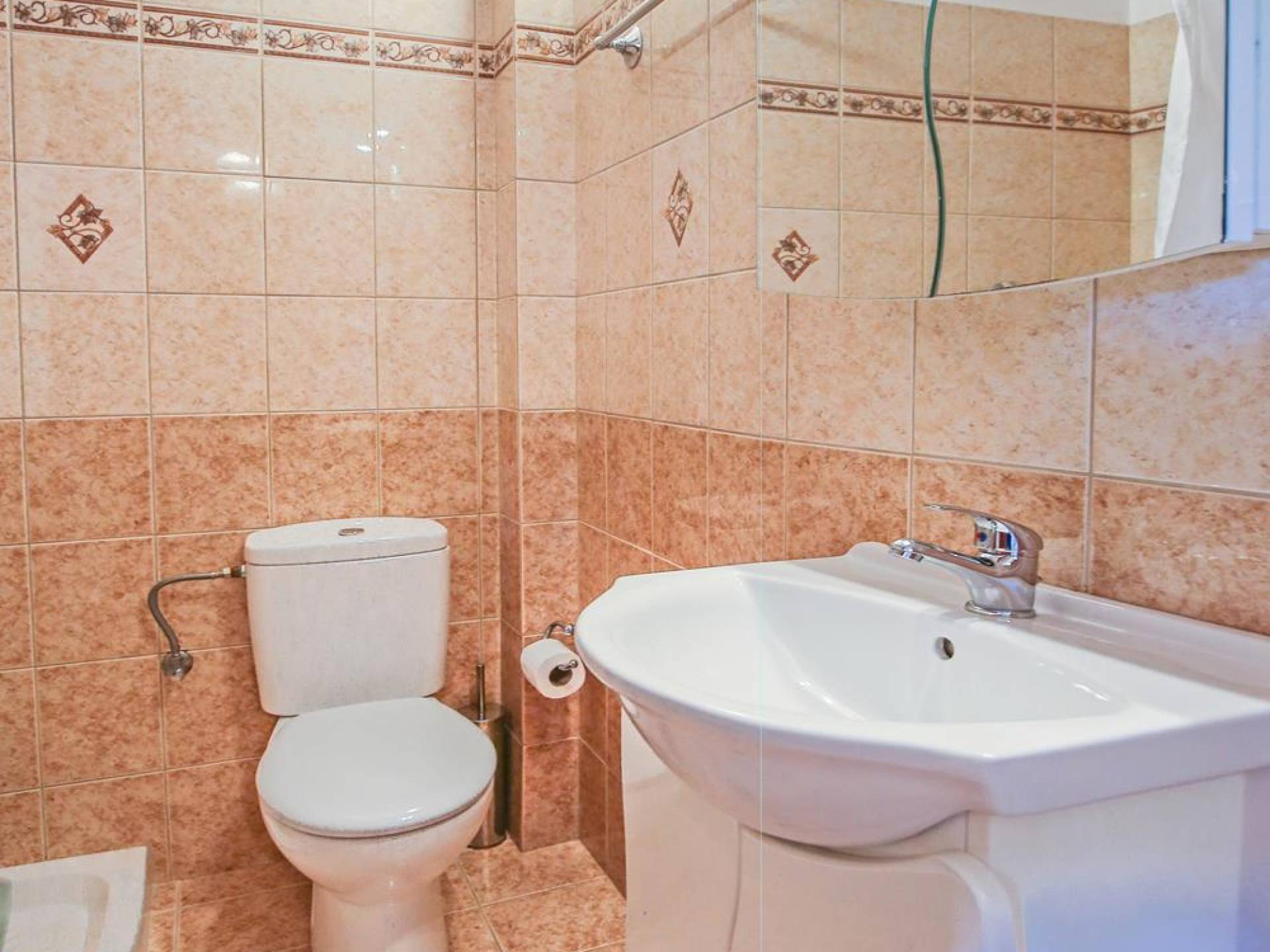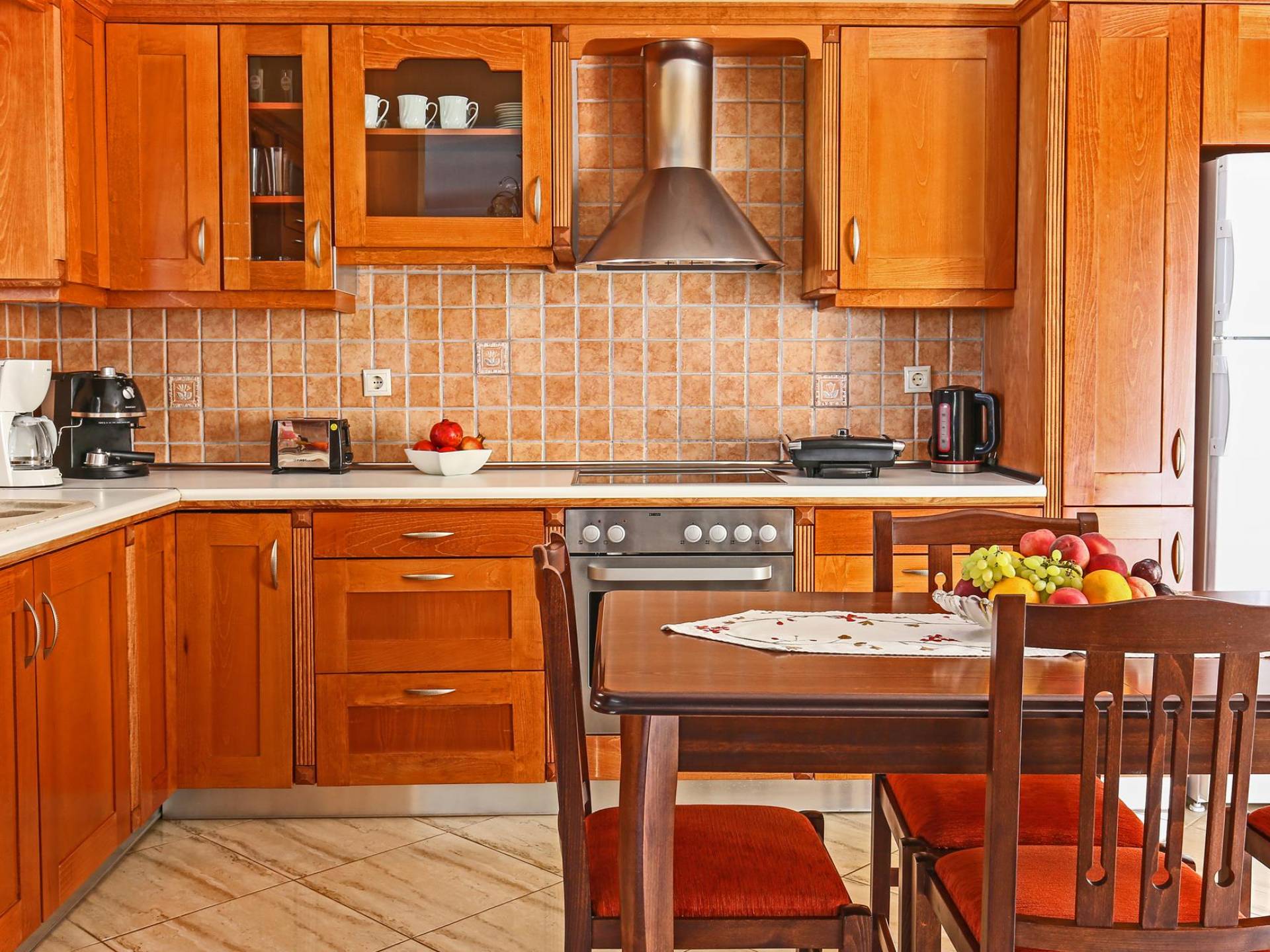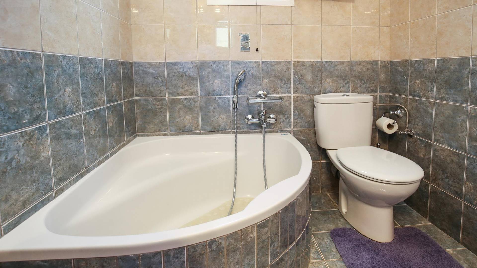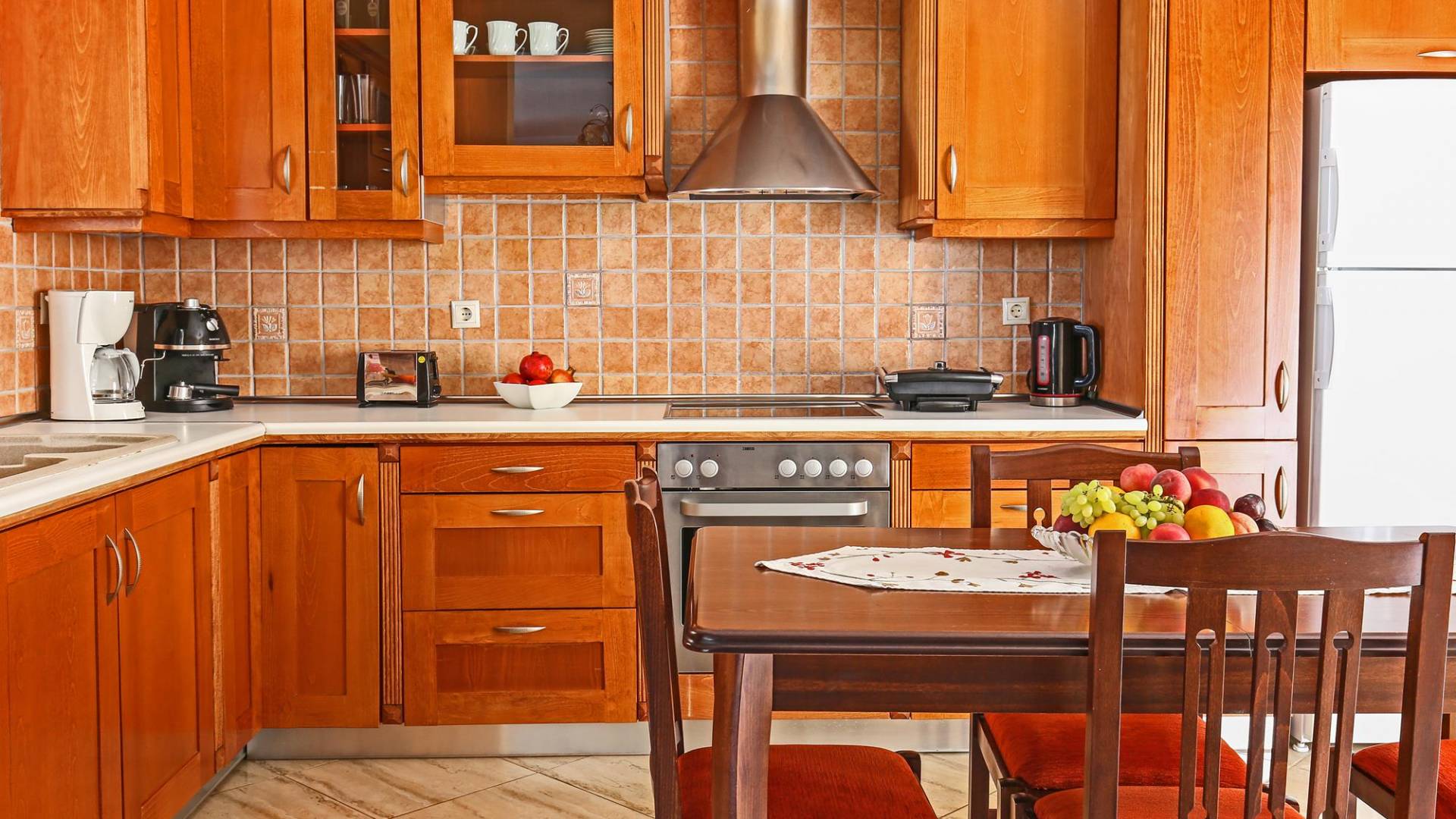 A large staircase from the main hall leads to the upstairs master bedrooms. All bedrooms are spaciously designed and fitted with the same standard of an airy atmosphere, beautiful large bathrooms, and a magnificent view of Karavomilos village and the long beach. A freshly renovated terrace offers sun bathing and plenty of recreational space next to the private pool.