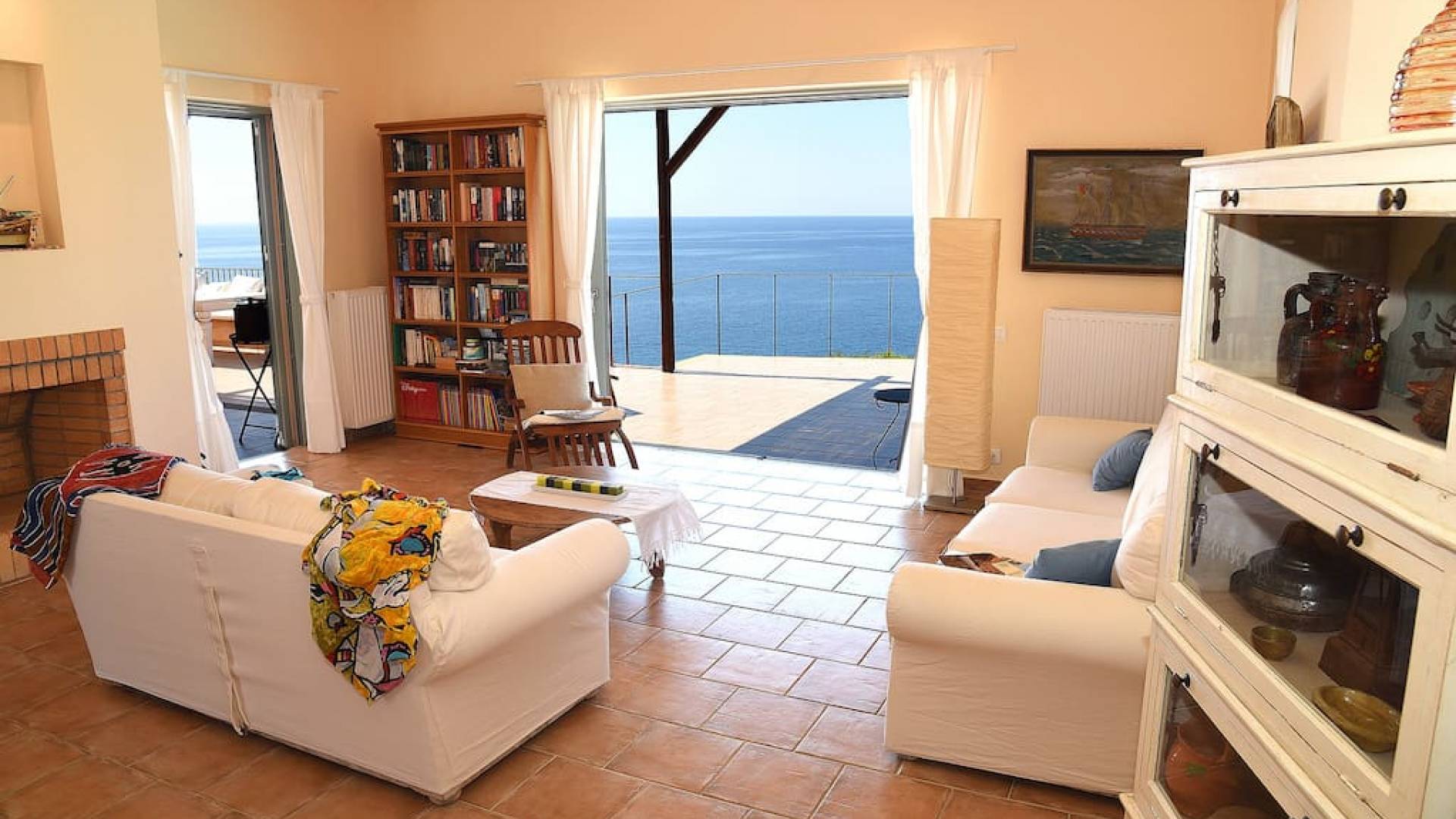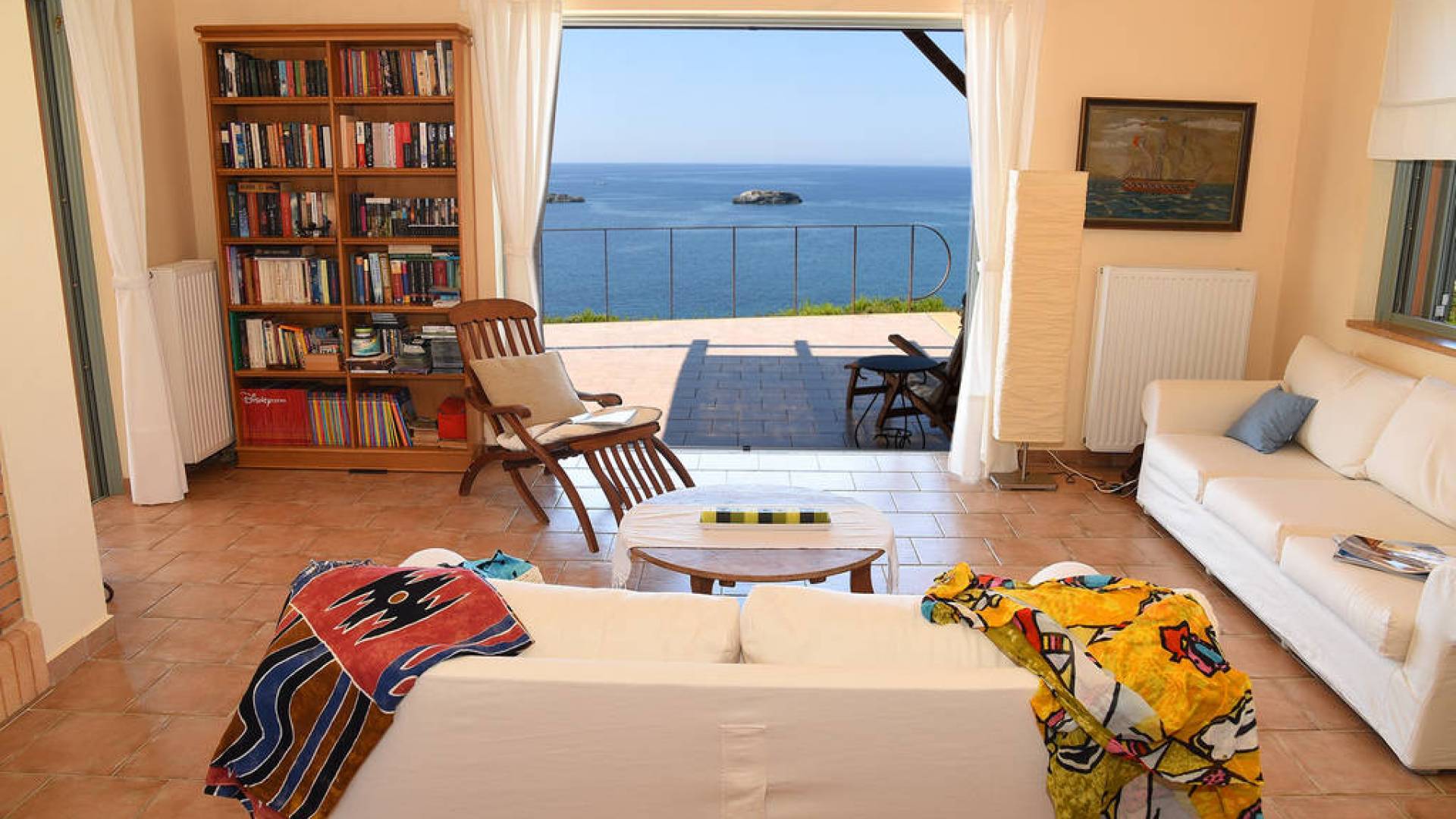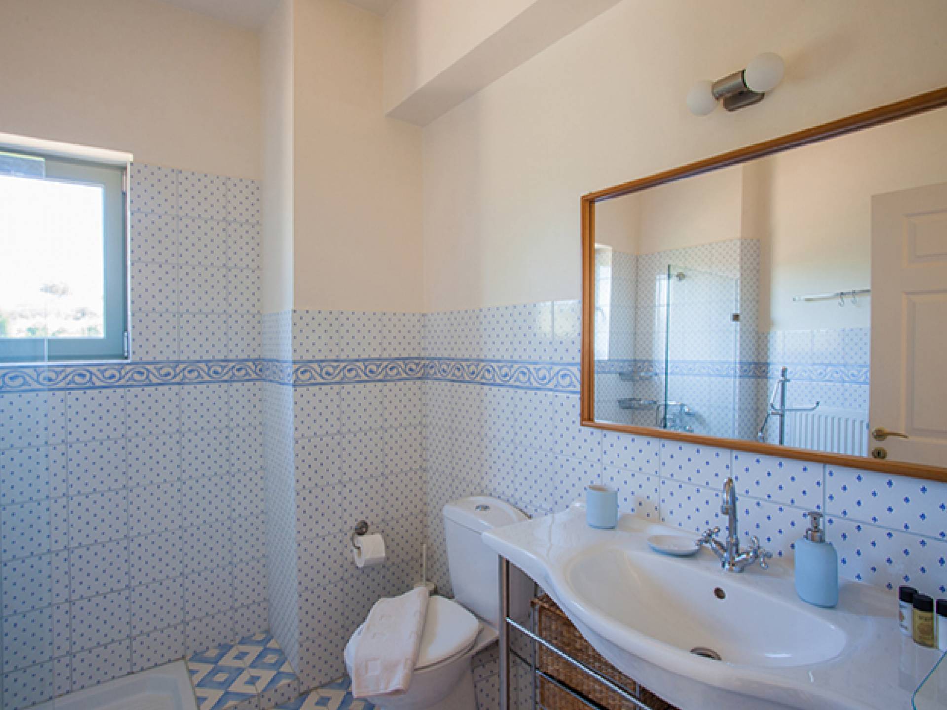 Armonia Villa Kefalonia is surrounded by an 11000 m2 garden, with an amazing 360 view. Armonia is 250m² with 4 bedrooms and 4 bathrooms nicely placed on 2 levels. Accommodates up to 8 people in 4 bedrooms. Ground Level: Spacious living room and fully equipped kitchen with direct access to an outdoor dining table, the garden, the BBQ terrace, and the common swimming pool. Also houses one of the 4 bedrooms of the villas equipped with twin beds and an en-suite bathroom. On this level, there is also a WC for guests.