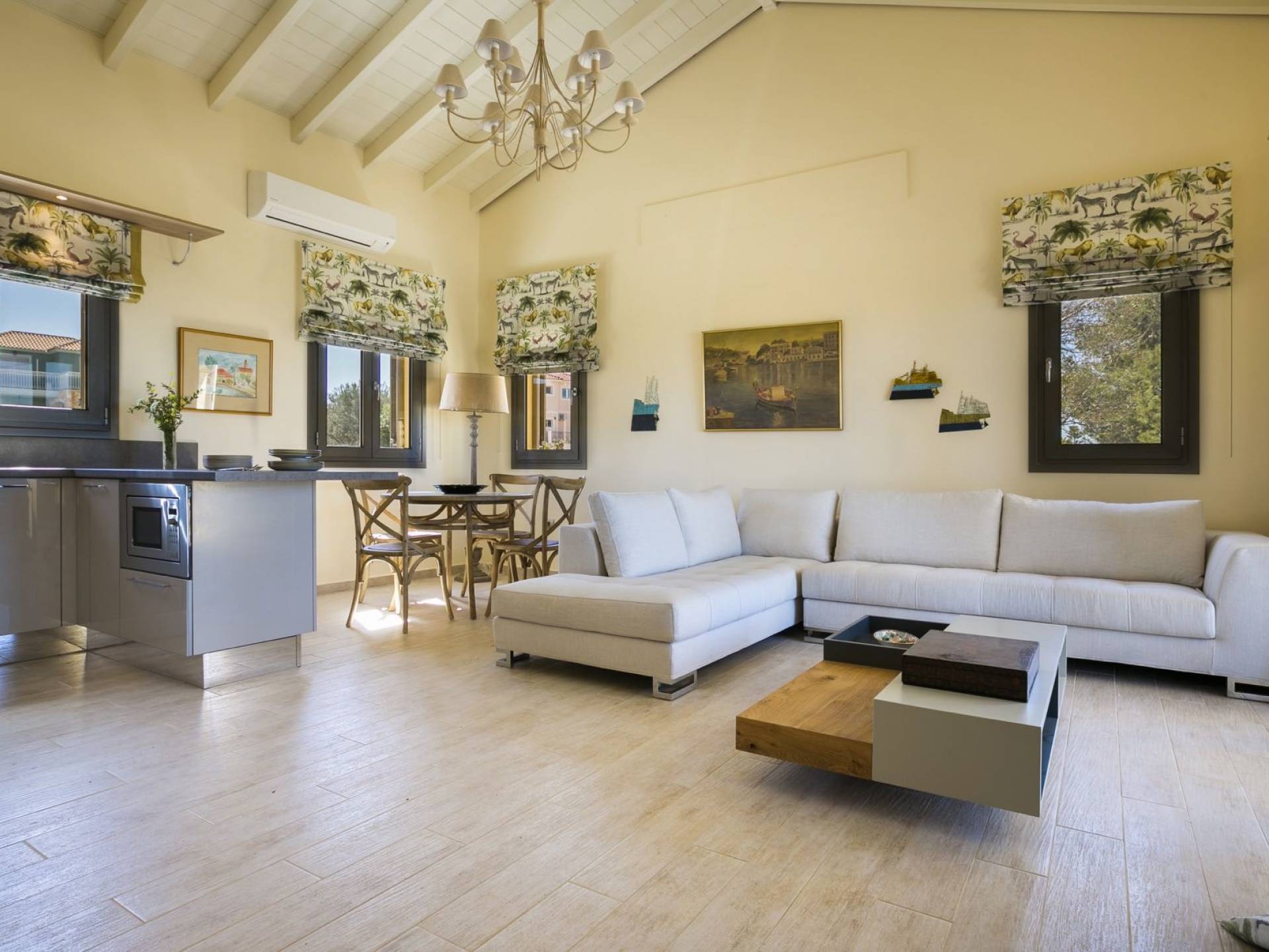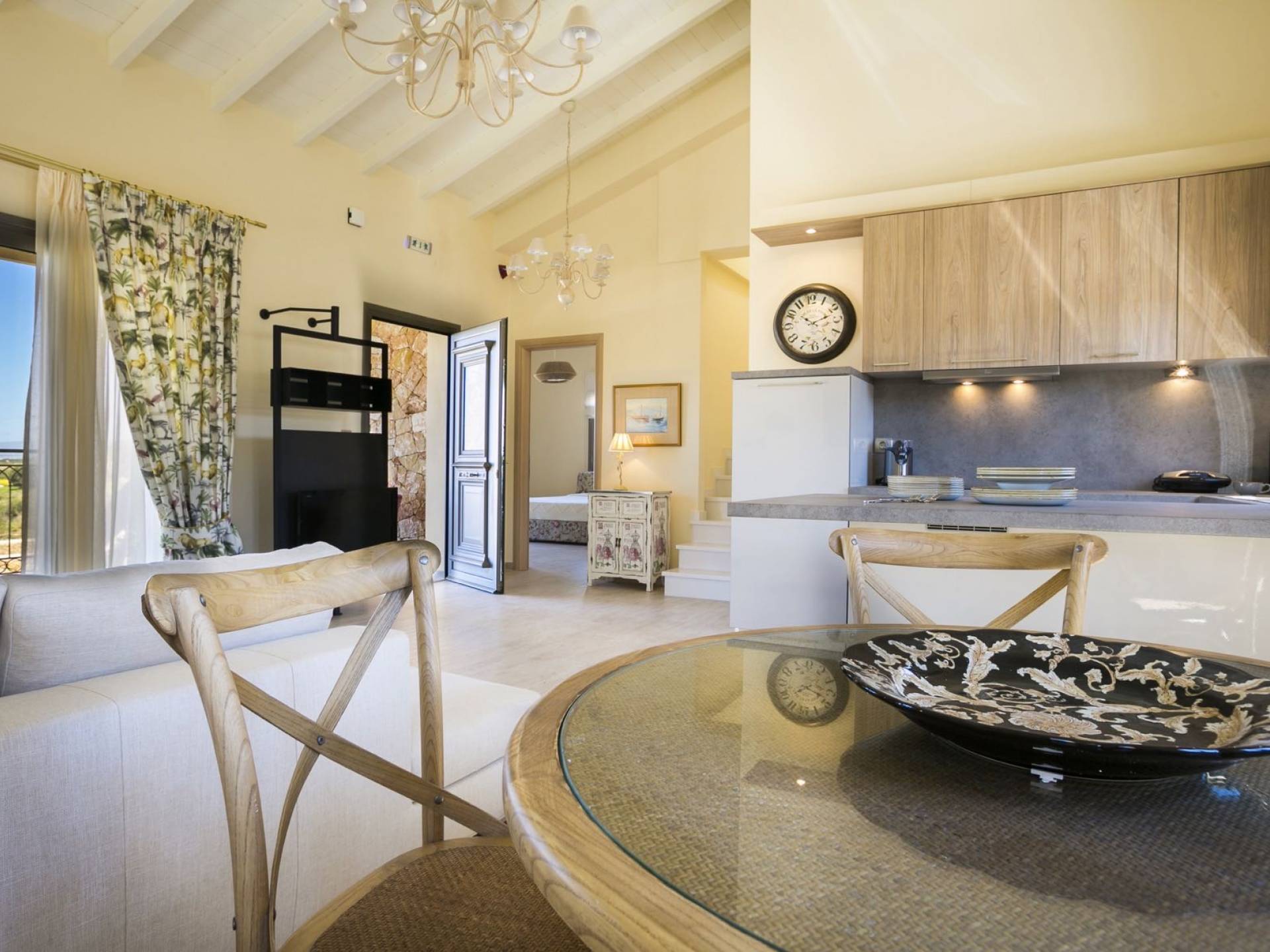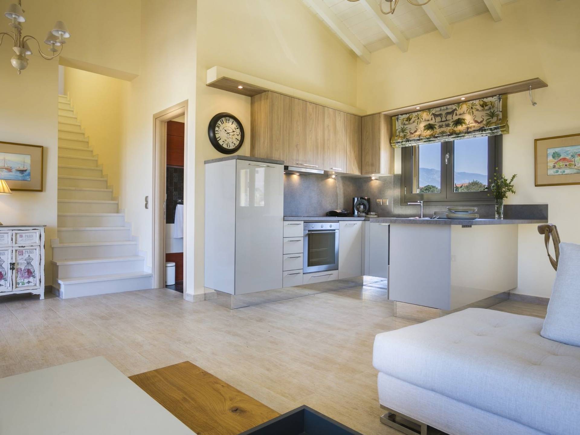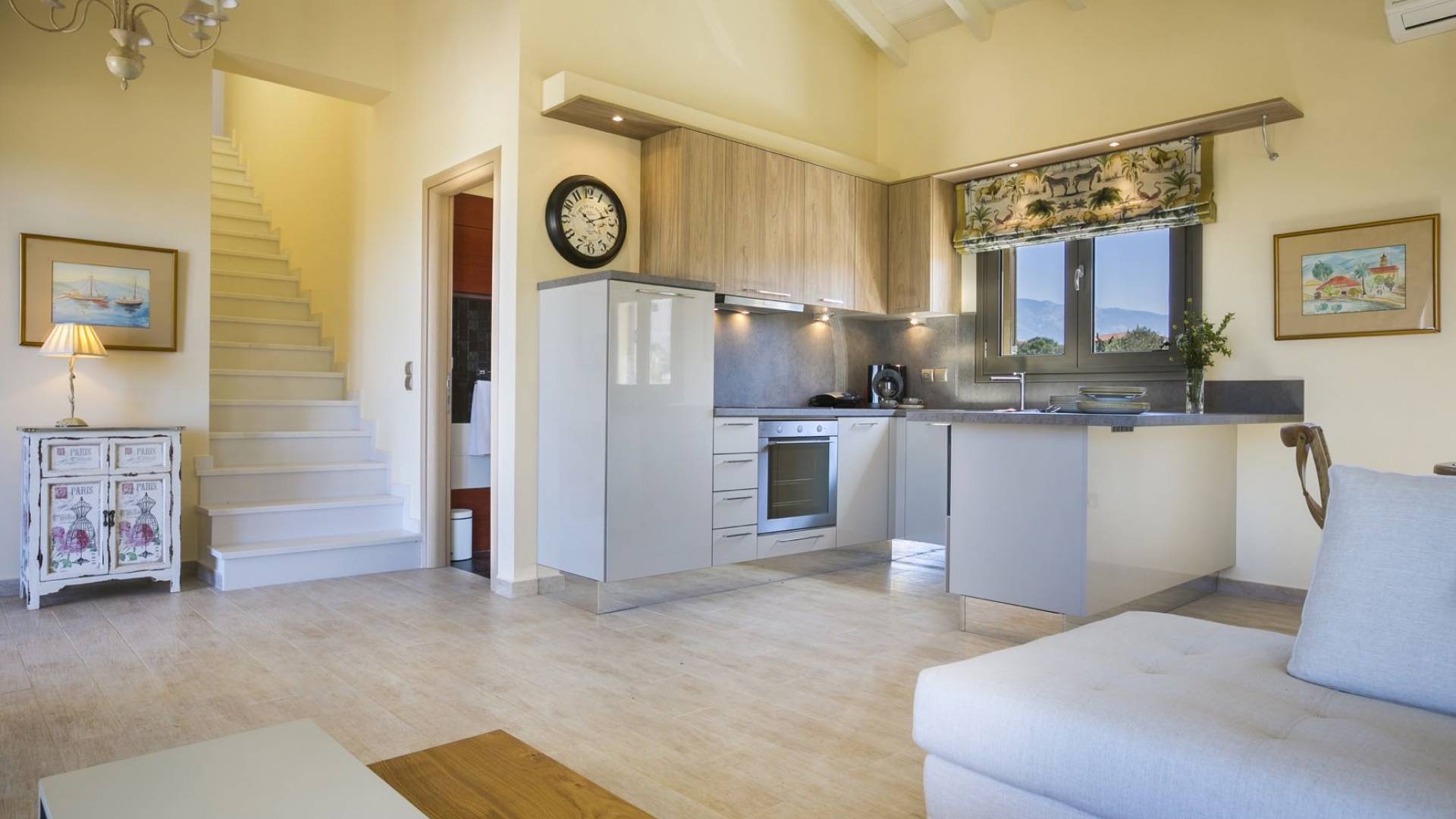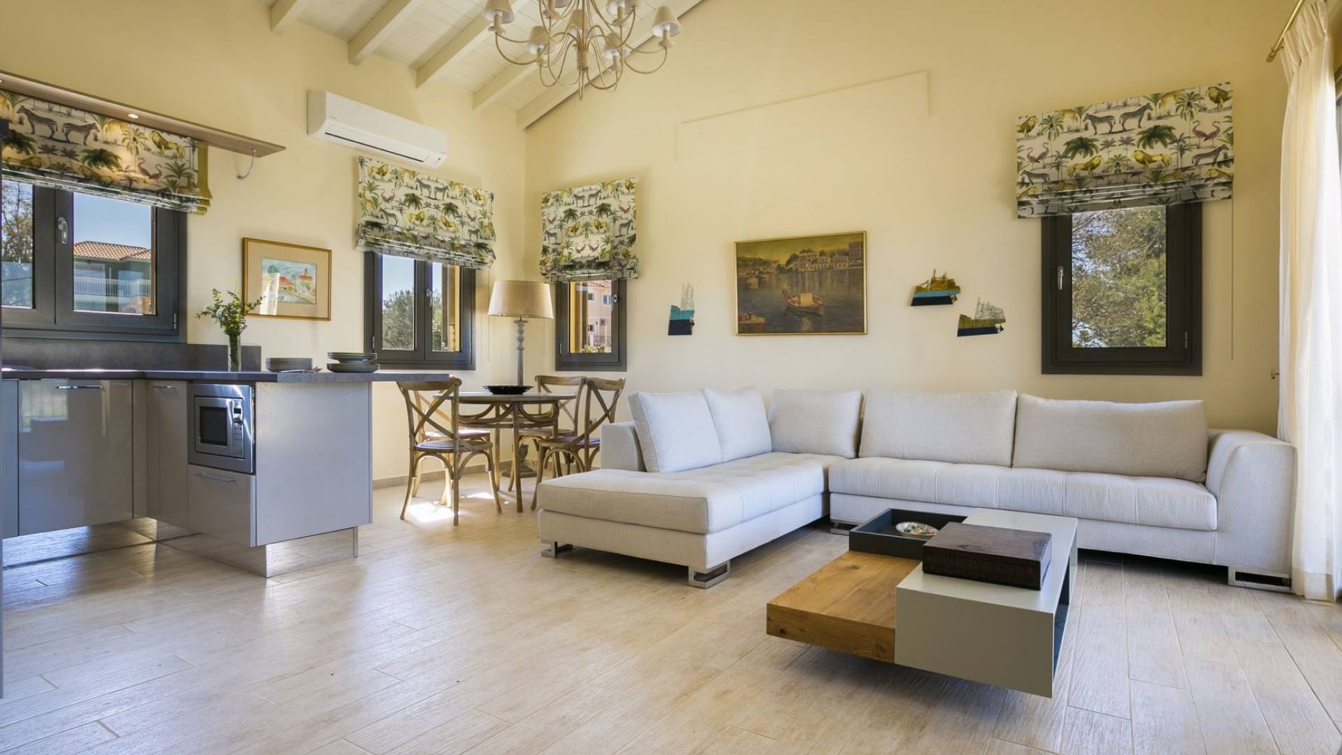 Neutral tones, refined finishes, and an open-plan layout give the interiors of the villa a uniquely Kefalonian elegance. Hues of sand, taupe, and cream are paired with light grey details, and stately columns define the free-flowing rooms. Artwork in the living and dining rooms vividly depicts island life & wildlife, while tiles, paintings, and upholstery add flashes of floral color to all spaces. The fully equipped kitchen is a cook’s dream!