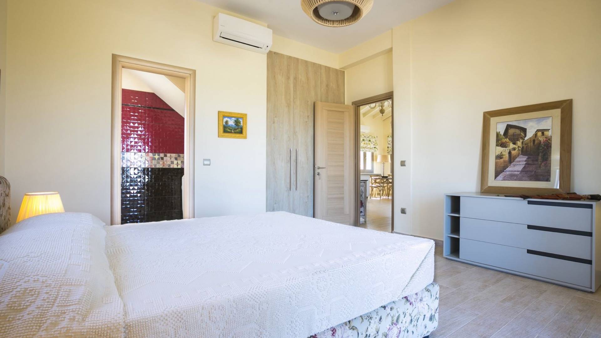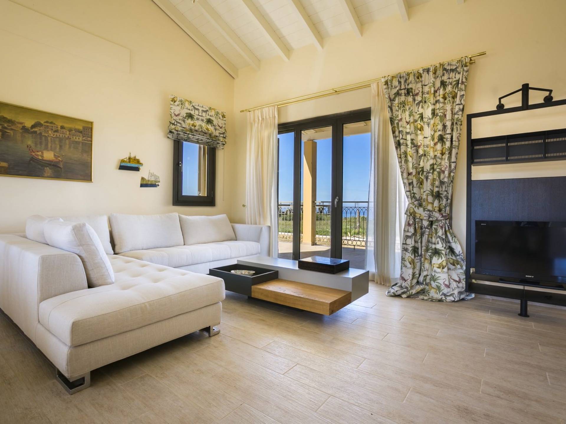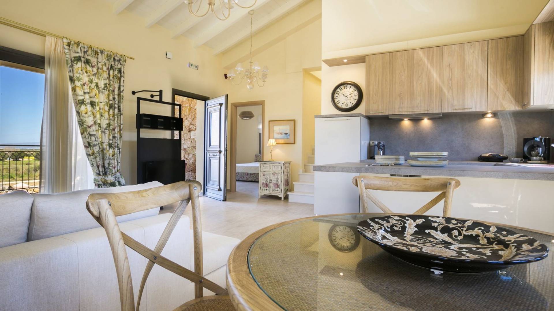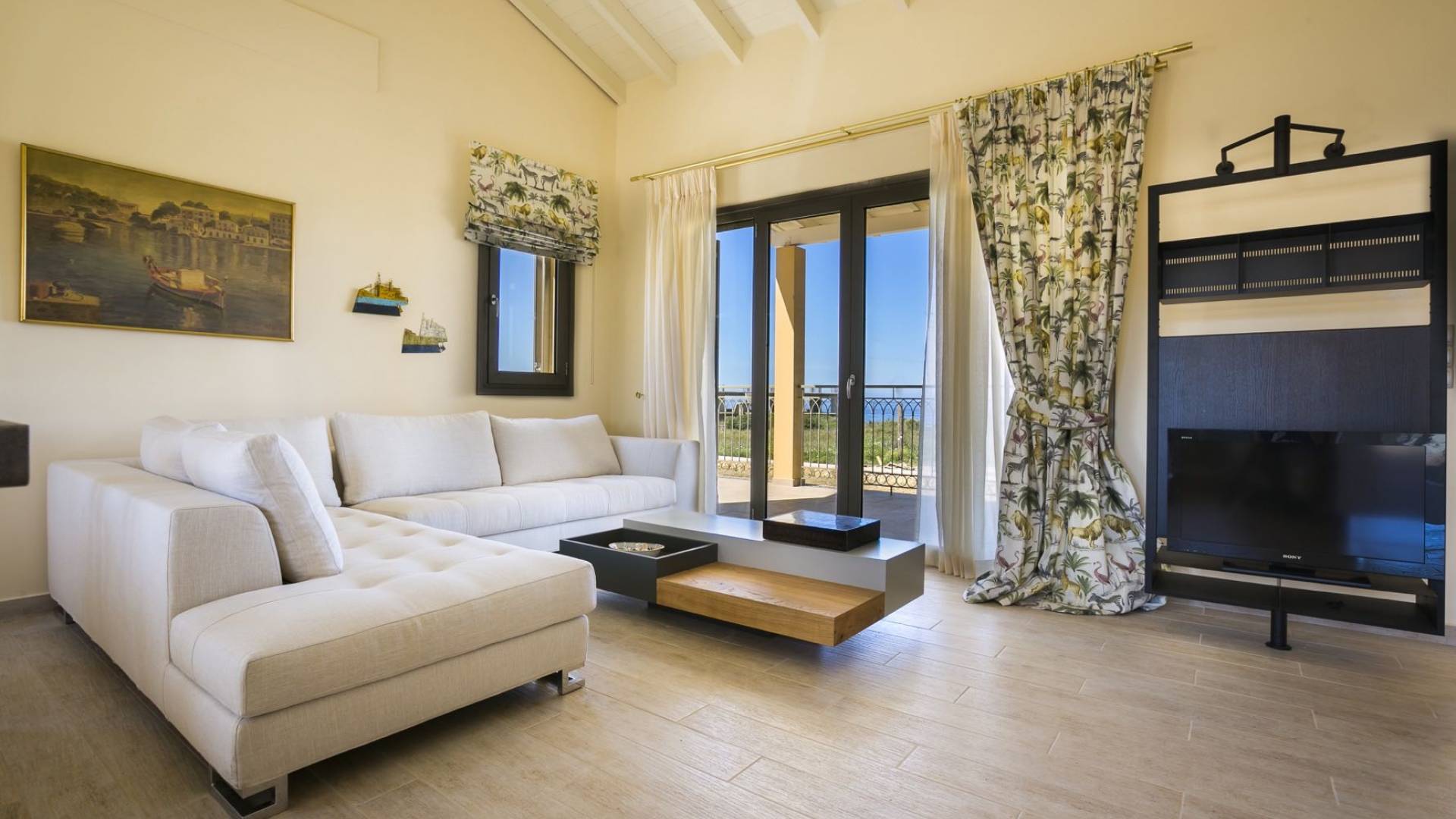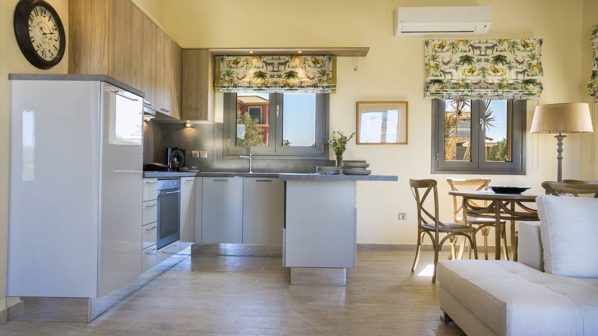 Neutral tones, refined finishes, and an open-plan layout give the interiors of the villa a uniquely Kefalonian elegance. Hues of sand, taupe, and cream are paired with light grey details, and stately columns define the free-flowing rooms. Artwork in the living and dining rooms vividly depicts island life & wildlife, while tiles, paintings, and upholstery add flashes of floral color to all spaces. The fully equipped kitchen is a cook’s dream!