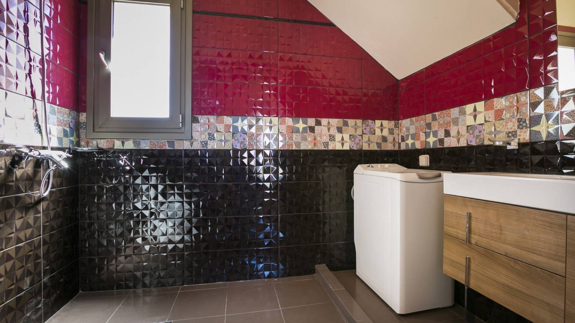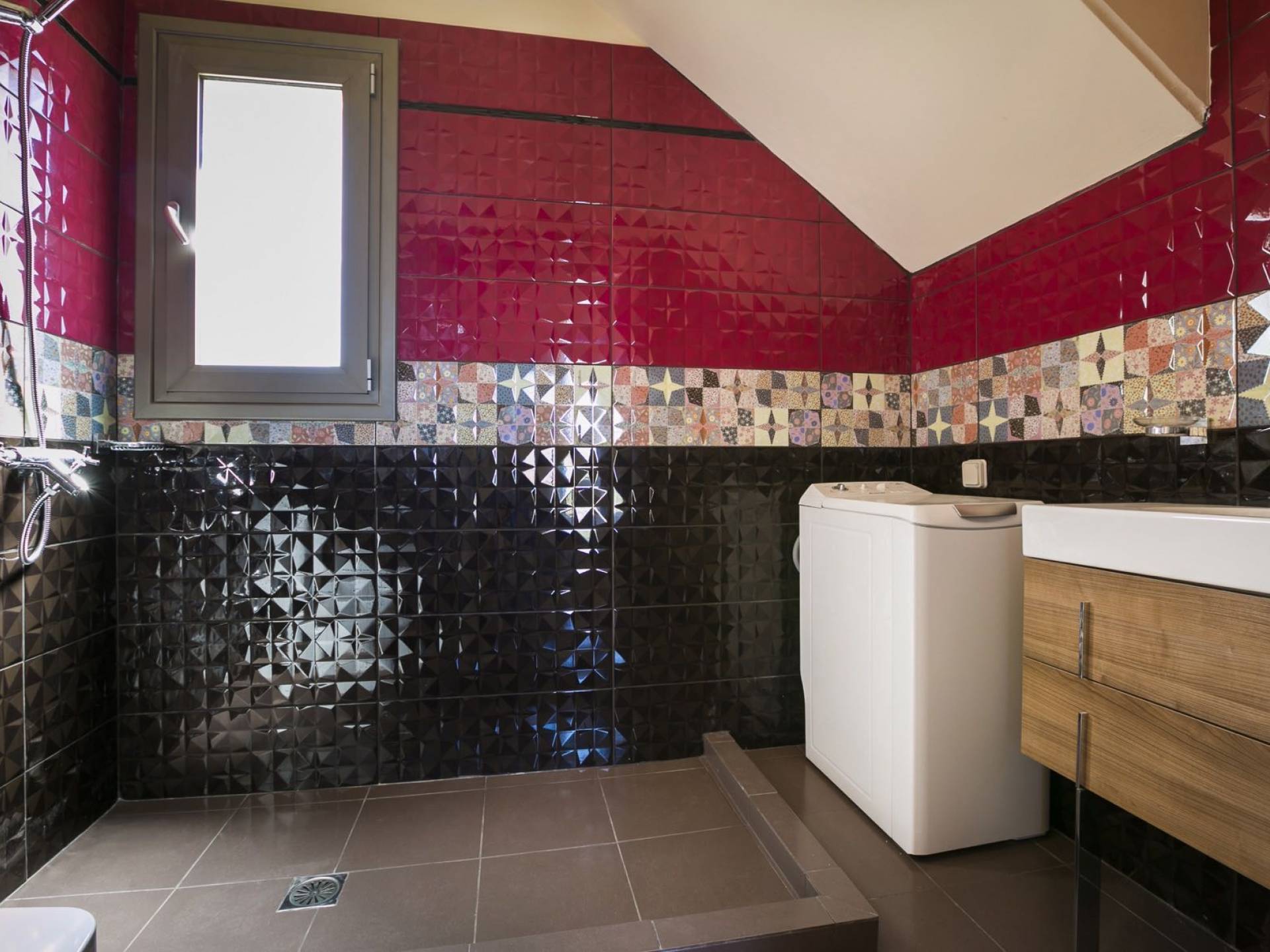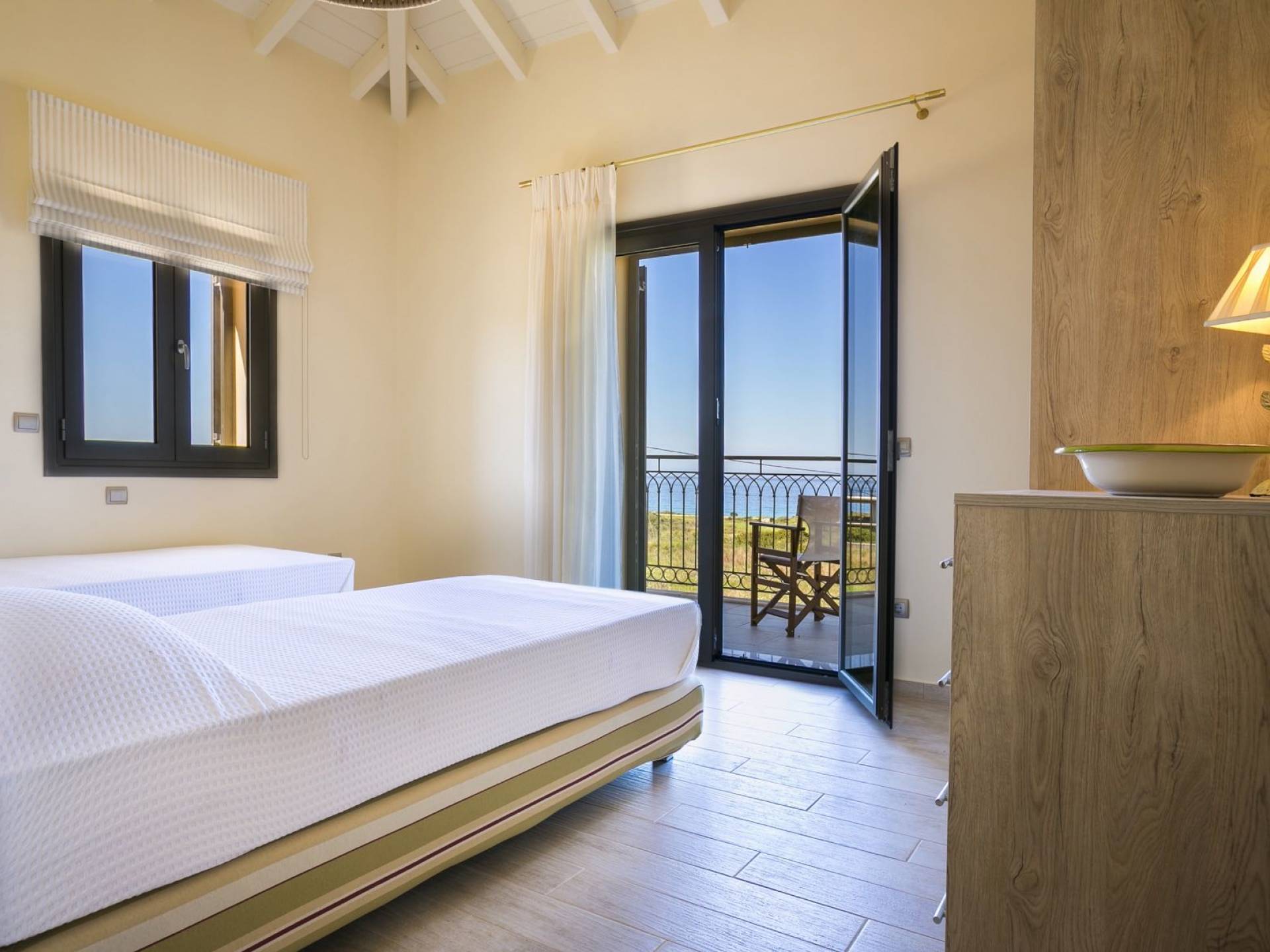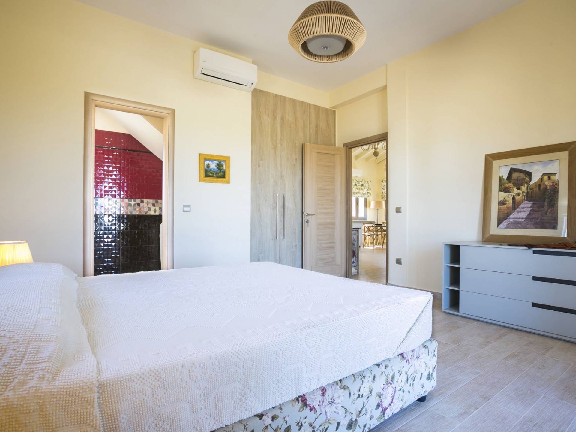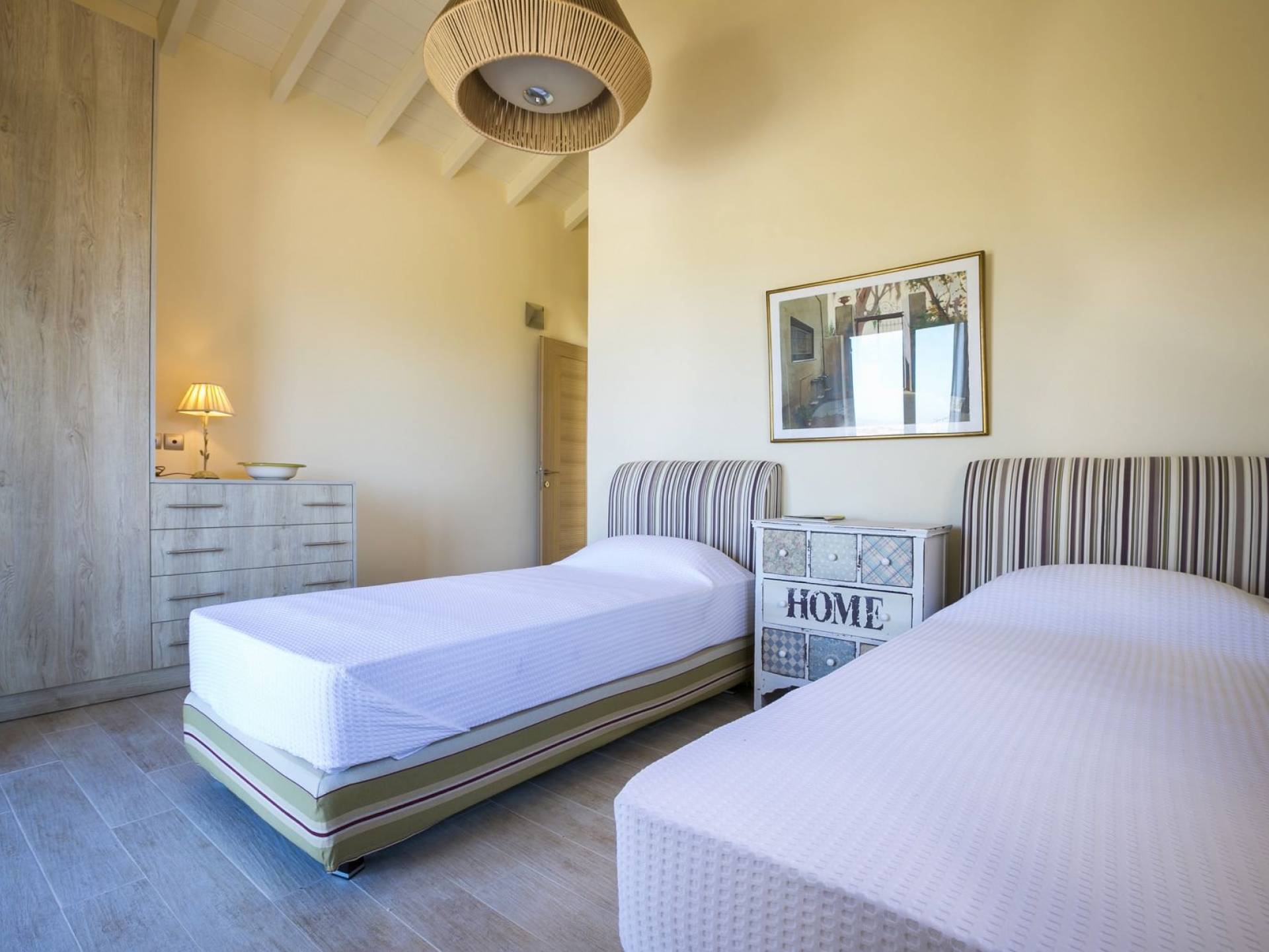 Neutral tones, refined finishes, and an open-plan layout give the interiors of the villa a uniquely Kefalonian elegance. Hues of sand, taupe, and cream are paired with light grey details, and stately columns define the free-flowing rooms. Artwork in the living and dining rooms vividly depicts island life & wildlife, while tiles, paintings, and upholstery add flashes of floral color to all spaces. The fully equipped kitchen is a cook’s dream!