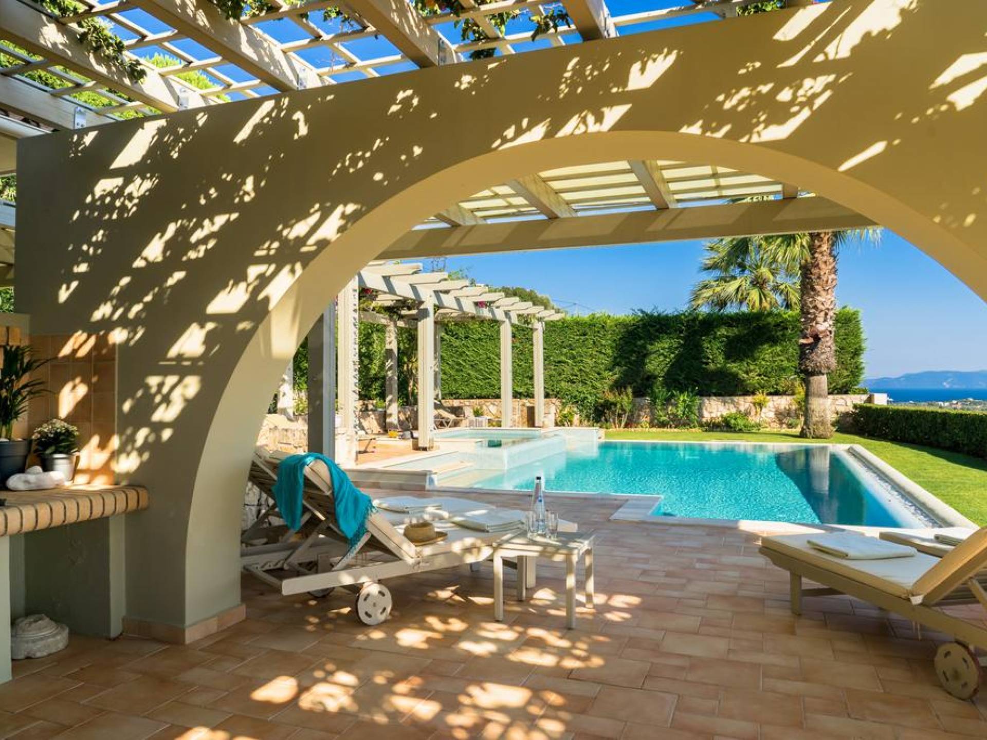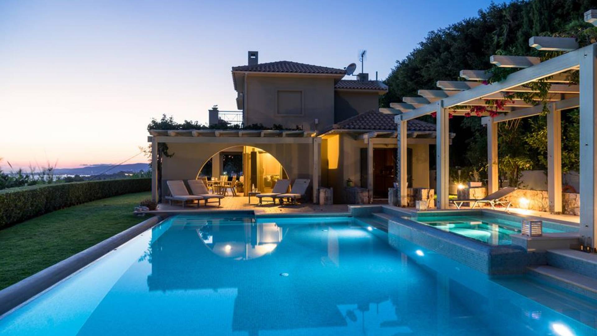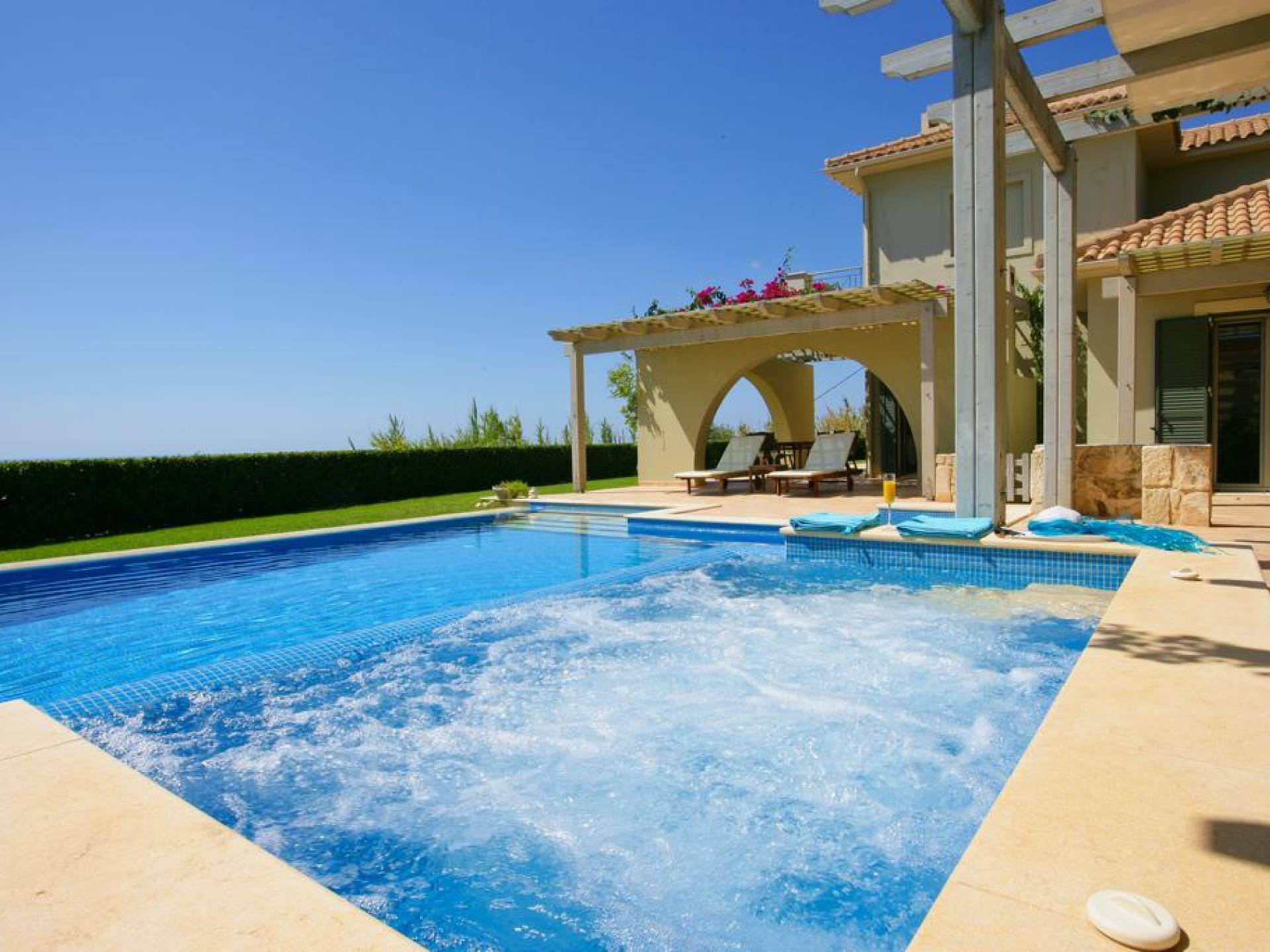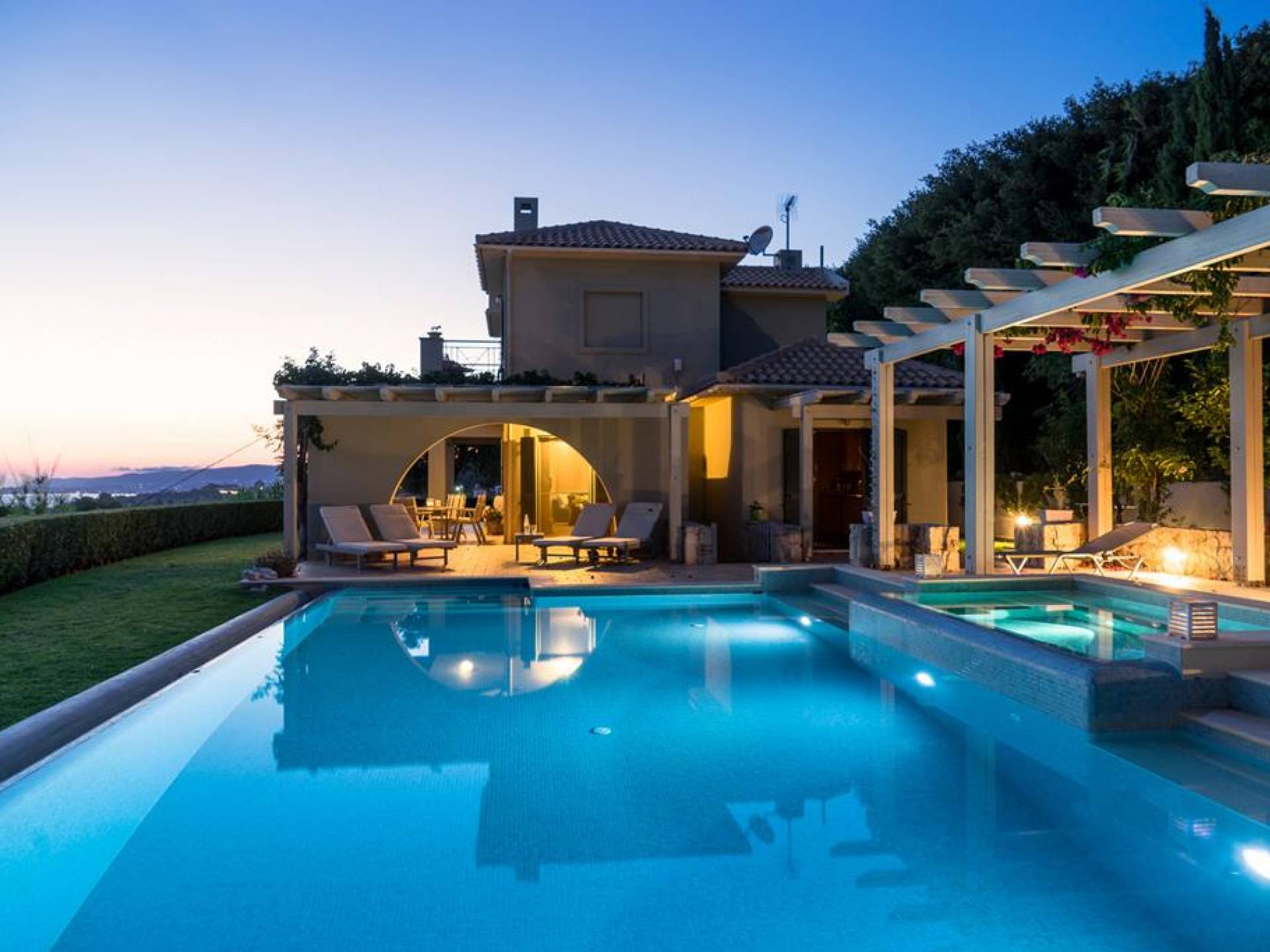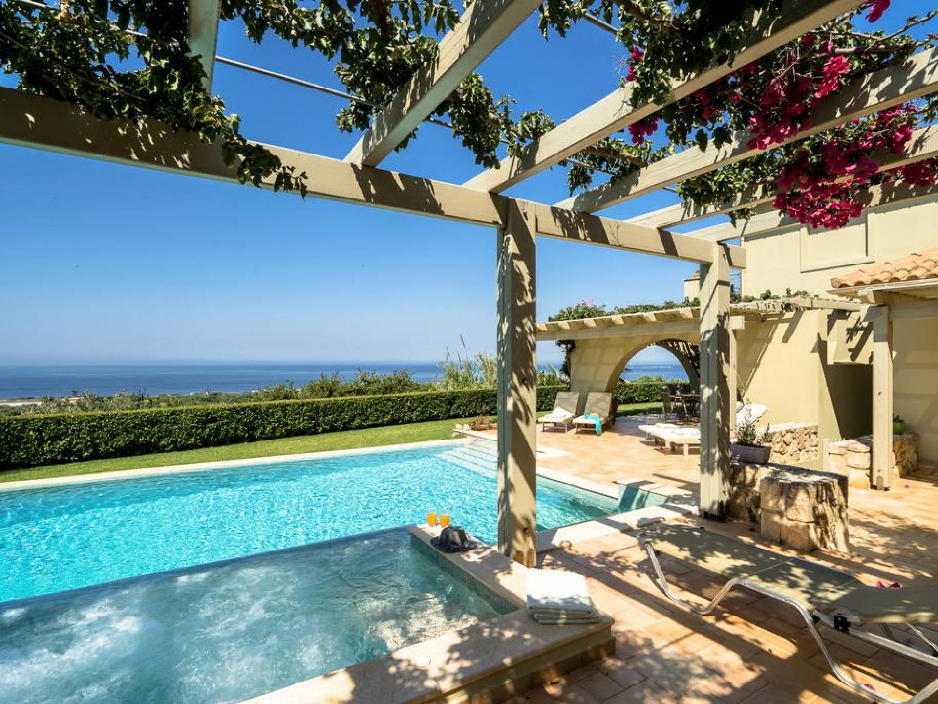Villa Alexandra Kefalonia is a luxury villa rental consisting of 3 bedrooms, 3 bathrooms, a private heated pool of 45m2 with a Jacuzzi, and can accommodate up to 6 guests.