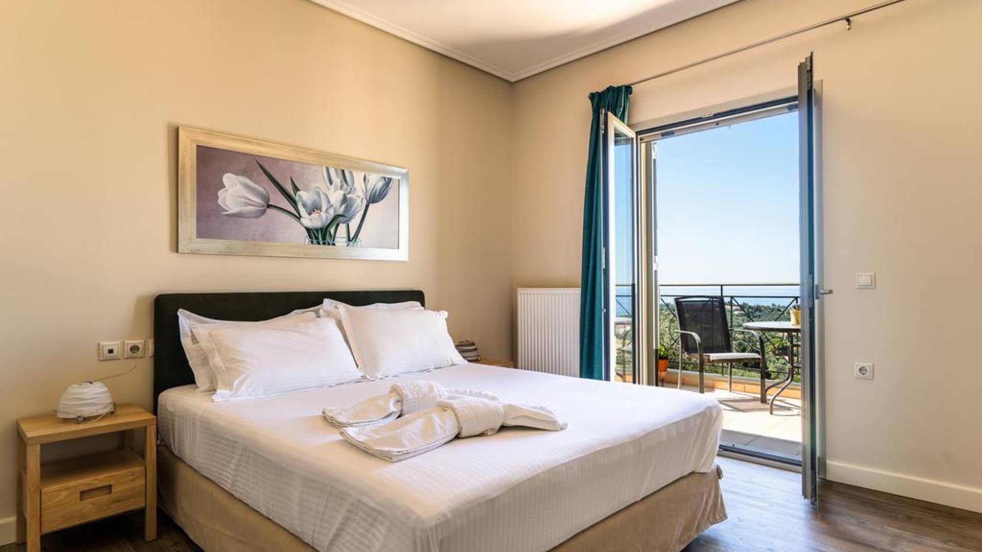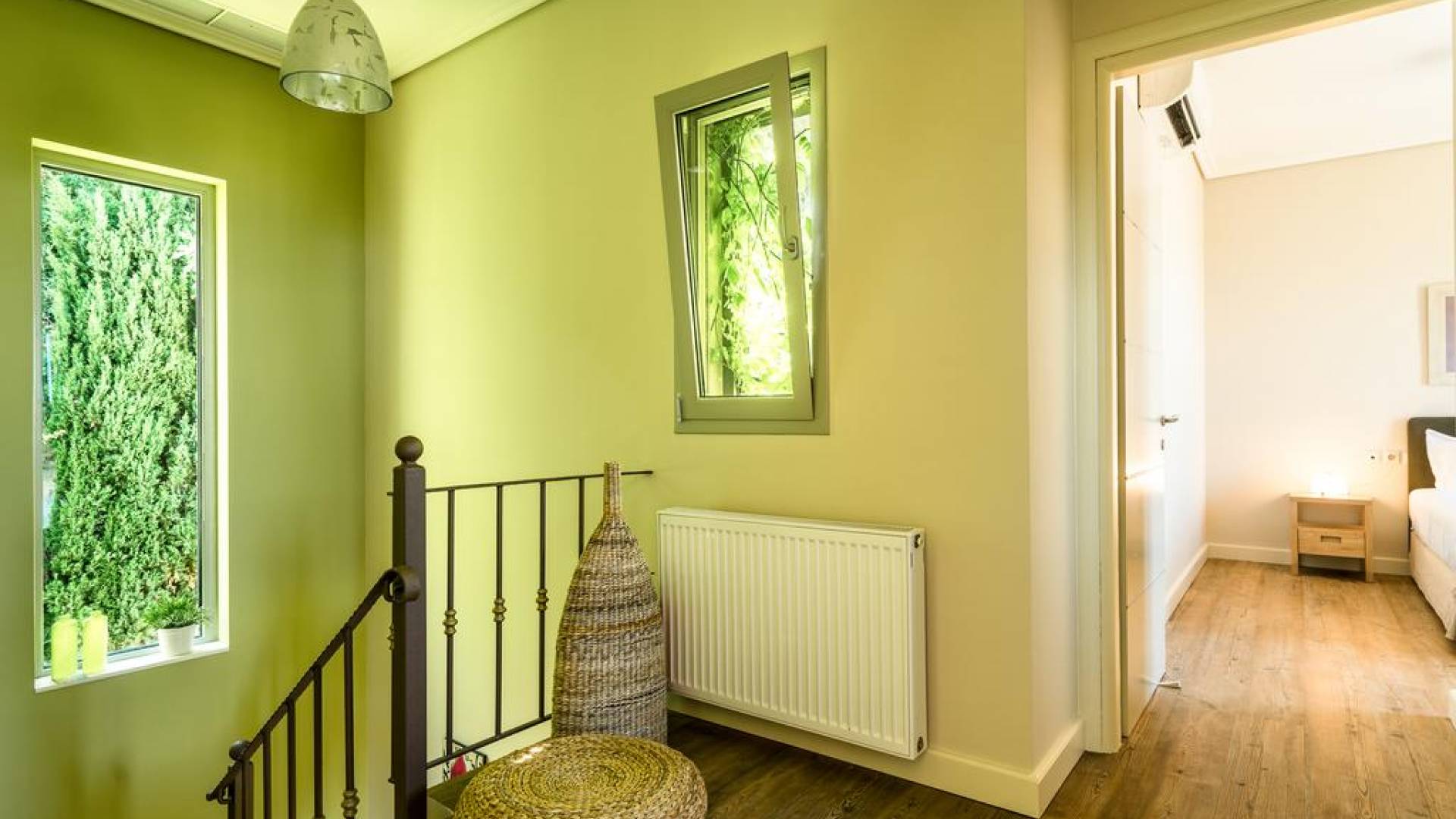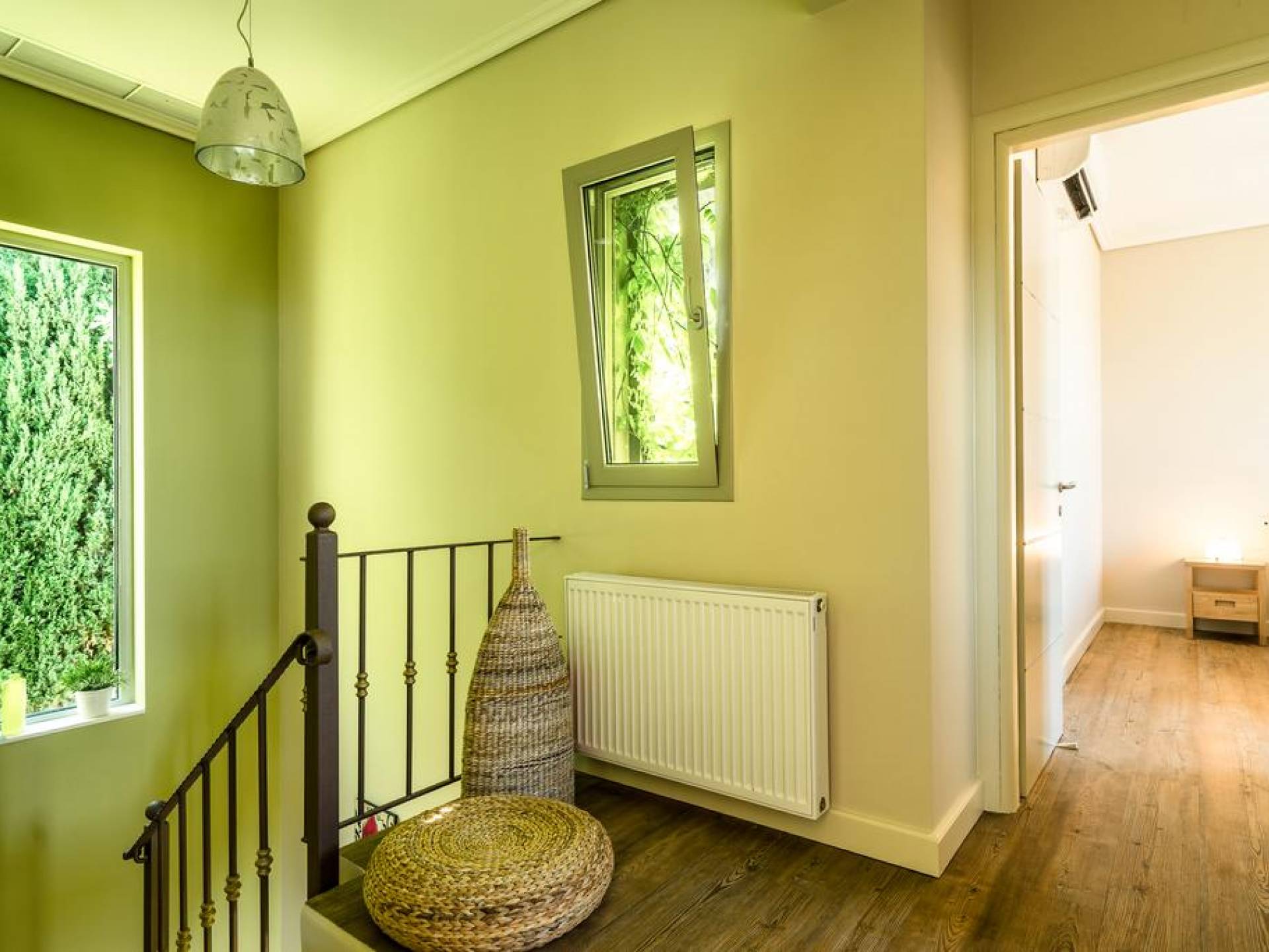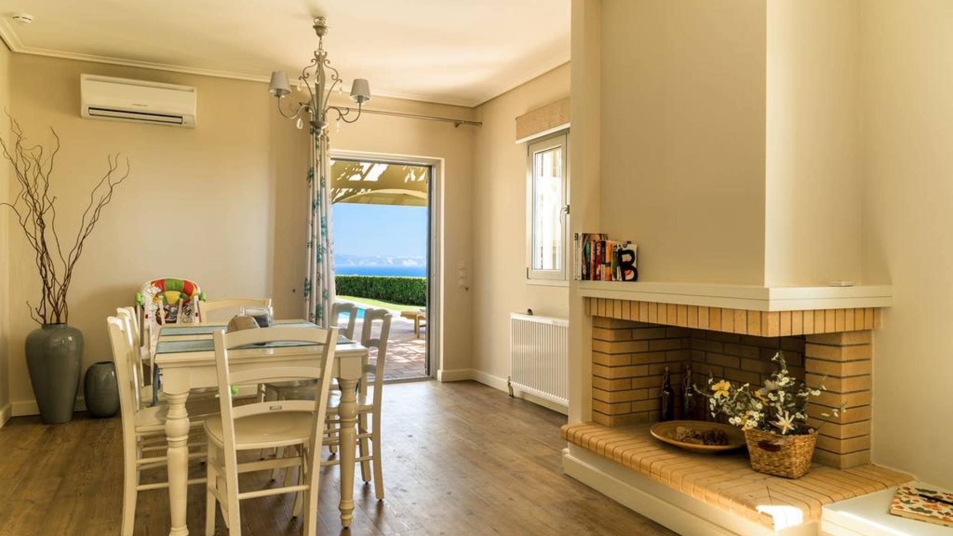 The lower floor of Villa Alexandra offers a two beds bedroom with a bathroom and benefits the advantage of a private entrance with steps that lead directly to the garden and pool. The ground floor offers a cozy living/ dining room with satellite TV, DVD, and fireplace. The fully fitted kitchen with hob, oven, fridge/freezer, microwave, dishwasher, and coffee maker benefits from its secluded space with its own patio door right next to the BBQ. All openings lead directly to the fully landscaped garden and the pool. Marble stairs take you to the upper floor which comprises two double bedrooms with a bathroom and balconies all around. Villa Alexandra is intended for private use and is ideal for friends and large families.