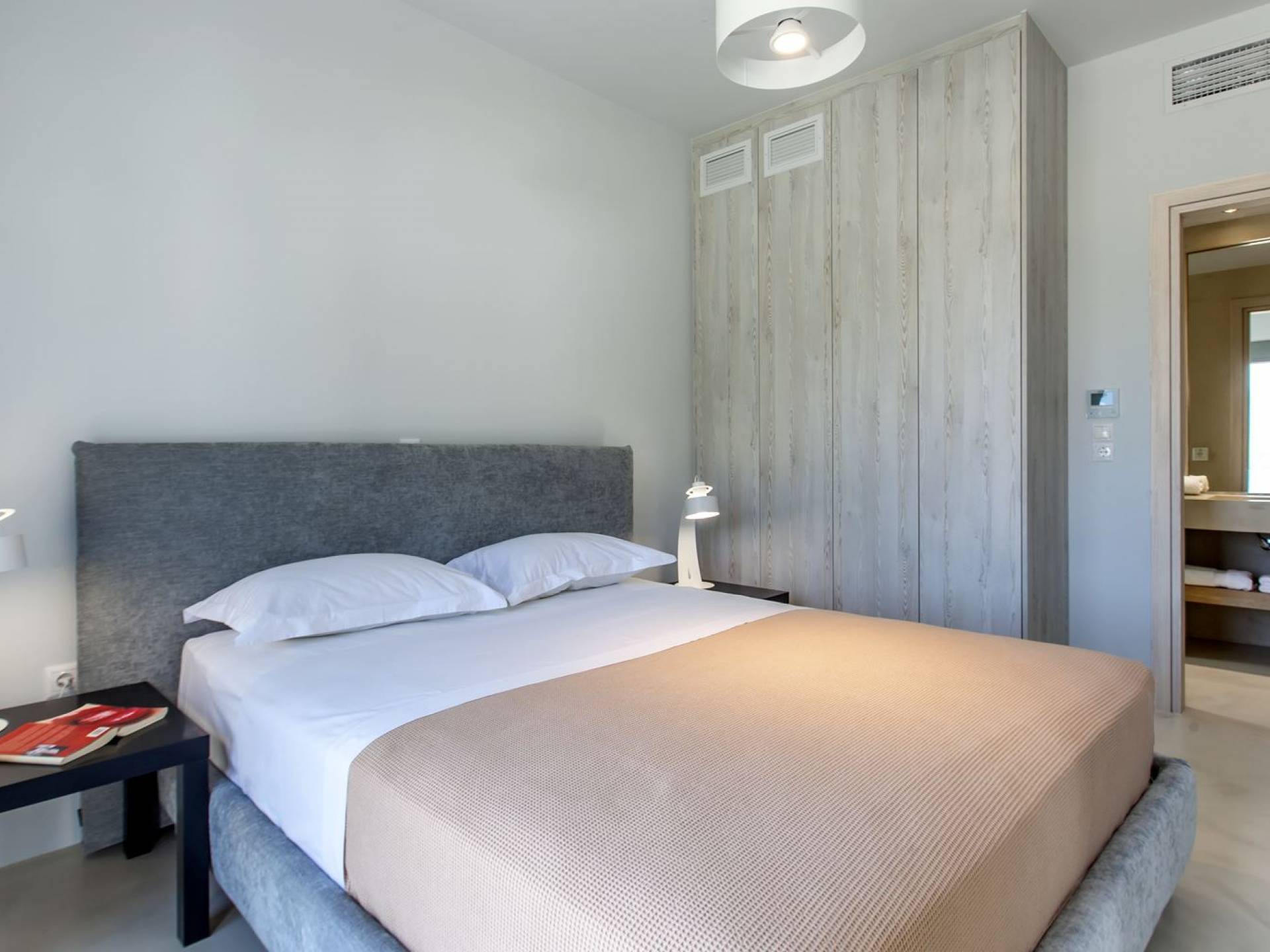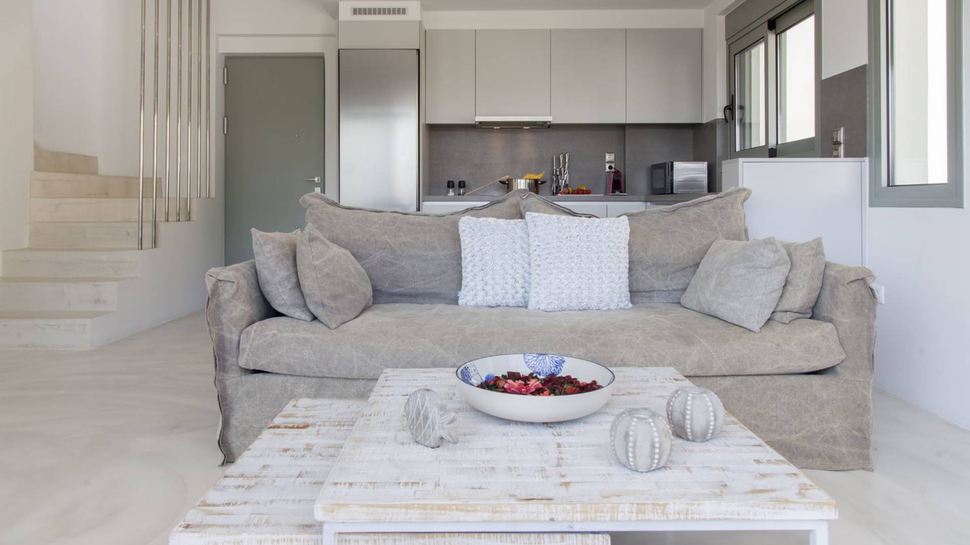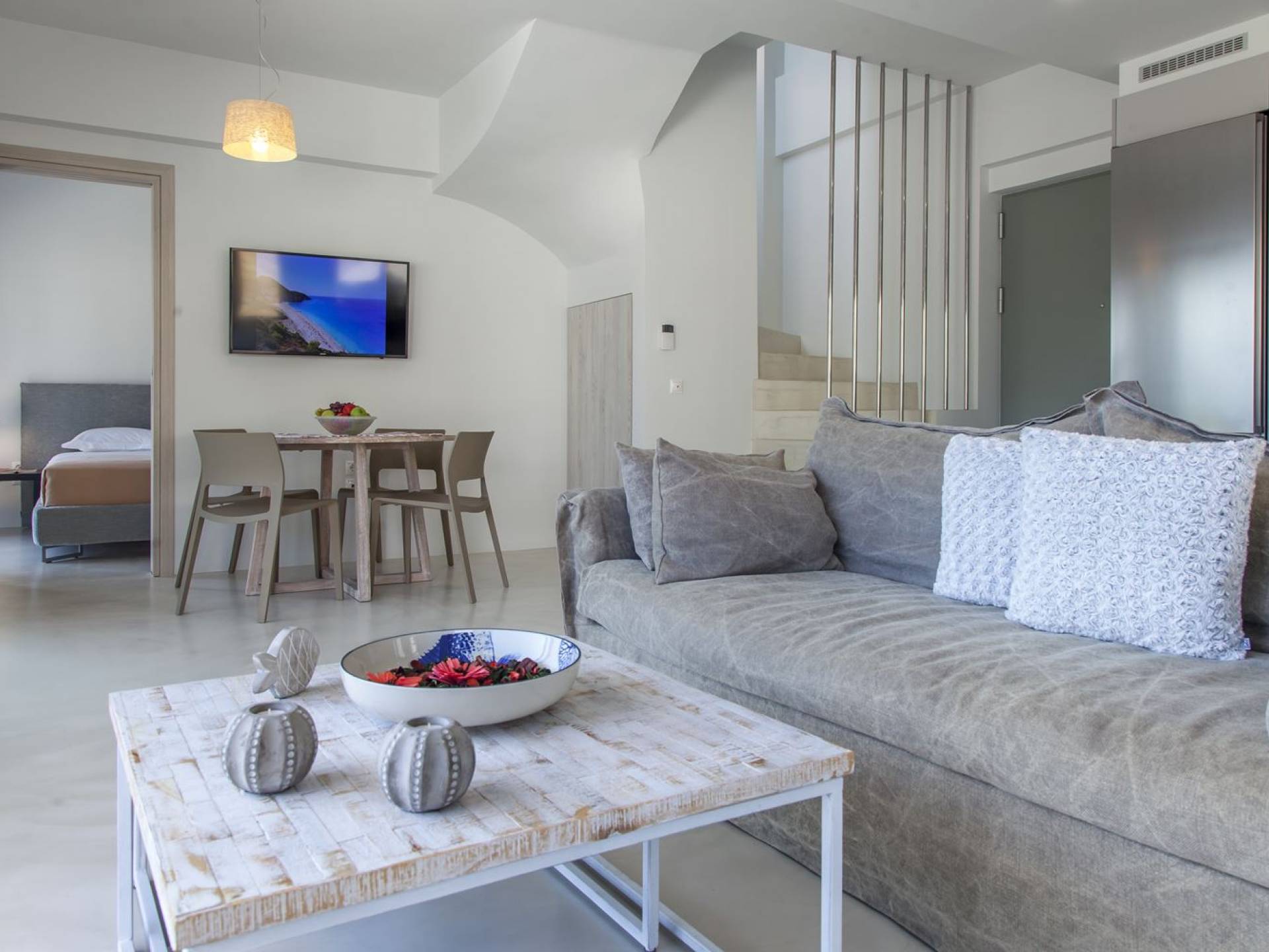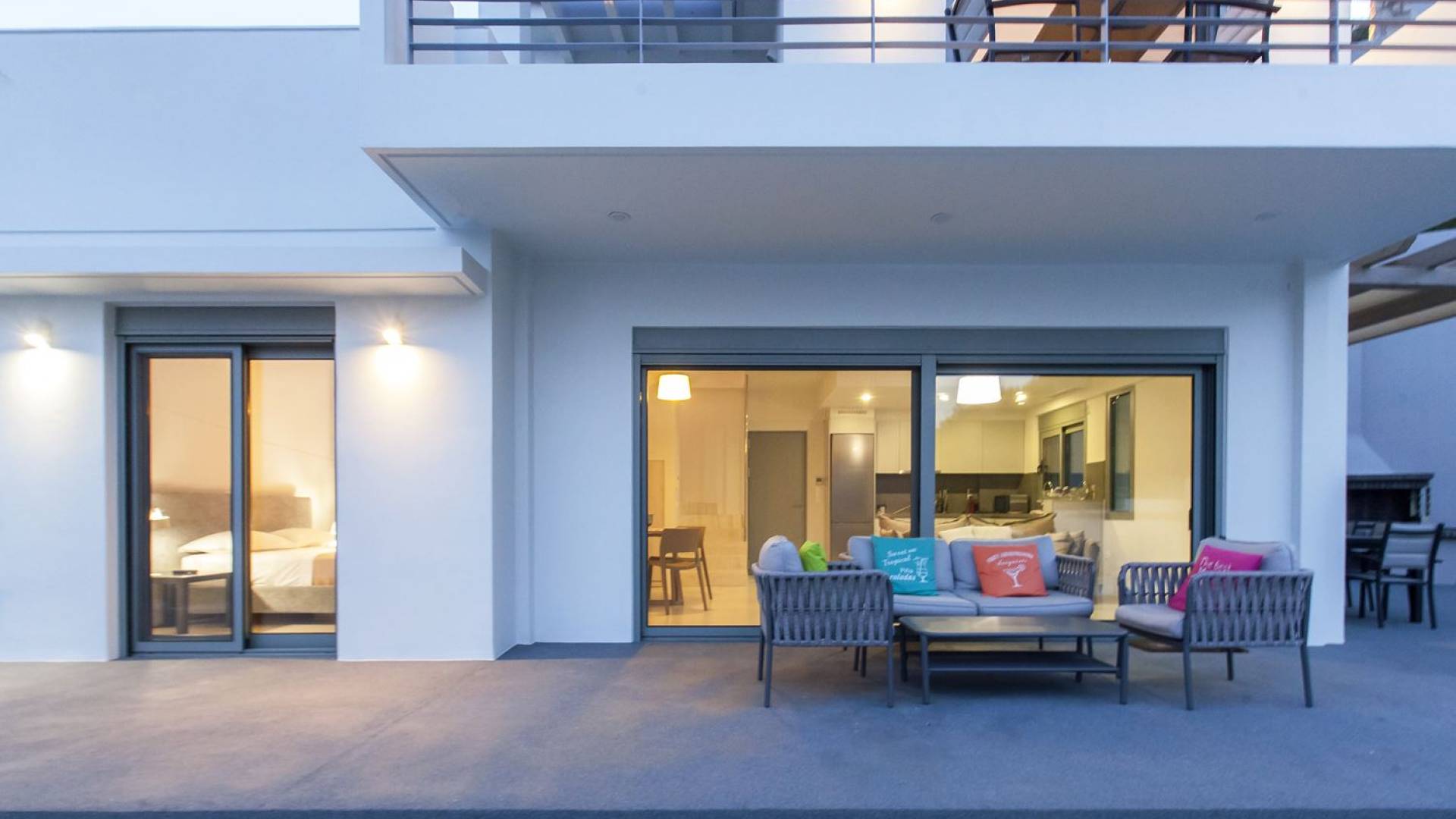 Villa Erato is contracted in two levels, ground floor, and 1st floor. On the ground floor, there is a living room with a modern sofa, a dining table for four persons, a TV set, and functional small furniture to ensure comfortable accommodation. There is also a wireless internet connection. The fully equipped kitchen can satisfy even the most demanding guest, offering a fridge, dishwasher and washing machine, microwave oven, toaster, kettle, espresso coffee machine, vacuum cleaner, modern crockery and glasses, and all the facilities that fully complete house equipment.