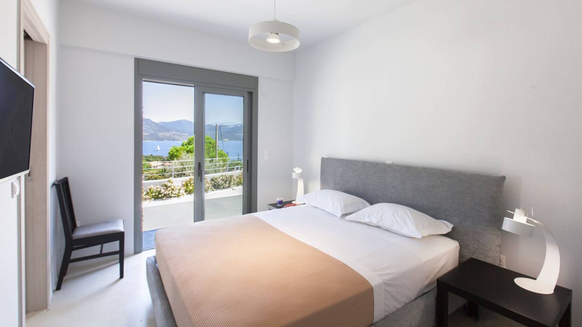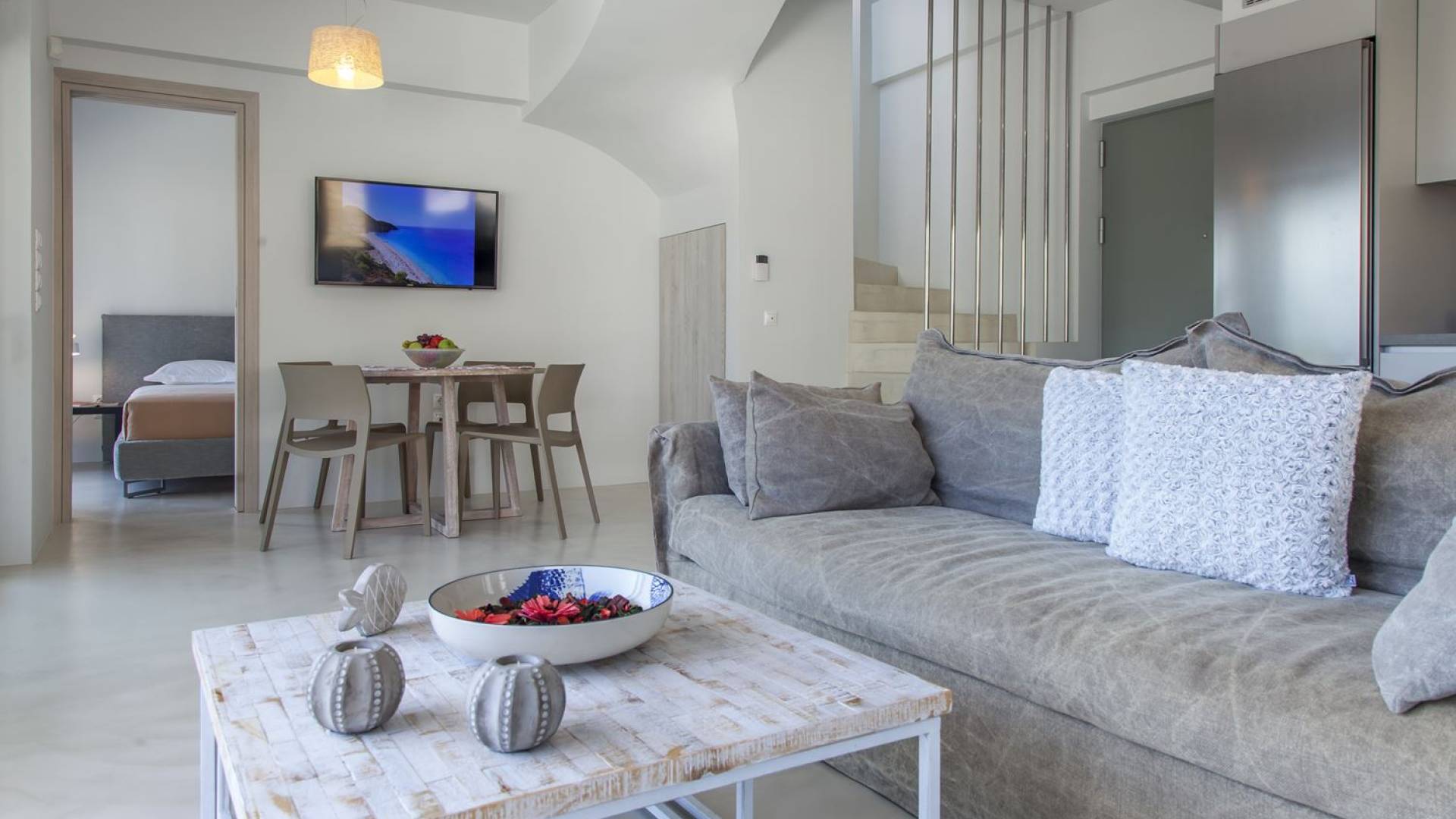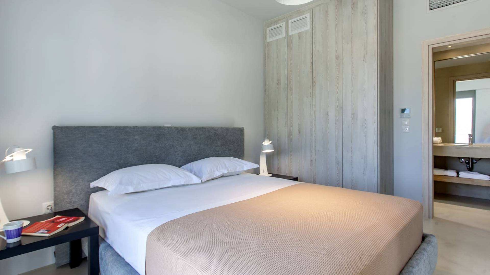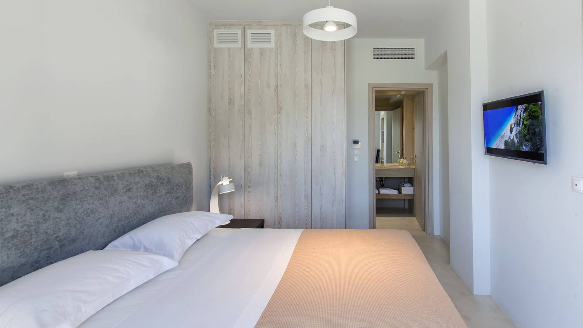 Villa Erato is contracted in two levels, ground floor, and 1st floor. On the ground floor, there is a living room with a modern sofa, a dining table for four persons, a TV set, and functional small furniture to ensure comfortable accommodation. There is also a wireless internet connection. The fully equipped kitchen can satisfy even the most demanding guest, offering a fridge, dishwasher and washing machine, microwave oven, toaster, kettle, espresso coffee machine, vacuum cleaner, modern crockery and glasses, and all the facilities that fully complete house equipment.