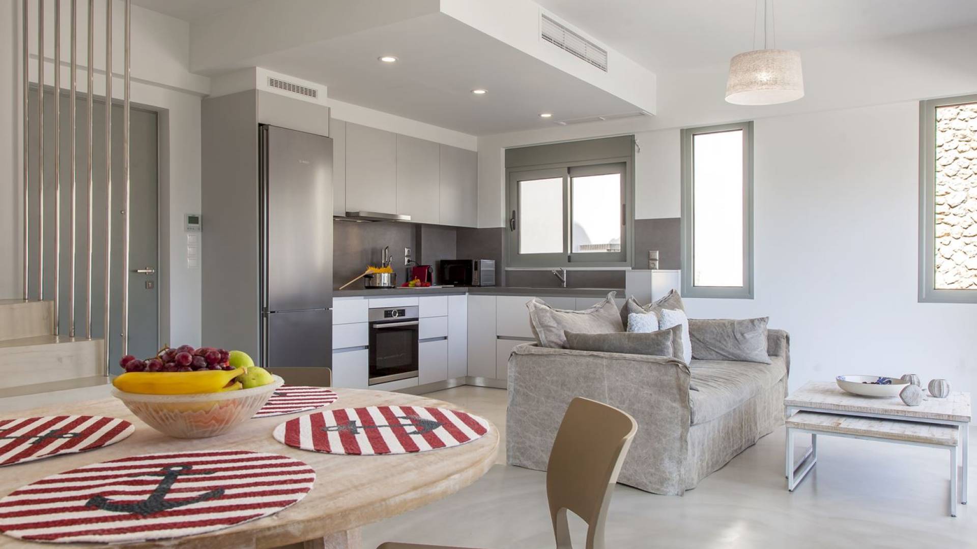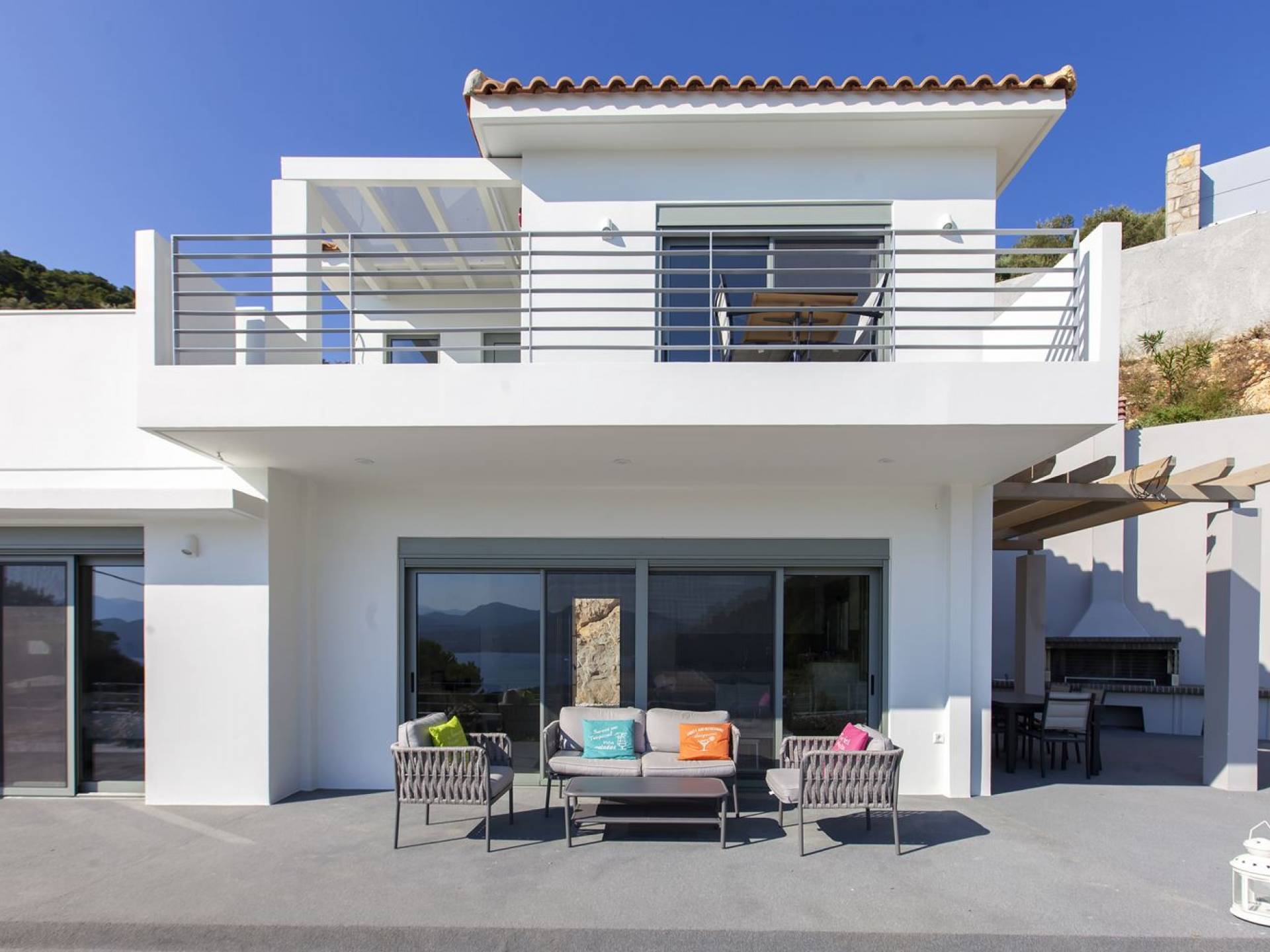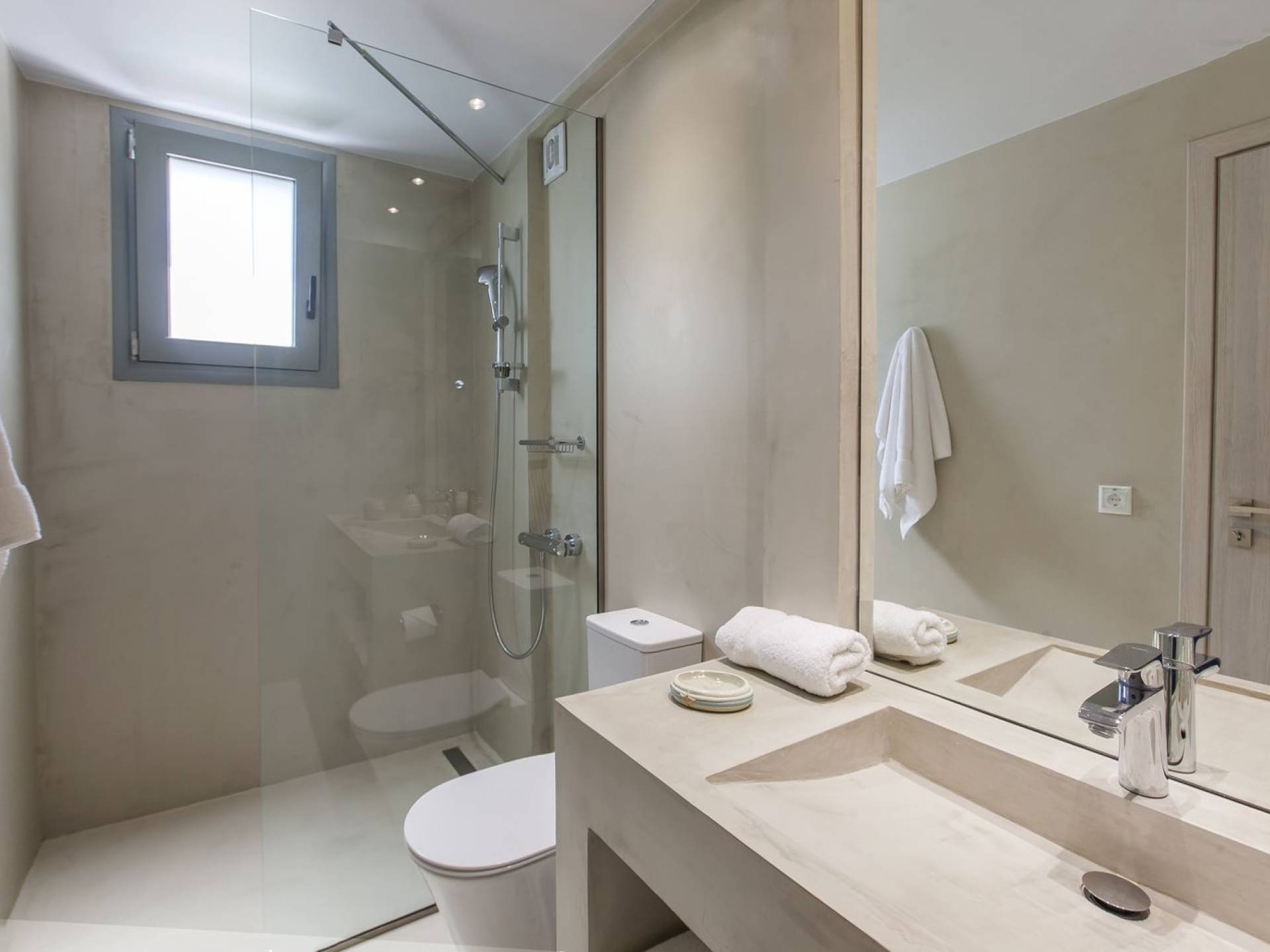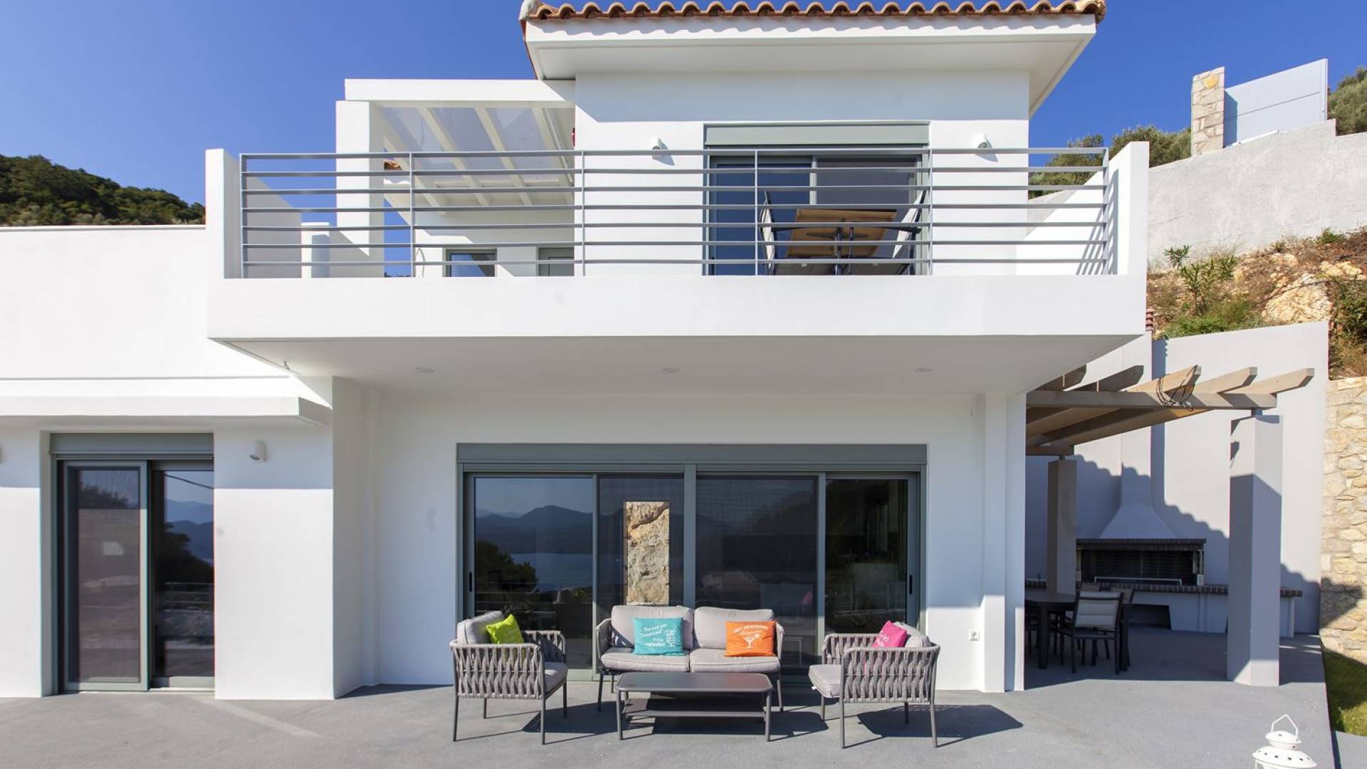 Villa Erato is contracted in two levels, ground floor, and 1st floor. On the ground floor, there is a living room with a modern sofa, a dining table for four persons, a TV set, and functional small furniture to ensure comfortable accommodation. There is also a wireless internet connection. The fully equipped kitchen can satisfy even the most demanding guest, offering a fridge, dishwasher and washing machine, microwave oven, toaster, kettle, espresso coffee machine, vacuum cleaner, modern crockery and glasses, and all the facilities that fully complete house equipment.