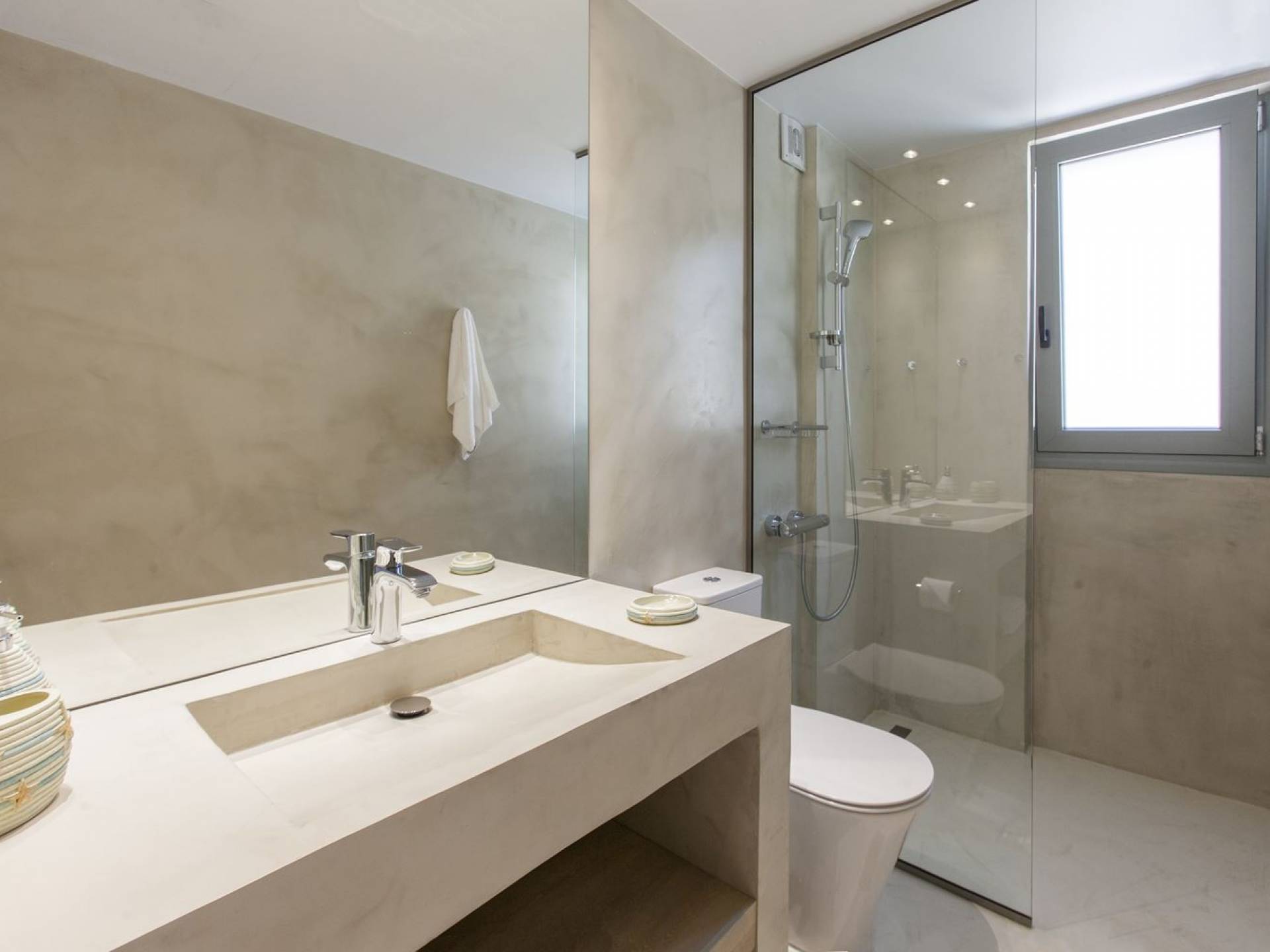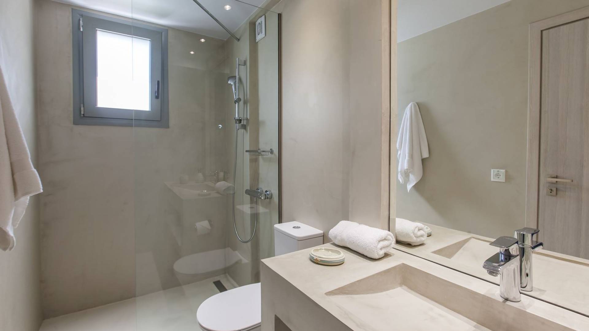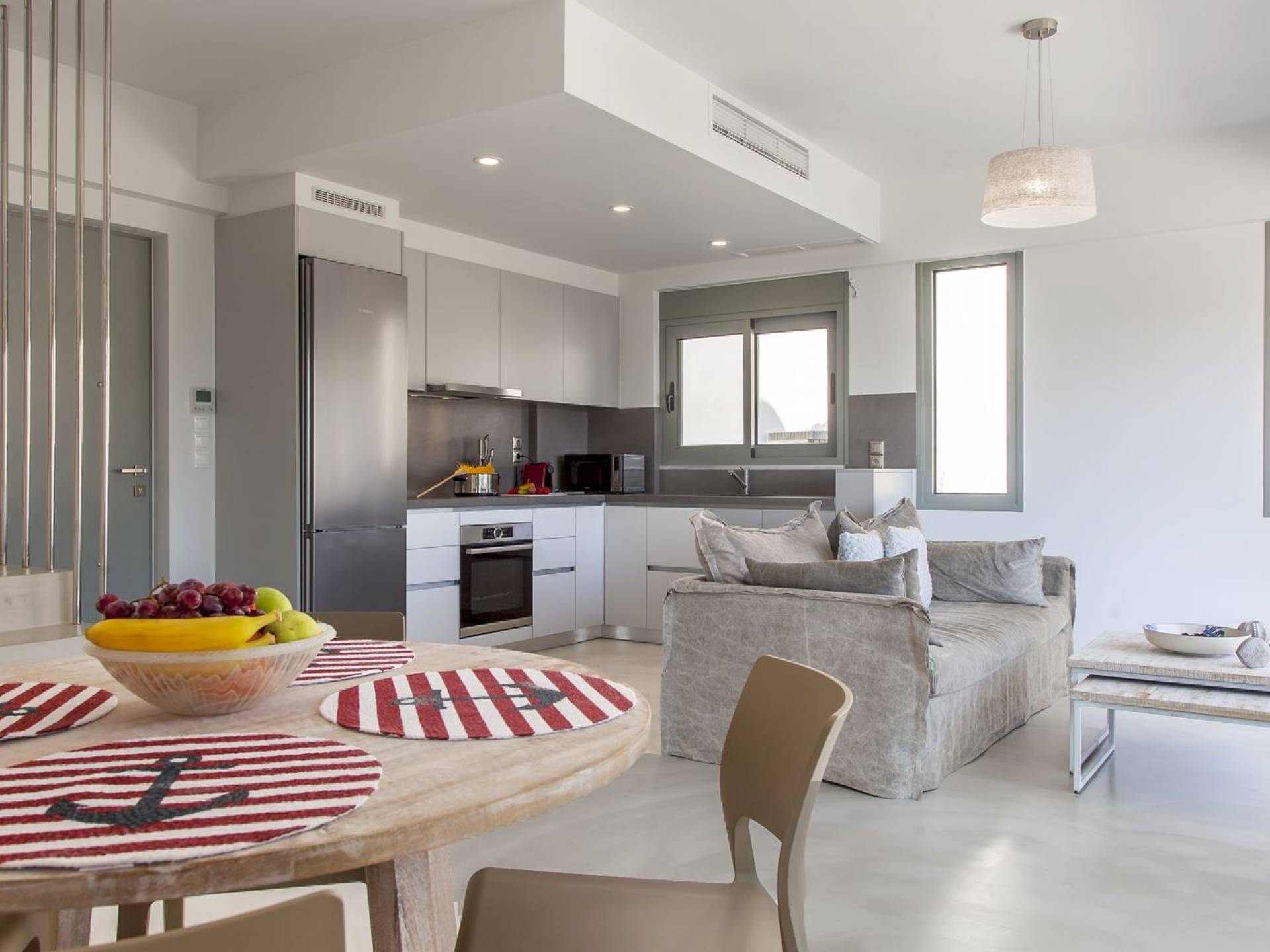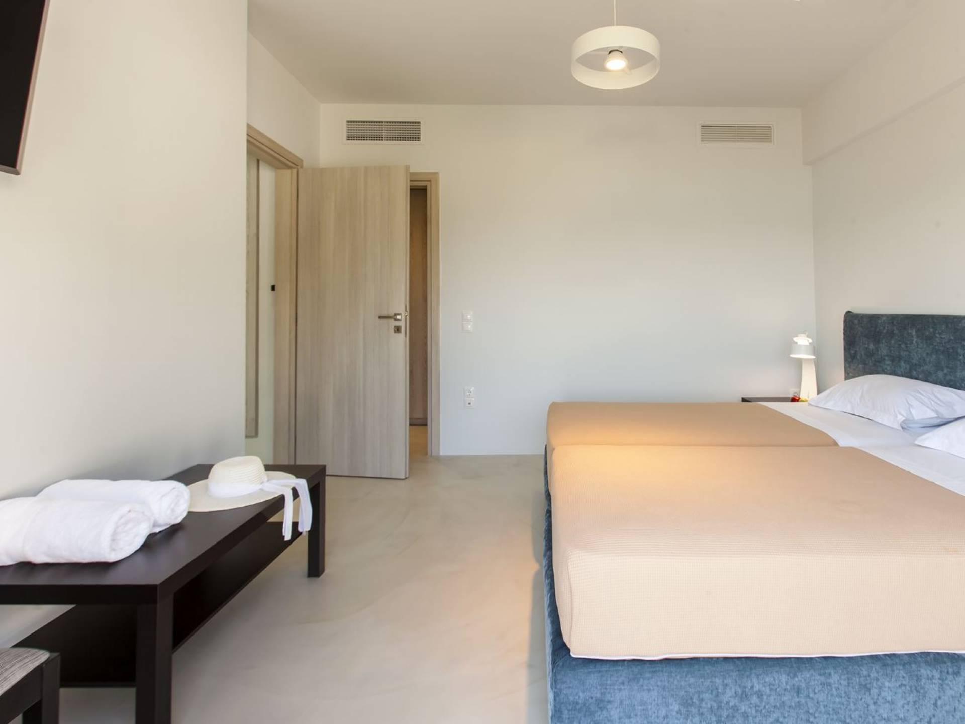 Villa Erato is contracted in two levels, ground floor, and 1st floor. On the ground floor, there is a living room with a modern sofa, a dining table for four persons, a TV set, and functional small furniture to ensure comfortable accommodation. There is also a wireless internet connection. The fully equipped kitchen can satisfy even the most demanding guest, offering a fridge, dishwasher and washing machine, microwave oven, toaster, kettle, espresso coffee machine, vacuum cleaner, modern crockery and glasses, and all the facilities that fully complete house equipment.