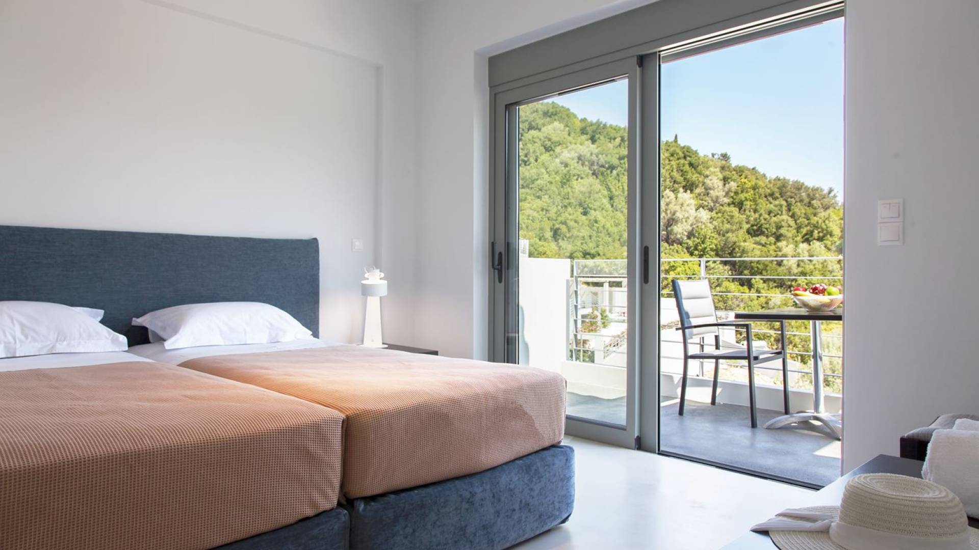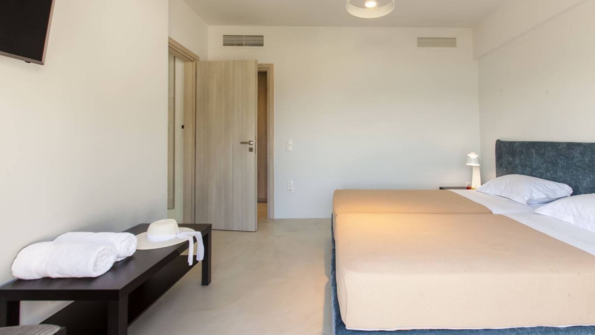 On the ground floor, there is a bedroom with a big double bed, fantastic view of the sea, private toilet with shower, offering cosmetic products for personal hygiene and a hairdryer. On the first floor, there is a bedroom with two single beds, a TV set, a private toilet with a shower, and cosmetic products for personal hygiene. Both levels have big openings to the surrounding environment, which offer an unobstructed view to the majestic view from the inner part of the house. The feeling of direct contact with nature is amazing.
