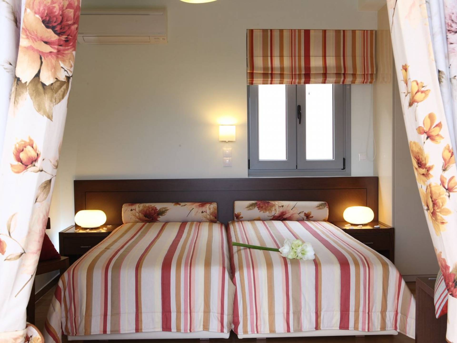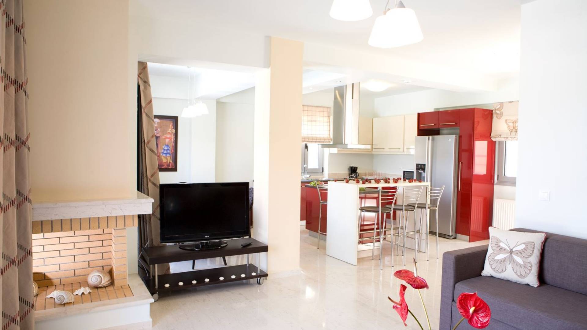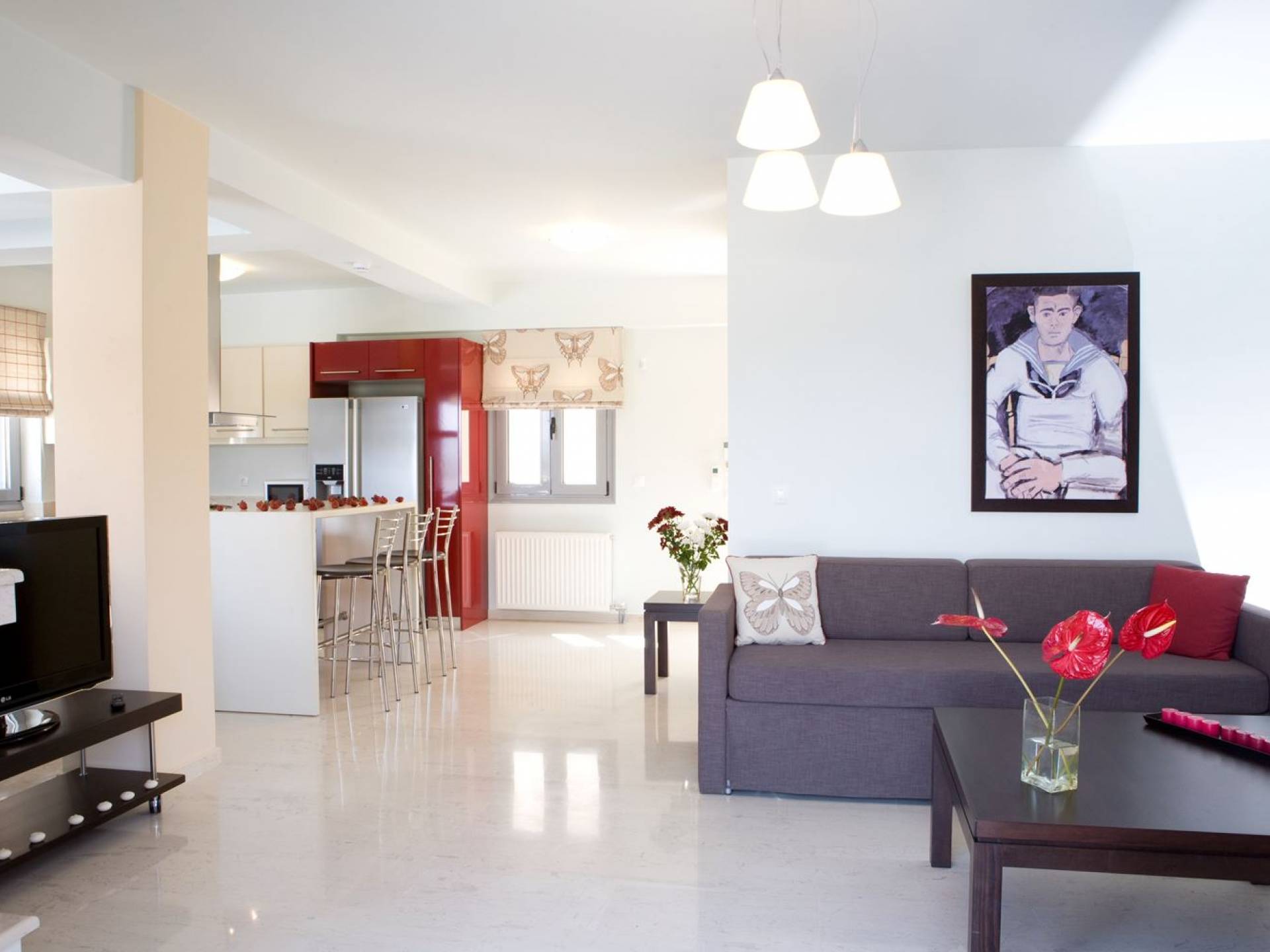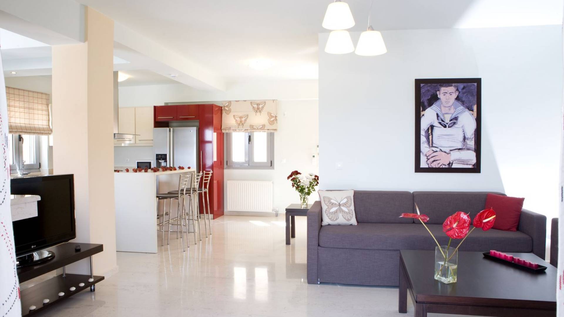 Villa Galini is built on two levels, ground and first floor. On the ground floor, next to the fireplace, there are two modern sofas which convert to two comfortable beds to accommodate two people. This living area is also comfortably furnished with a dining room table for six, TV, DVD player, telephone, and wireless internet access. Attentive lighting, modern paintings, and elegant soft furnishings reveal a discreet luxury.