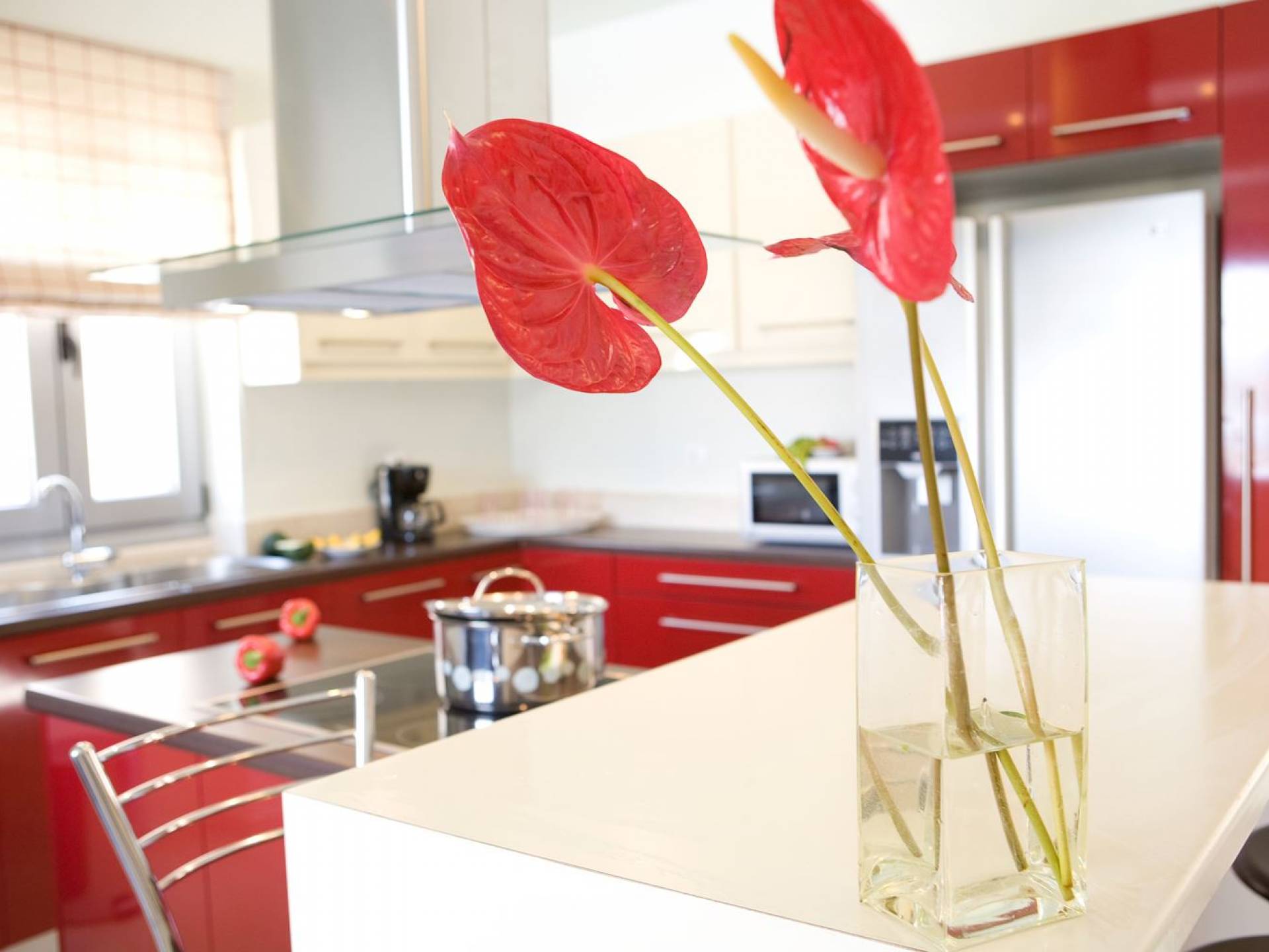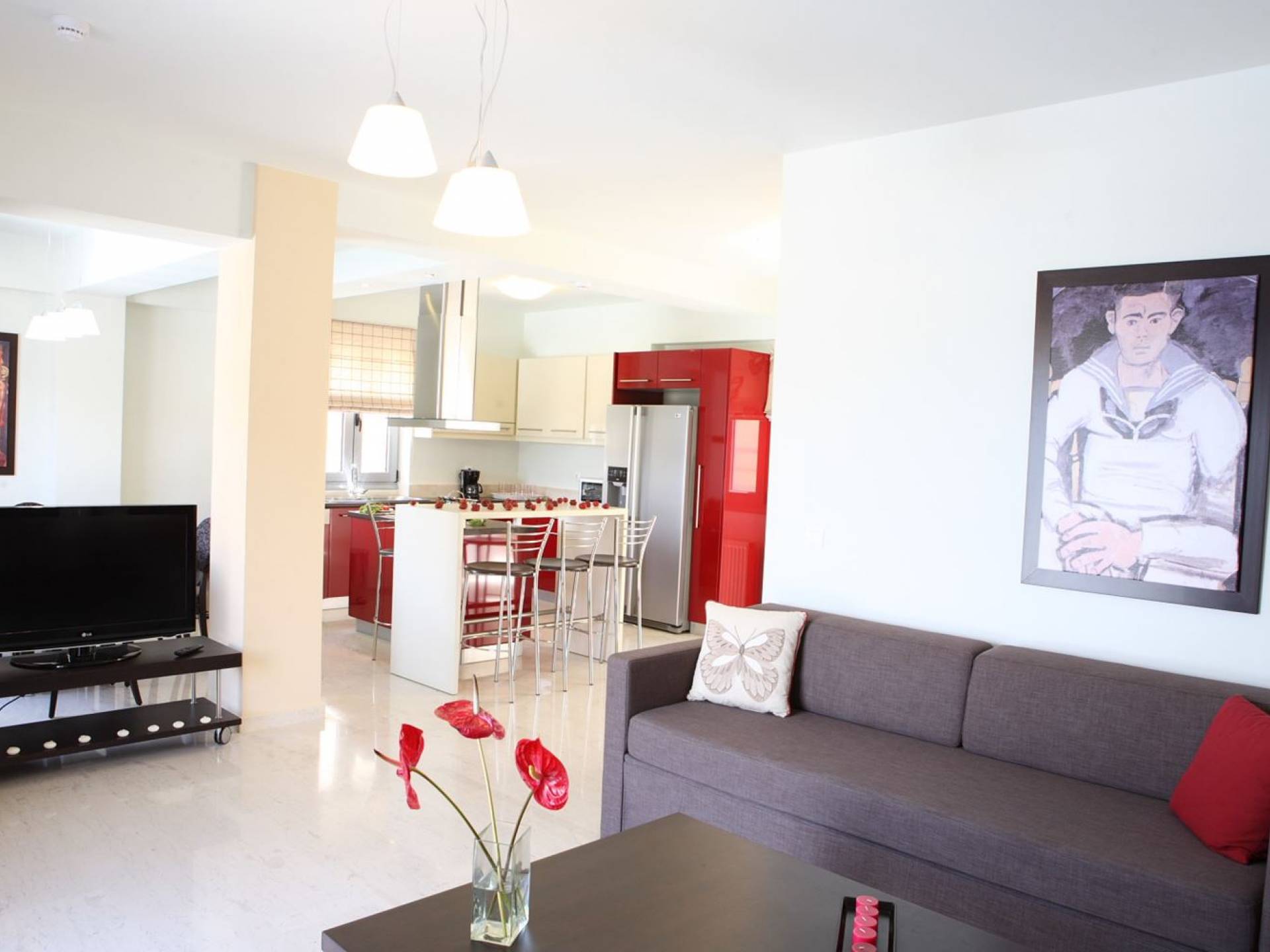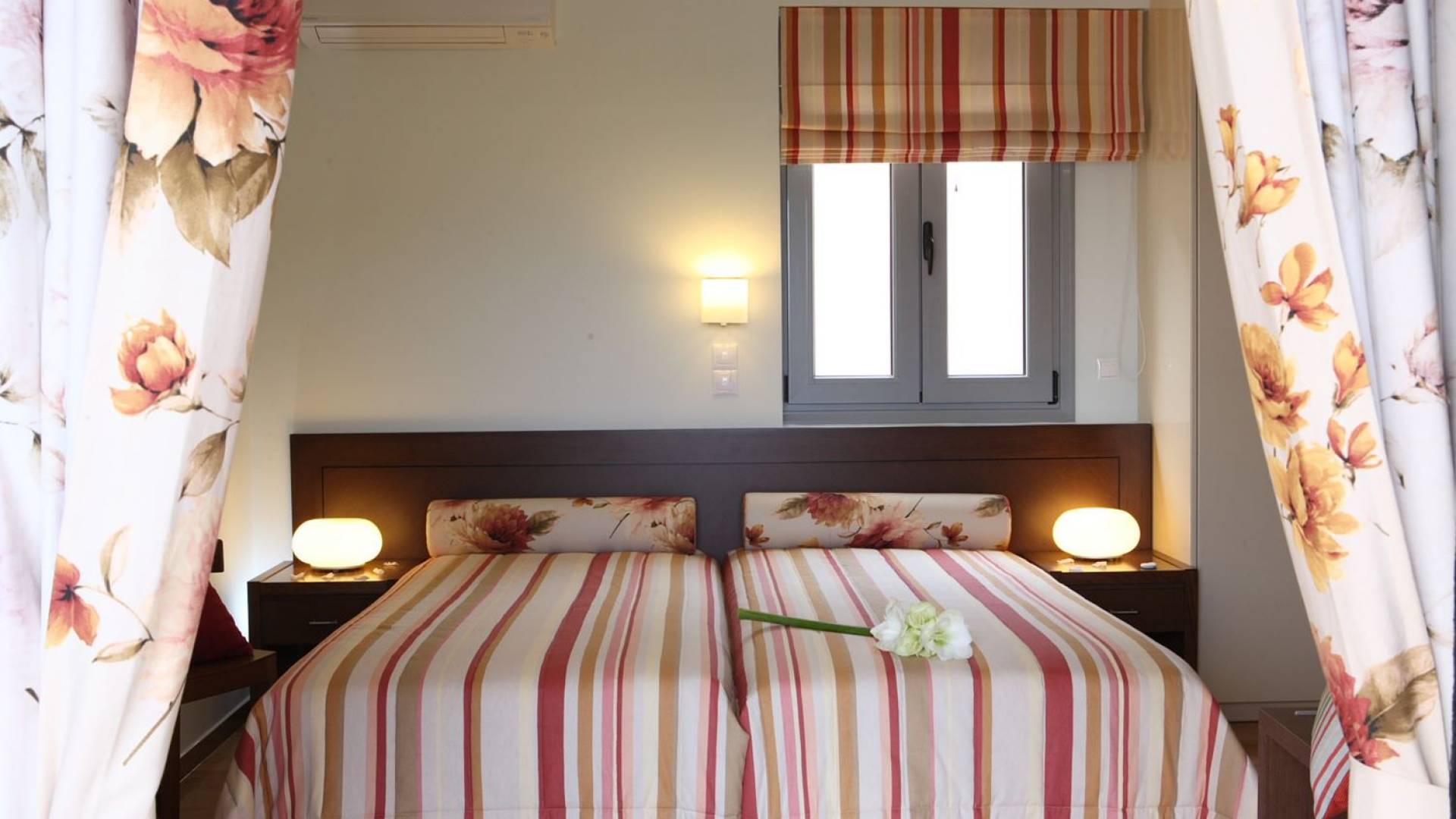 Villa Galini is built on two levels, ground and first floor. On the ground floor, next to the fireplace, there are two modern sofas which convert to two comfortable beds to accommodate two people. This living area is also comfortably furnished with a dining room table for six, TV, DVD player, telephone, and wireless internet access. Attentive lighting, modern paintings, and elegant soft furnishings reveal a discreet luxury.