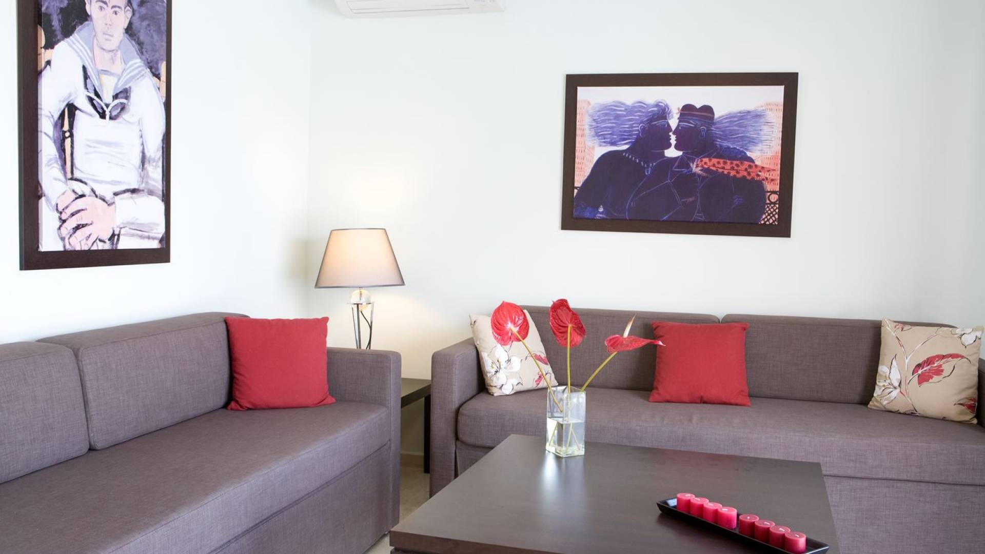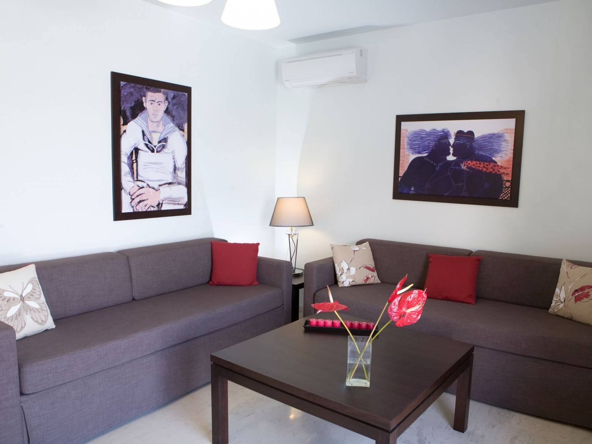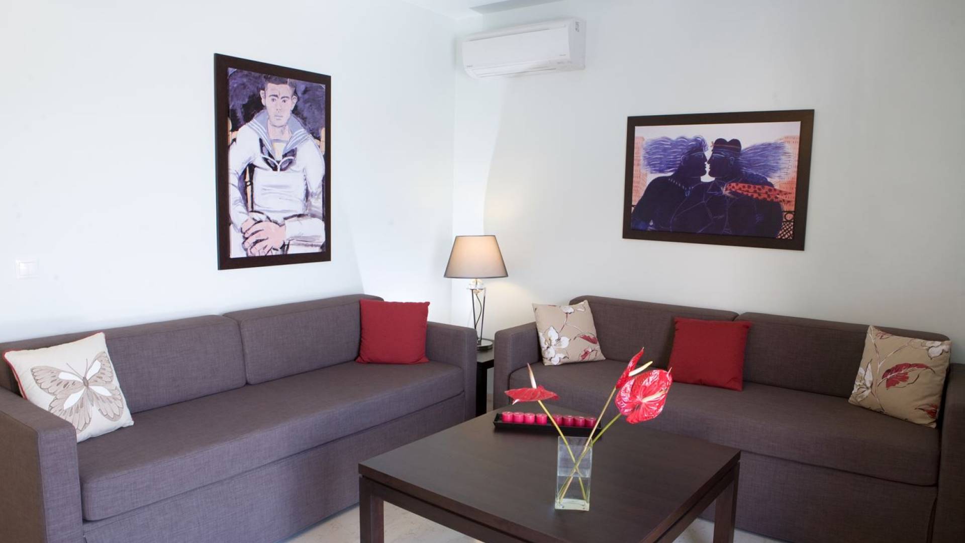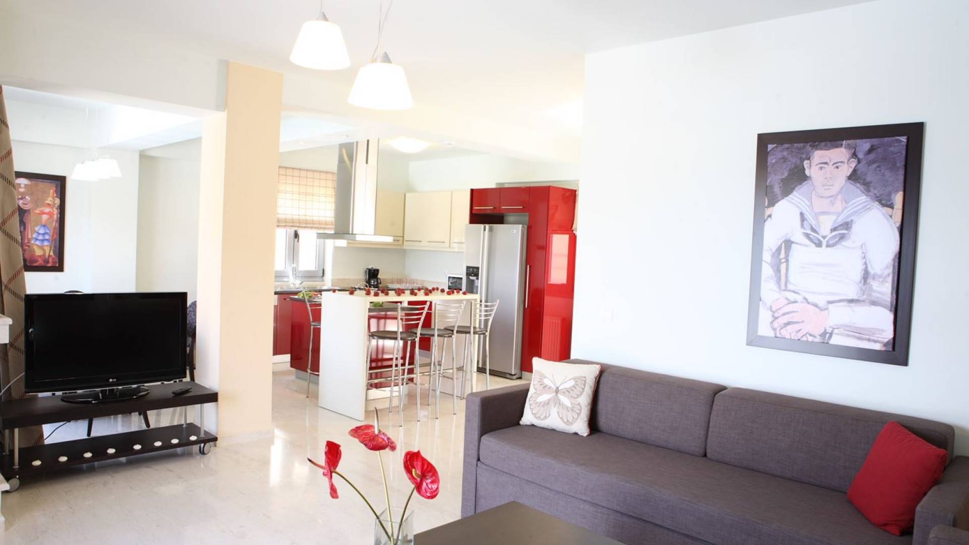 Villa Galini is built on two levels, ground and first floor. On the ground floor, next to the fireplace, there are two modern sofas which convert to two comfortable beds to accommodate two people. This living area is also comfortably furnished with a dining room table for six, TV, DVD player, telephone, and wireless internet access. Attentive lighting, modern paintings, and elegant soft furnishings reveal a discreet luxury.