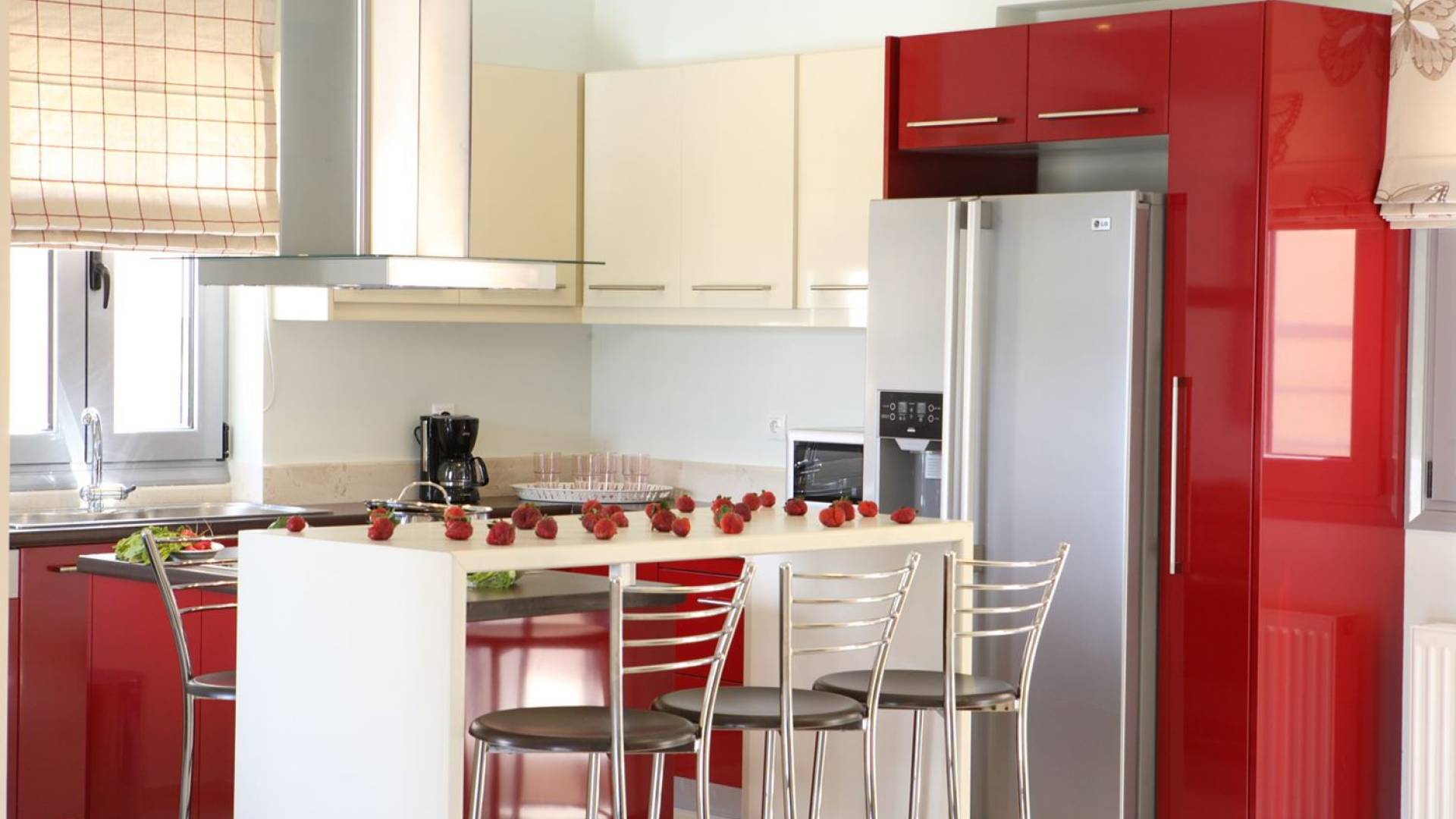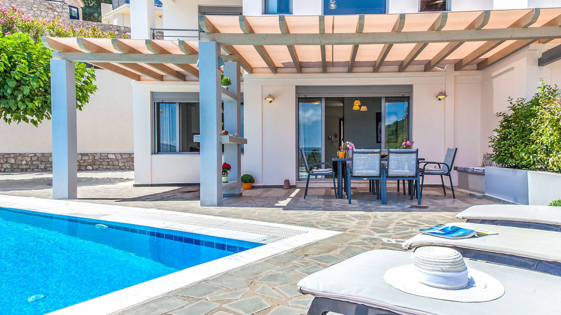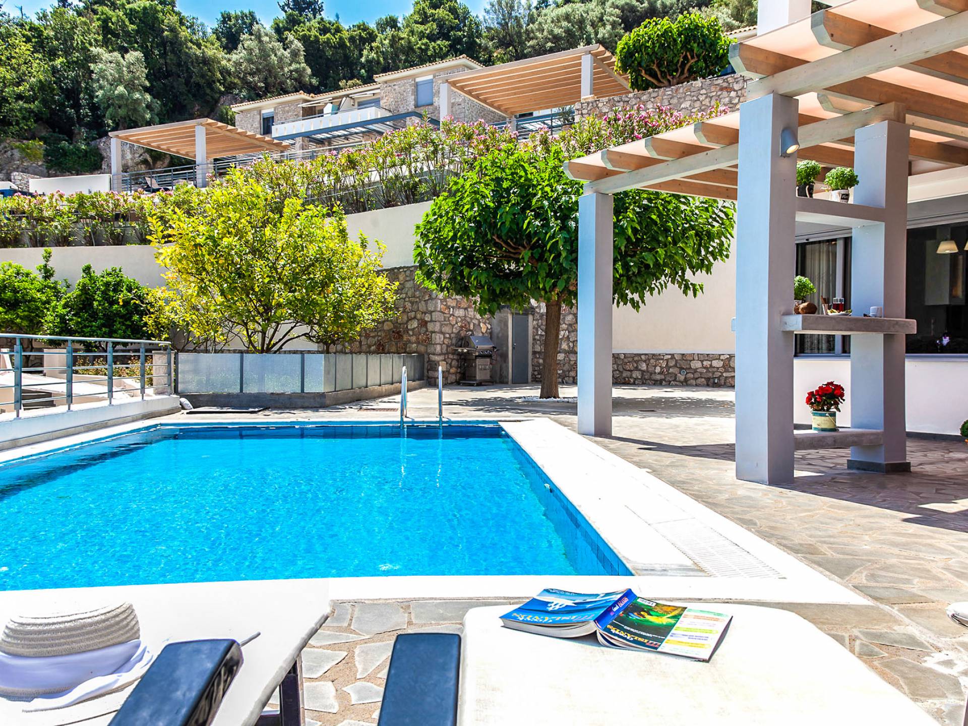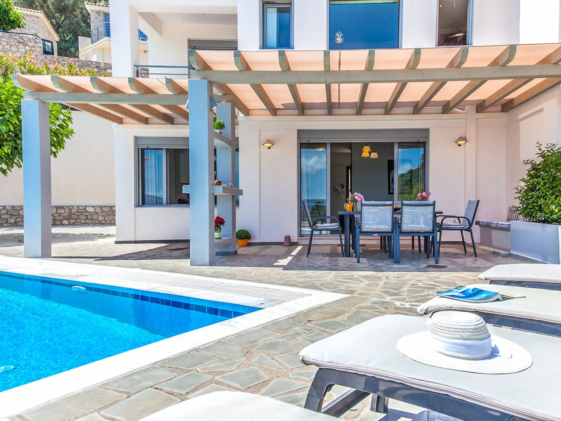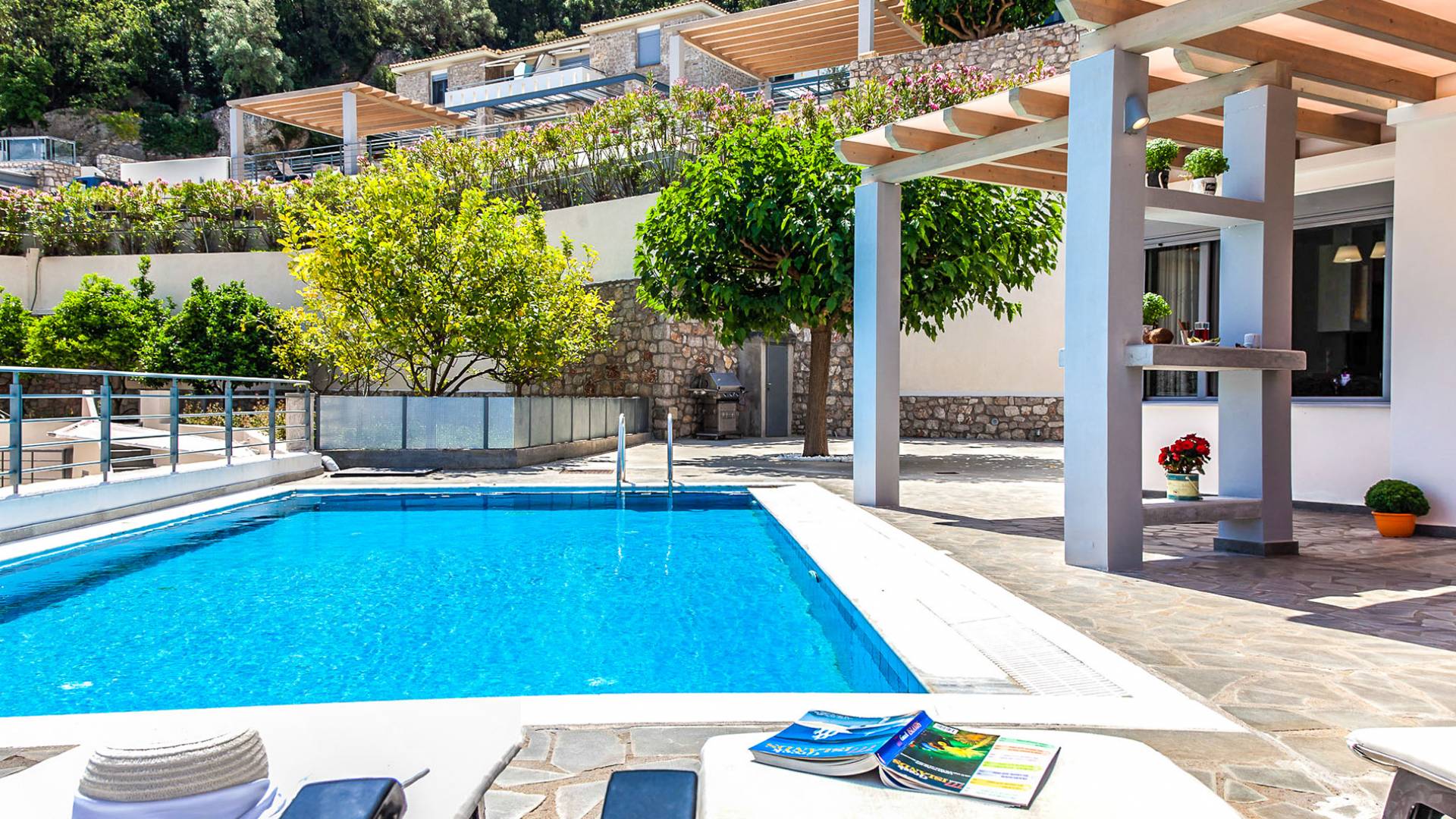 On both floors, there are large windows and doors for one to admire the breathtaking view from inside the house and have full contact with the outside. Electric roller shutters protect guests from the sun, patio furniture and an elegant dining table complete the amenities for guests. At Villa Galini umbrellas and sunbeds surround the pool with its unique whirlpool feature. The area is ideal for sunbathing, relaxing, or swimming. There is also an outdoor barbecue for those evening meals under the stars.