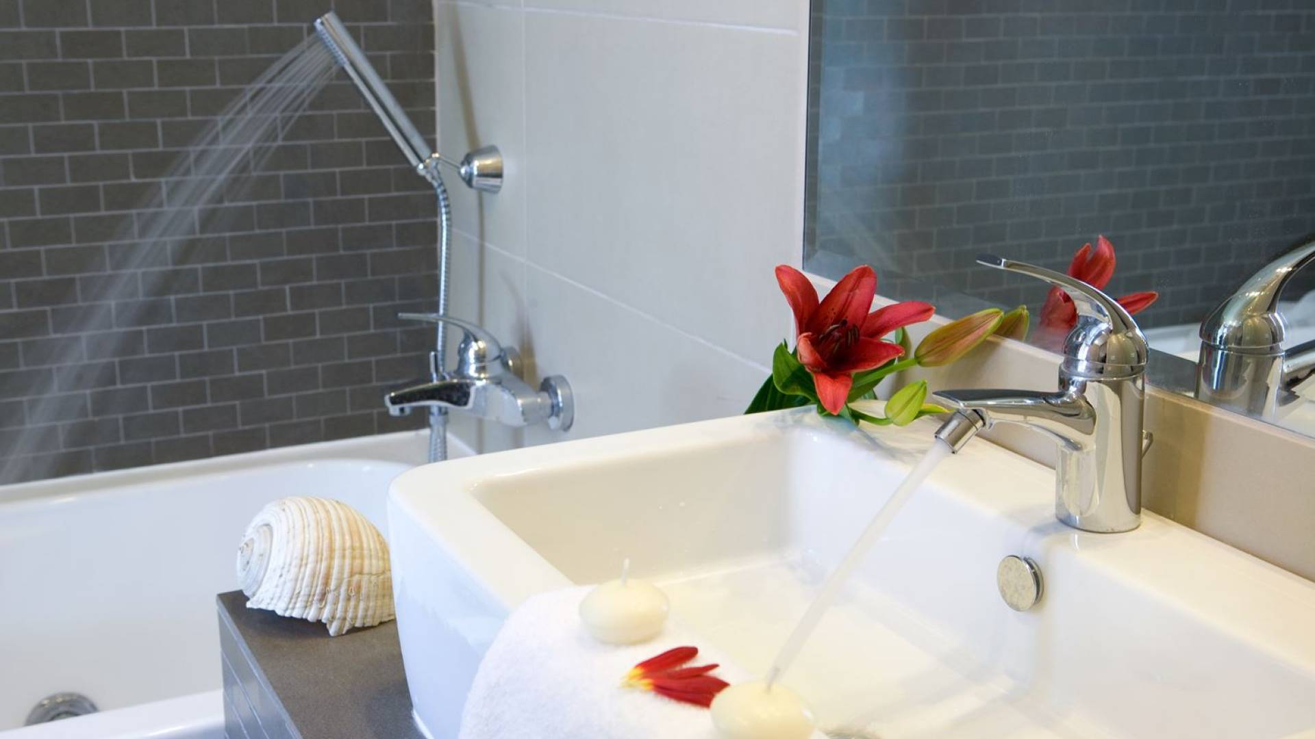 Upstairs there are two bedrooms each with a double bed, large wardrobe, desk, chair, mirror, TV and DVD player. Attention to detail can be admired with the stylish bedding and curtains surrounding the comfortable furniture. Each room has a separate luxury bathroom with a whirlpool tub, hairdryer, and complimentary toiletries. The terrace area is also comfortably furnished.