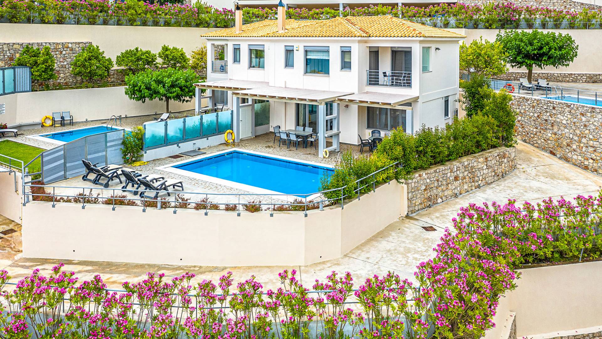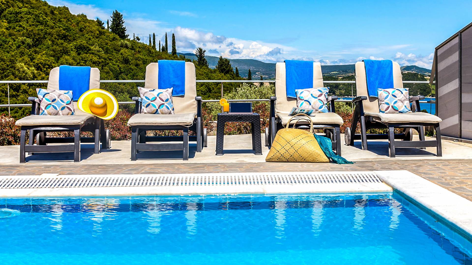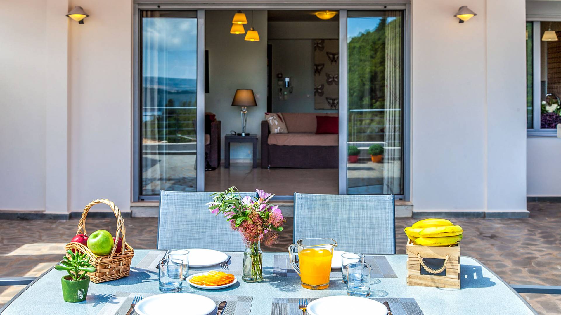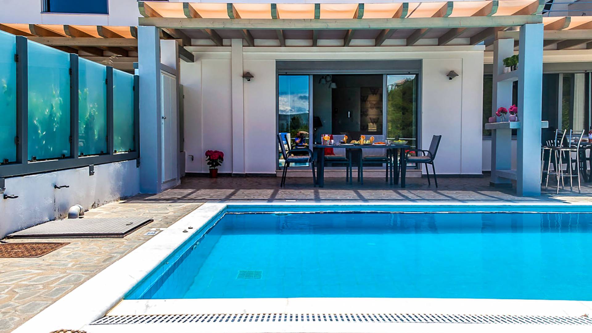 On both floors, there are large windows and doors for one to admire the breathtaking view from inside the house and have full contact with the outside. Electric roller shutters protect guests from the sun, patio furniture and an elegant dining table complete the amenities for guests. At Villa Thetis umbrellas and sunbeds surround the pool with its unique whirlpool feature. The area is ideal for sunbathing, relaxing, or swimming. There is also an outdoor barbecue for those evening meals under the stars.