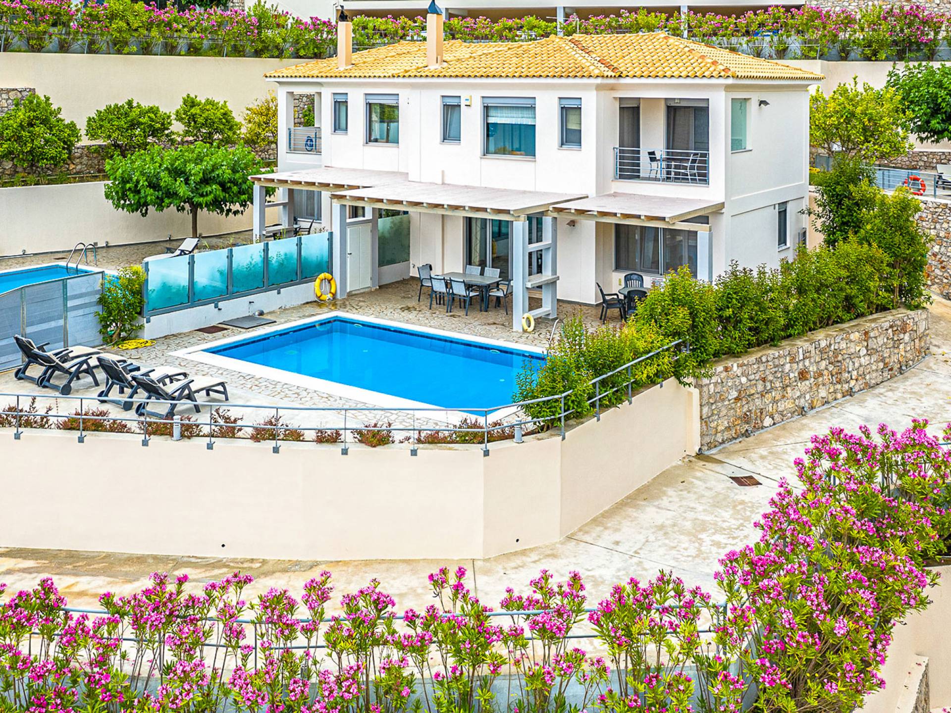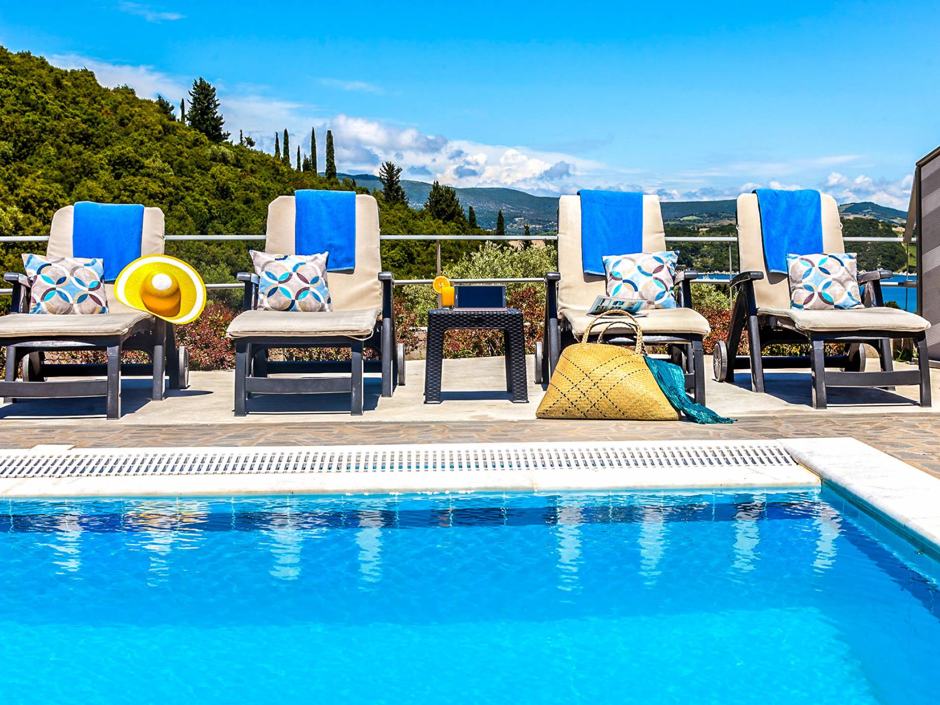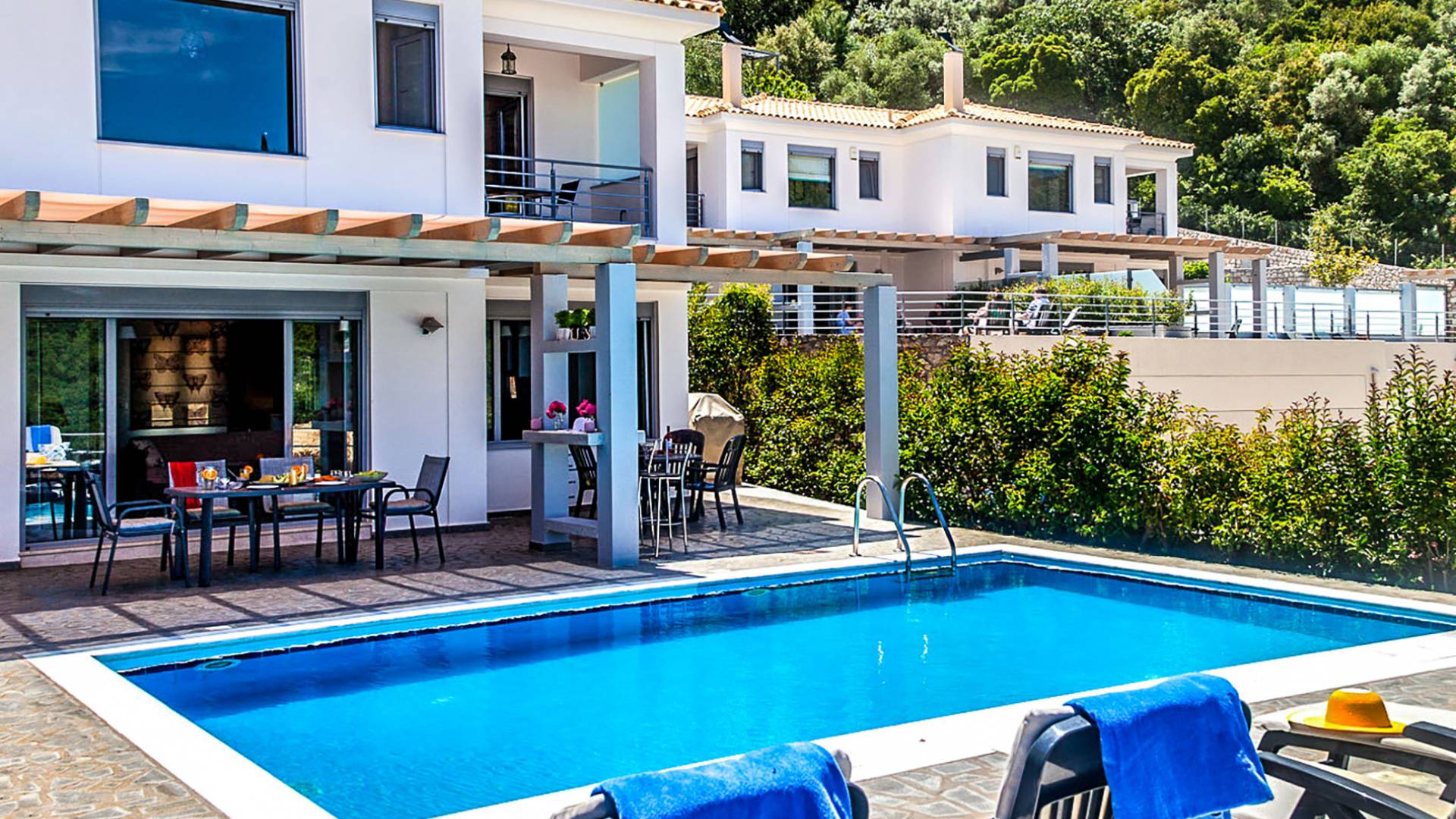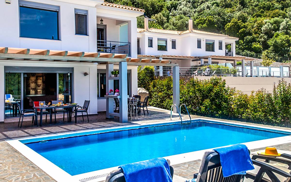 On both floors, there are large windows and doors for one to admire the breathtaking view from inside the house and have full contact with the outside. Electric roller shutters protect guests from the sun, patio furniture and an elegant dining table complete the amenities for guests. At Villa Thetis umbrellas and sunbeds surround the pool with its unique whirlpool feature. The area is ideal for sunbathing, relaxing, or swimming. There is also an outdoor barbecue for those evening meals under the stars.
