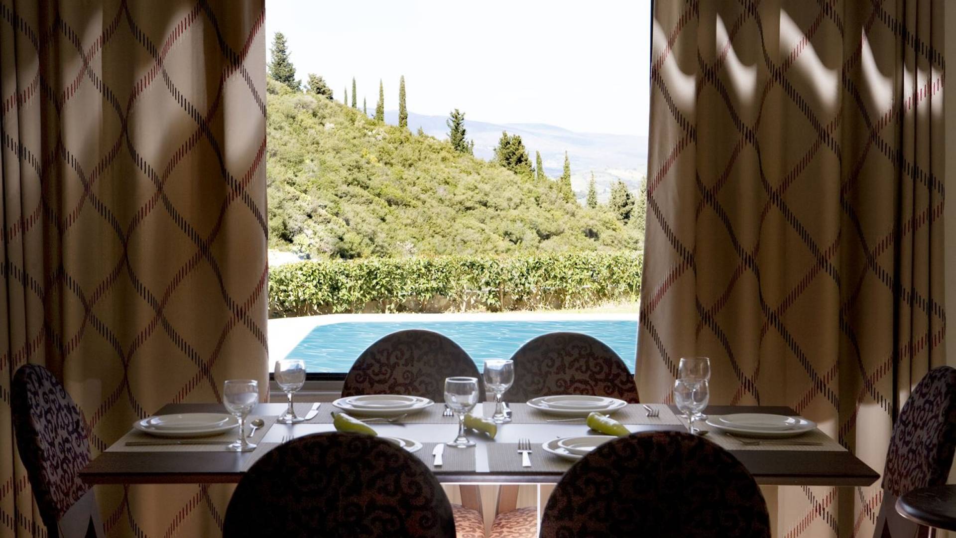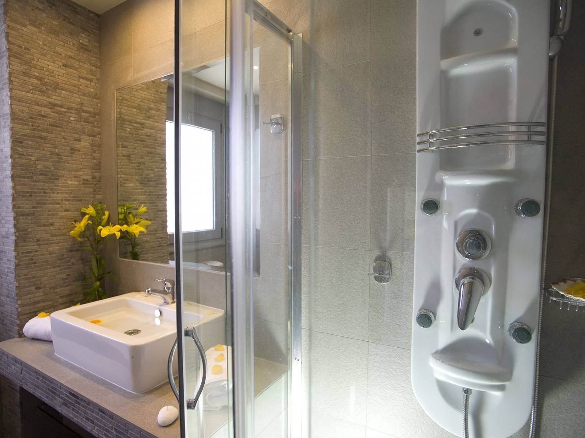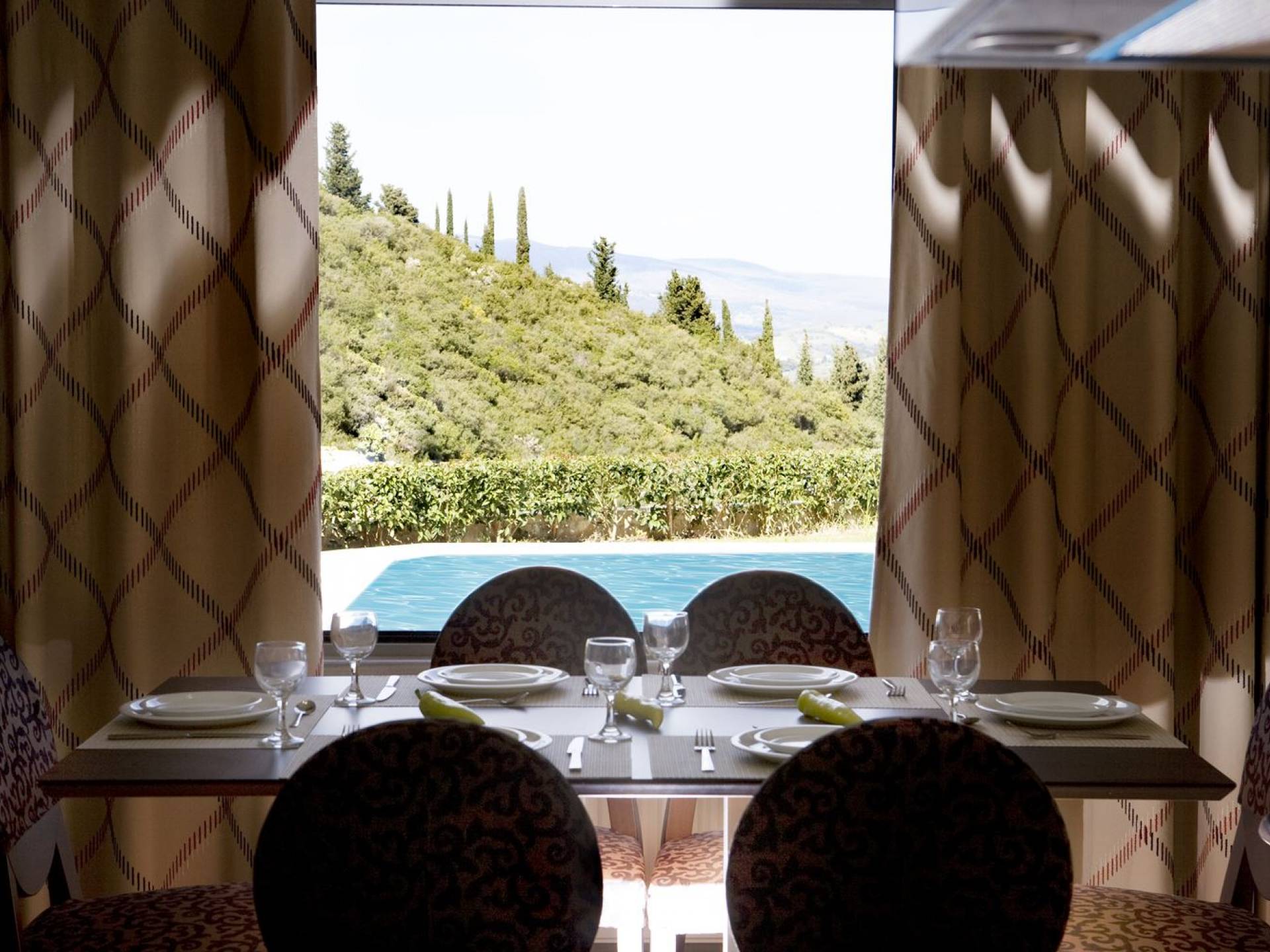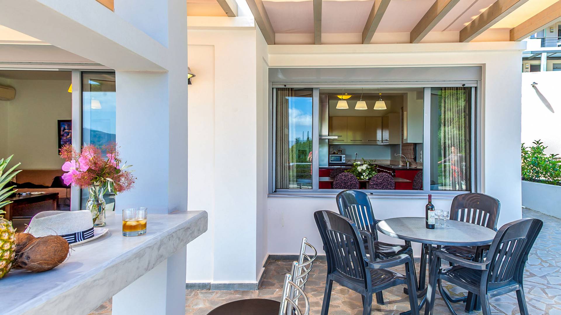 On both floors, there are large windows and doors for one to admire the breathtaking view from inside the house and have full contact with the outside. Electric roller shutters protect guests from the sun, patio furniture and an elegant dining table complete the amenities for guests. At Villa Thetis umbrellas and sunbeds surround the pool with its unique whirlpool feature. The area is ideal for sunbathing, relaxing, or swimming. There is also an outdoor barbecue for those evening meals under the stars.