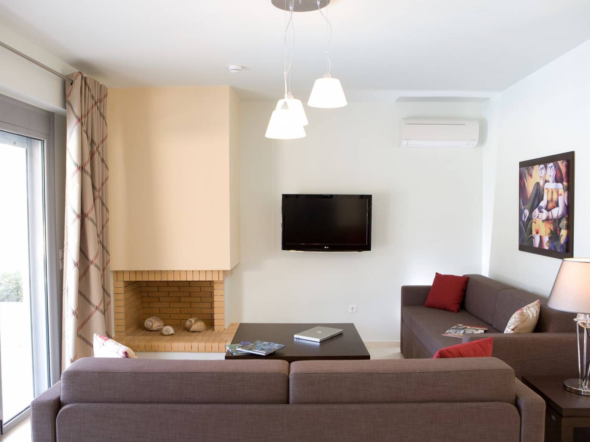 Villa Thetis is built on two levels, ground and first floor. On the ground floor, next to the fireplace, there are two modern sofas which convert to two comfortable beds to accommodate two people. This living area is also comfortably furnished with a dining room table for six, TV, DVD player, telephone, and wireless internet access. Attentive lighting, modern paintings, and elegant soft furnishings reveal a discreet luxury.