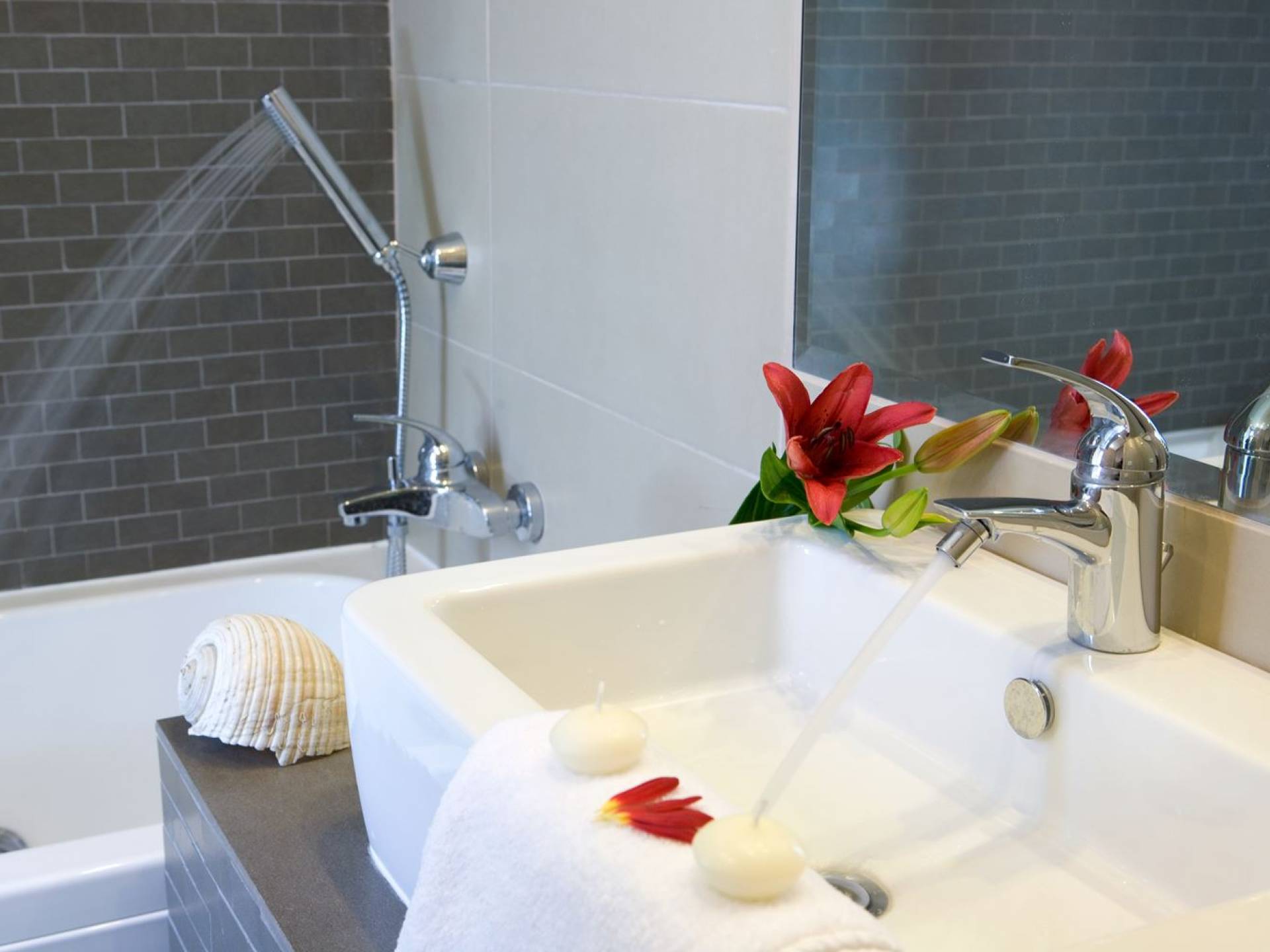 Upstairs there are two bedrooms each with a double bed, large wardrobe, desk, chair, mirror, TV and DVD player. Attention to detail can be admired with the stylish bedding and curtains surrounding the comfortable furniture. Each room has a separate luxury bathroom with a whirlpool tub, hairdryer, and complimentary toiletries. The terrace area is also comfortably furnished.