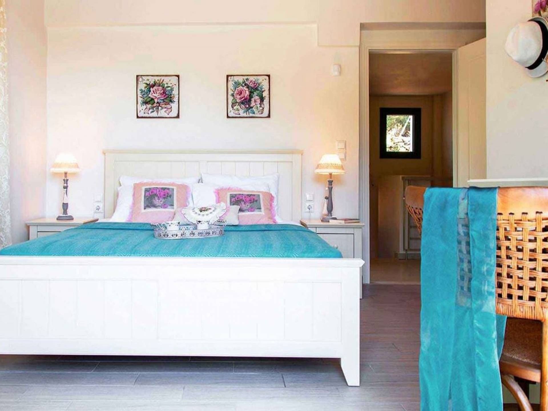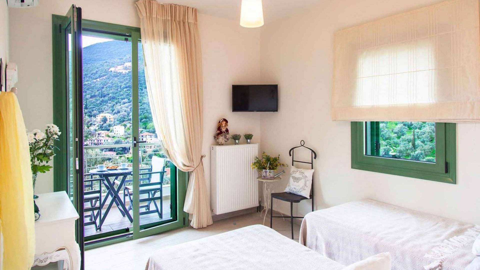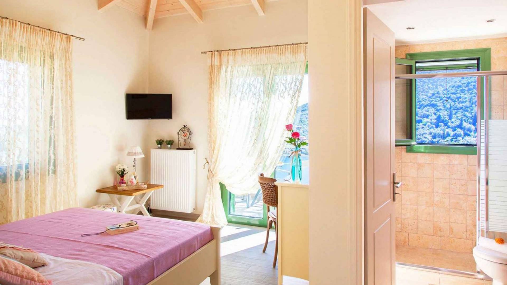 On the third floor we can find a bedroom with a king-size bed and anatomic mattress, air conditioning, a 28’’ LED television, and an ensuite bathroom. Both bedrooms have a French door and a window offering a magical view to the mountains and the sea. The bedroom balconies of both houses offer an unobstructed panoramic view to both the village and the vast blue of the Ionian Sea, from where the eyes can travel to the surrounding islands, all the way to Ithaca and Cephalonia.