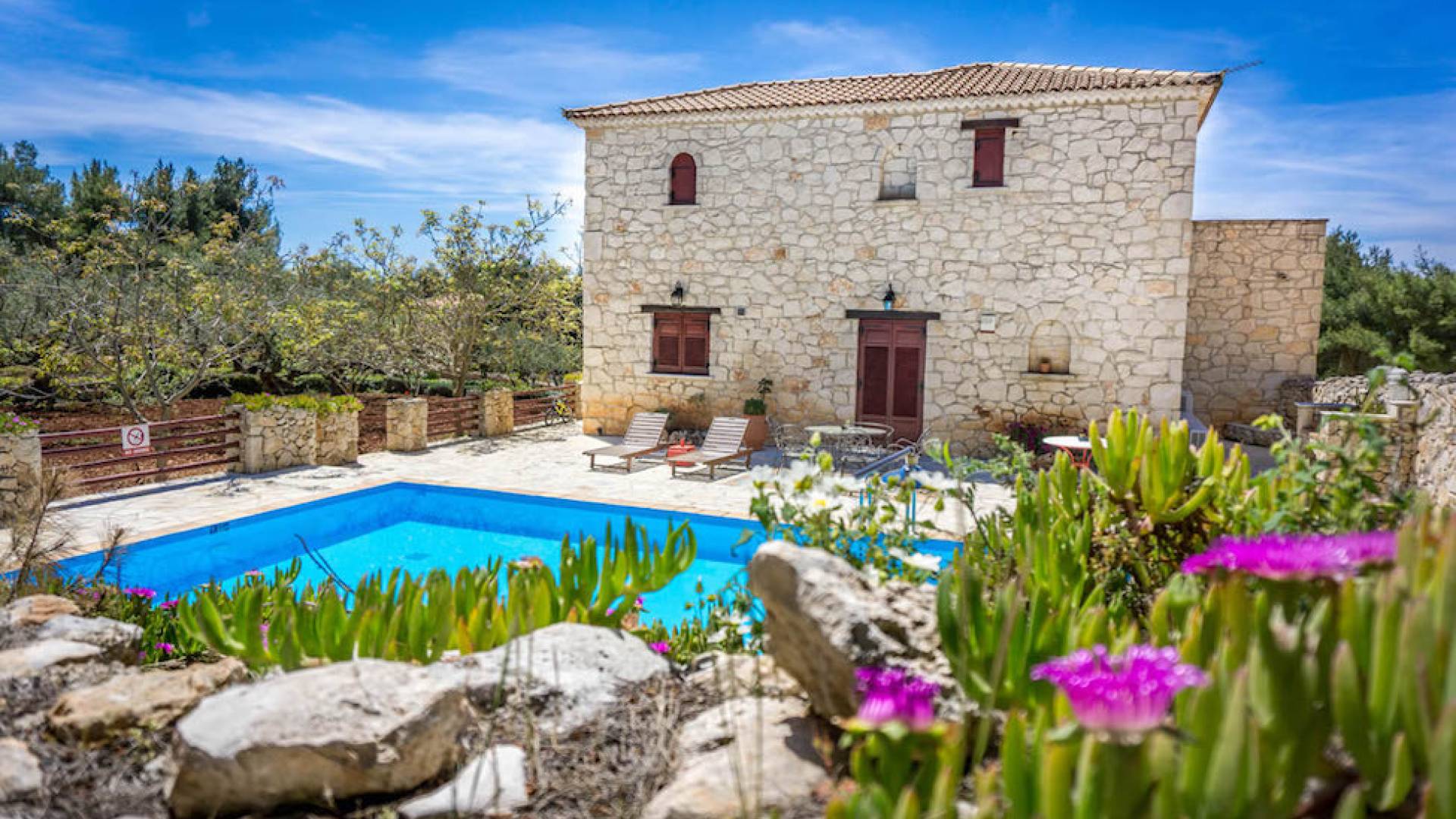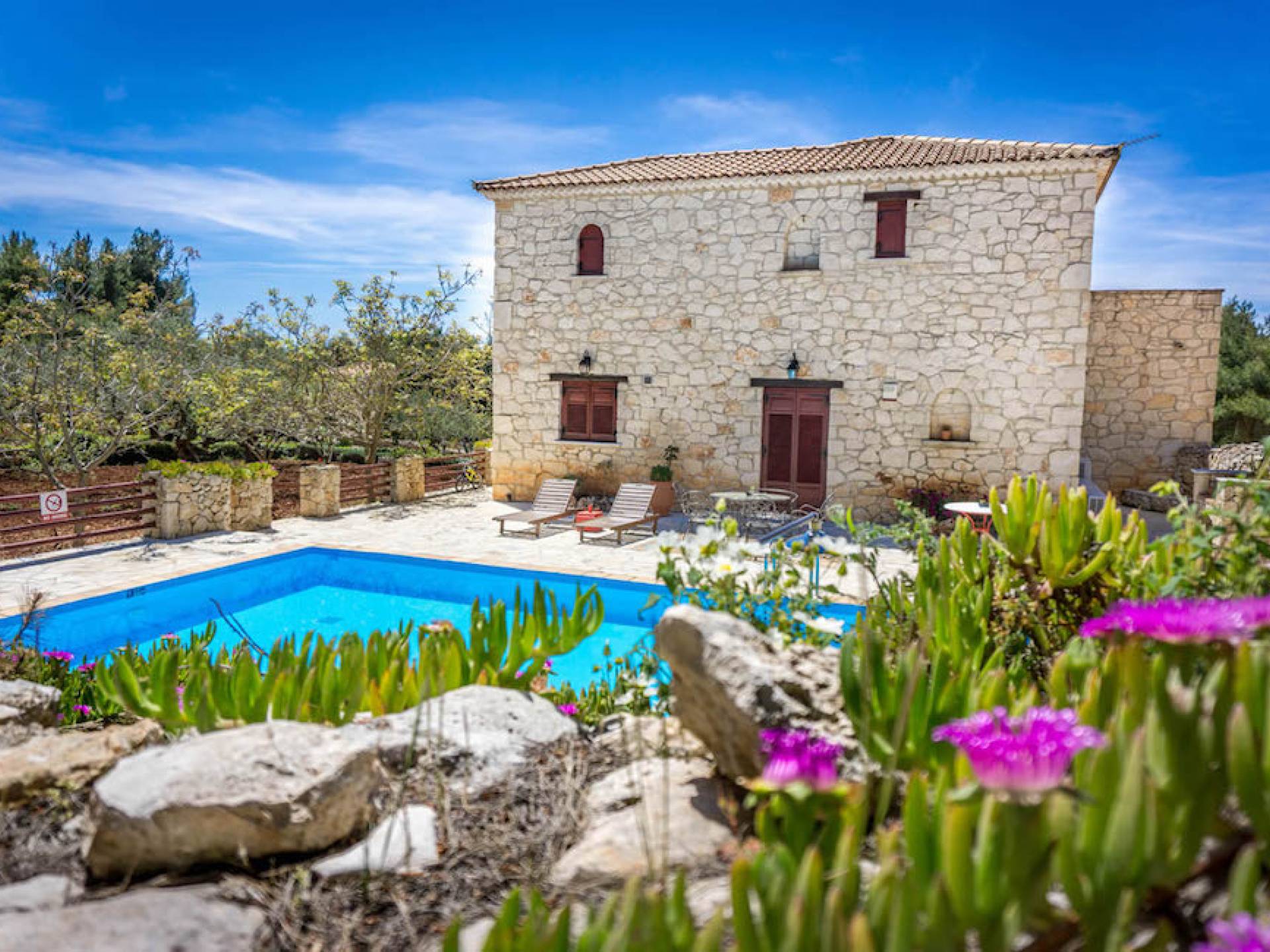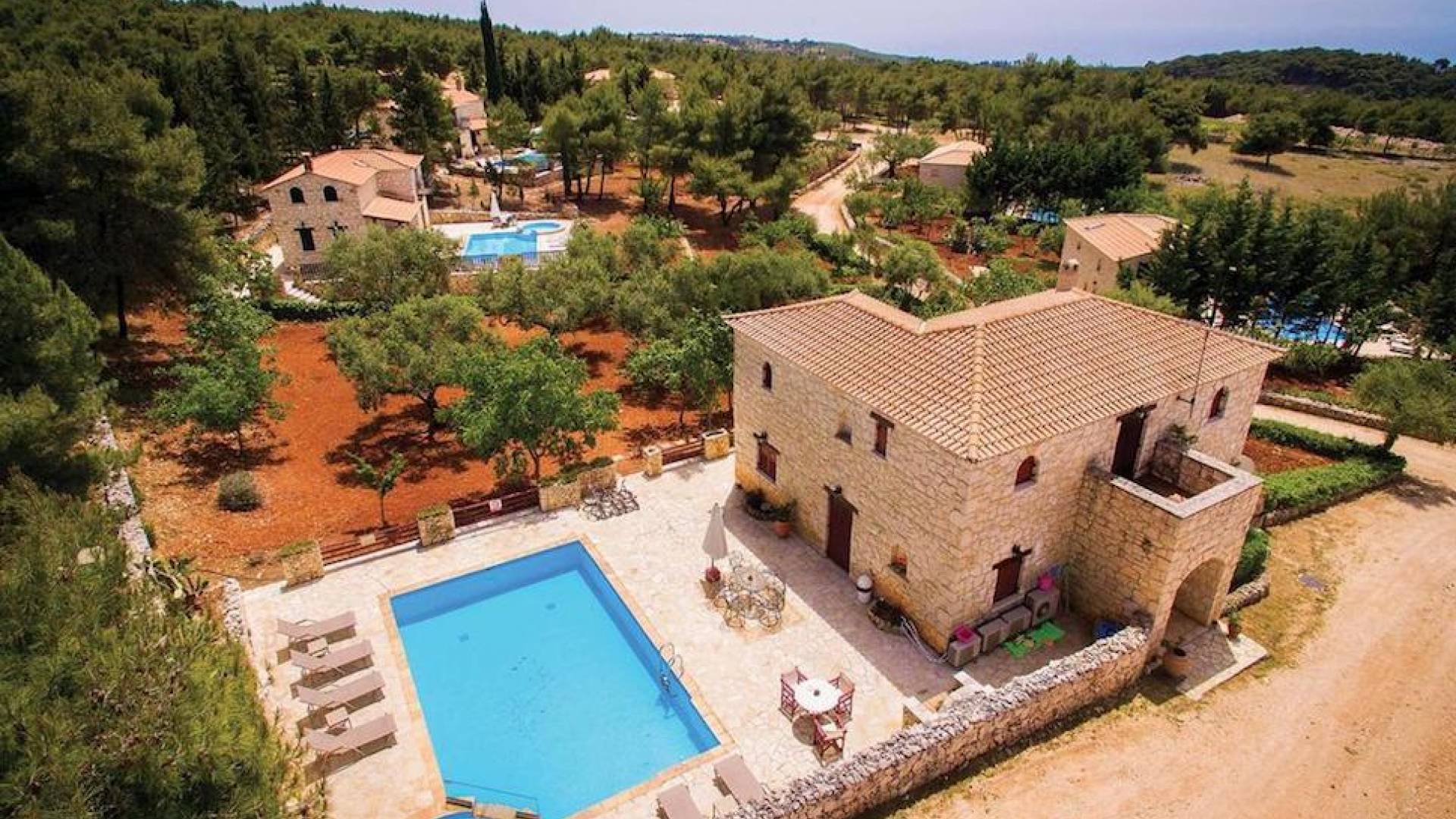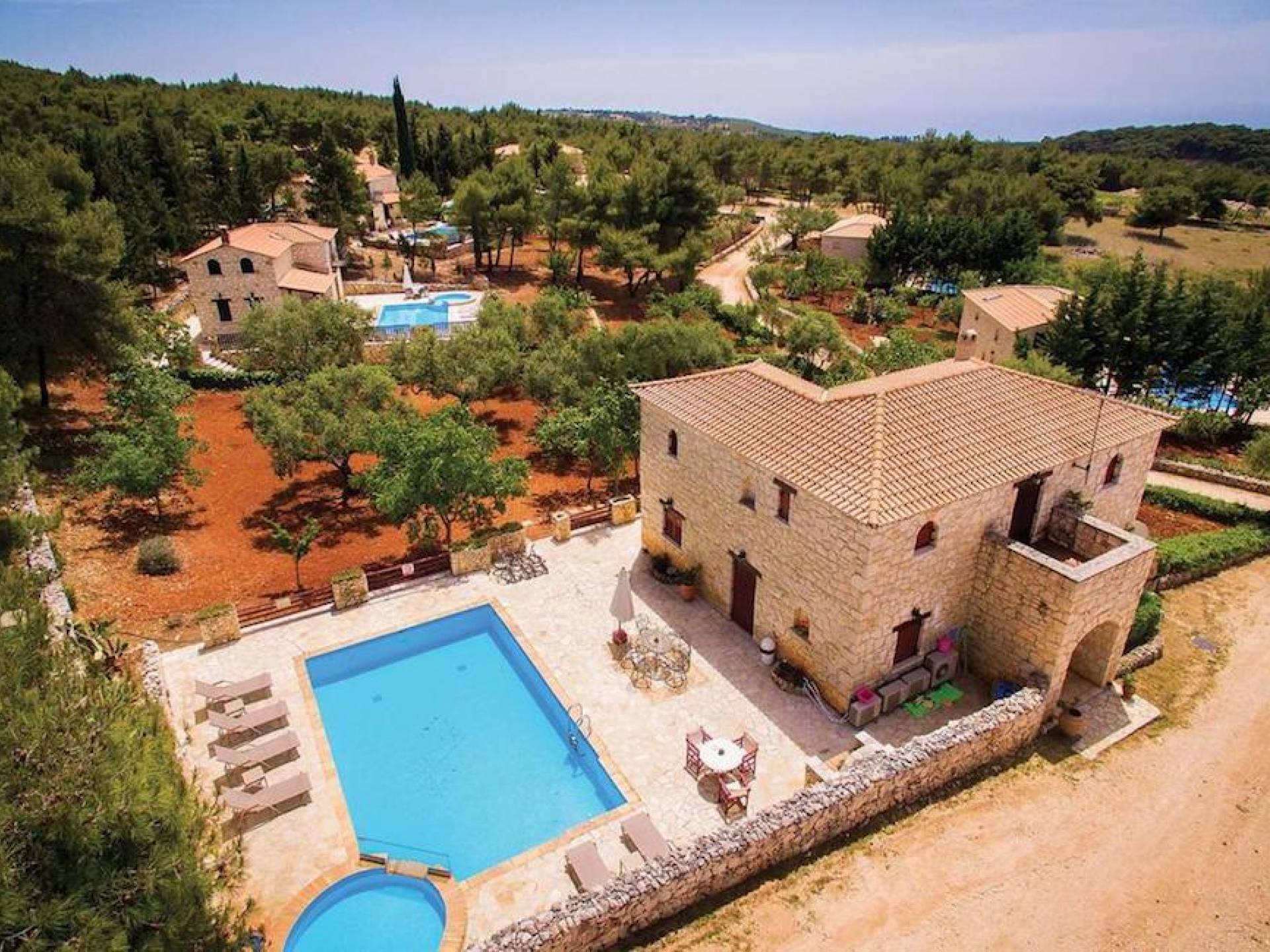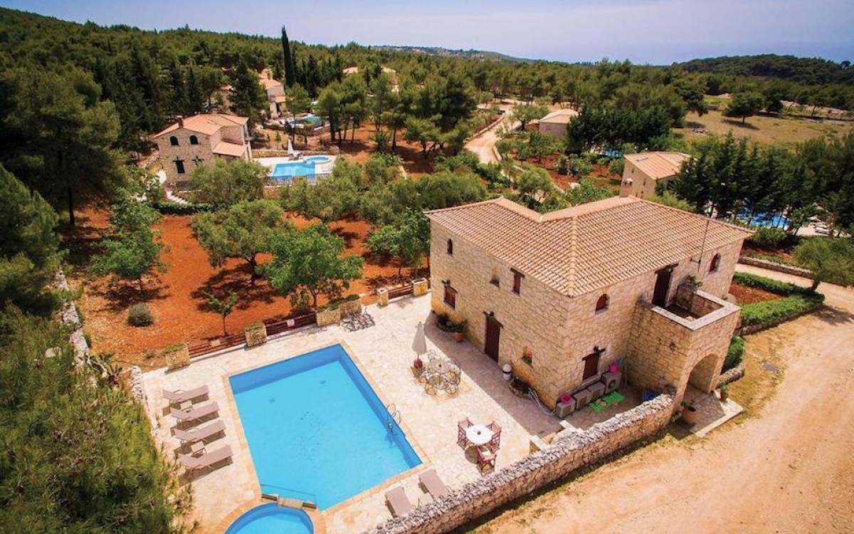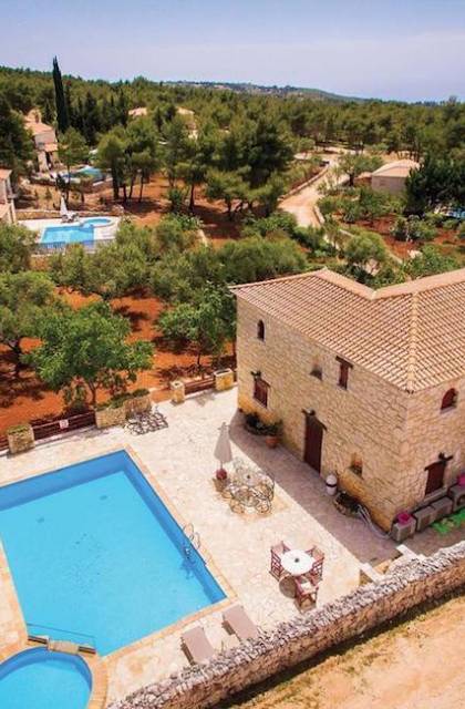 Within large private grounds of 200 sq. km., on the northwest coast of Zakynthos and 20 kilometers from Zakynthos town, the current owners gave life to a forgotten region. The land has been cultivated with loving care and planted with infrequent varieties of trees and plants that tend to disappear from the flora of the island. Five luxurious traditional stone villas were built following the local architecture.