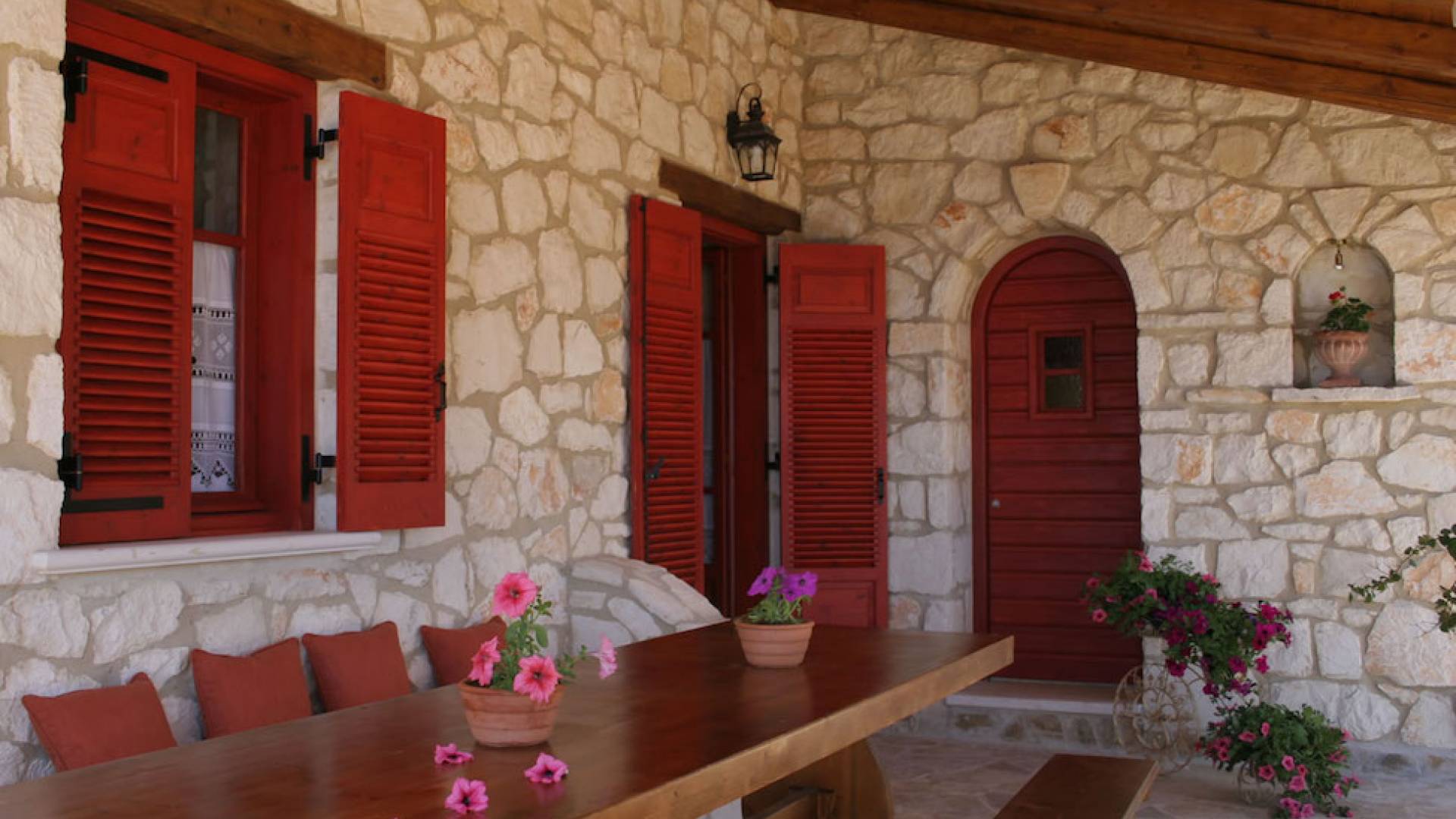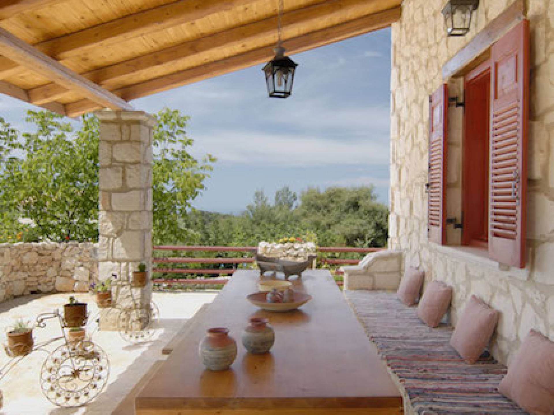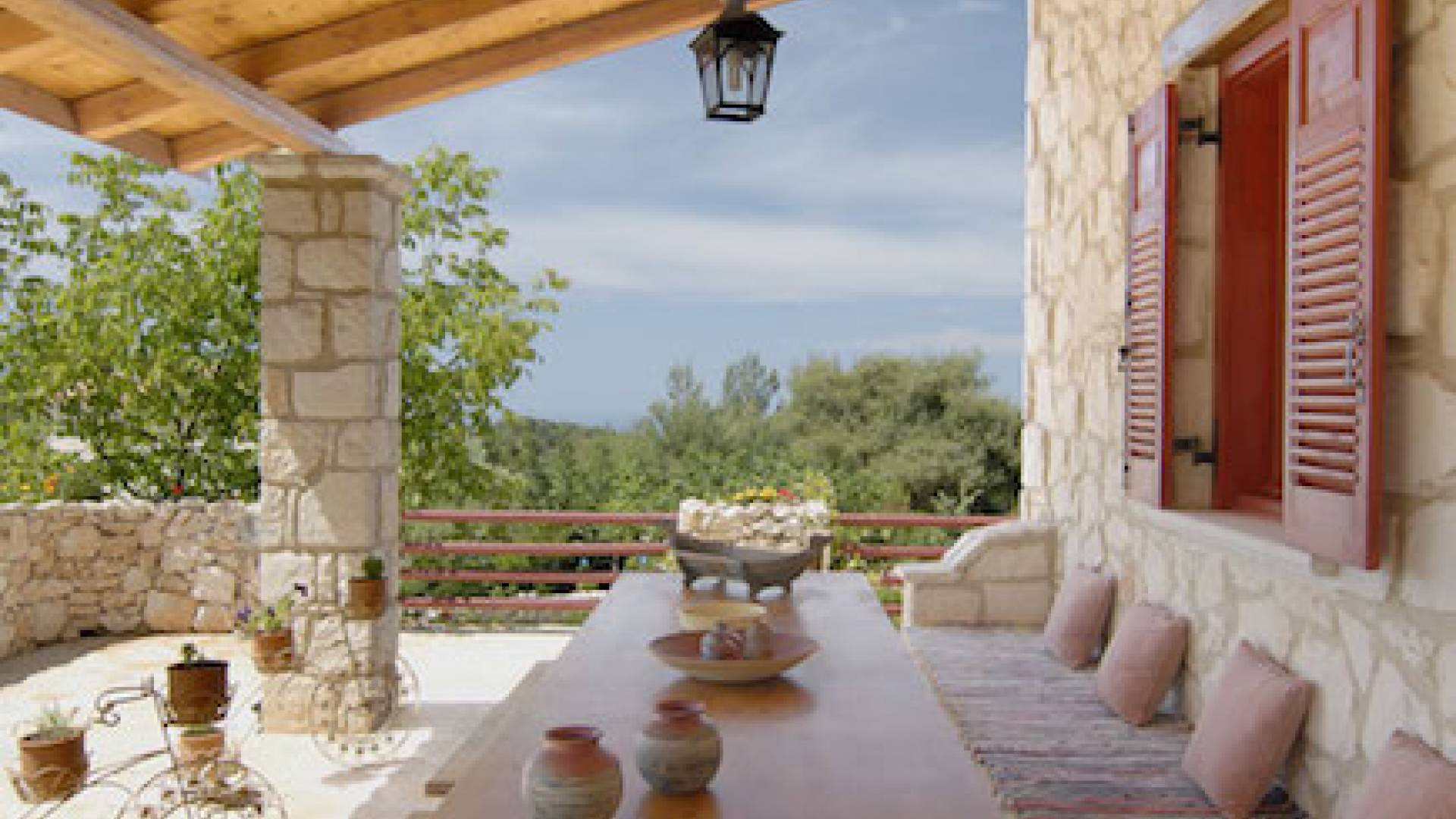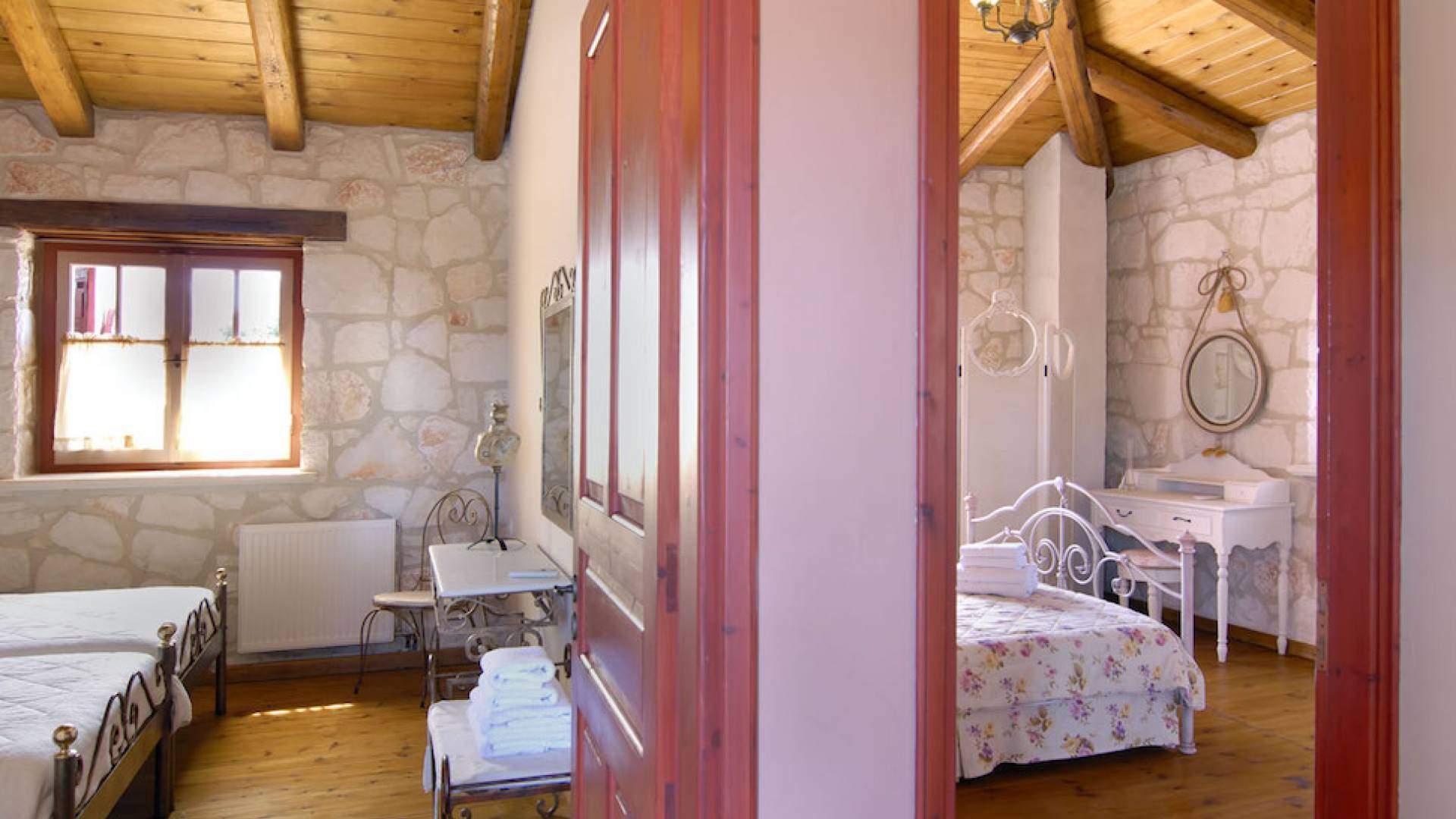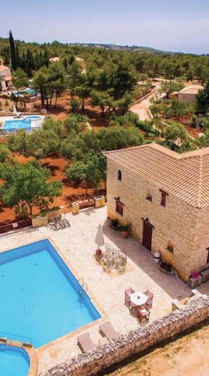 Set in large gardens, with stone walls providing total privacy, the villas do not overlook each other and command superb views above green olive groves, vineyards, and dense pinewood to the Adriatic sea. Local craftsmen worked with care and the old traditional way to create an outcome that combines modern comforts with the traditional style of the mountainous village houses. Stone and pine floors, cypress wood beams, period furniture, stylish wrought-iron dining chairs and bedsteads, lace curtains, art pieces by Karla Gerdau and Asimakis Chanionis, incidental furniture all add to the character of these lovely villas.