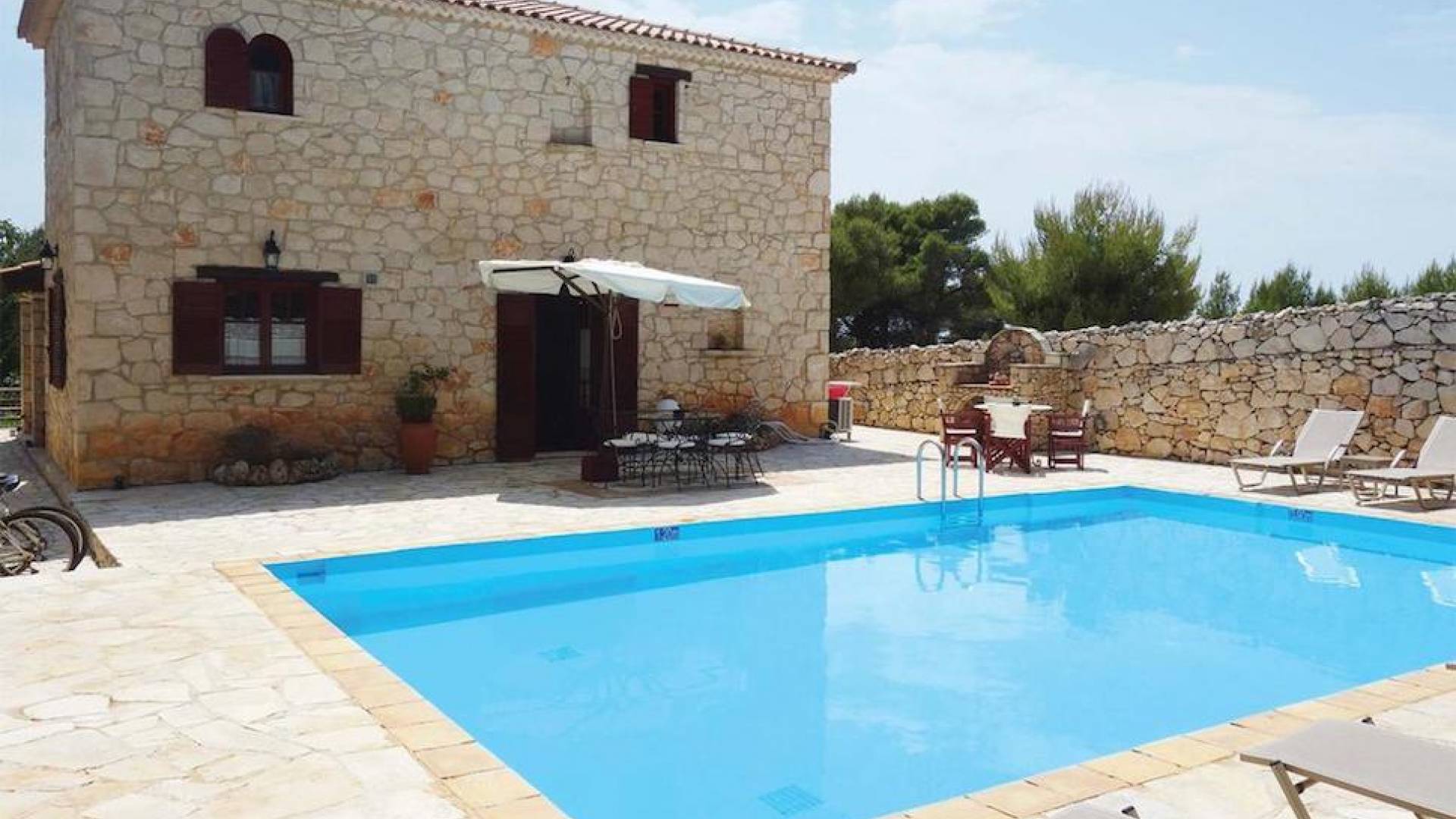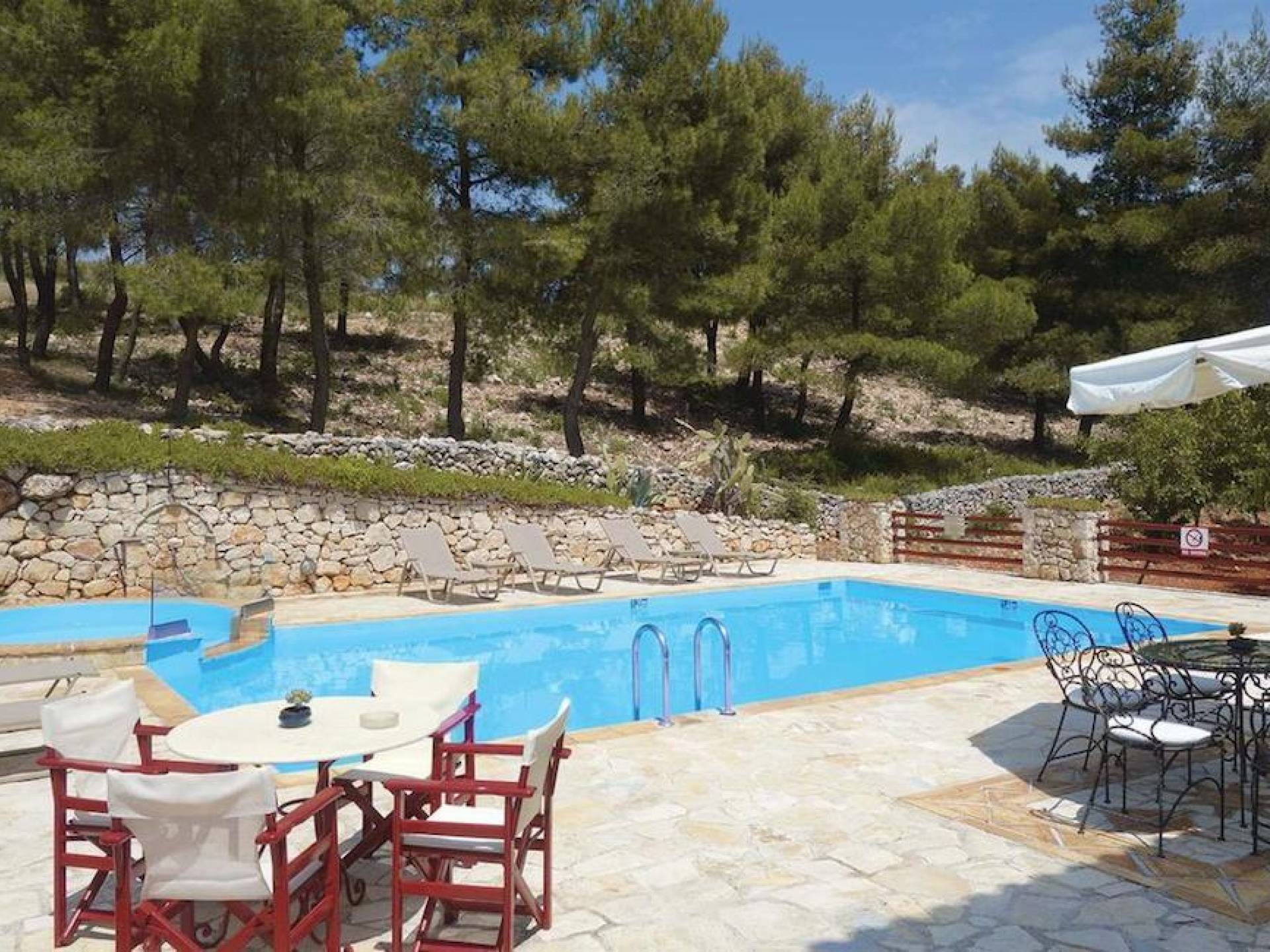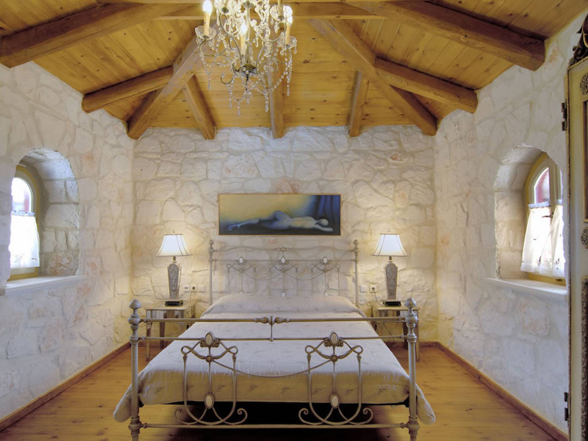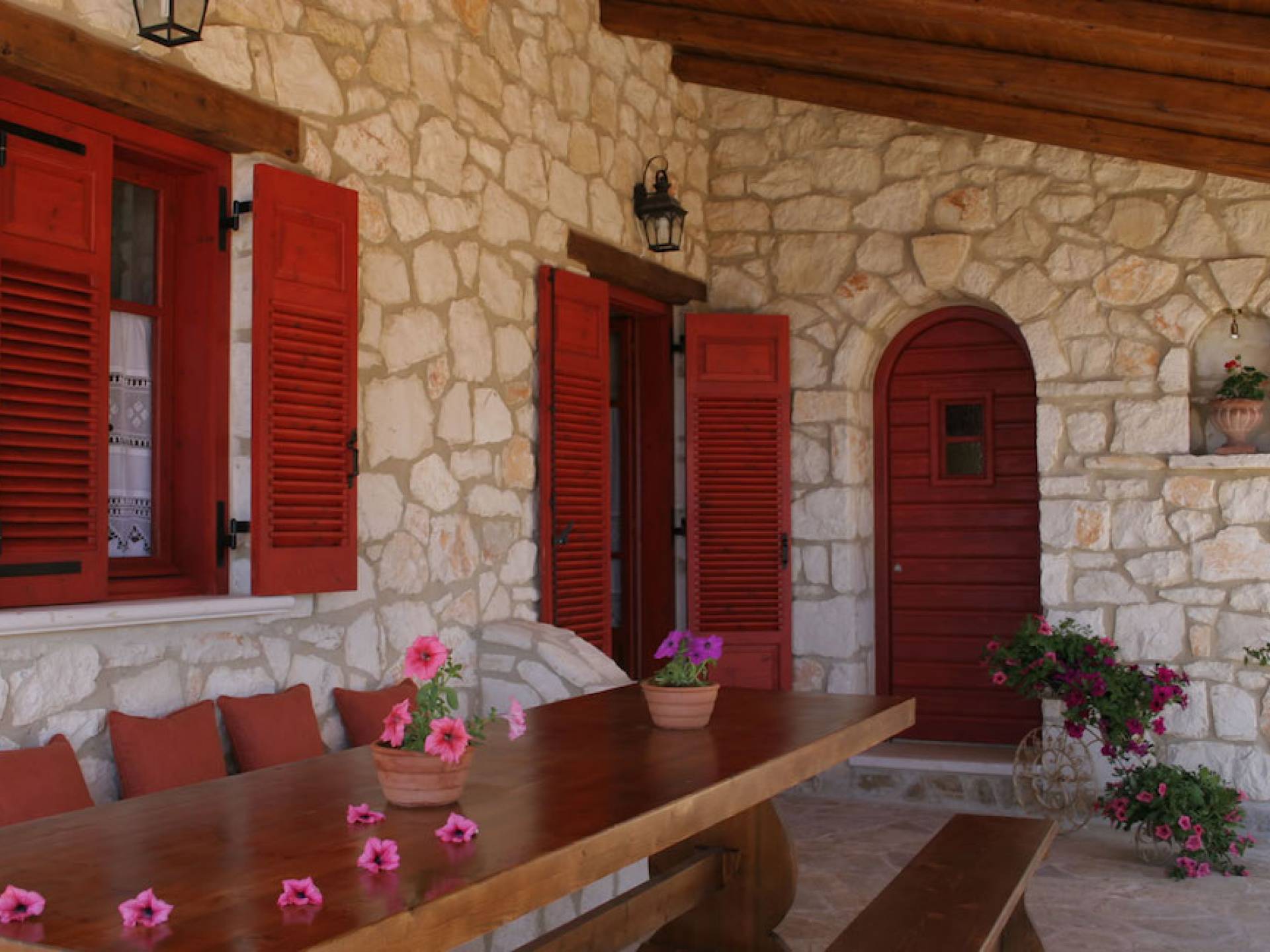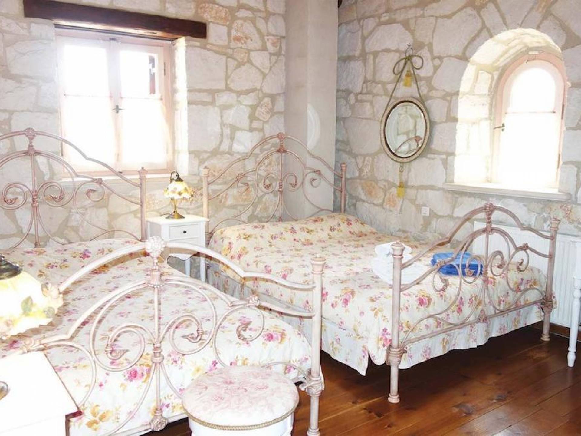 Set in large gardens, with stone walls providing total privacy, the villas do not overlook each other and command superb views above green olive groves, vineyards, and dense pinewood to the Adriatic sea. Local craftsmen worked with care and the old traditional way to create an outcome that combines modern comforts with the traditional style of the mountainous village houses. Stone and pine floors, cypress wood beams, period furniture, stylish wrought-iron dining chairs and bedsteads, lace curtains, art pieces by Karla Gerdau and Asimakis Chanionis, incidental furniture all add to the character of these lovely villas.
