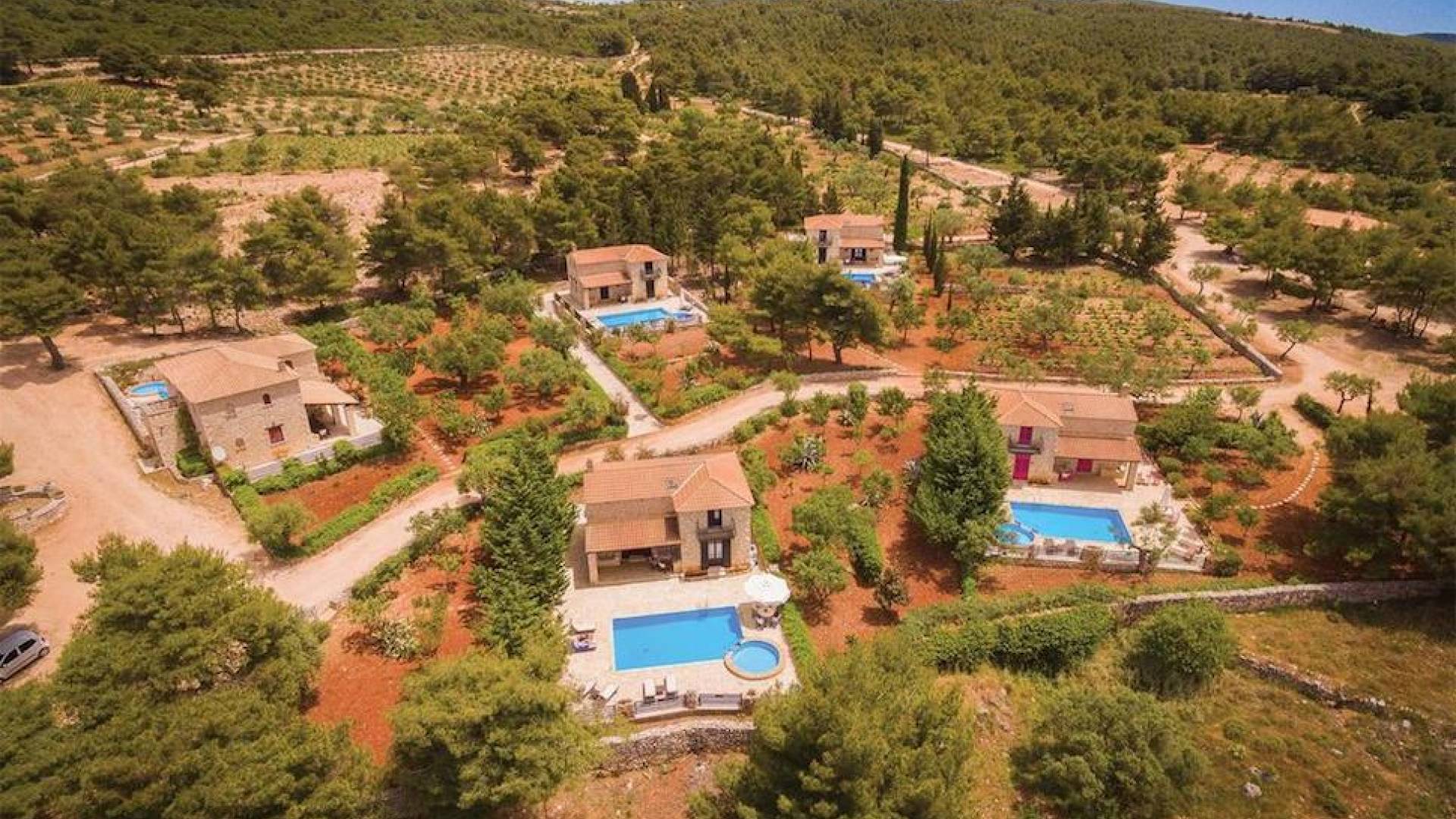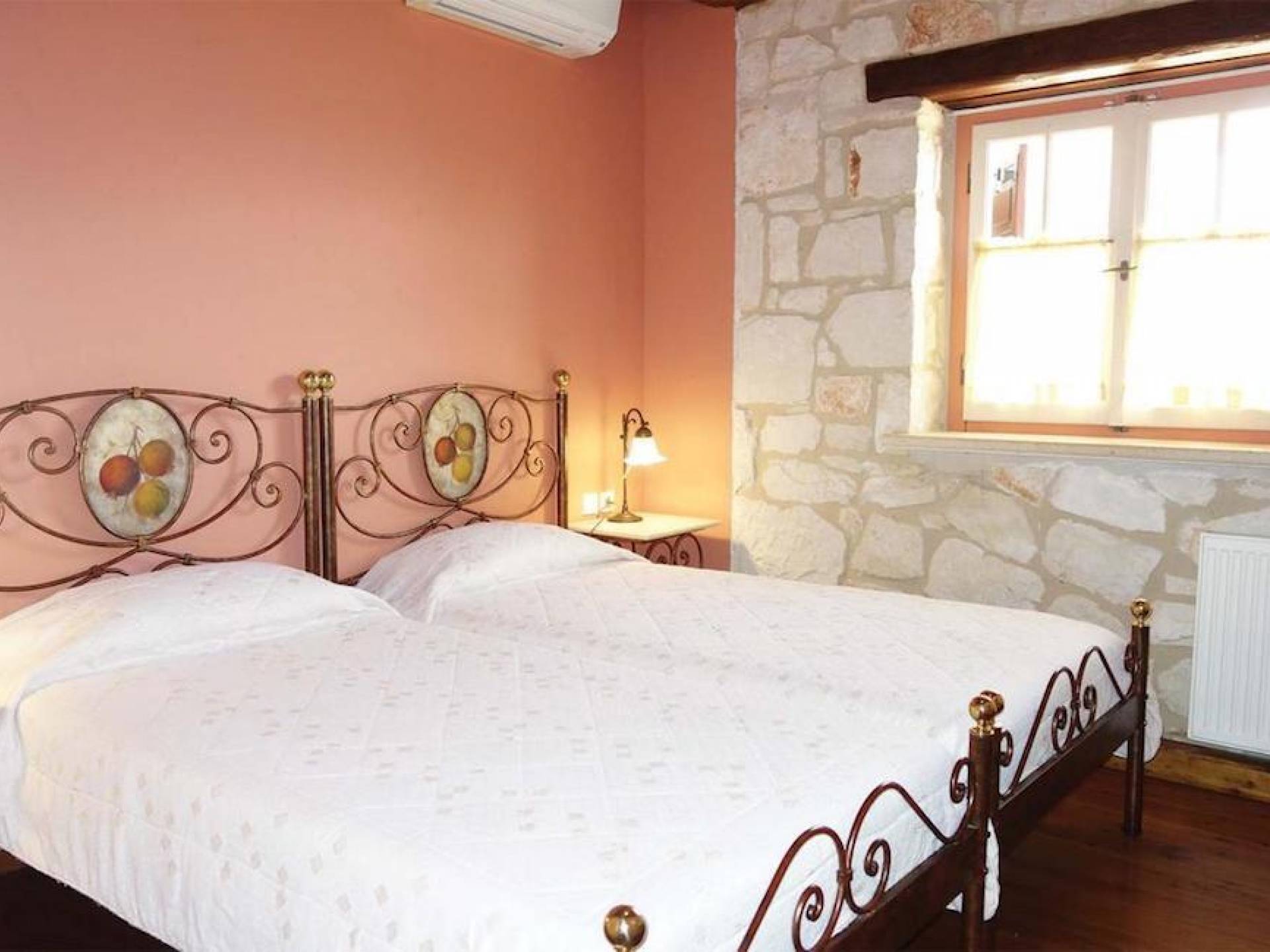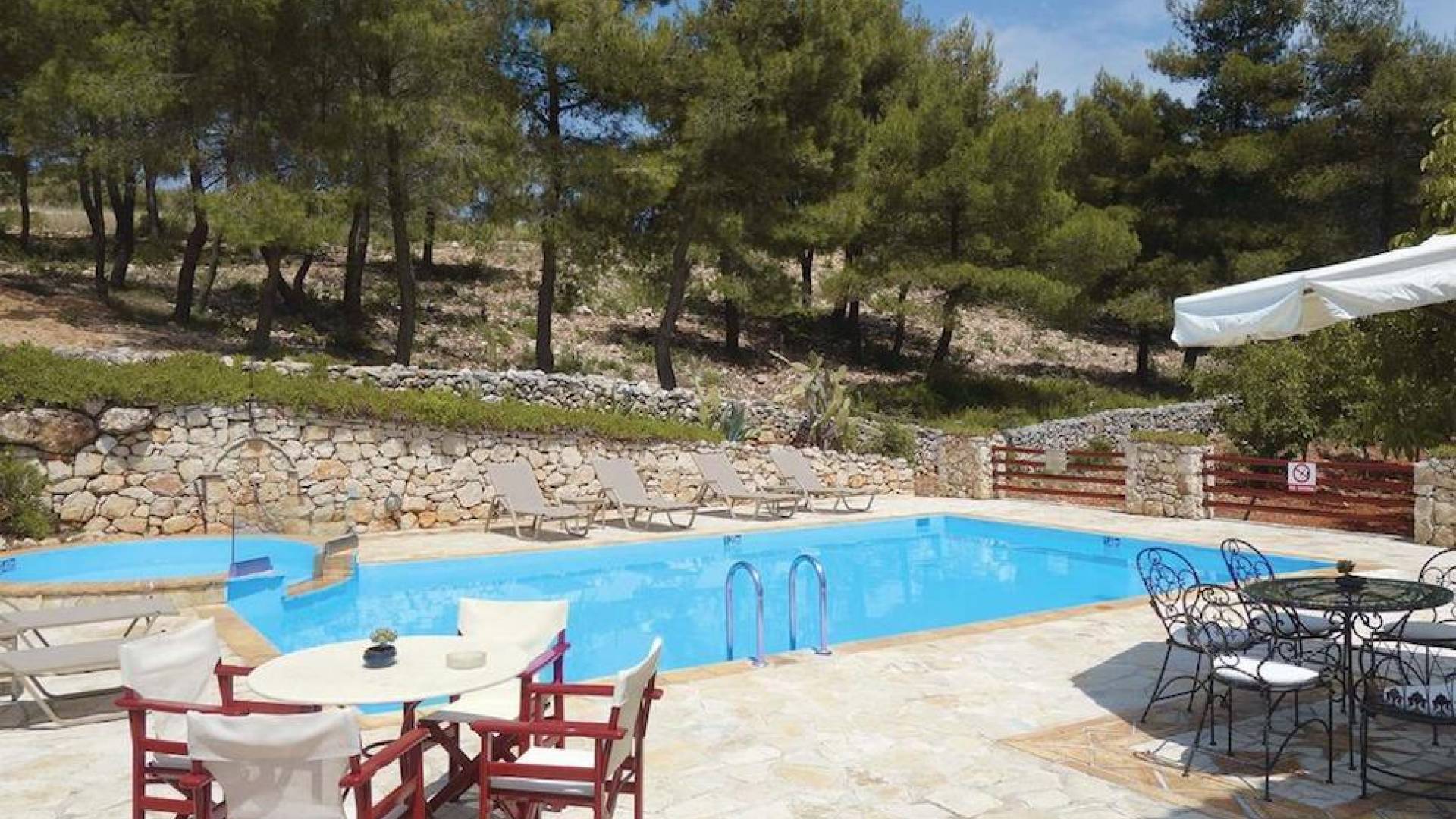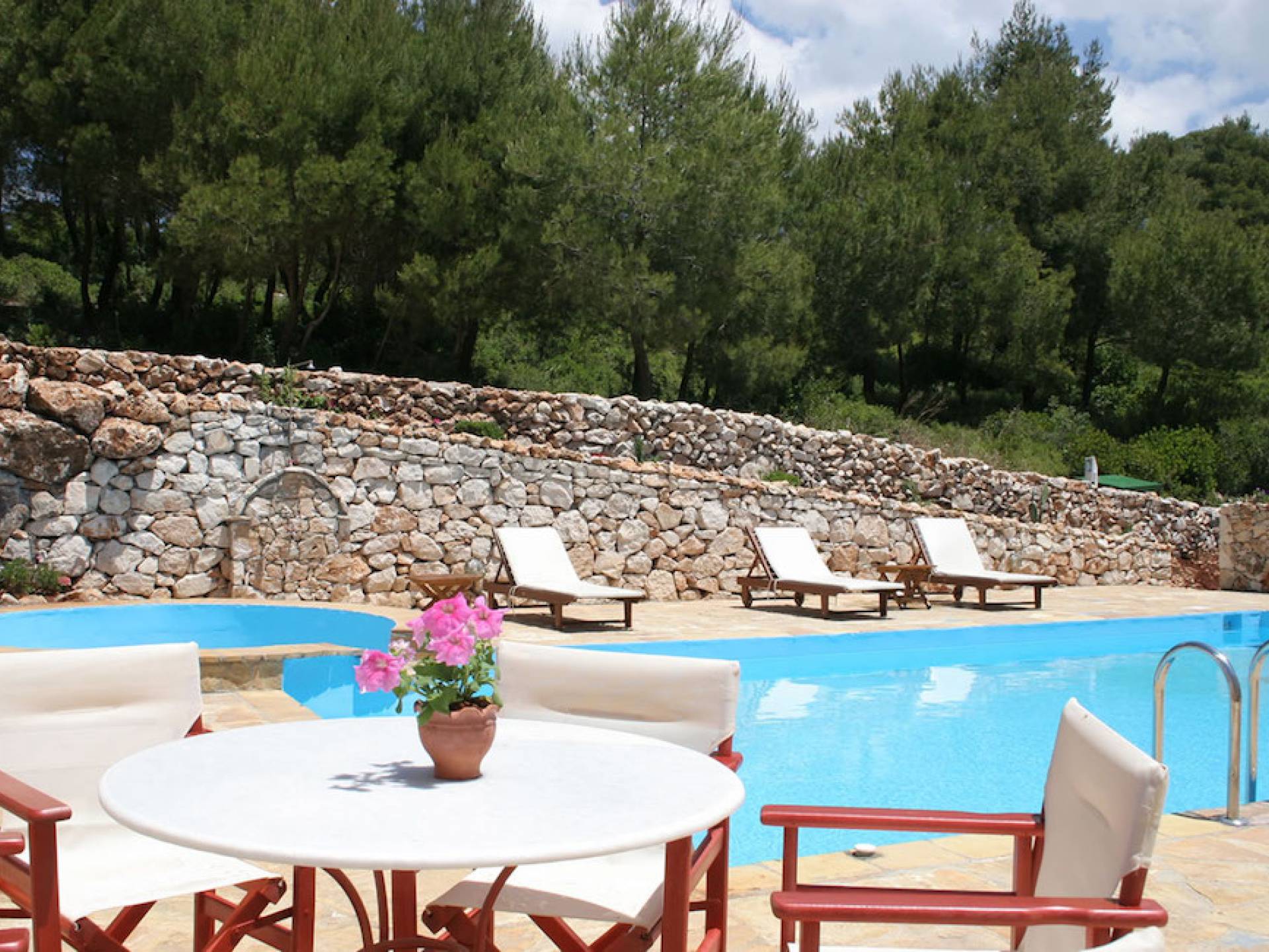 Set in large gardens, with stone walls providing total privacy, the villas do not overlook each other and command superb views above green olive groves, vineyards, and dense pinewood to the Adriatic sea. Local craftsmen worked with care and the old traditional way to create an outcome that combines modern comforts with the traditional style of the mountainous village houses. Stone and pine floors, cypress wood beams, period furniture, stylish wrought-iron dining chairs and bedsteads, lace curtains, art pieces by Karla Gerdau and Asimakis Chanionis, incidental furniture all add to the character of these lovely villas.