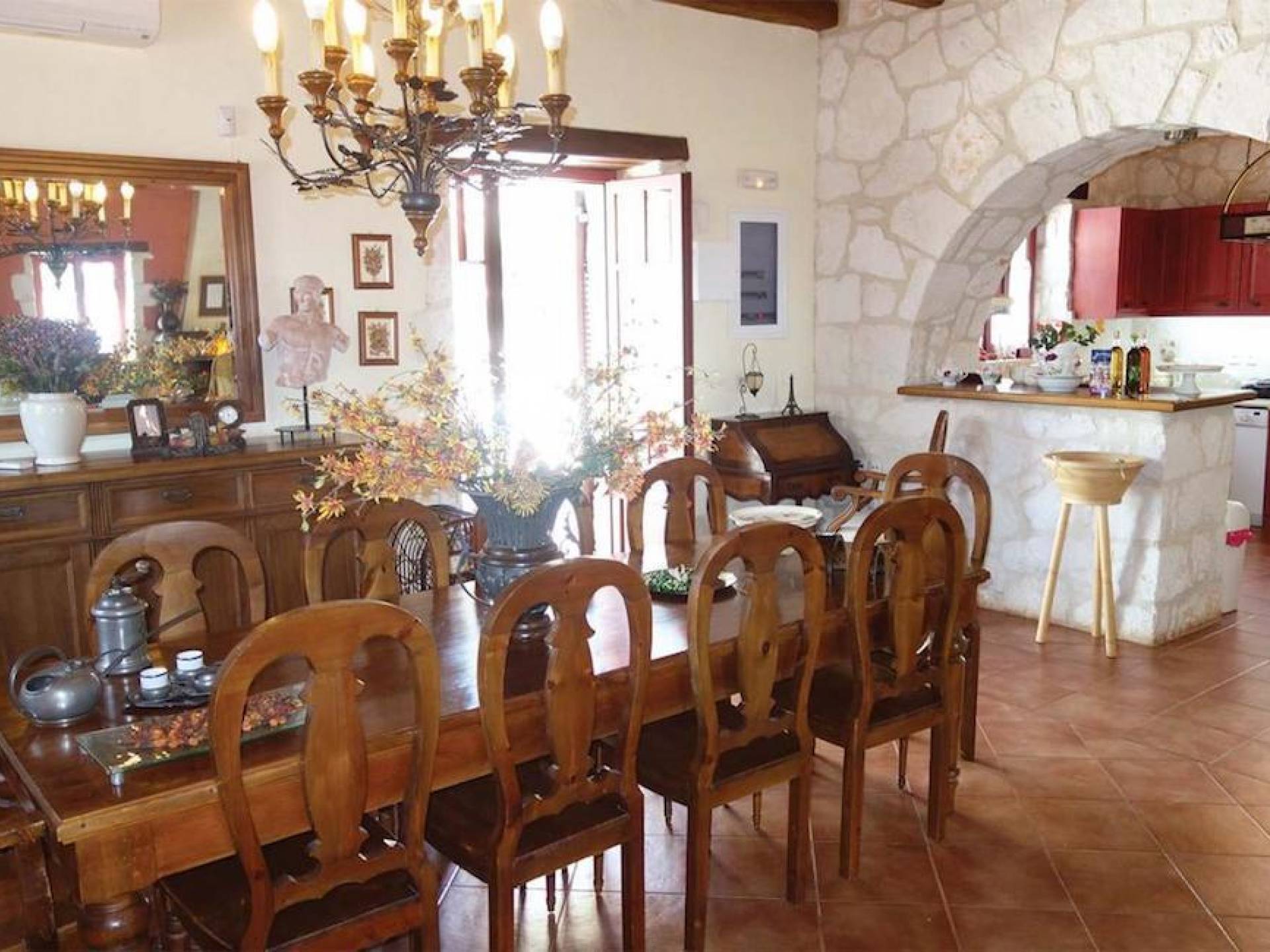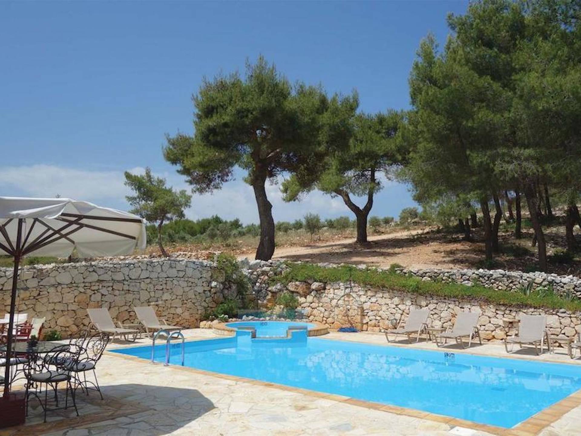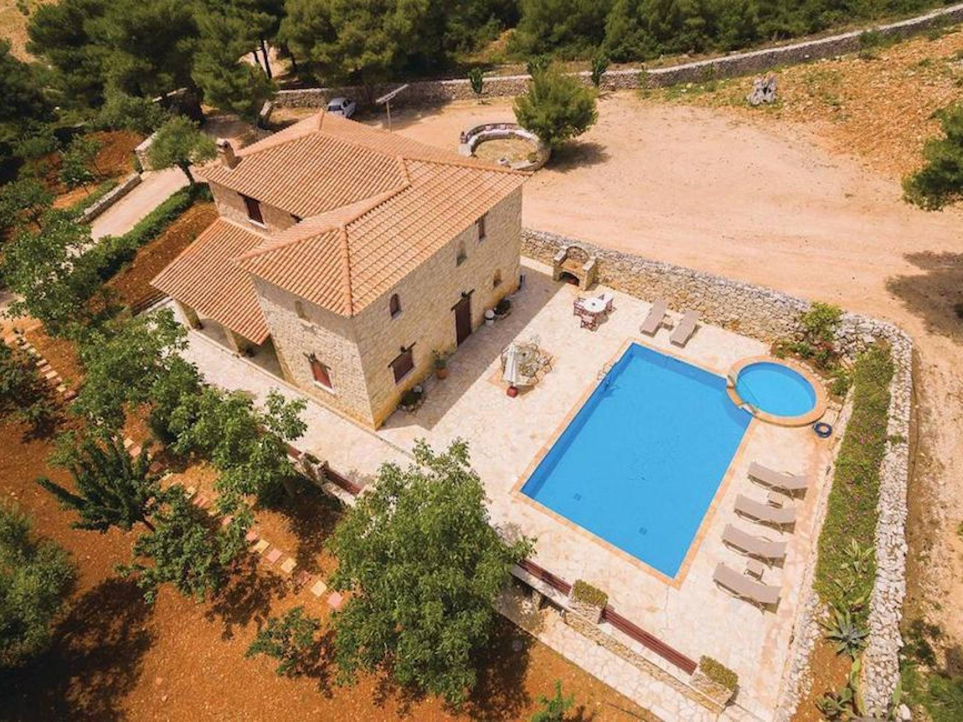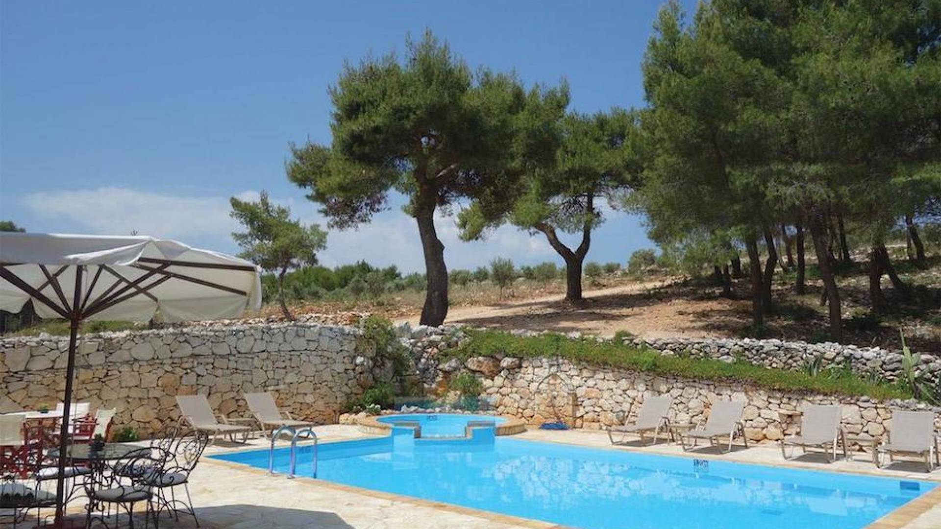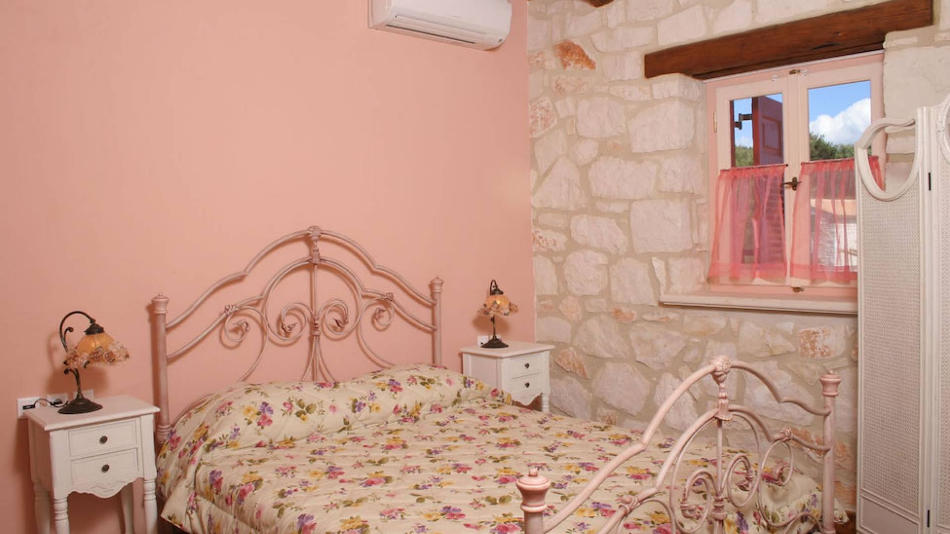 Set in large gardens, with stone walls providing total privacy, the villas do not overlook each other and command superb views above green olive groves, vineyards, and dense pinewood to the Adriatic sea. Local craftsmen worked with care and the old traditional way to create an outcome that combines modern comforts with the traditional style of the mountainous village houses. Stone and pine floors, cypress wood beams, period furniture, stylish wrought-iron dining chairs and bedsteads, lace curtains, art pieces by Karla Gerdau and Asimakis Chanionis, incidental furniture all add to the character of these lovely villas.