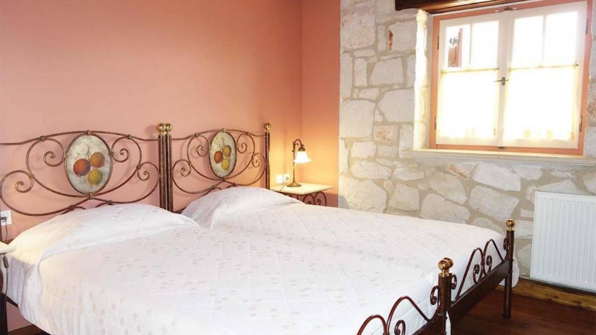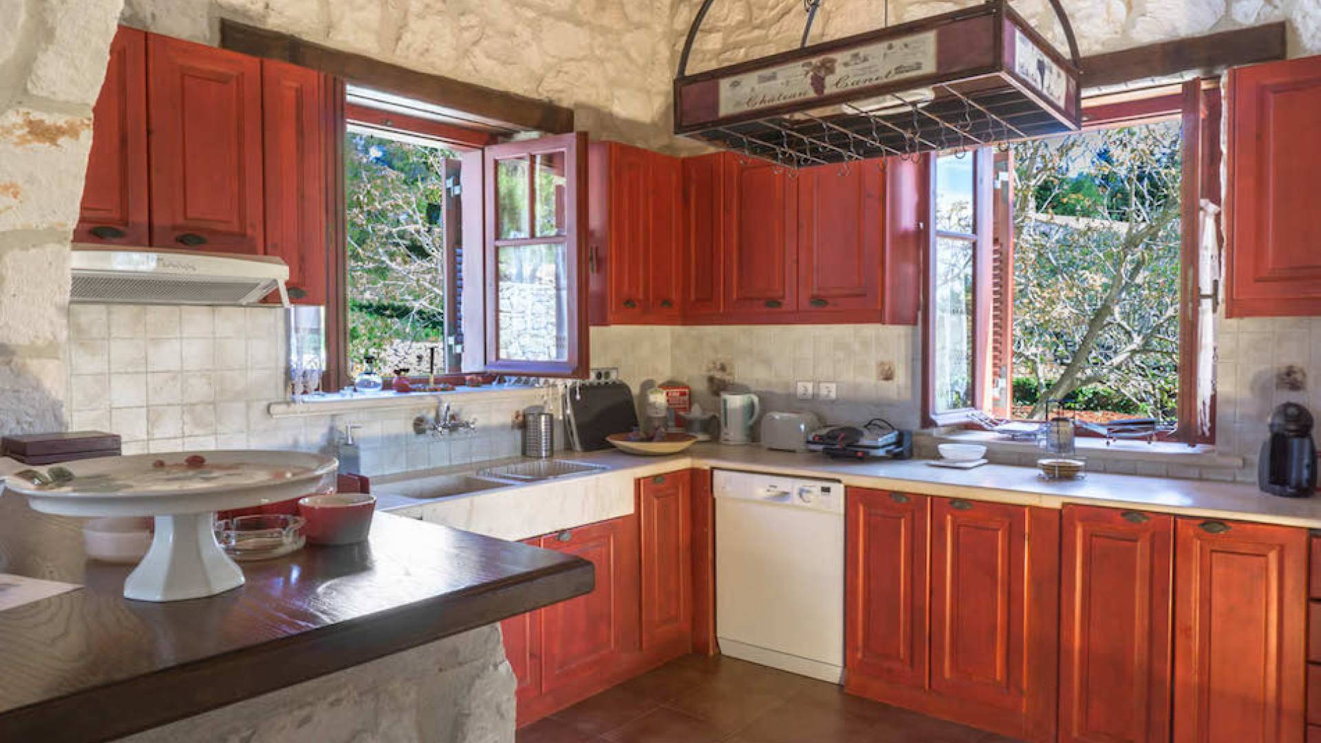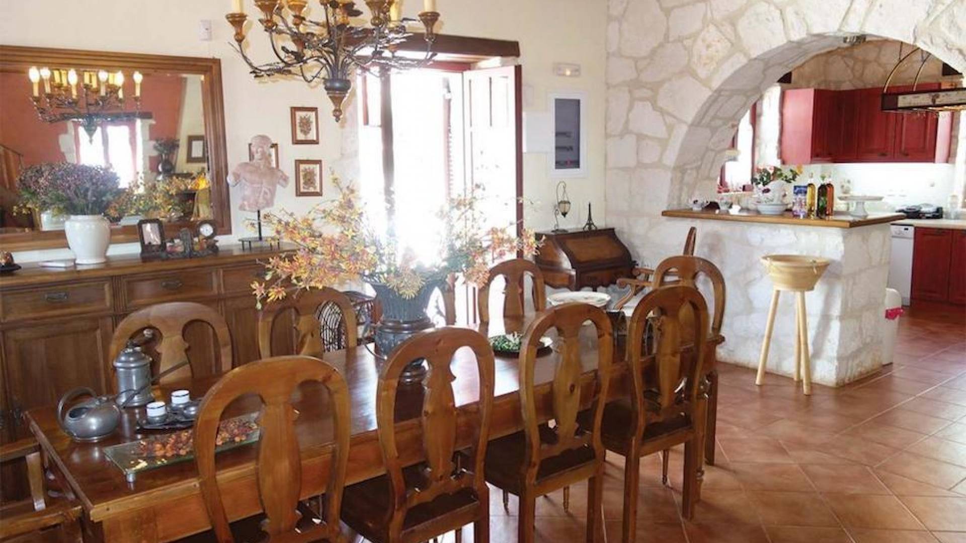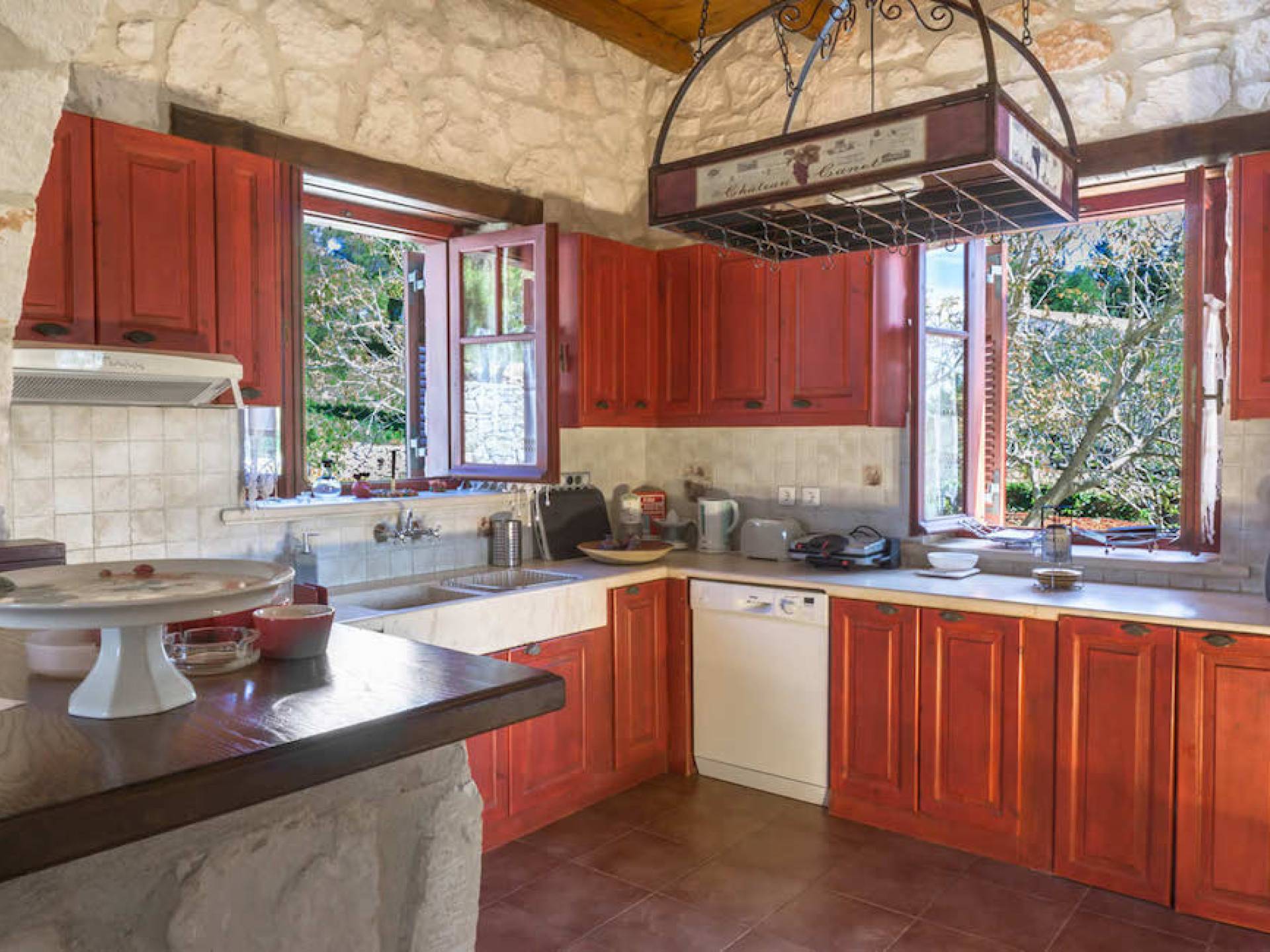 Set in large gardens, with stone walls providing total privacy, the villas do not overlook each other and command superb views above green olive groves, vineyards, and dense pinewood to the Adriatic sea. Local craftsmen worked with care and the old traditional way to create an outcome that combines modern comforts with the traditional style of the mountainous village houses. Stone and pine floors, cypress wood beams, period furniture, stylish wrought-iron dining chairs and bedsteads, lace curtains, art pieces by Karla Gerdau and Asimakis Chanionis, incidental furniture all add to the character of these lovely villas.