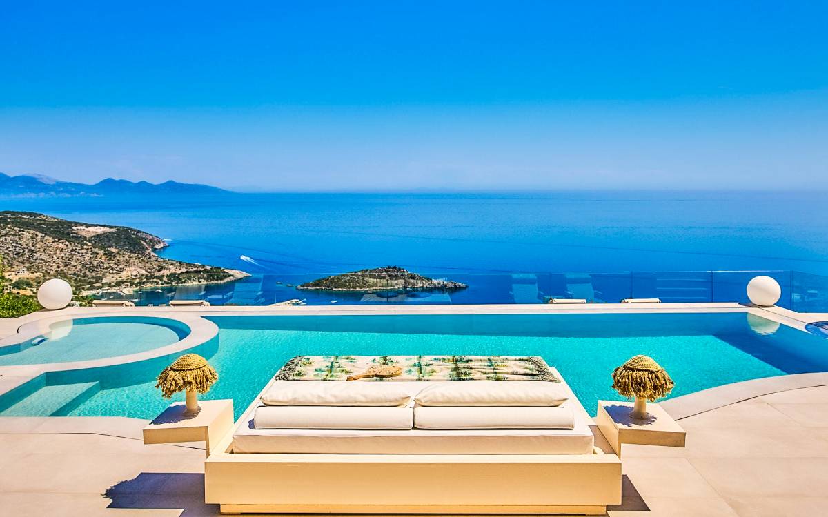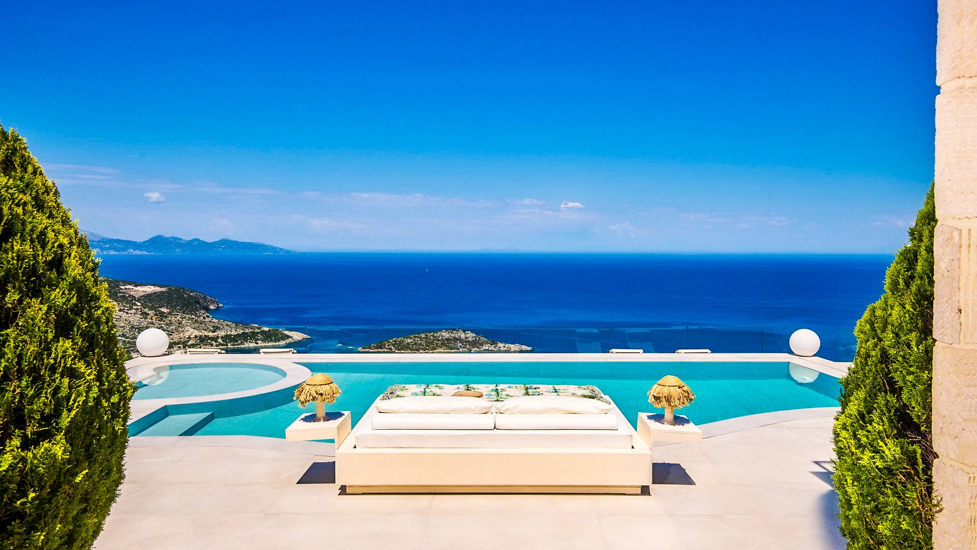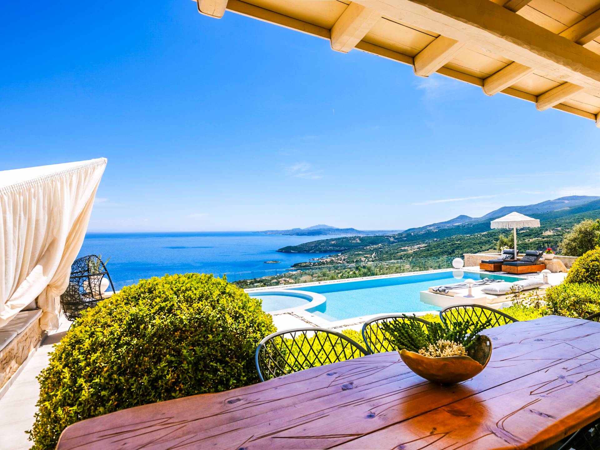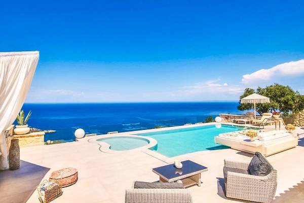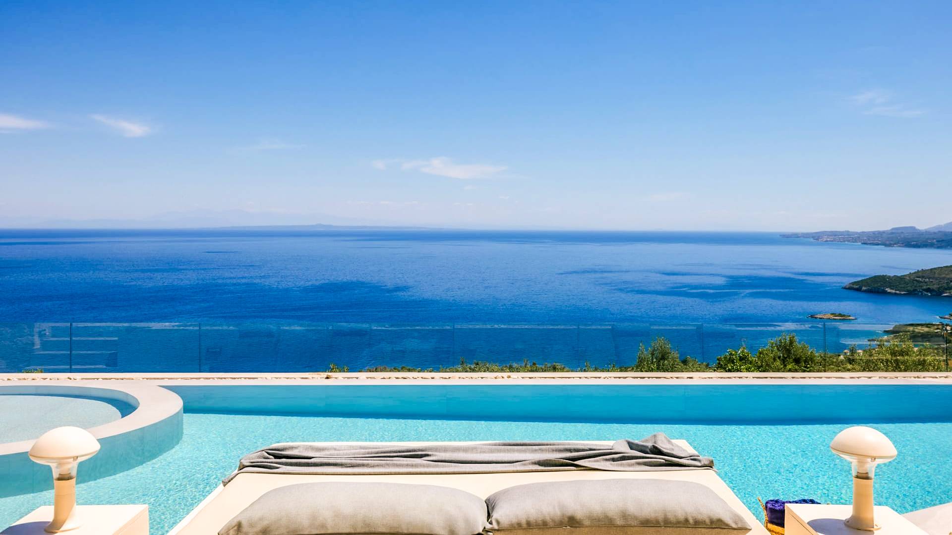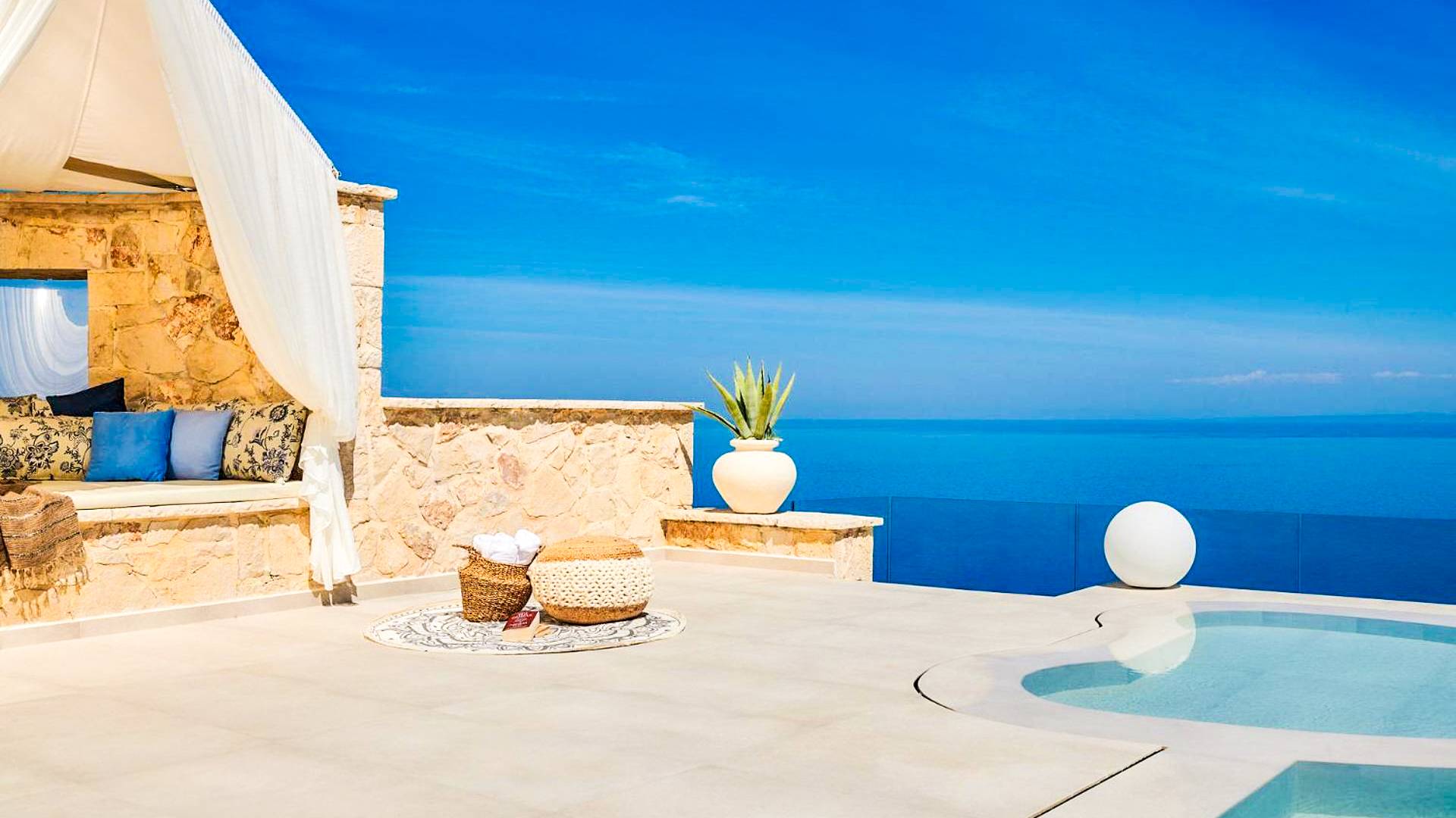 The outside of Emerald Deluxe Villa Zante is designed to offer you maximum privacy and unobstructed views over the Ionian Sea There is a swimming pool with hydro massage for up to four people, children’s pool, playground, lounge area, dining area, built BBQ, shower with cold/hot water, sunbeds and parasols.