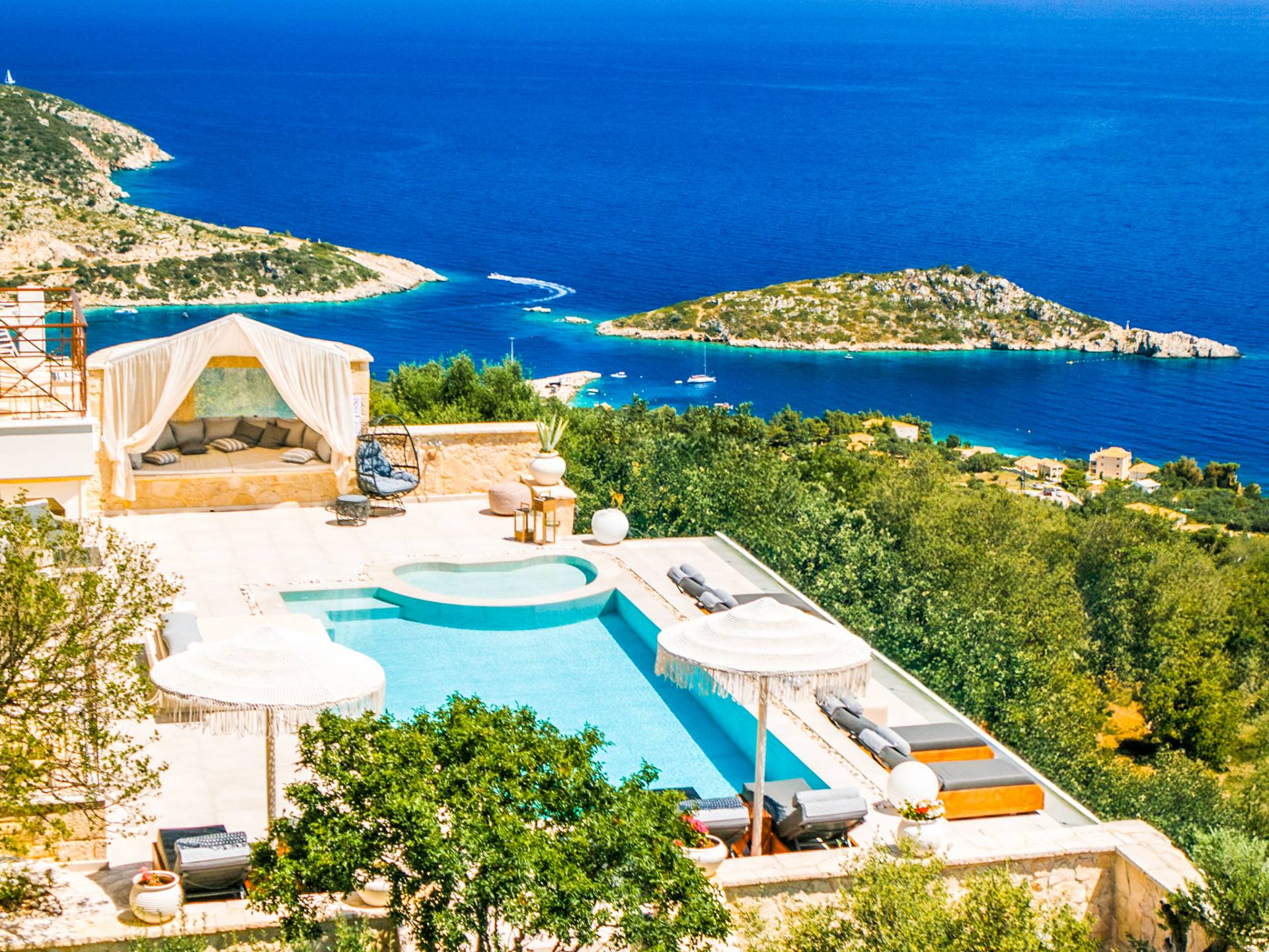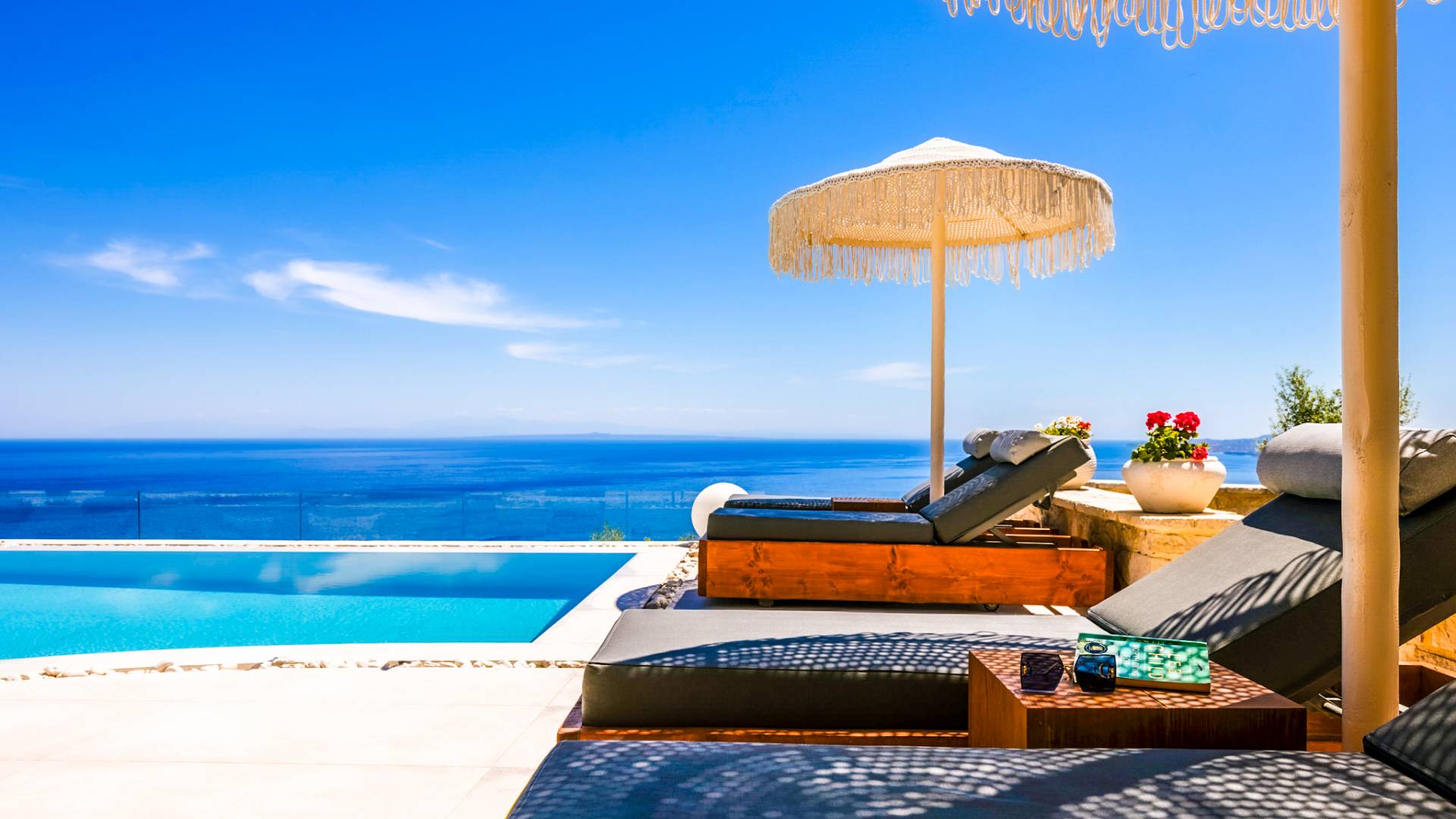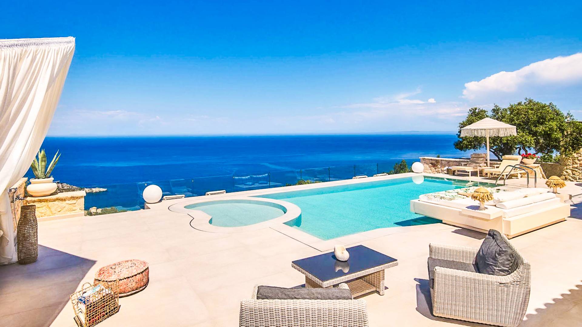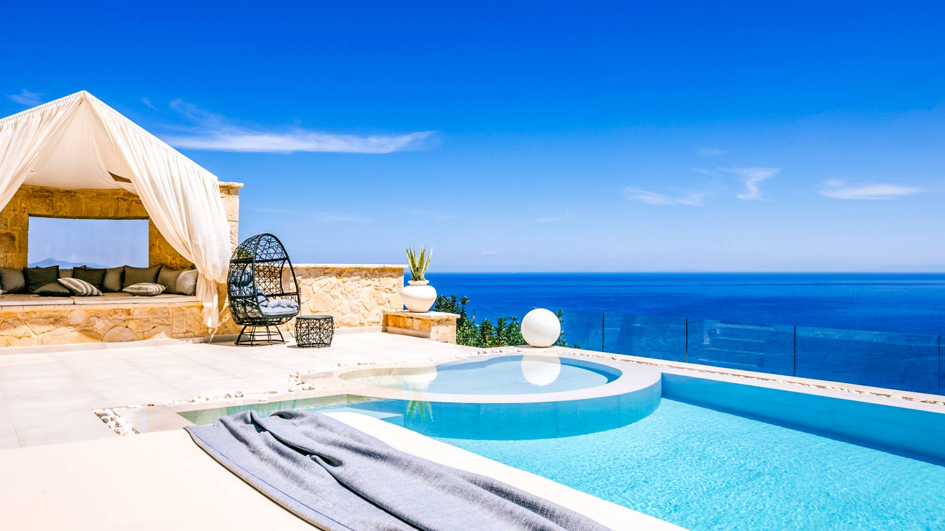 The outside of Emerald Deluxe Villa Zante is designed to offer you maximum privacy and unobstructed views over the Ionian Sea There is a swimming pool with hydro massage for up to four people, children’s pool, playground, lounge area, dining area, built BBQ, shower with cold/hot water, sunbeds and parasols.