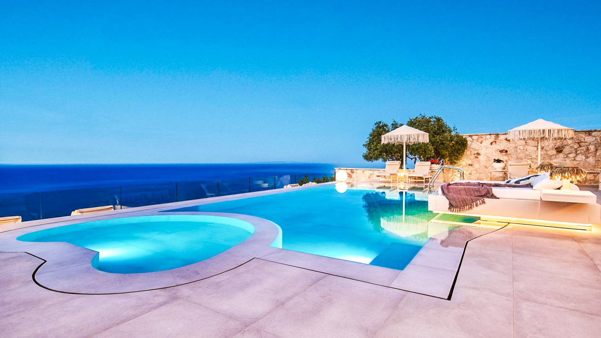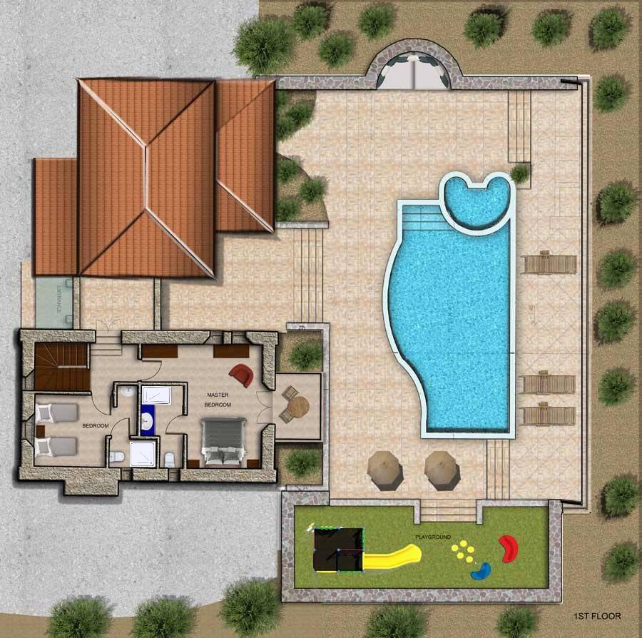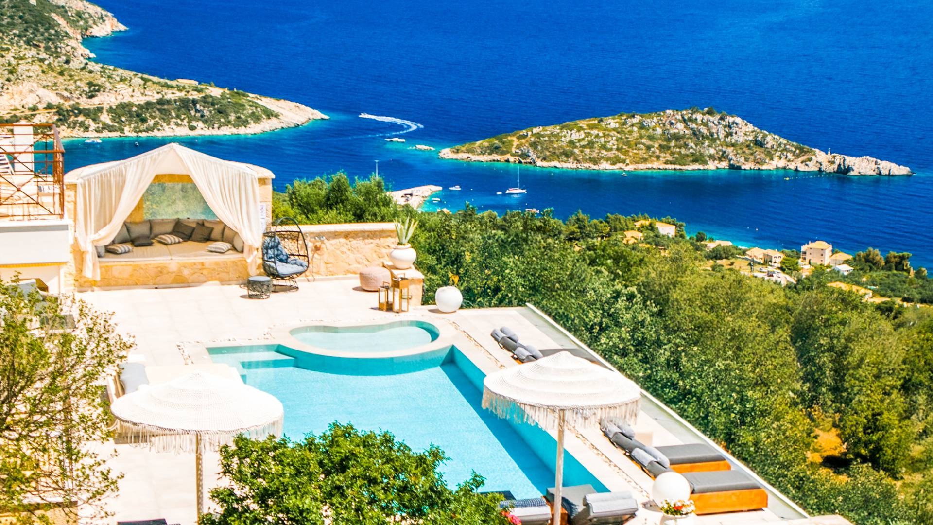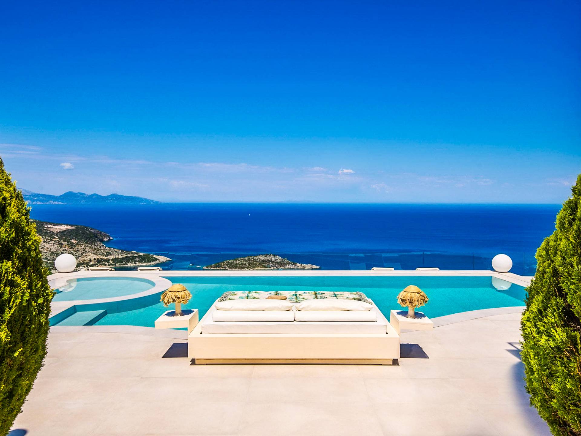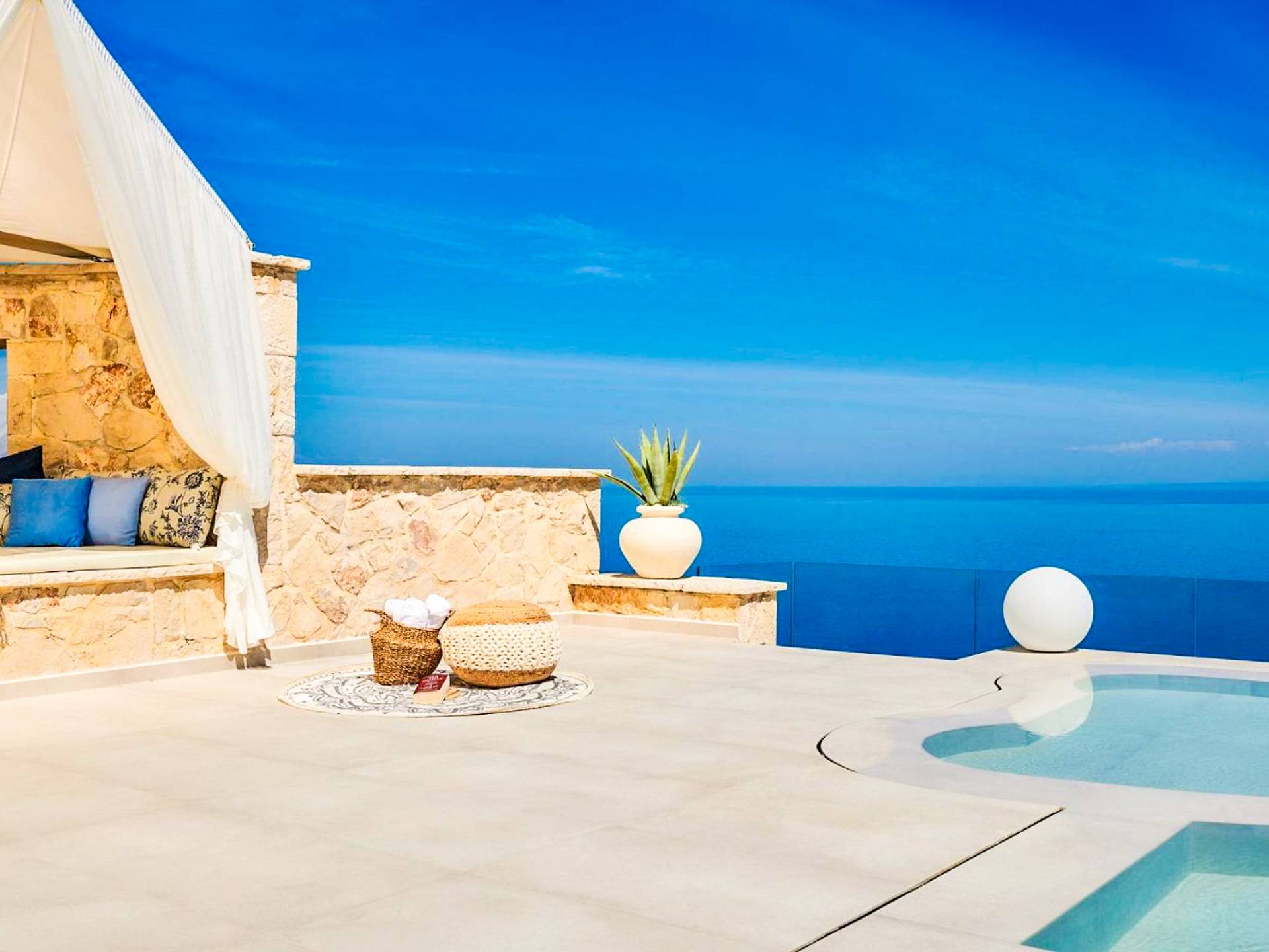 The outside of Emerald Deluxe Villa Zante is designed to offer you maximum privacy and unobstructed views over the Ionian Sea There is a swimming pool with hydro massage for up to four people, children’s pool, playground, lounge area, dining area, built BBQ, shower with cold/hot water, sunbeds and parasols.