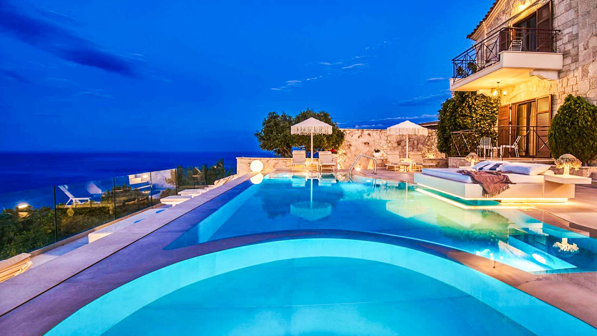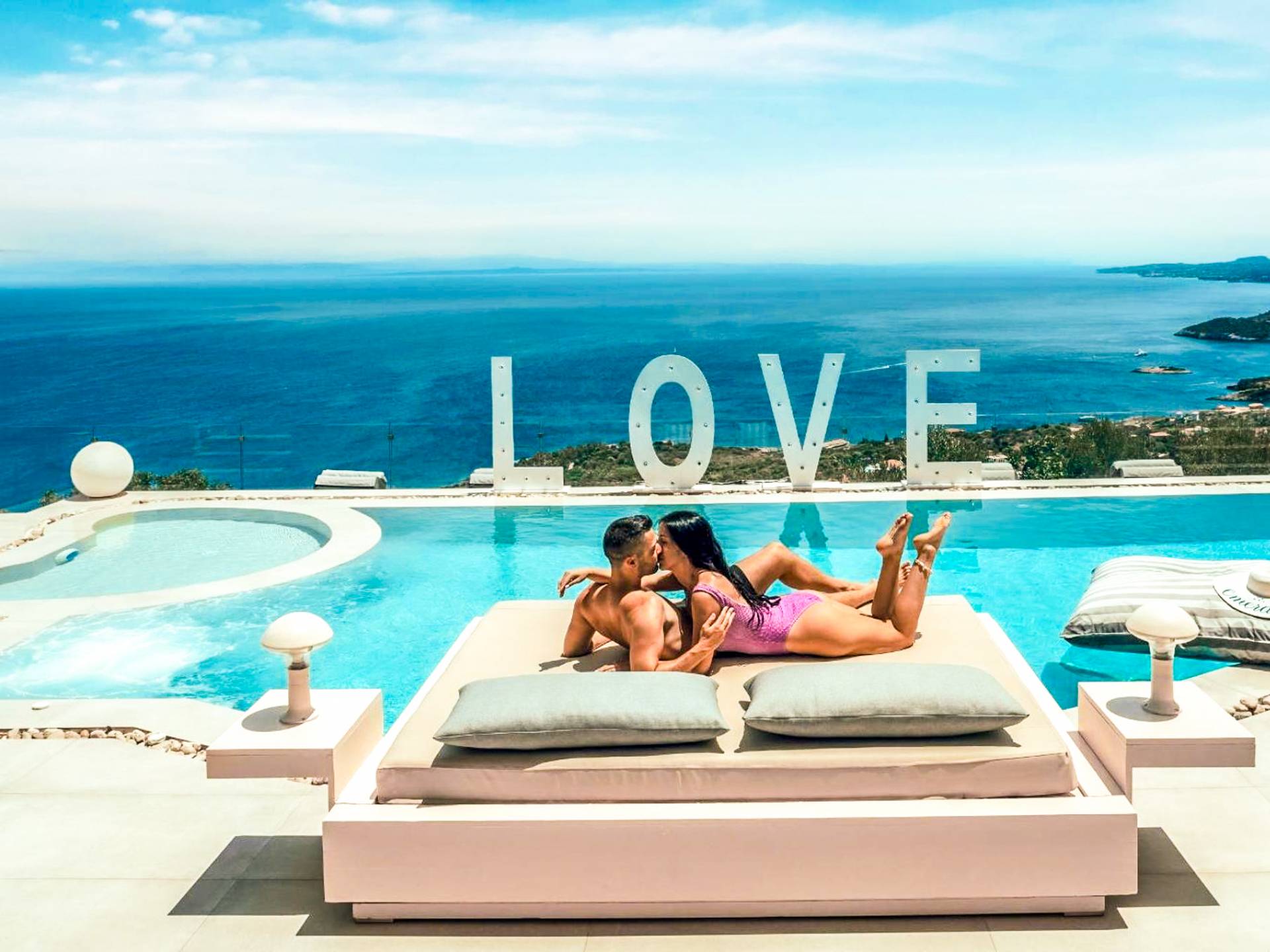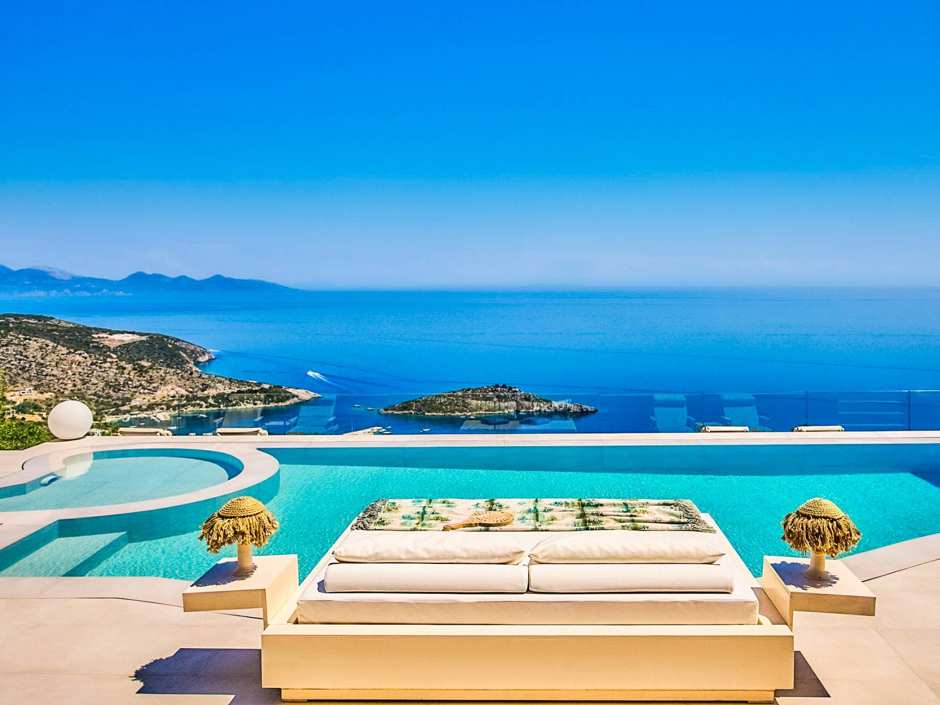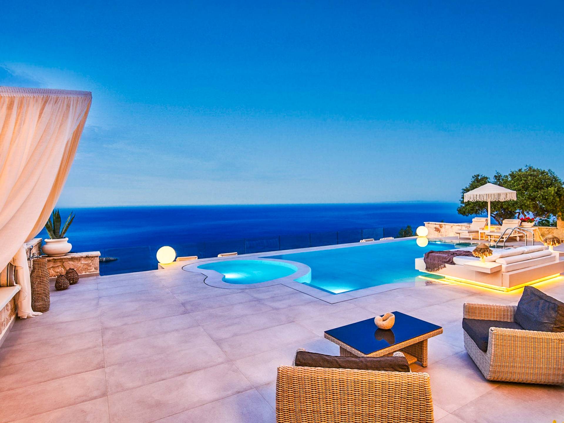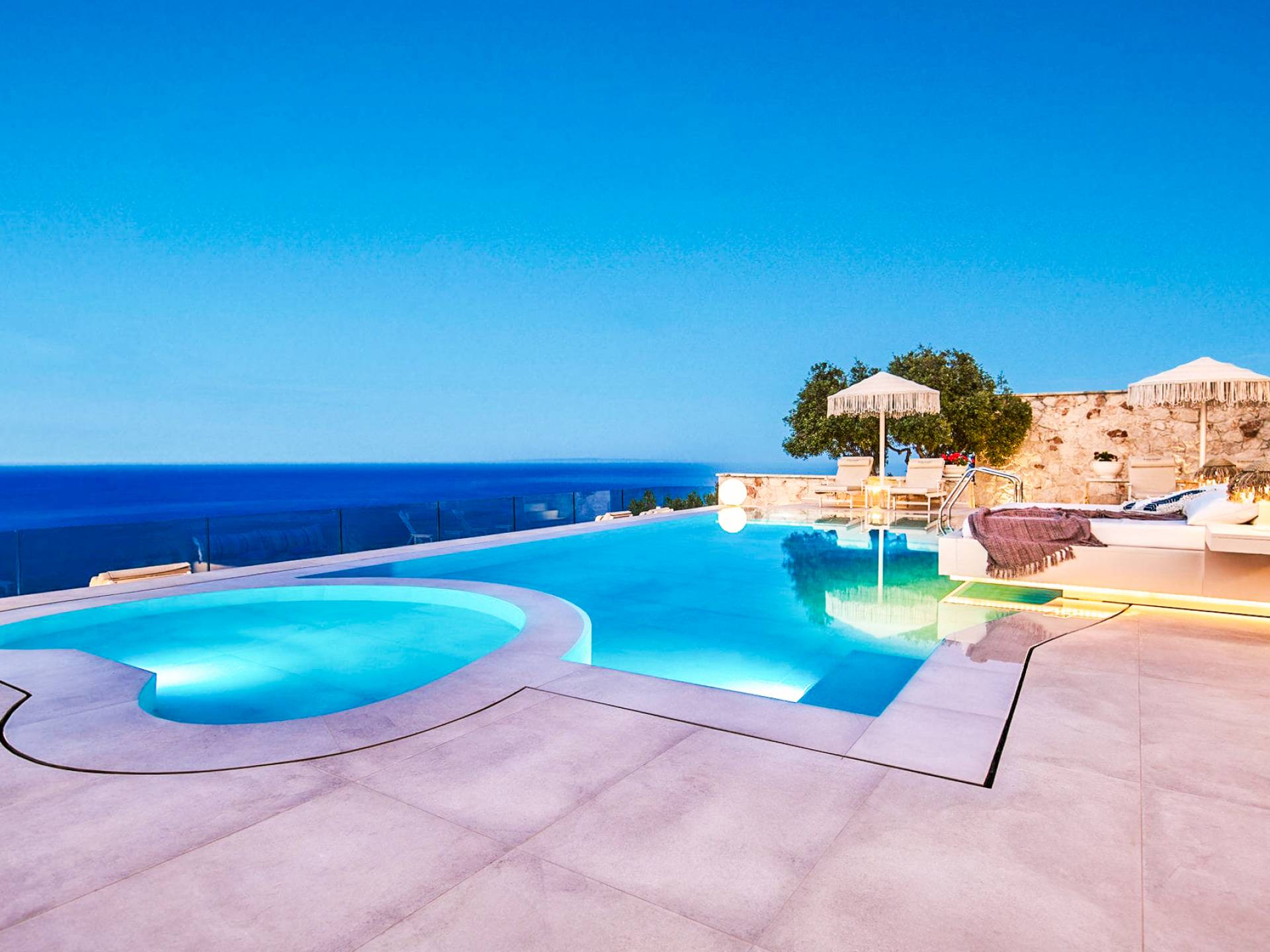 The outside of Emerald Deluxe Villa Zante is designed to offer you maximum privacy and unobstructed views over the Ionian Sea There is a swimming pool with hydro massage for up to four people, children’s pool, playground, lounge area, dining area, built BBQ, shower with cold/hot water, sunbeds and parasols.