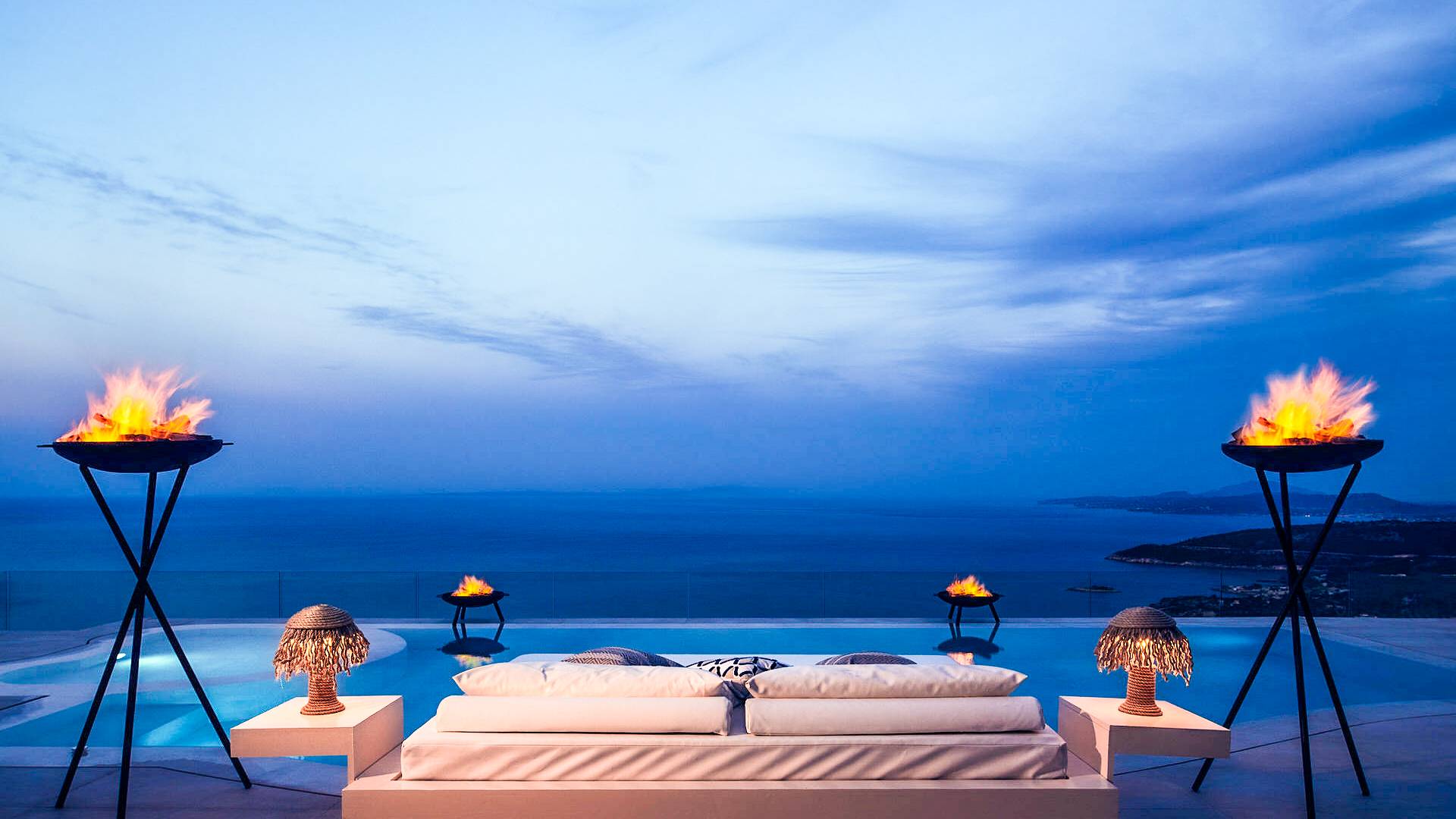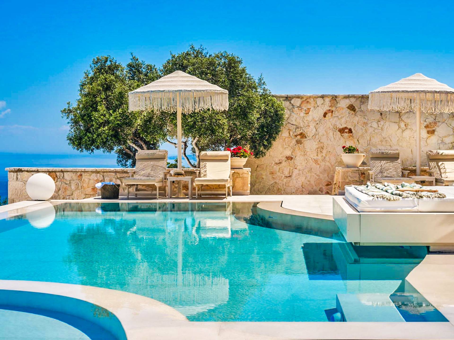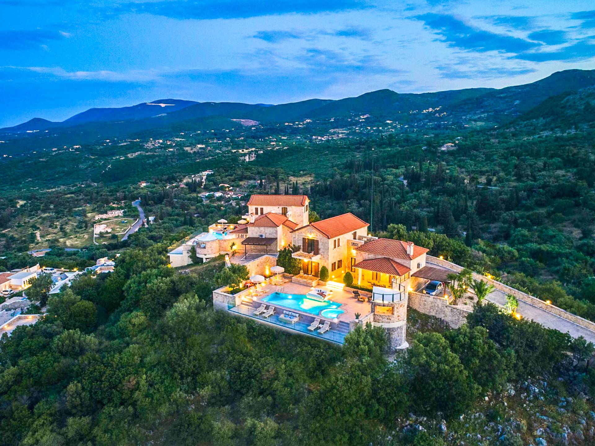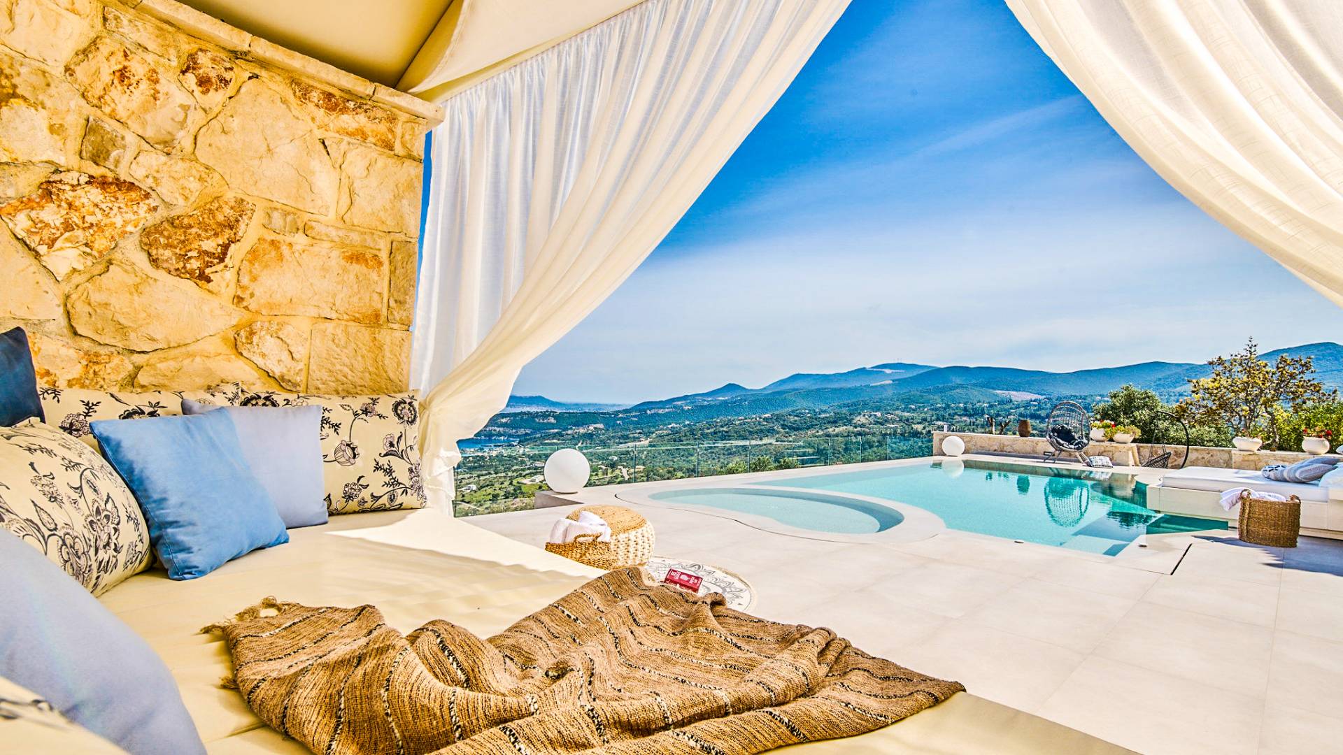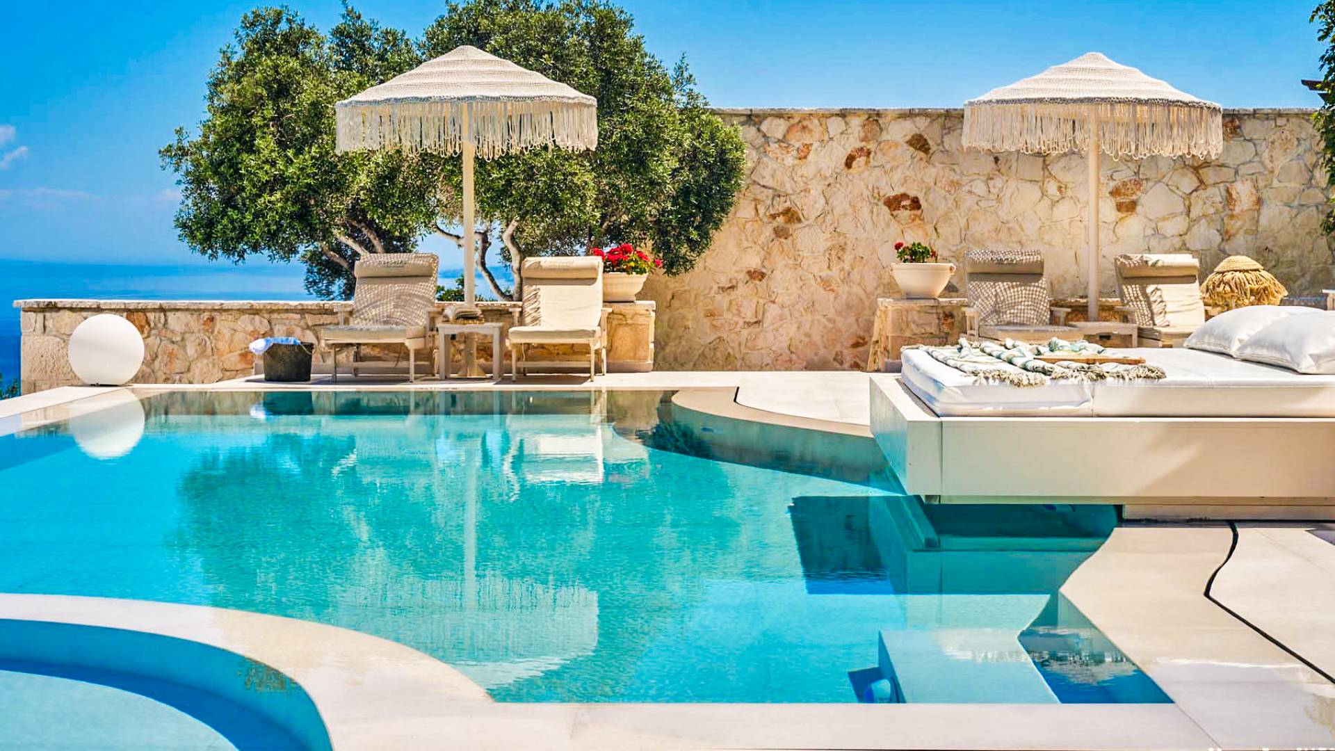 The outside of Emerald Deluxe Villa Zante is designed to offer you maximum privacy and unobstructed views over the Ionian Sea There is a swimming pool with hydro massage for up to four people, children’s pool, playground, lounge area, dining area, built BBQ, shower with cold/hot water, sunbeds and parasols.