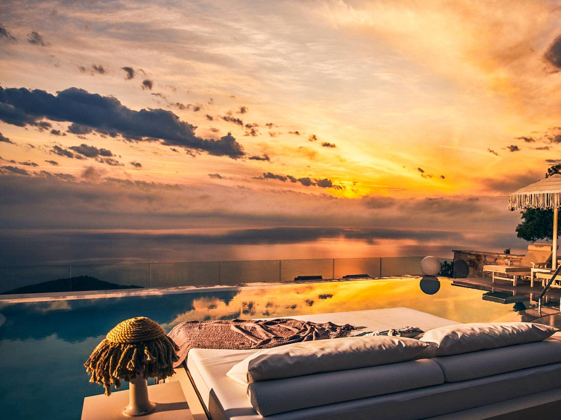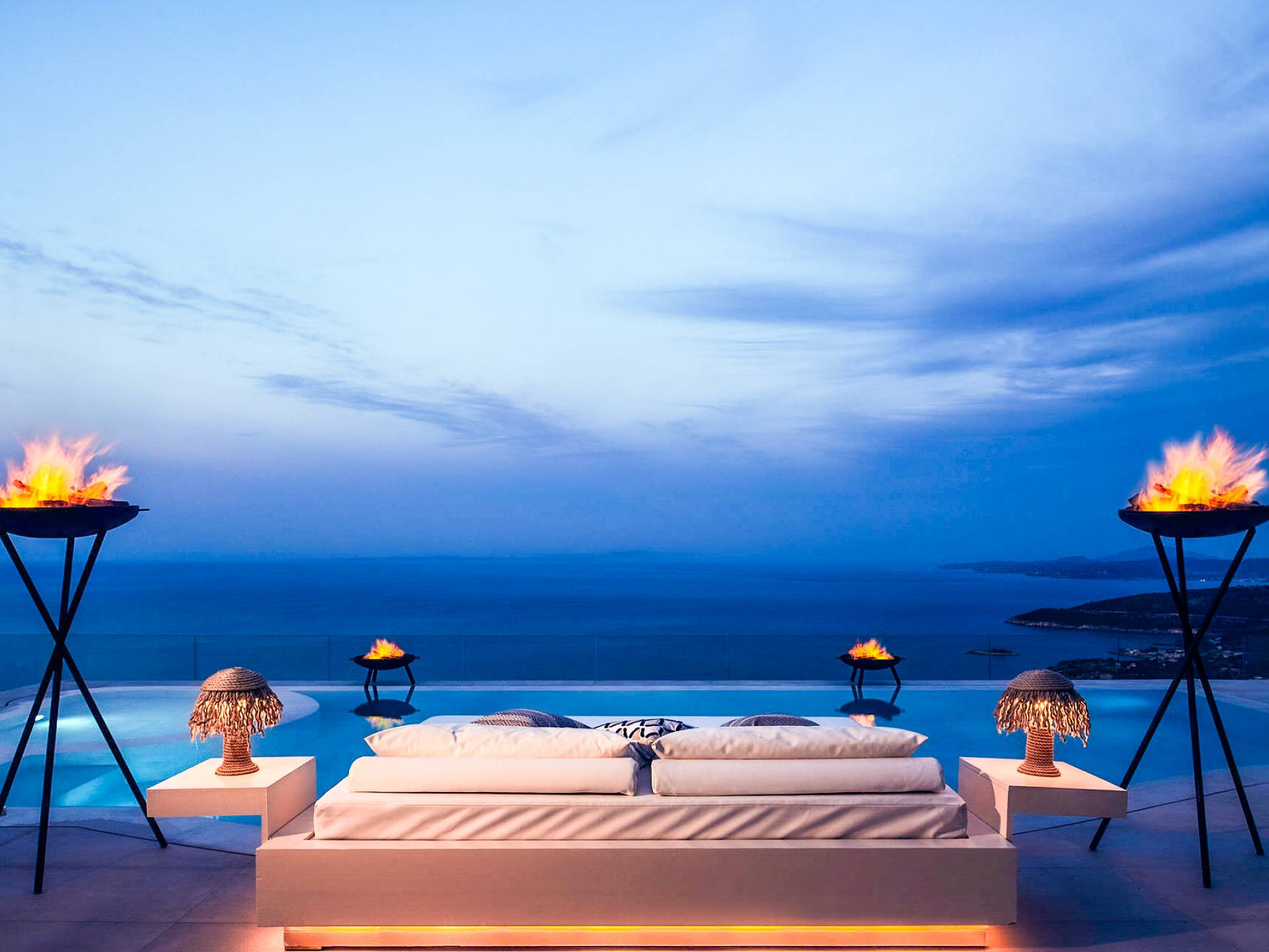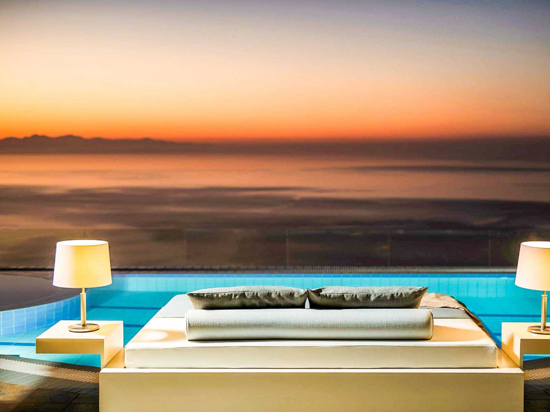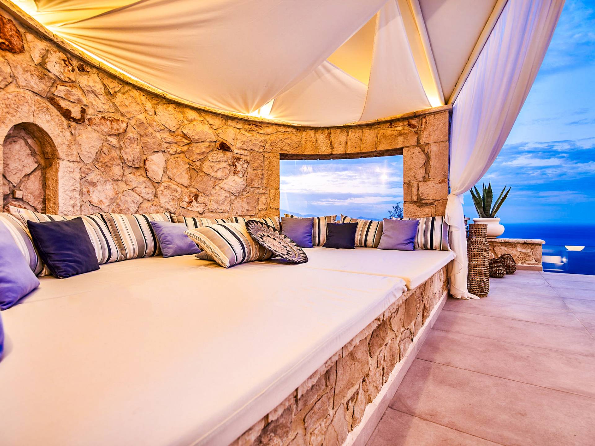 The outside of Emerald Deluxe Villa Zante is designed to offer you maximum privacy and unobstructed views over the Ionian Sea There is a swimming pool with hydro massage for up to four people, children’s pool, playground, lounge area, dining area, built BBQ, shower with cold/hot water, sunbeds and parasols.