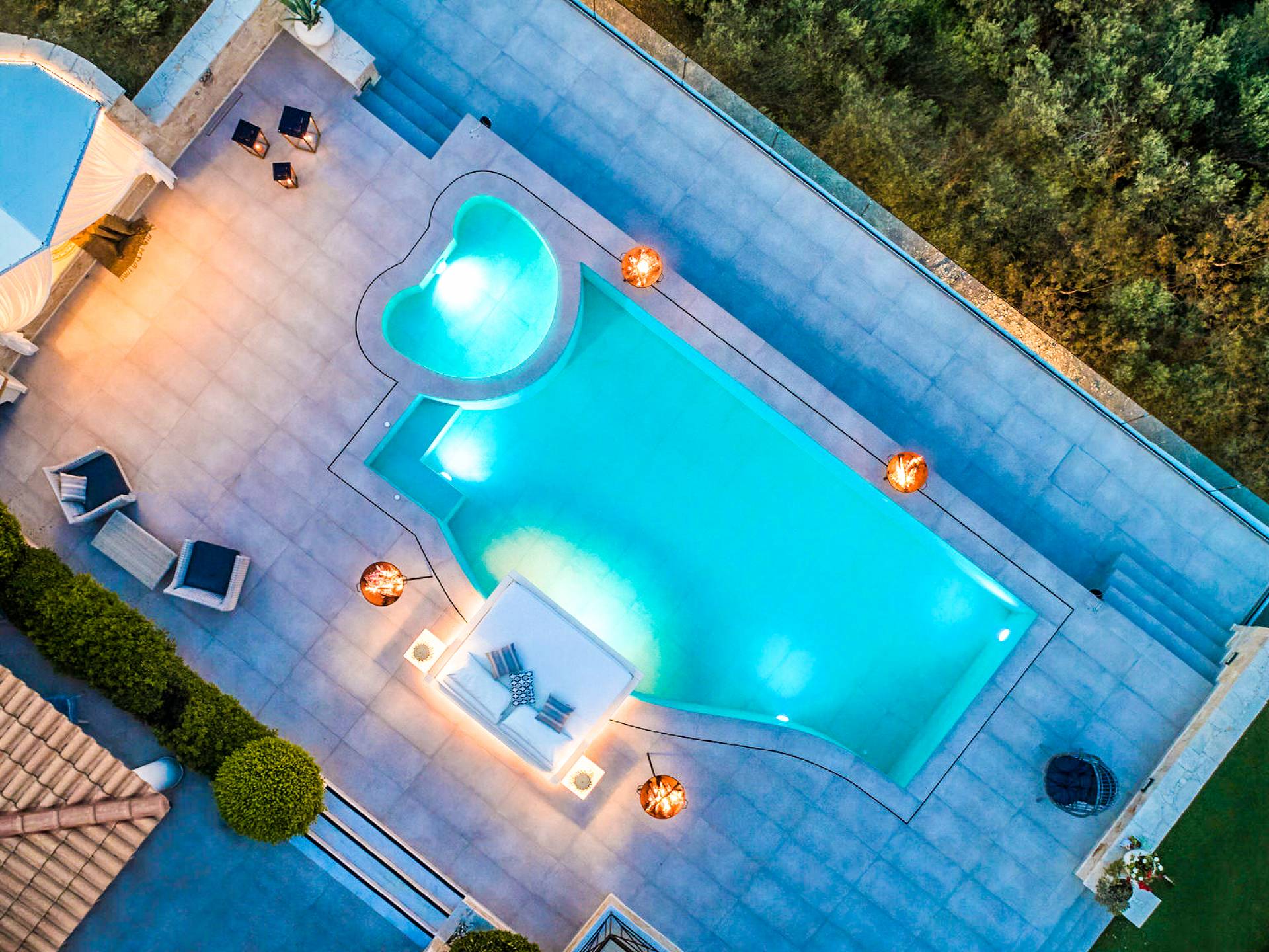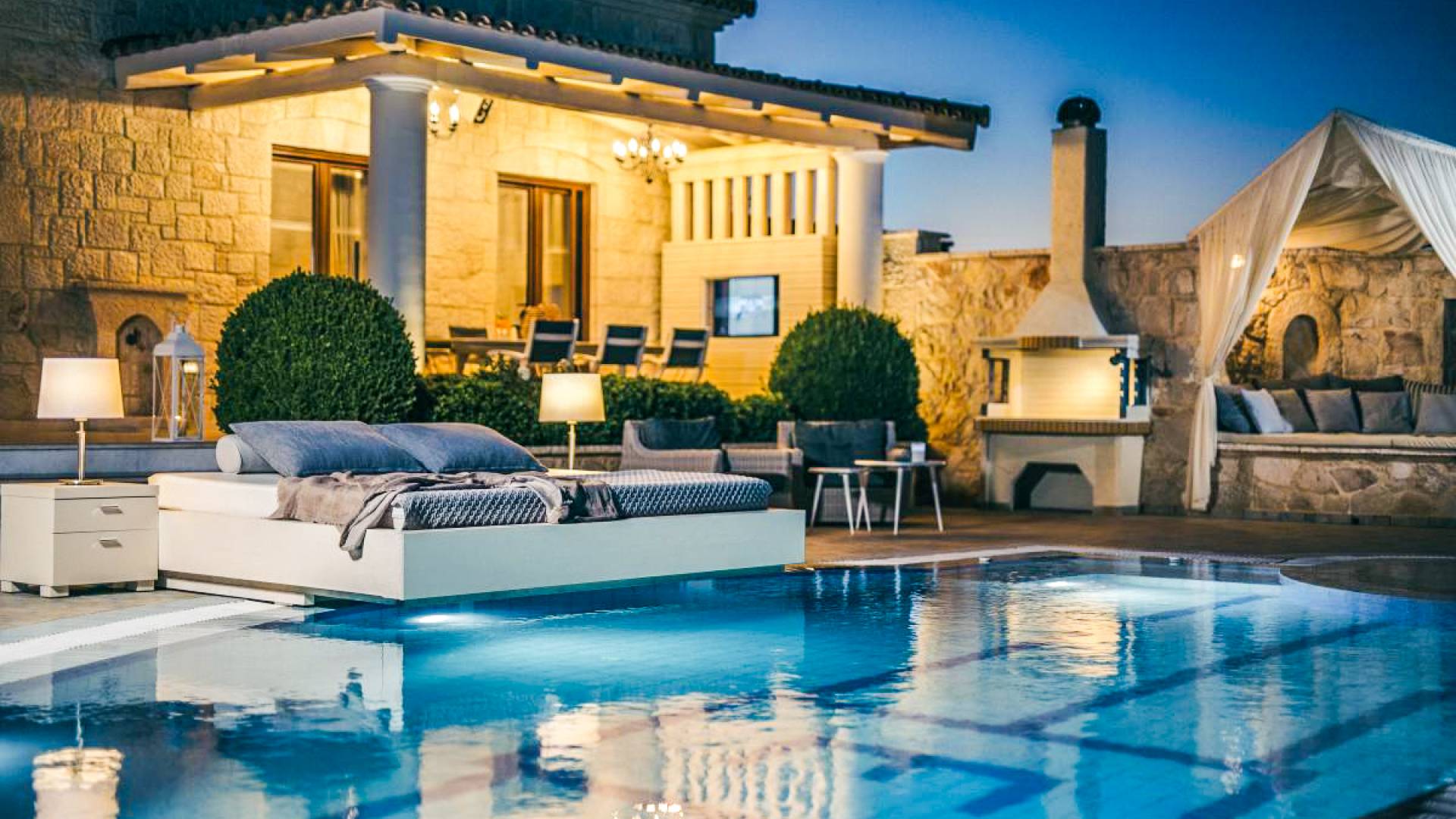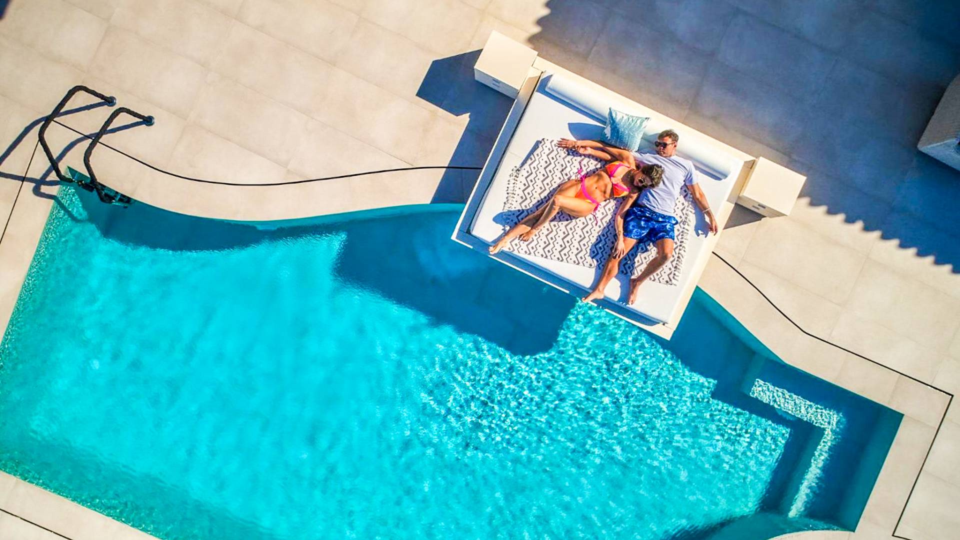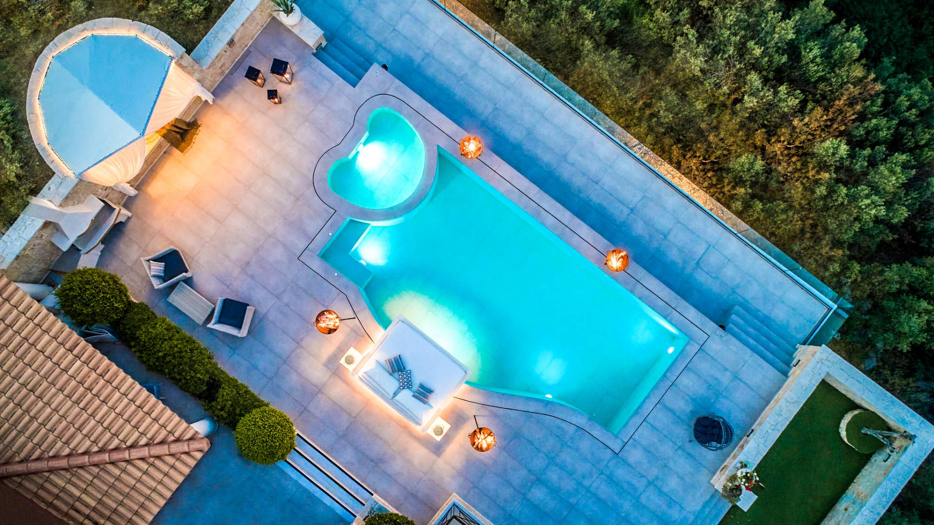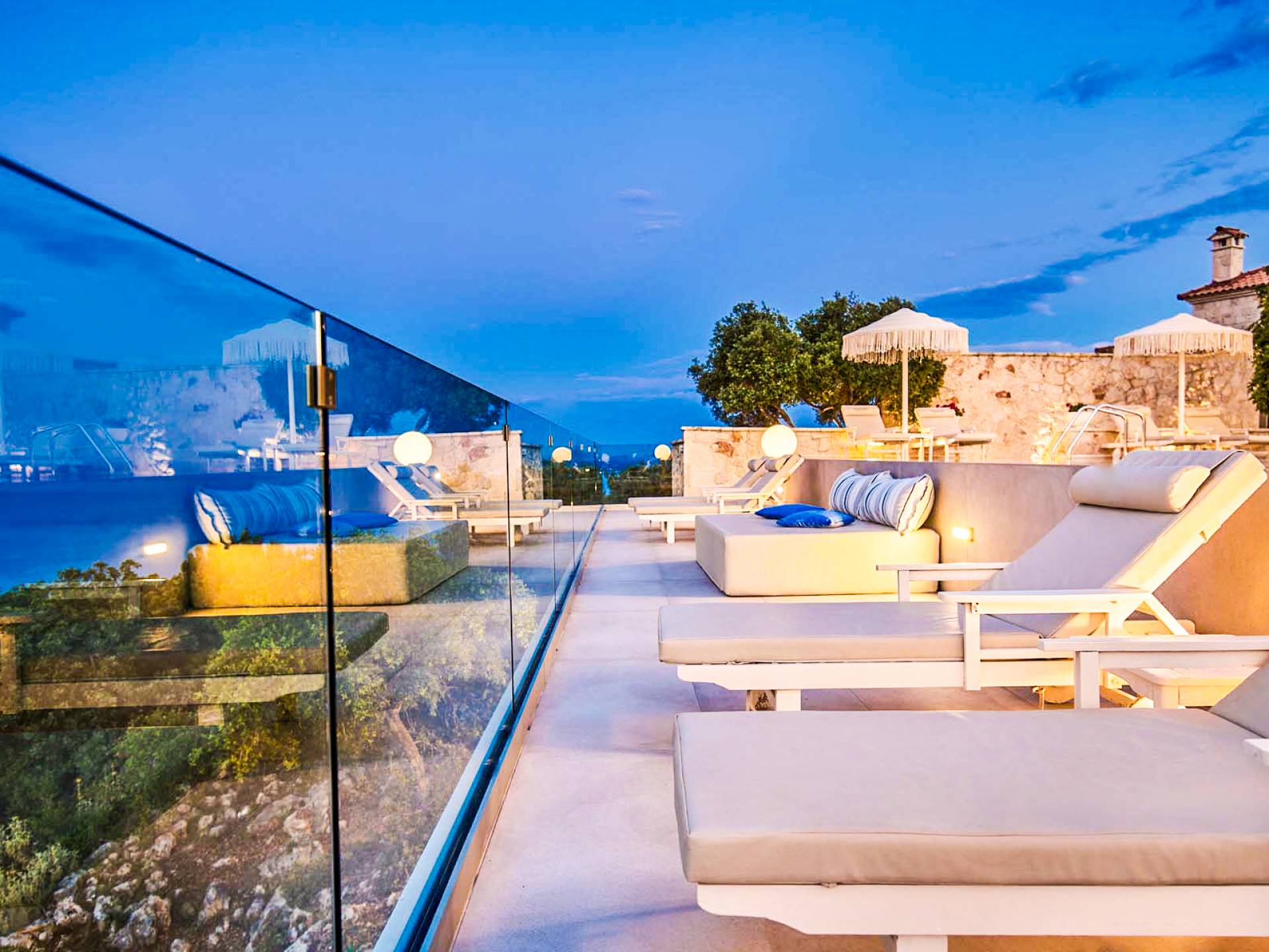 The outside of Emerald Deluxe Villa Zante is designed to offer you maximum privacy and unobstructed views over the Ionian Sea There is a swimming pool with hydro massage for up to four people, children’s pool, playground, lounge area, dining area, built BBQ, shower with cold/hot water, sunbeds and parasols.