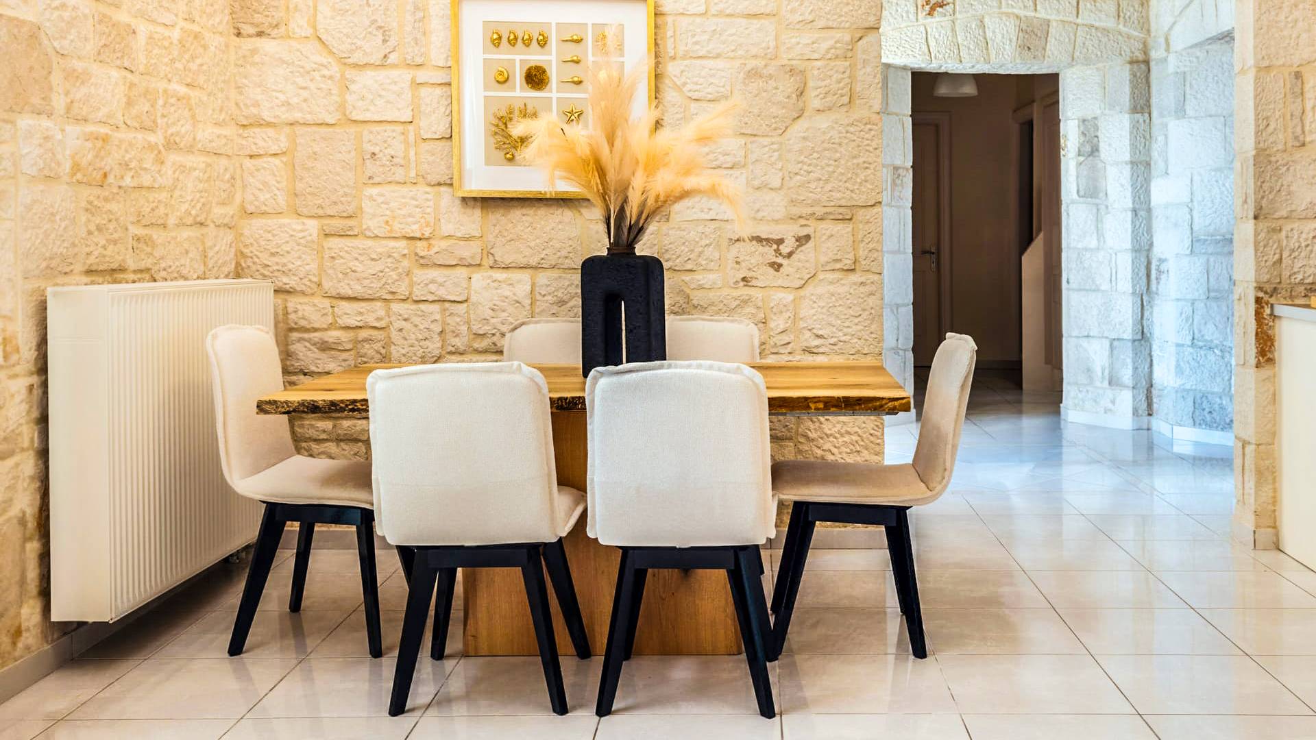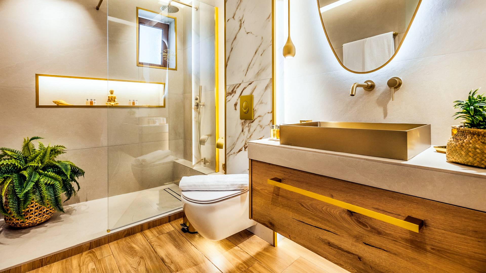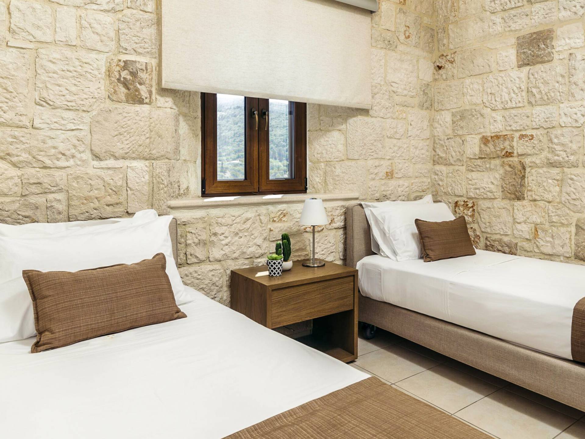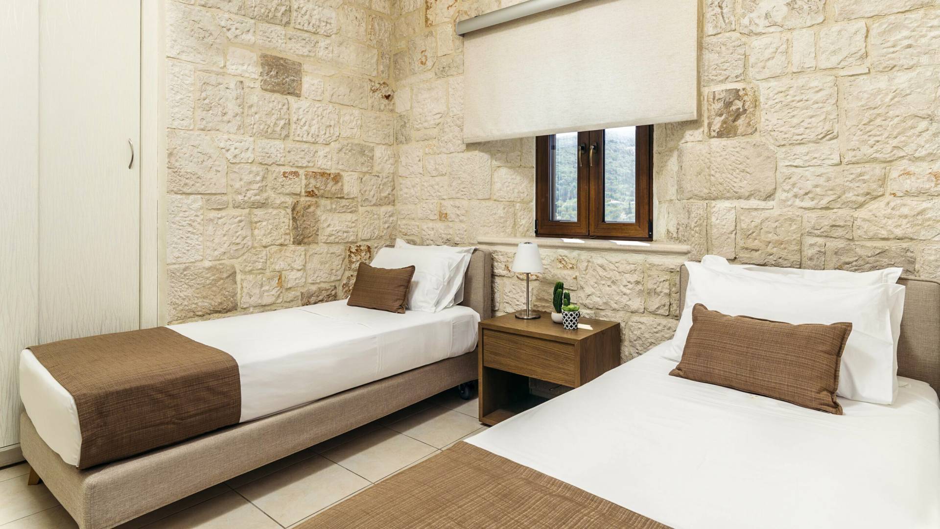 A marble staircase leads you to the first floor that consists of two more bedrooms: one master bedroom (double bed) with an en-suite full bathroom and one twin bedroom with an en-suite shower room.